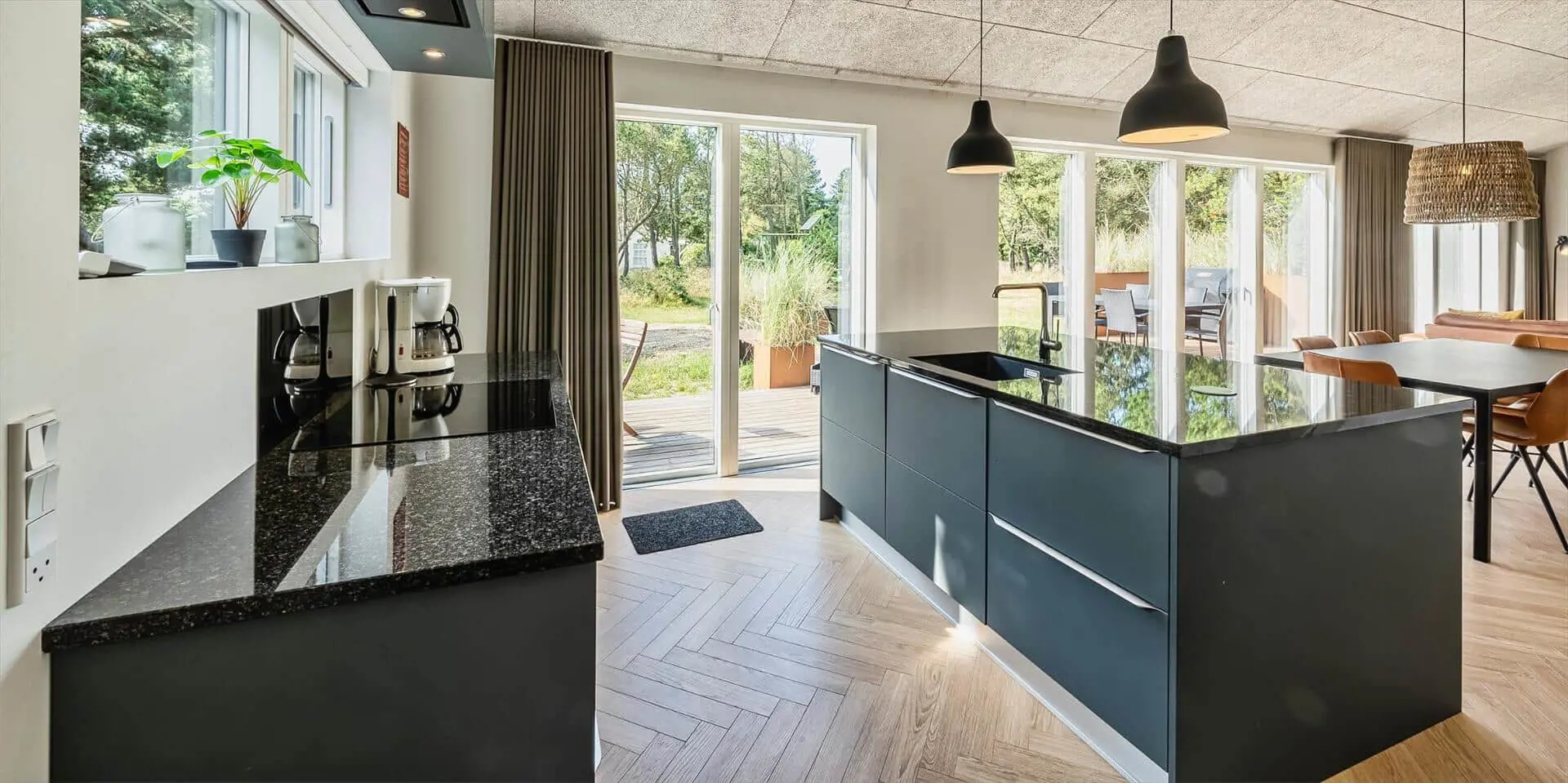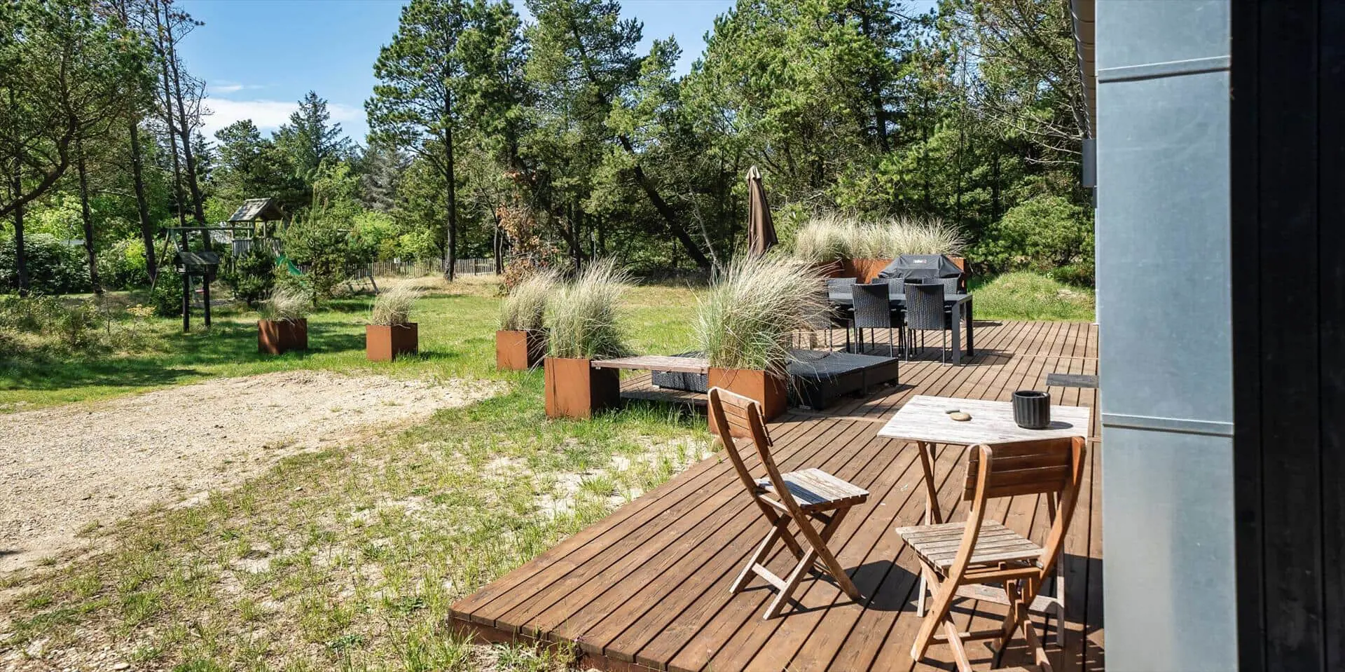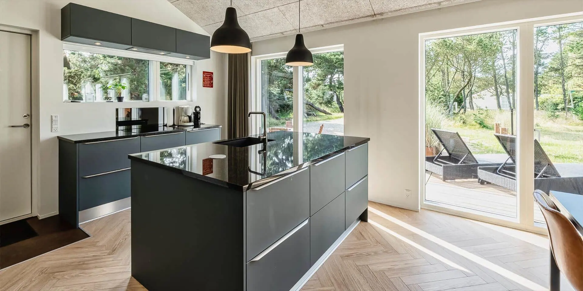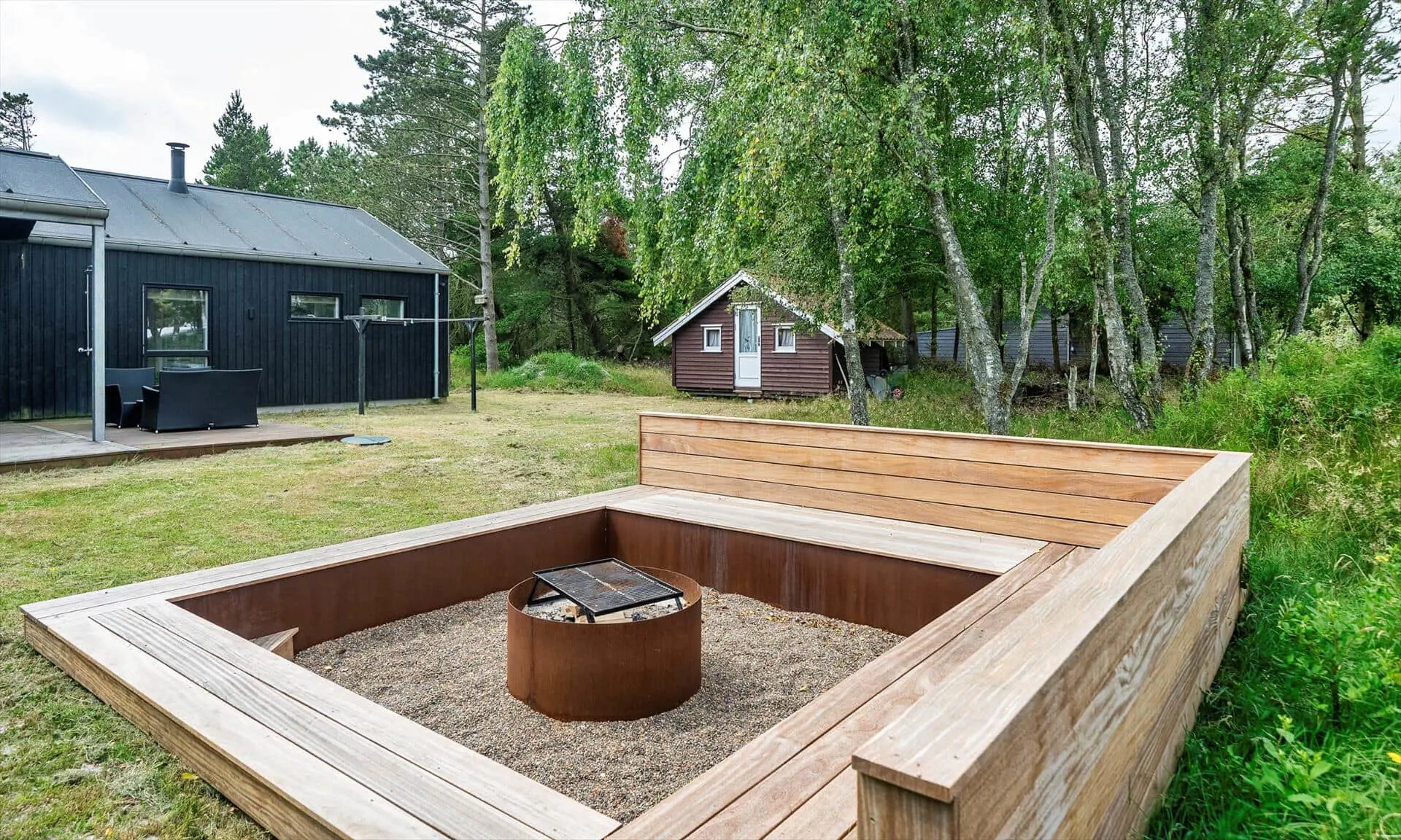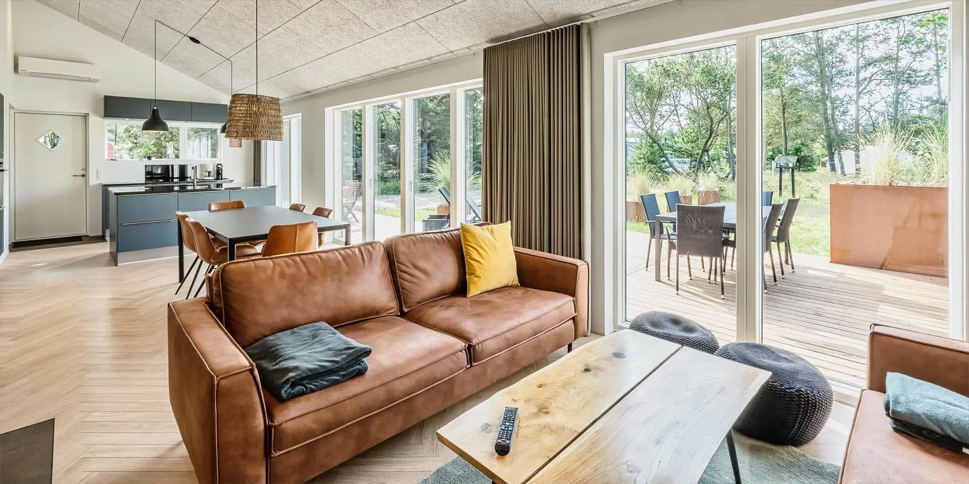 Wirklich schönes neueres Ferienhaus auf einem wunderschönen Naturgrundstück gelegen. Der Strand ist ca.1,8 Km vom Haus entfernt. Das Ferienhaus ist für 5 Personen ausgestattet. Alle Räumlichkeiten sind sehr grosszügig gehalten und bieten viel Platz für alle Bewohner des Hauses an. Das Ferienhaus ist ganzjährig isoliert und daher sehr energiesparend und ausserdem verfügt das Ferienhaus über eine Fussbodenheizung im ganzen Haus. Das Wohnzimmer ist mit dem Essbereich und der Küche offen gehalten. Die gemütliche Sofagarnitur lädt zum Kuscheln und Relaxen ein. Dazu der eingbaute Kamin an und der Abend kann mit einem Glächen Wein genossen werden. Erholung pur. Die Küche verfügt über einen Herd mit Cerankochfeld, Mikrowelle, einem Backofen, einer Geschirrspülmaschine und einer Kühl- und Gefrierkombination. Hier vom Küchenbereich ist ein Zugang zum Terrassenberich. Vom Essbereich haben Sie einen wundervollen Blick auf den Kamin. Der Wohnbereich ist mit grossen Panoramafenstern ausgestattet, damit Sie Ihren Blick auf das Naturgebiet richtig geniessen können. Das Fernsehprogramm empfangen Sie über Stofa, daher sind nur 5-8 deutsche Känale zu empfangen. Das Badezimmer ist mit einem Handwaschbecken, einem WC und einer Dusche ausgestattet. Vom Badezimmer aus haben Sie einen Zugang zur Sauna. Eine kombinierte Waschmaschine mit Trockner steht den Gästen für Ihren Aufenthalt im Hause zur Verfügung. Vom Badezimmer ist ein weiterer Zugang zum überdachten Terrassenbereich, wo sich ein Aussen Whirlpool und eine Aussendusche befindet. Im Ferienhaus gibt es zwei Schlafzimmer. Das eine Schlafzimmer verfügt über ein Doppelbett (180x200) und das zweite Schlafzimmer hat zwei Einzelbetten und ein Hängeboden. Wärmepumpe. Es befindet sich eine schöne neue Holzterrasse am Ferienhaus. Es ist nur ein Haustier erlaubt. Das Rauchen im Ferienhaus ist absolut nicht erlaubt. Das Ferienhaus verfügt über einen Internetanschluss (W-Lan). Baujahr 2020.