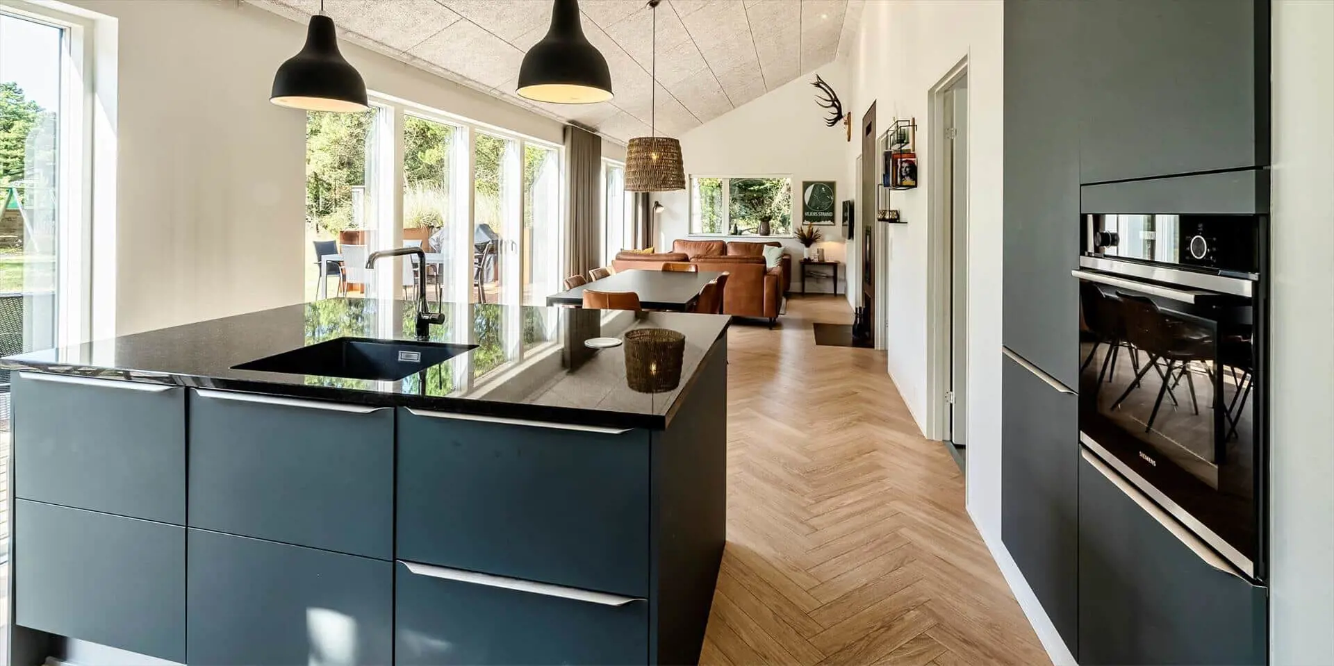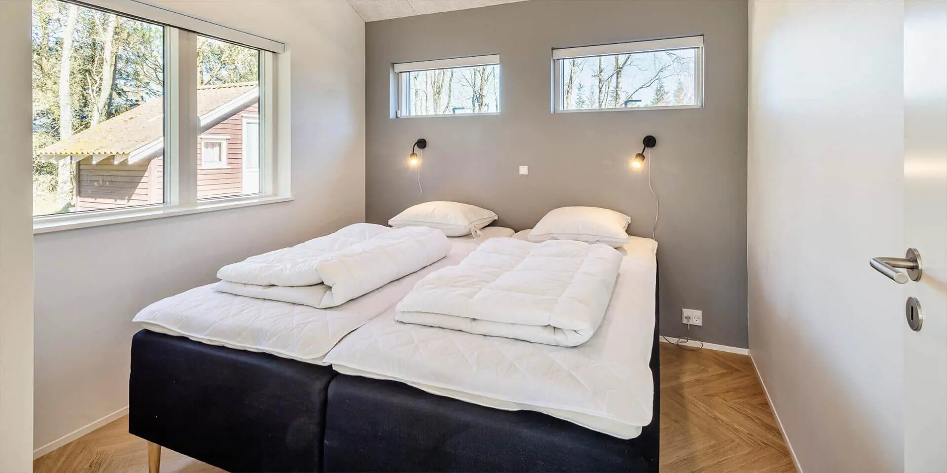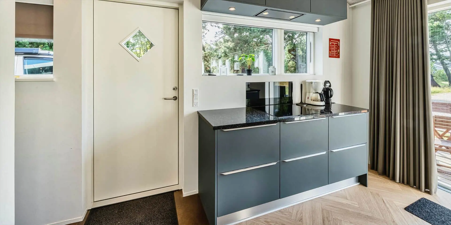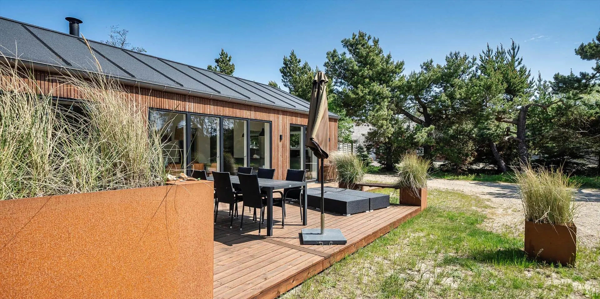 Wirklich schönes neueres Ferienhaus auf einem wunderschönen Naturgrundstück gelegen. Der Strand ist ca.1,8 Km vom Haus entfernt. Das Ferienhaus ist für 5 Personen ausgestattet. Alle Räumlichkeiten sind sehr grosszügig gehalten und bieten viel Platz für alle Bewohner des Hauses an. Das Ferienhaus ist ganzjährig isoliert und daher sehr energiesparend und ausserdem verfügt das Ferienhaus über eine Fussbodenheizung im ganzen Haus. Das Wohnzimmer ist mit dem Essbereich und der Küche offen gehalten. Die gemütliche Sofagarnitur lädt zum Kuscheln und Relaxen ein. Dazu der eingbaute Kamin an und der Abend kann mit einem Glächen Wein genossen werden. Erholung pur. Die Küche verfügt über einen Herd mit Cerankochfeld, Mikrowelle, einem Backofen, einer Geschirrspülmaschine und einer Kühl- und Gefrierkombination. Hier vom Küchenbereich ist ein Zugang zum Terrassenberich. Vom Essbereich haben Sie einen wundervollen Blick auf den Kamin. Der Wohnbereich ist mit grossen Panoramafenstern ausgestattet, damit Sie Ihren Blick auf das Naturgebiet richtig geniessen können. Das Fernsehprogramm empfangen Sie über Stofa, daher sind nur 5-8 deutsche Känale zu empfangen. Das Badezimmer ist mit einem Handwaschbecken, einem WC und einer Dusche ausgestattet. Vom Badezimmer aus haben Sie einen Zugang zur Sauna. Eine kombinierte Waschmaschine mit Trockner steht den Gästen für Ihren Aufenthalt im Hause zur Verfügung. Vom Badezimmer ist ein weiterer Zugang zum überdachten Terrassenbereich, wo sich ein Aussen Whirlpool und eine Aussendusche befindet. Im Ferienhaus gibt es zwei Schlafzimmer. Das eine Schlafzimmer verfügt über ein Doppelbett (180x200) und das zweite Schlafzimmer hat zwei Einzelbetten und ein Hängeboden. Wärmepumpe. Es befindet sich eine schöne neue Holzterrasse am Ferienhaus. Es ist nur ein Haustier erlaubt. Das Rauchen im Ferienhaus ist absolut nicht erlaubt. Das Ferienhaus verfügt über einen Internetanschluss (W-Lan). Baujahr 2020.