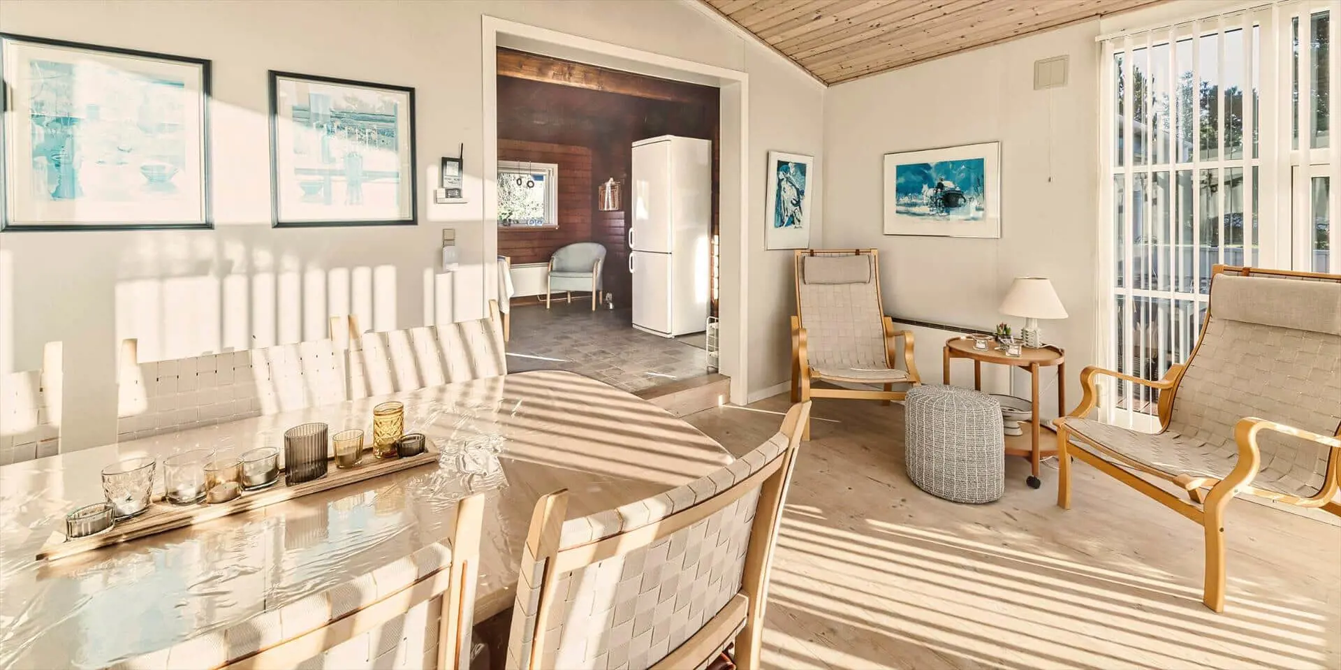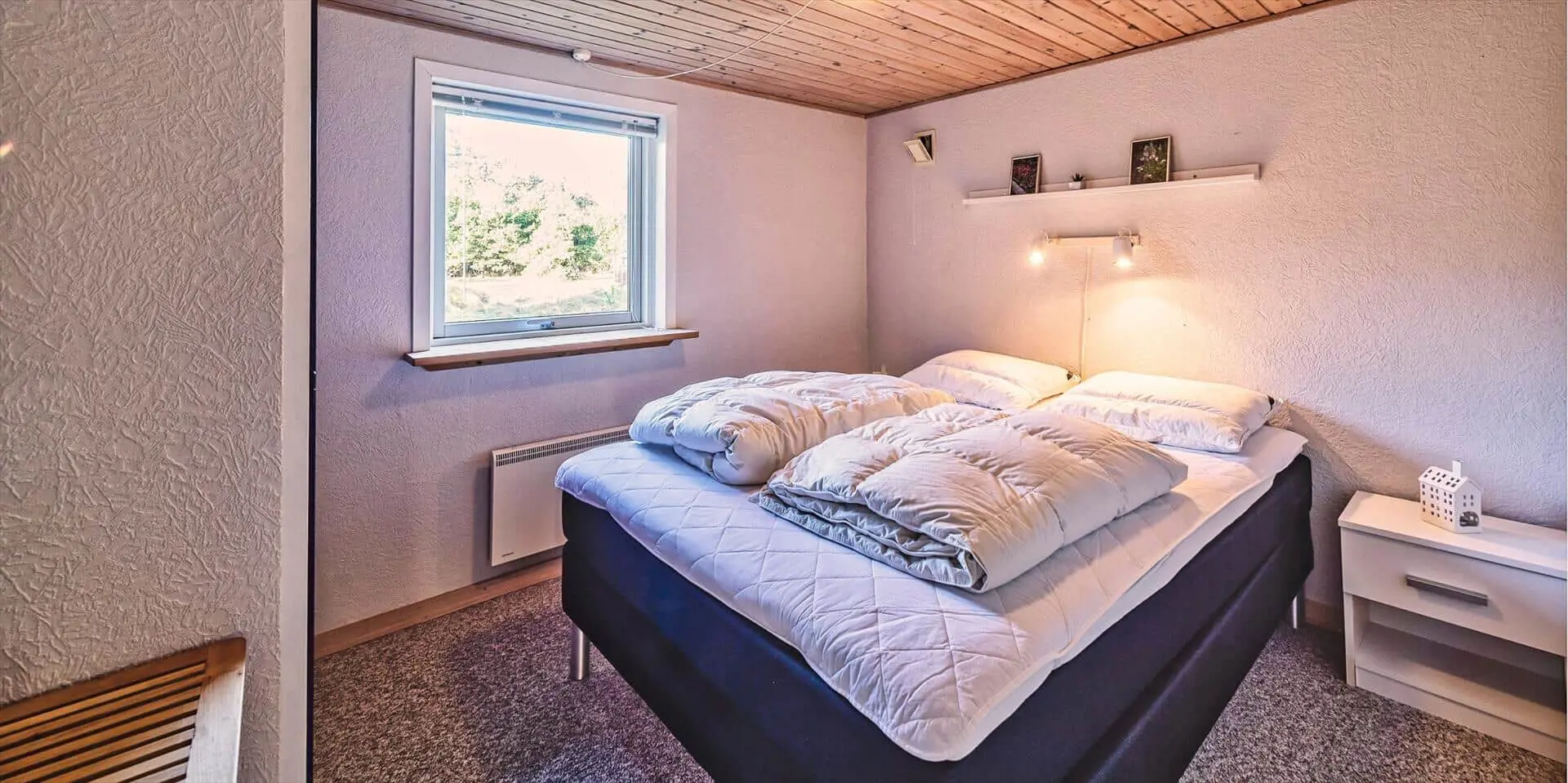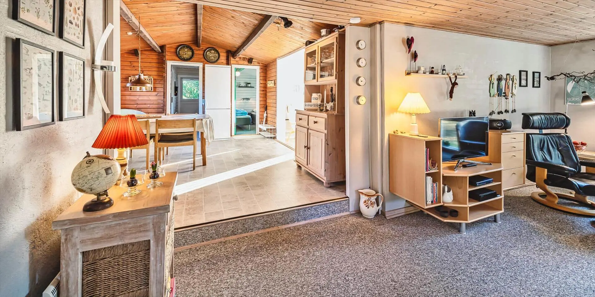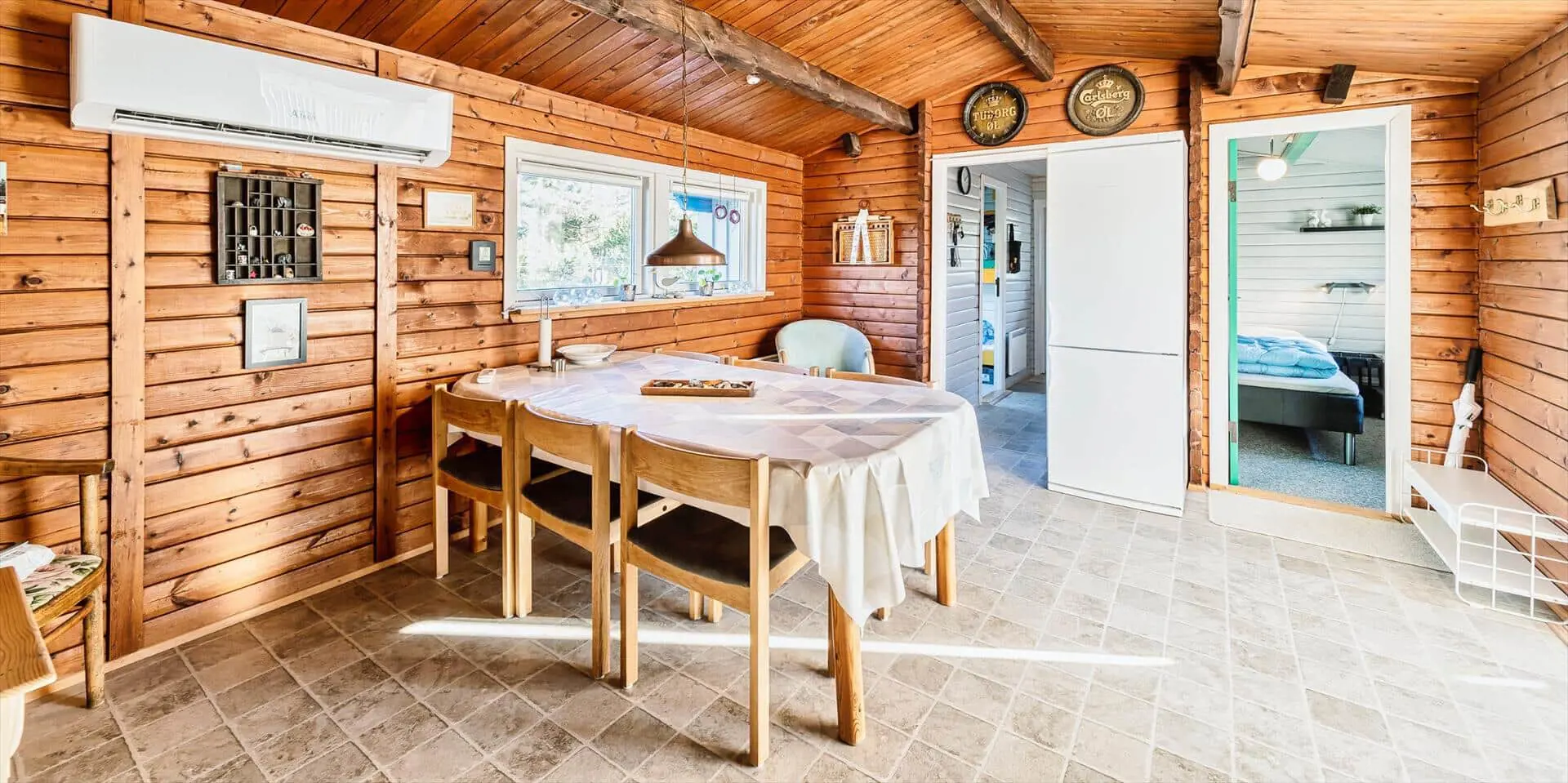 Das Ferienhaus mit Namen 'Tex Bo' befindet sich auf einem großzügigem Rasengrundstück und ist für 6 Personen ausgestattet. Der Strand ist ca. 1,5 Km vom Ferienhaus entfernt. Der Wohnbereich ist mit einem Teppichboden ausgestattet. Von hier haben Sie auch Zugang zu einem der drei Schlafzimmer und ebenso zum Badezimmer. Im Wohnzimmer befindet sich ein Mørso-Kamin. Dieser spendet eine angenehme Wärme und Gemütlichkeit. Das Fernsehprogramm empfangen Sie über Stofa, daher sind nur 5-8 deutsche Kanäle zu empfangen, ausserdem gibt es auch nioch Chromecast. Zu dem schicken und gemütlichen Essbereich gelangen Sie dann über eine Stufe, da dieser Wohnbereich angebaut wurde. Es befindet sich eine Warmepumpe im Ferienhaus. Mit dieser Warmepumpe haben sie die Möglichkeit die Stromkosten zu senken, denn die Warmepumpe ist energiesparend . Essbereich ist mit einer Holzvertäfelung versehen und hat einen PVC-Bodenbelag. Am Esstisch ist genügend Platz für alle Bewohner des Hauses. Von hier gelangen Sie auch in den schönen gemütlichen Wintergarten mit einer großer Fensterfront, Terrassentür und Holzfußboden. Die Kühl- und Gefrierkombination steht hier an der Wand zwischen der Küche und einem Schlafzimmer. Vom Esszimmer gelangen Sie dann in die Küche und in ein weiteres Schlafzimmer. Die Küche wurde 2023 neu gemacht sowie der Eingangsbereicht. Die Küche verfügt über einen Herd mit Cerankochfeld und einem Backofen und eine Geschirrspülmaschine. Eine sogenannten Stalltür öffnet einen Ausgang zu einem kleinen überdachten Terrassenbereich. Das Badezimmer verfügt über ein Handwaschbecken, ein WC und eine Dusche. Es stehen den Gästen insgesamt drei Schlafzimmer zur Verfügung. Ein Schlafzimmer verfügt über ein Doppelbett, das zweite Schlafzimmer über zwei Einzelbetten und das dritte Schlafzimmer verfügt über Etagenbetten. Der Terrassenbereich beim Wintergarten ist teilweise geschlossen. Es sind max. zwei Haustiere erlaubt mit einer max. Rückenhöhe von 40 cm. Das Ferienhaus ist 1967 erbaut worden und in 1996 renoviert.