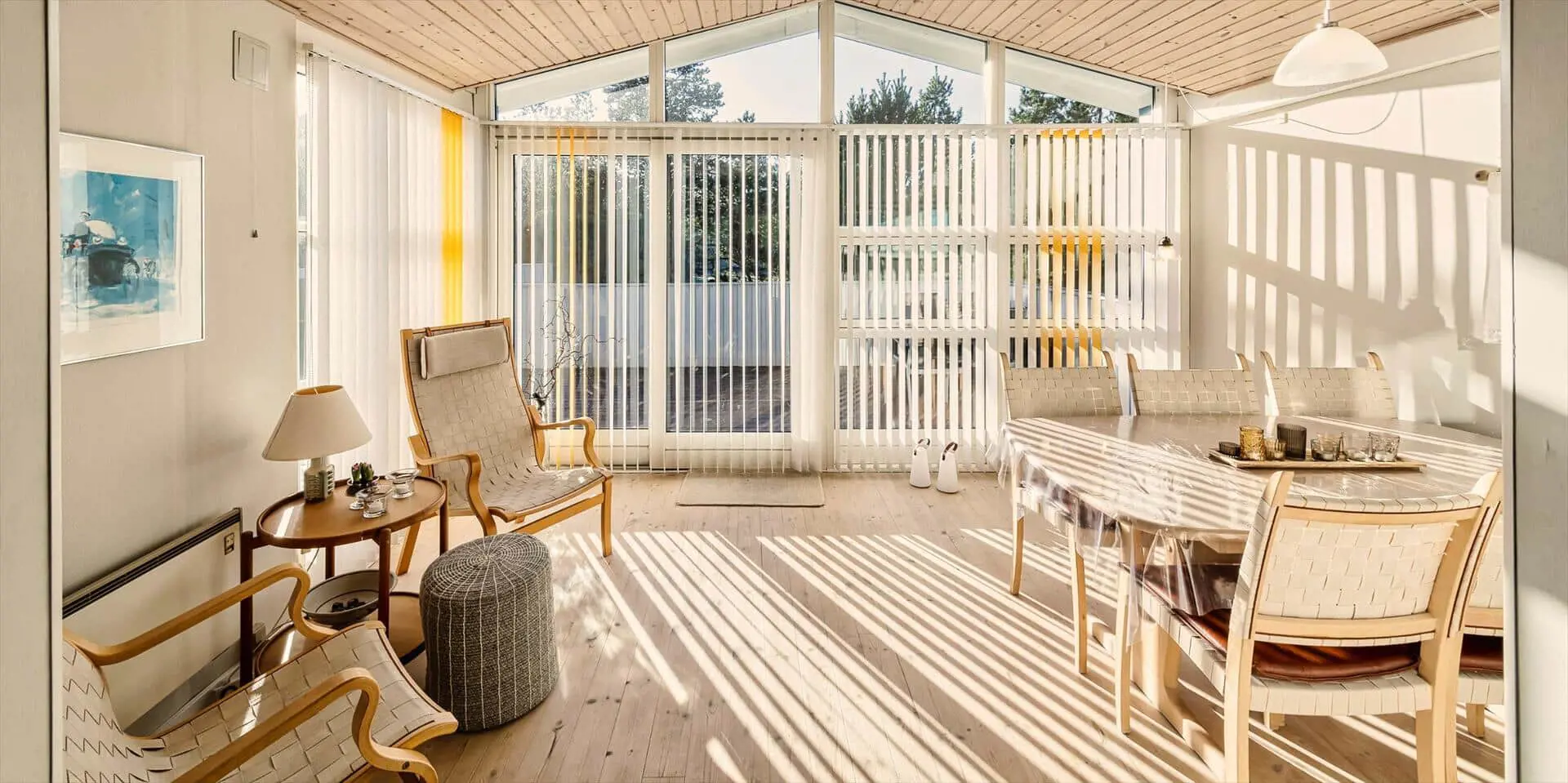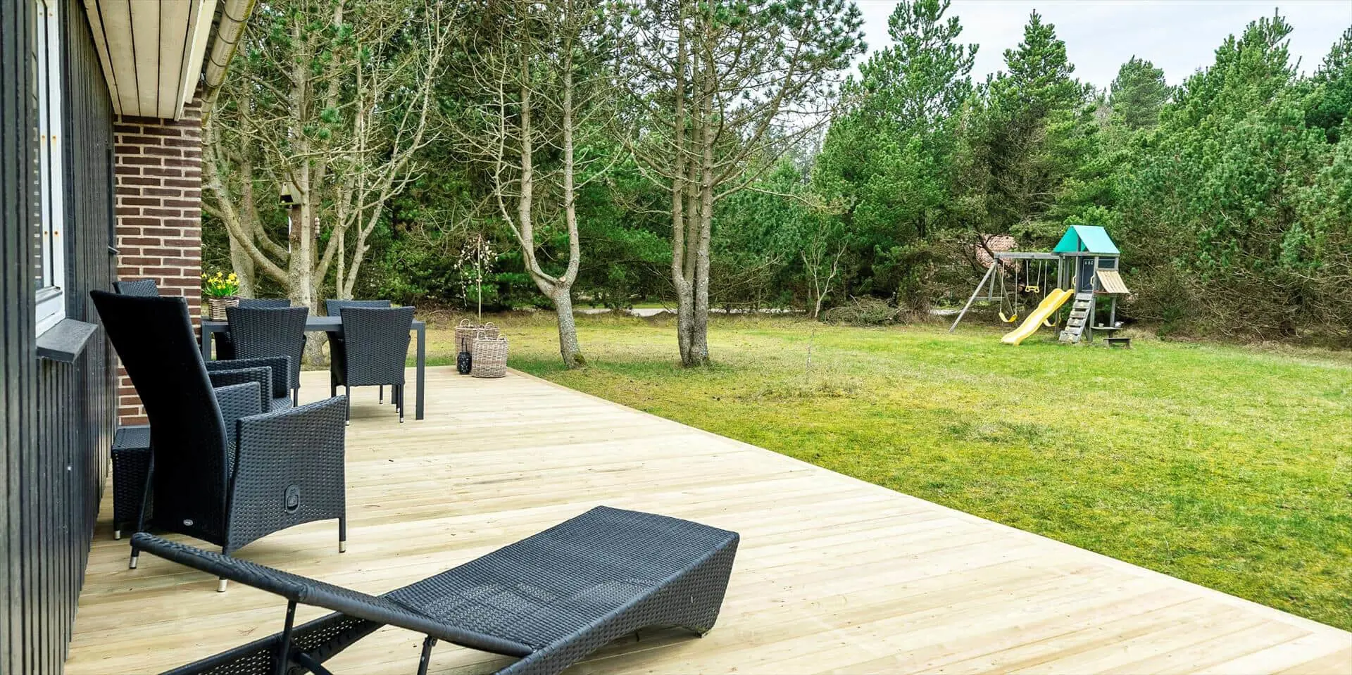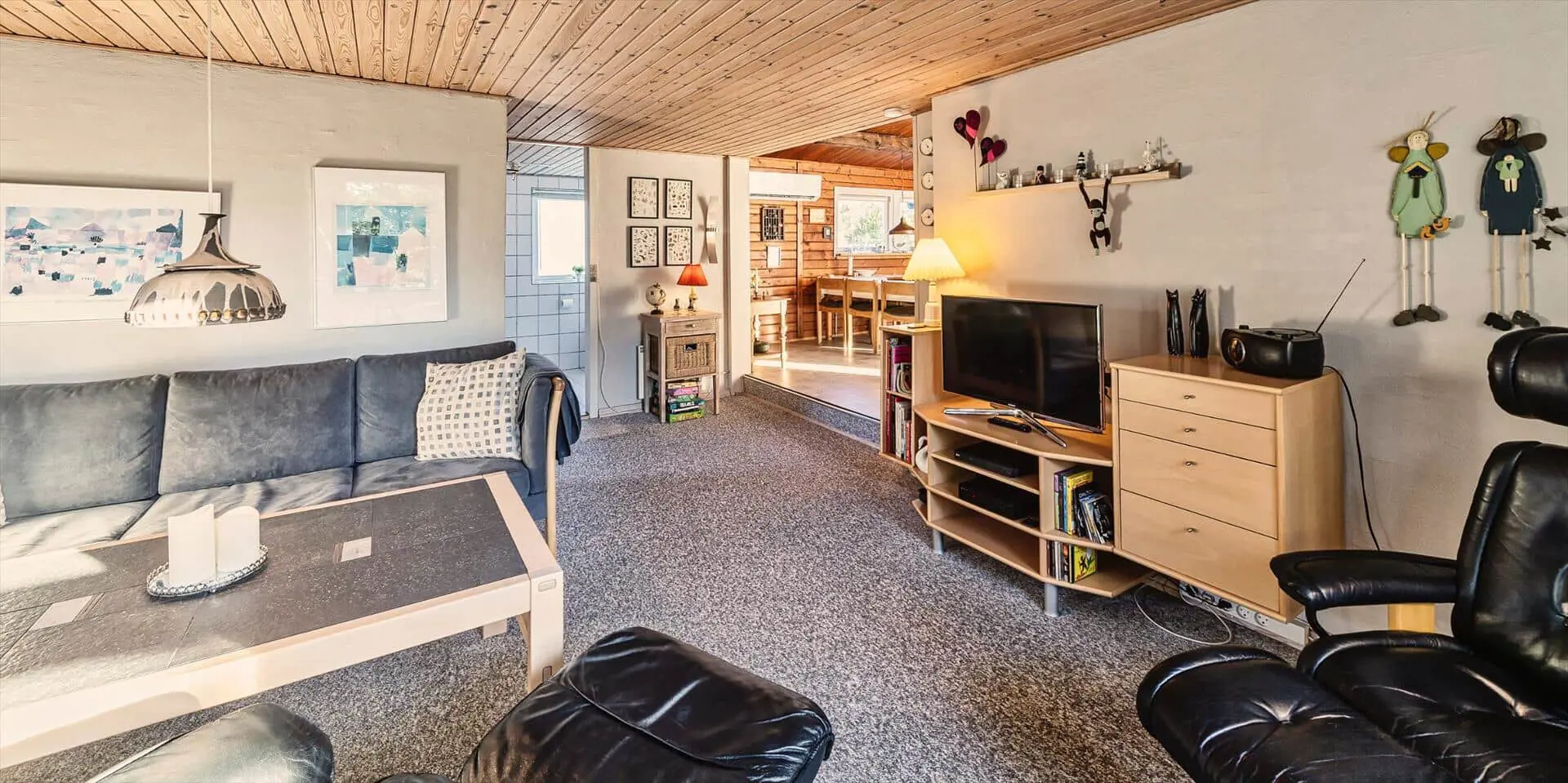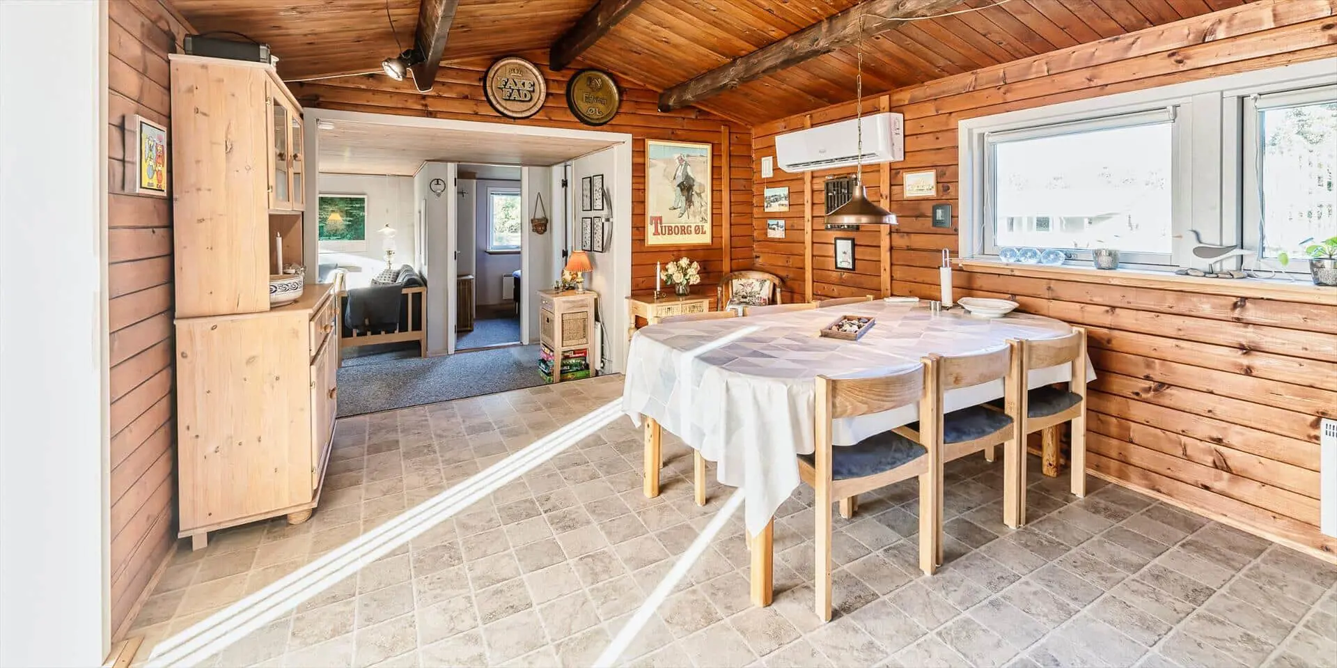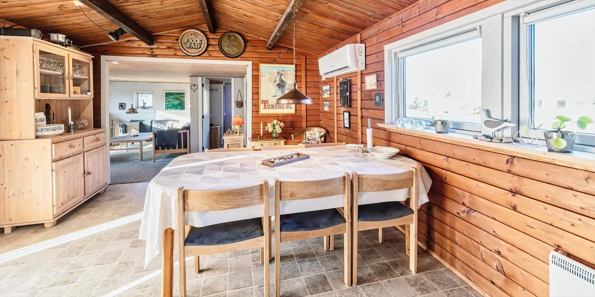 Das Ferienhaus mit Namen 'Tex Bo' befindet sich auf einem großzügigem Rasengrundstück und ist für 6 Personen ausgestattet. Der Strand ist ca. 1,5 Km vom Ferienhaus entfernt. Der Wohnbereich ist mit einem Teppichboden ausgestattet. Von hier haben Sie auch Zugang zu einem der drei Schlafzimmer und ebenso zum Badezimmer. Im Wohnzimmer befindet sich ein Mørso-Kamin. Dieser spendet eine angenehme Wärme und Gemütlichkeit. Das Fernsehprogramm empfangen Sie über Stofa, daher sind nur 5-8 deutsche Kanäle zu empfangen, ausserdem gibt es auch nioch Chromecast. Zu dem schicken und gemütlichen Essbereich gelangen Sie dann über eine Stufe, da dieser Wohnbereich angebaut wurde. Es befindet sich eine Warmepumpe im Ferienhaus. Mit dieser Warmepumpe haben sie die Möglichkeit die Stromkosten zu senken, denn die Warmepumpe ist energiesparend . Essbereich ist mit einer Holzvertäfelung versehen und hat einen PVC-Bodenbelag. Am Esstisch ist genügend Platz für alle Bewohner des Hauses. Von hier gelangen Sie auch in den schönen gemütlichen Wintergarten mit einer großer Fensterfront, Terrassentür und Holzfußboden. Die Kühl- und Gefrierkombination steht hier an der Wand zwischen der Küche und einem Schlafzimmer. Vom Esszimmer gelangen Sie dann in die Küche und in ein weiteres Schlafzimmer. Die Küche wurde 2023 neu gemacht sowie der Eingangsbereicht. Die Küche verfügt über einen Herd mit Cerankochfeld und einem Backofen und eine Geschirrspülmaschine. Eine sogenannten Stalltür öffnet einen Ausgang zu einem kleinen überdachten Terrassenbereich. Das Badezimmer verfügt über ein Handwaschbecken, ein WC und eine Dusche. Es stehen den Gästen insgesamt drei Schlafzimmer zur Verfügung. Ein Schlafzimmer verfügt über ein Doppelbett, das zweite Schlafzimmer über zwei Einzelbetten und das dritte Schlafzimmer verfügt über Etagenbetten. Der Terrassenbereich beim Wintergarten ist teilweise geschlossen. Es sind max. zwei Haustiere erlaubt mit einer max. Rückenhöhe von 40 cm. Das Ferienhaus ist 1967 erbaut worden und in 1996 renoviert.