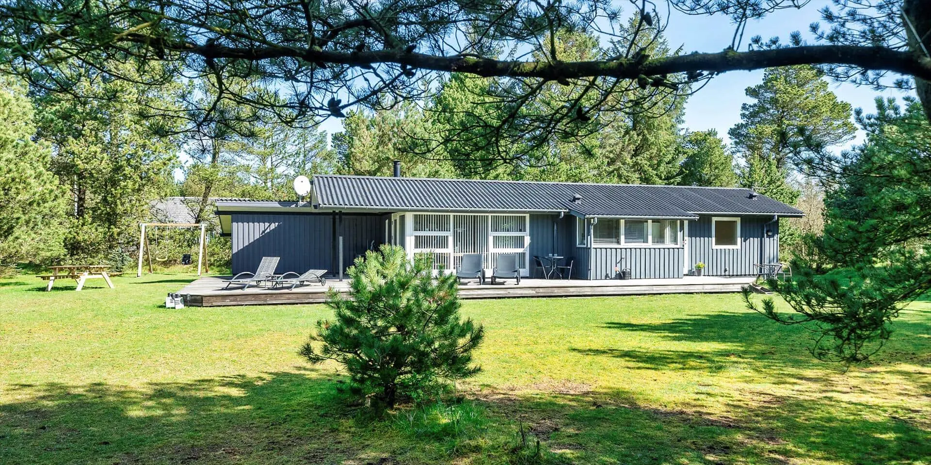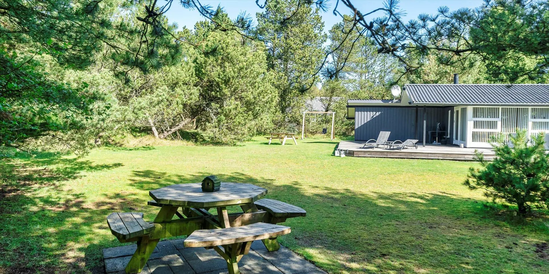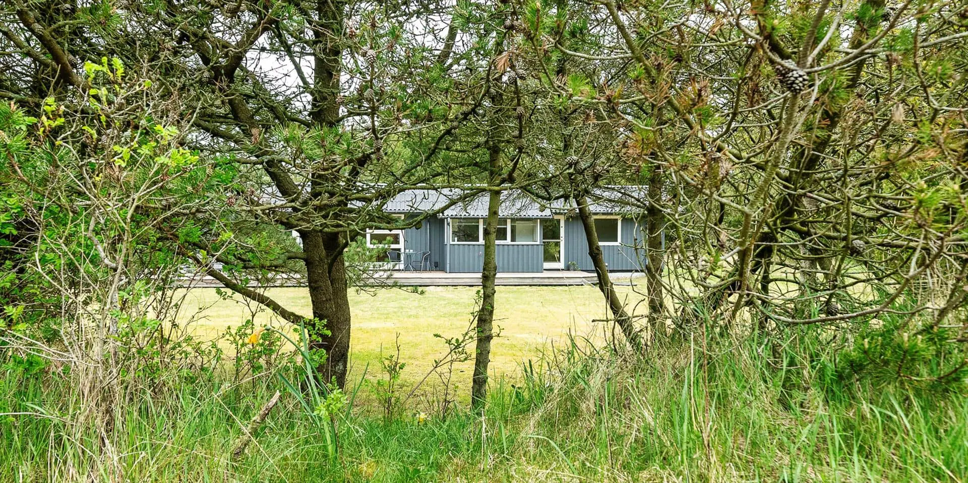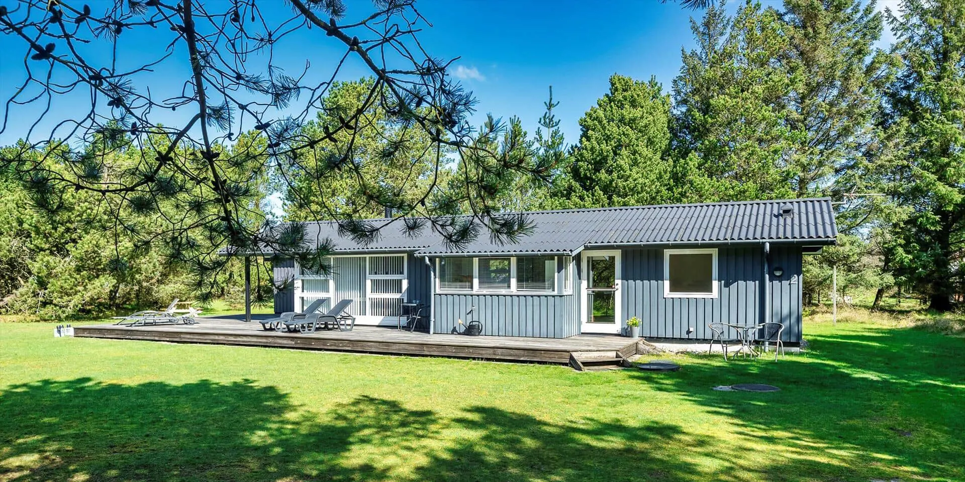 Das Haus liegt auf einem schönen, geschlossenen Grundstück in der Nähe eines Waldgebiets mit guten Wegen bis zur südlichen Heide von Vejers. Das Grundstück ist groß (2.572 m²) und von Kiefern umgeben.