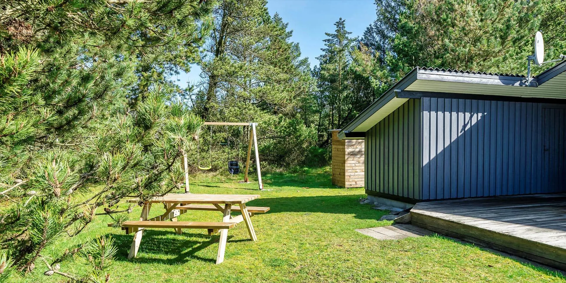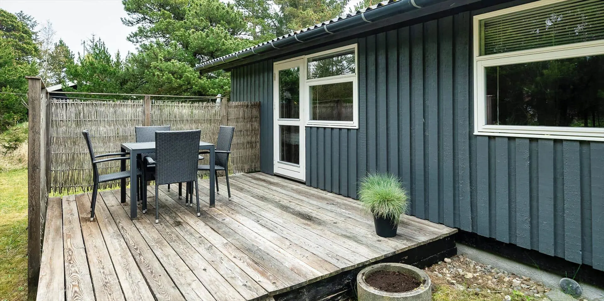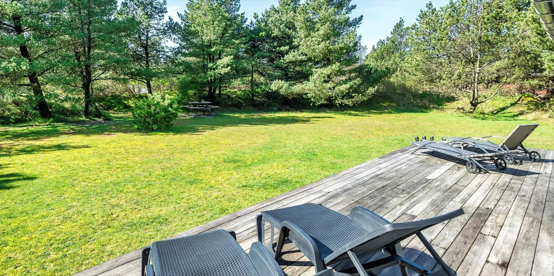Das Haus liegt auf einem schönen, geschlossenen Grundstück in der Nähe eines Waldgebiets mit guten Wegen bis zur südlichen Heide von Vejers. Das Grundstück ist groß (2.572 m²) und von Kiefern umgeben.