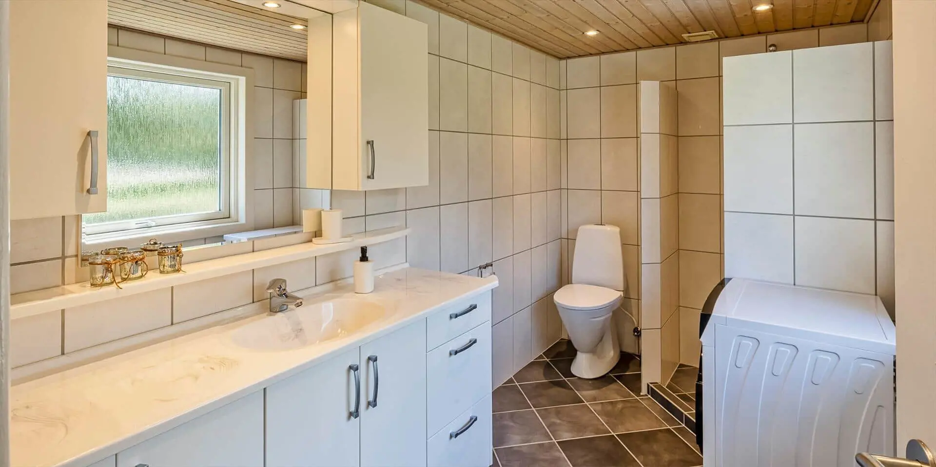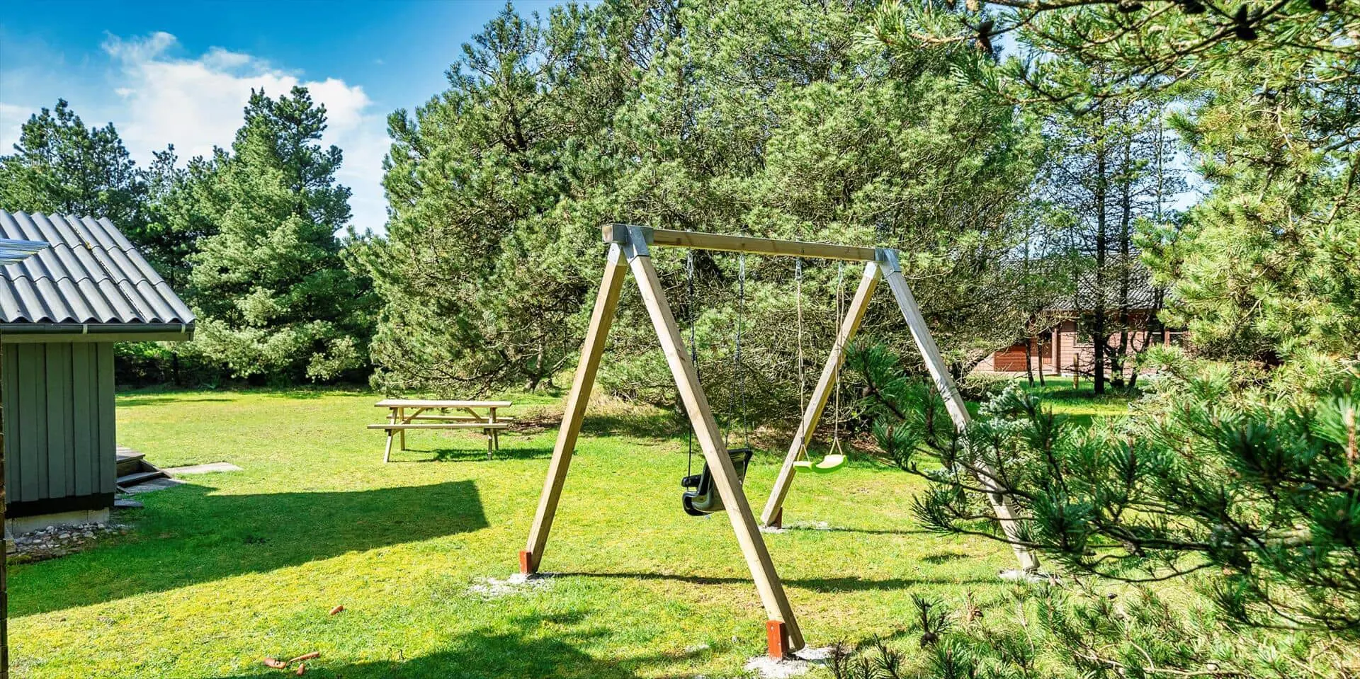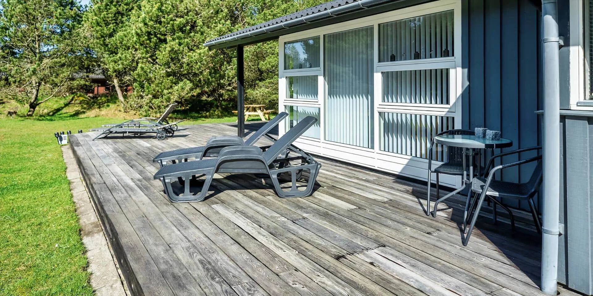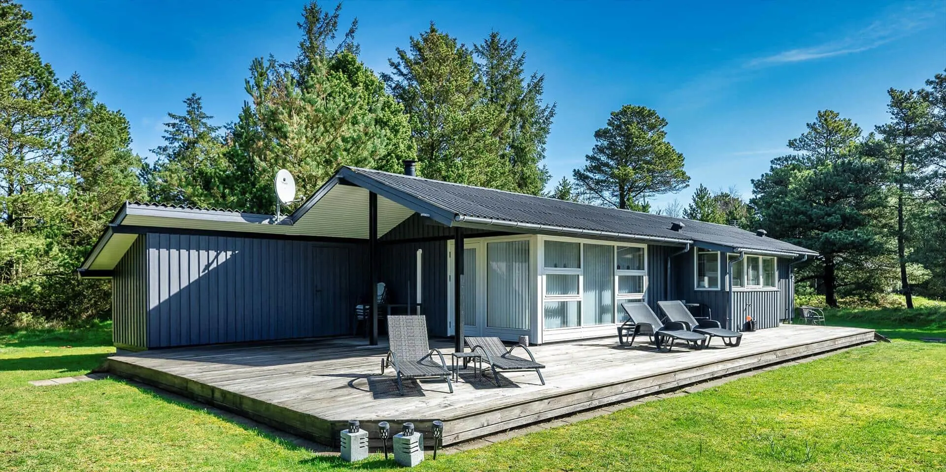 Das Haus liegt auf einem schönen, geschlossenen Grundstück in der Nähe eines Waldgebiets mit guten Wegen bis zur südlichen Heide von Vejers. Das Grundstück ist groß (2.572 m²) und von Kiefern umgeben.