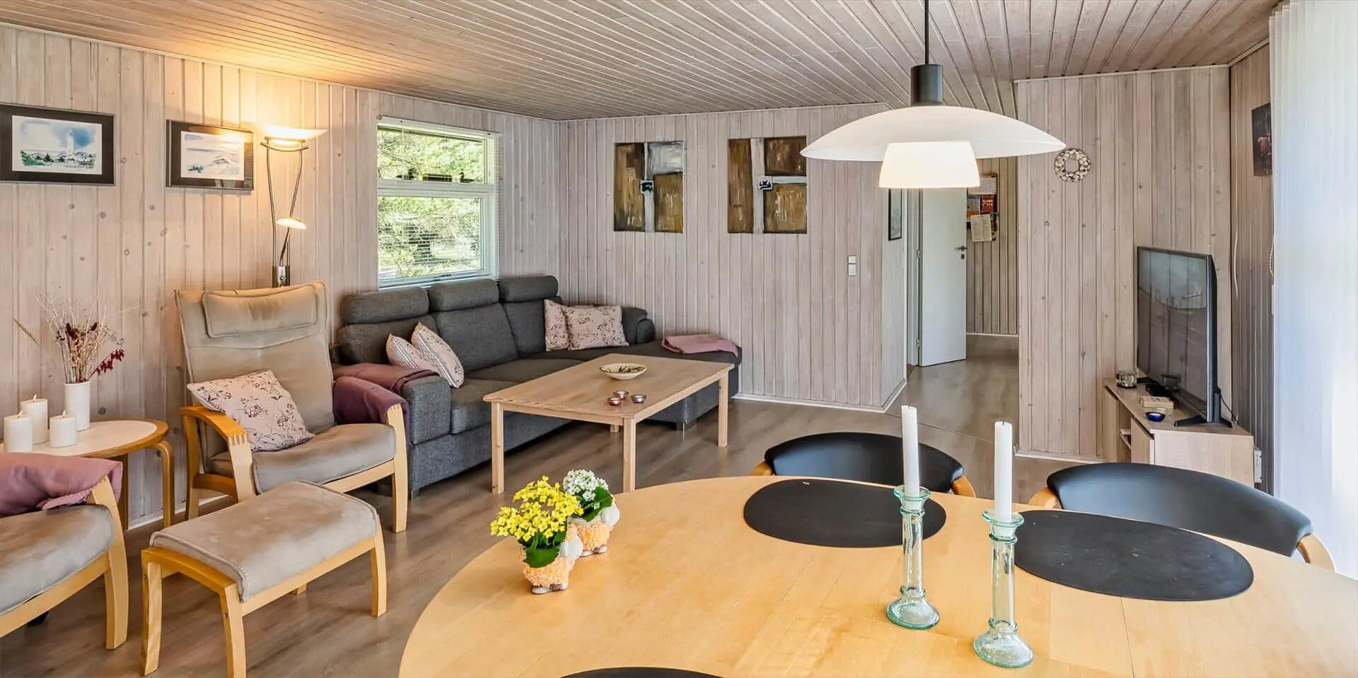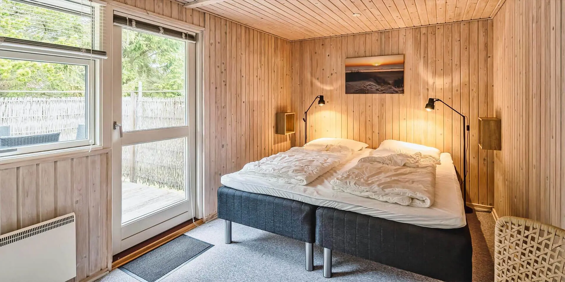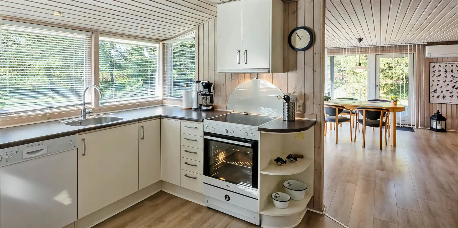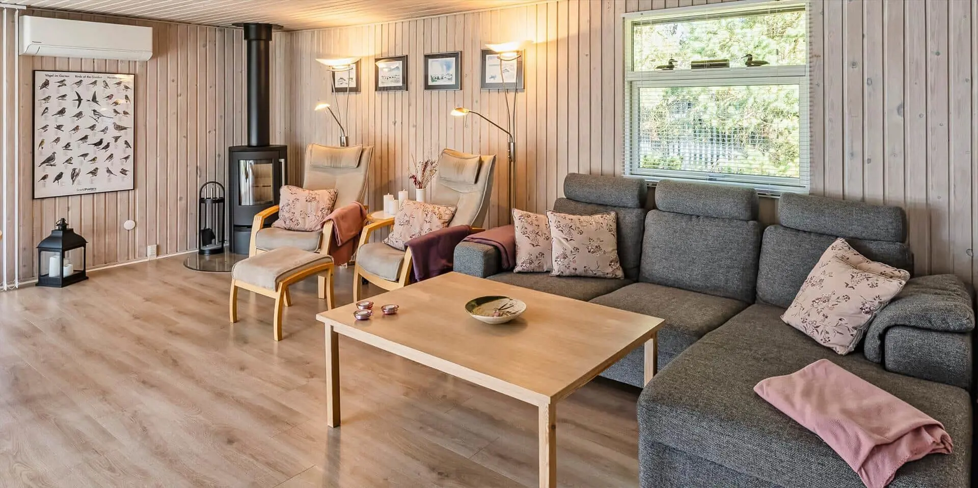 Das Haus umfasst: kleiner Eingangsbereich, modernes Badezimmer, 2 Schlafzimmer, Küche und Wohnraum. Ein Schlafzimmer mit zwei Einzelbetten, das andere mit einem Doppelbett und Zugang zu einer kleinen, ungestörten Terrasse hinter dem Haus. Badezimmer mit Duschabtrennung, WC, Waschtisch mit Unterschrank und Fußbodenheizung. Offene Küche mit großem Fenster zur Gartenseite. Küche ausgestattet mit Geschirrspüler, Kühlschrank mit Gefrierfach, Mikrowelle, Backofen und Kochfeld. Der Essbereich ist mit dem Wohnzimmer verbunden und bietet Blick auf den Holzofen und das schöne Grundstück. Das Wohnzimmer ist hell und freundlich, mit großem Fenster und Zugang zur großen Holzterrasse. Ausstattung: Sitzgruppe, Holzofen, kabelloses Internet, Smart‑TV, Stofa‑Sommerhauspaket und Google Chromecast. Im Wohnzimmer ist eine Wärmepumpe installiert; diese energiesparende Wärmepumpe kann die Stromkosten reduzieren. Zugang vom Wohnzimmer zu einer großen, ungestörten, teilweise überdachten Holzterrasse. Hinter dem Haus befindet sich eine kleinere Terrasse. Das Grundstück ist mit Rasen angelegt und bietet viel Platz zum Ballspielen und Toben sowie gute Chancen, Rotwild zu sehen. Rauchen ist im Haus nicht gestattet. Ein kleiner Hund ist erlaubt. Baujahr 1977, Renovierung 2005. Das Objekt liegt fußläufig zum nächsten Restaurant und zum Lebensmittelgeschäft. Kurze Entfernung zur Minigolfanlage der Stadt. Das Haus liegt außerdem in der Nähe eines großen Wald‑ und Naturschutzgebiets am Aarrild‑See, wo Rotwild aus nächster Nähe beobachtet werden kann. Strandentfernung ca. 1.800 Meter.