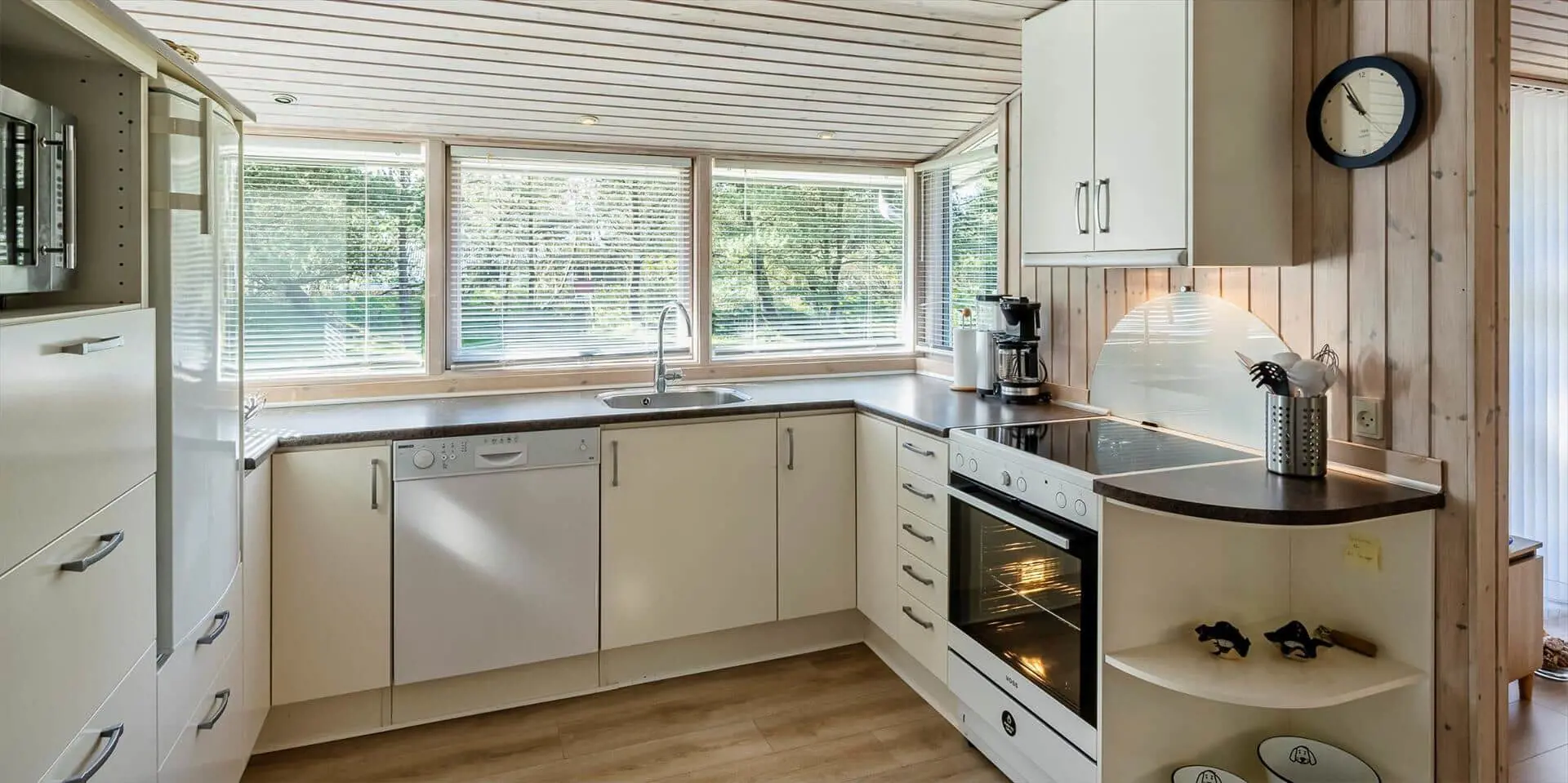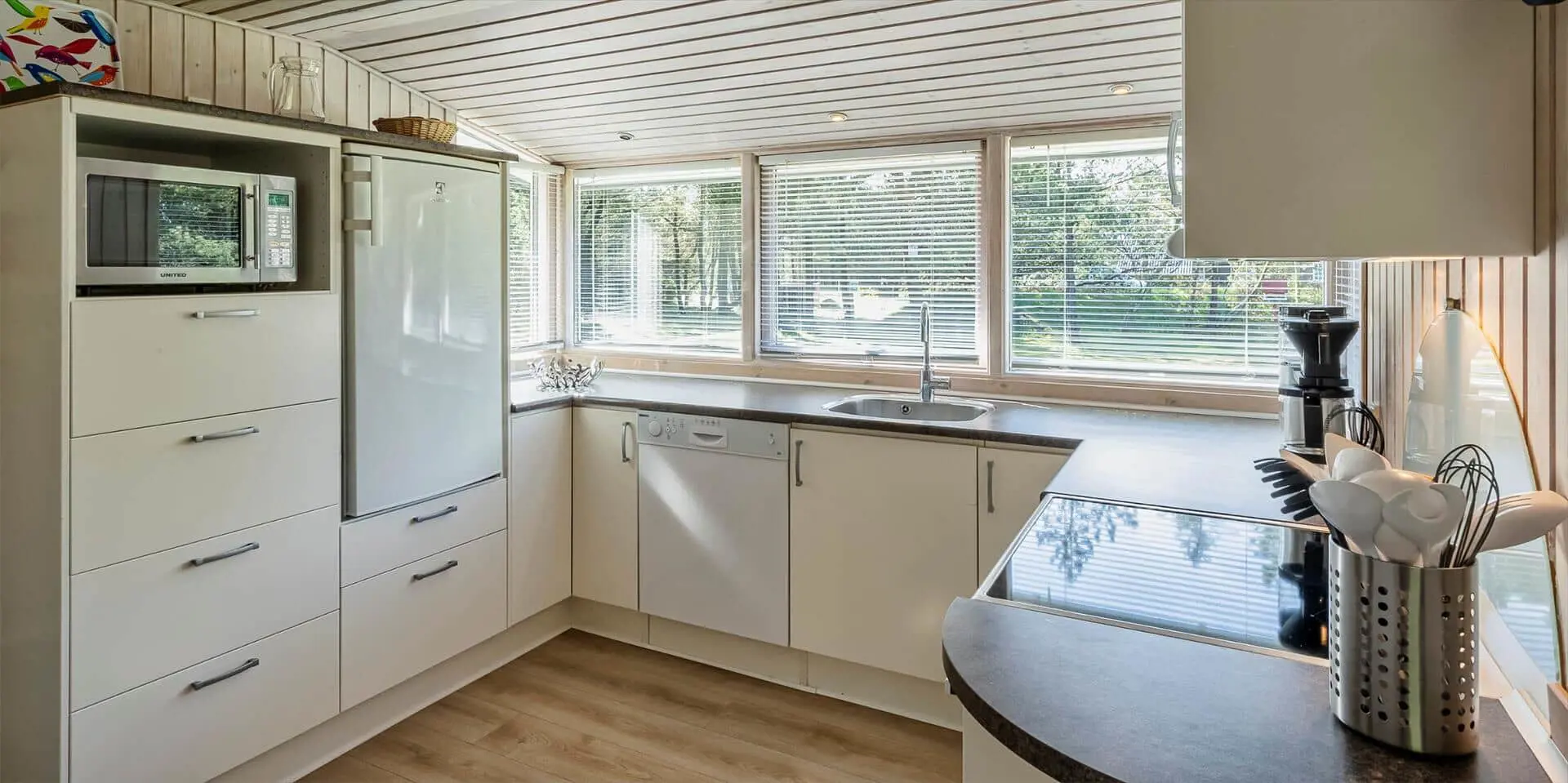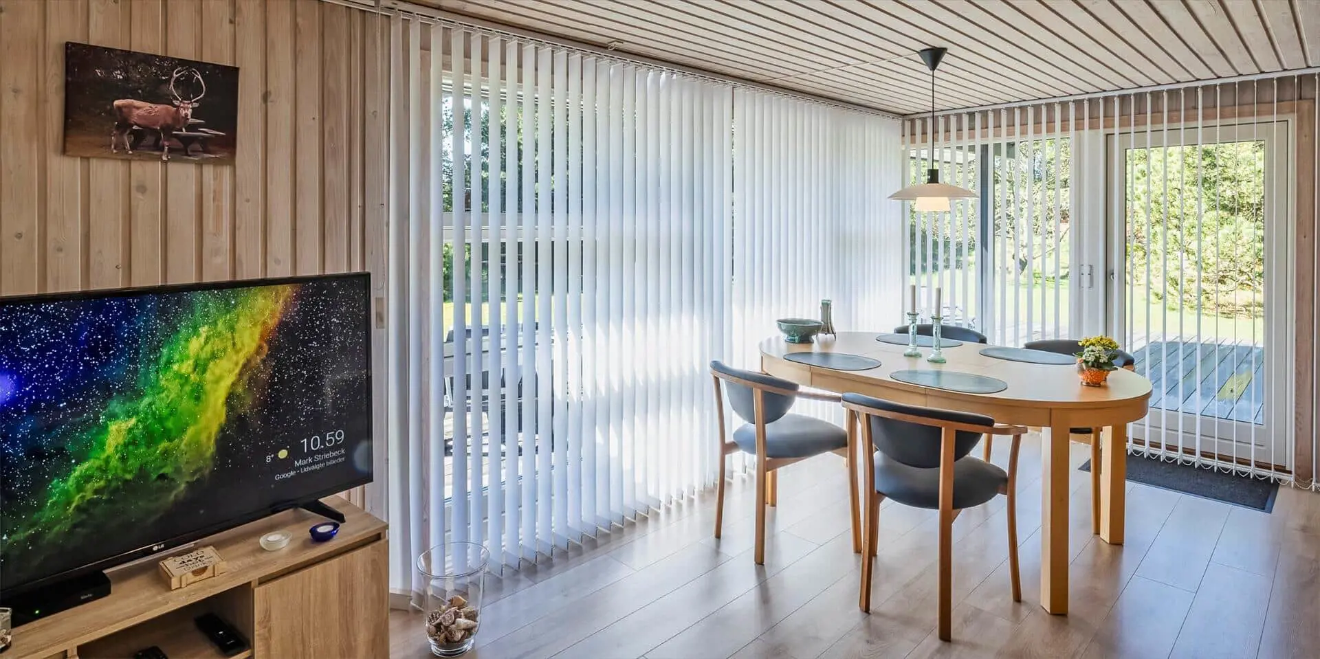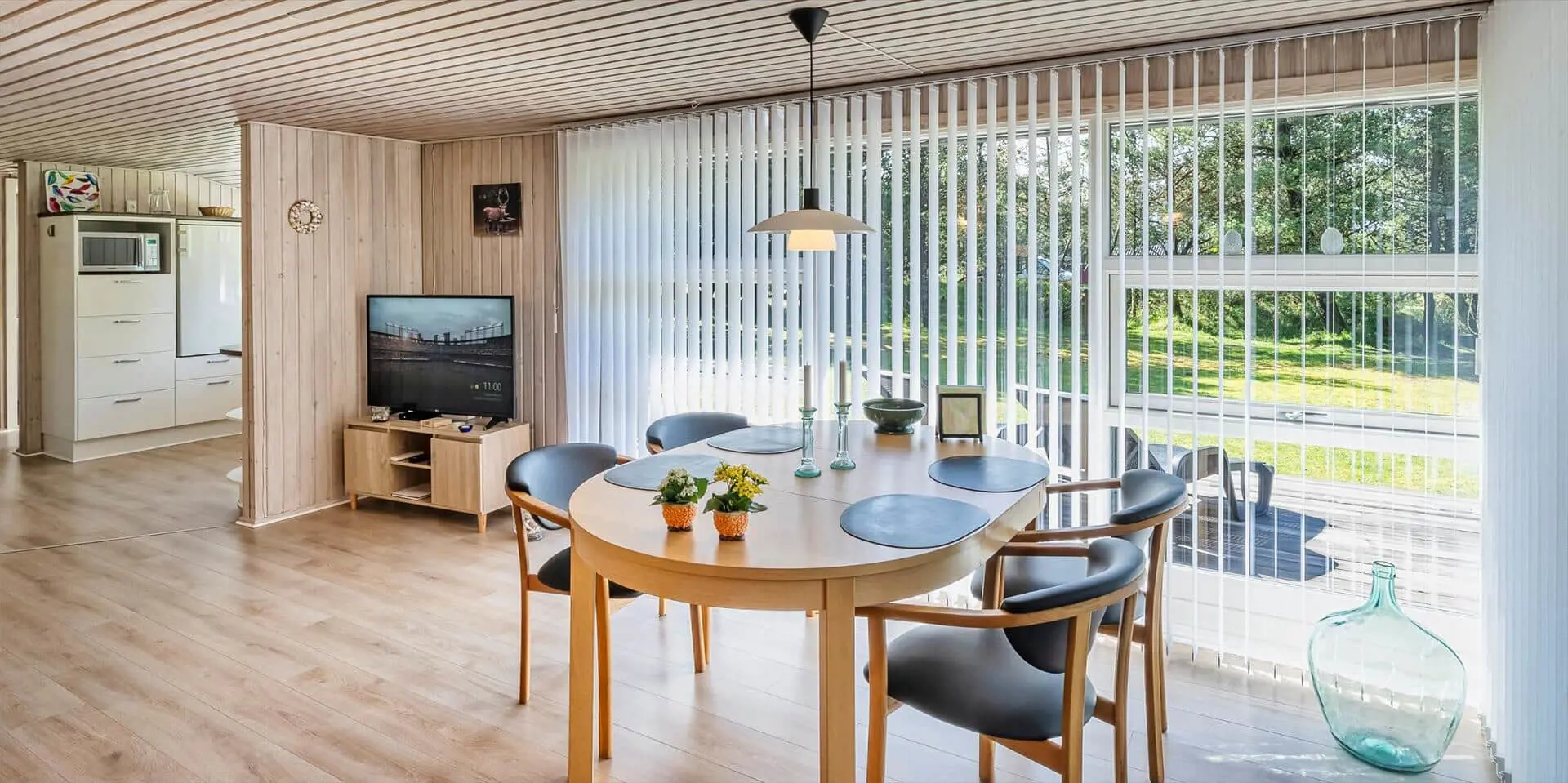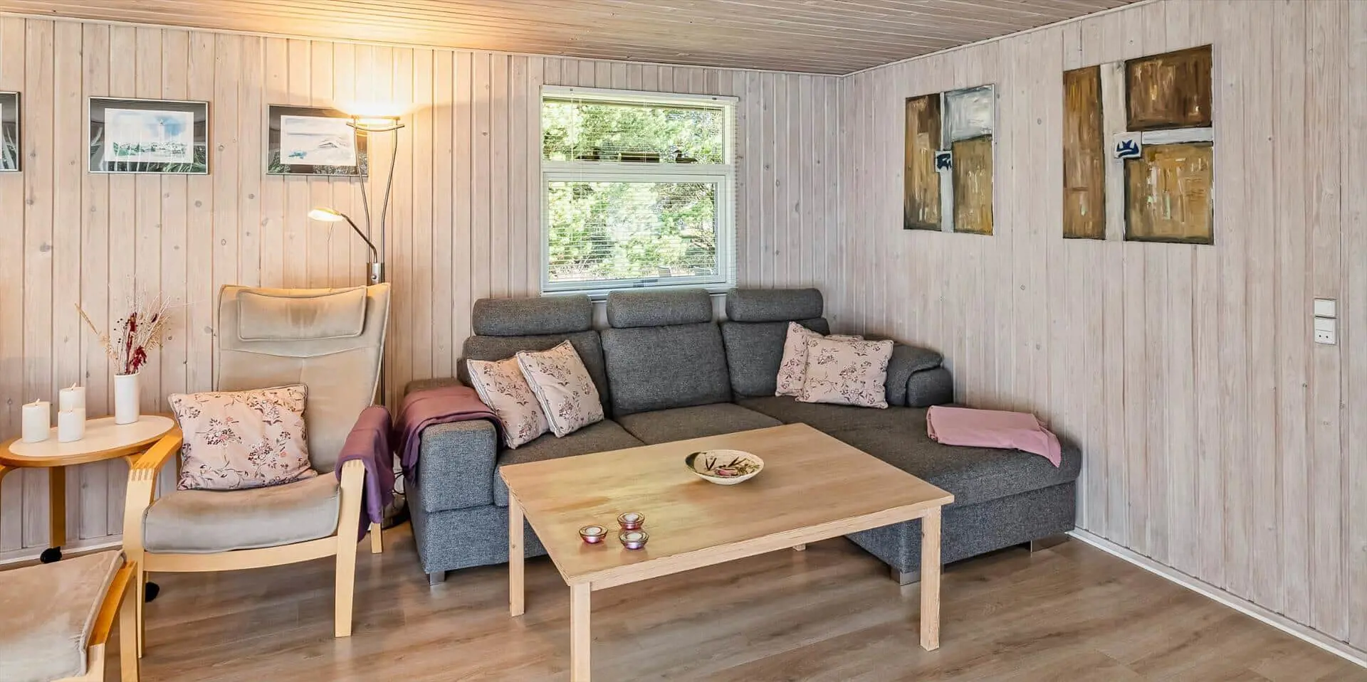 Das Haus umfasst: kleiner Eingangsbereich, modernes Badezimmer, 2 Schlafzimmer, Küche und Wohnraum. Ein Schlafzimmer mit zwei Einzelbetten, das andere mit einem Doppelbett und Zugang zu einer kleinen, ungestörten Terrasse hinter dem Haus. Badezimmer mit Duschabtrennung, WC, Waschtisch mit Unterschrank und Fußbodenheizung. Offene Küche mit großem Fenster zur Gartenseite. Küche ausgestattet mit Geschirrspüler, Kühlschrank mit Gefrierfach, Mikrowelle, Backofen und Kochfeld. Der Essbereich ist mit dem Wohnzimmer verbunden und bietet Blick auf den Holzofen und das schöne Grundstück. Das Wohnzimmer ist hell und freundlich, mit großem Fenster und Zugang zur großen Holzterrasse. Ausstattung: Sitzgruppe, Holzofen, kabelloses Internet, Smart‑TV, Stofa‑Sommerhauspaket und Google Chromecast. Im Wohnzimmer ist eine Wärmepumpe installiert; diese energiesparende Wärmepumpe kann die Stromkosten reduzieren. Zugang vom Wohnzimmer zu einer großen, ungestörten, teilweise überdachten Holzterrasse. Hinter dem Haus befindet sich eine kleinere Terrasse. Das Grundstück ist mit Rasen angelegt und bietet viel Platz zum Ballspielen und Toben sowie gute Chancen, Rotwild zu sehen. Rauchen ist im Haus nicht gestattet. Ein kleiner Hund ist erlaubt. Baujahr 1977, Renovierung 2005. Das Objekt liegt fußläufig zum nächsten Restaurant und zum Lebensmittelgeschäft. Kurze Entfernung zur Minigolfanlage der Stadt. Das Haus liegt außerdem in der Nähe eines großen Wald‑ und Naturschutzgebiets am Aarrild‑See, wo Rotwild aus nächster Nähe beobachtet werden kann. Strandentfernung ca. 1.800 Meter.