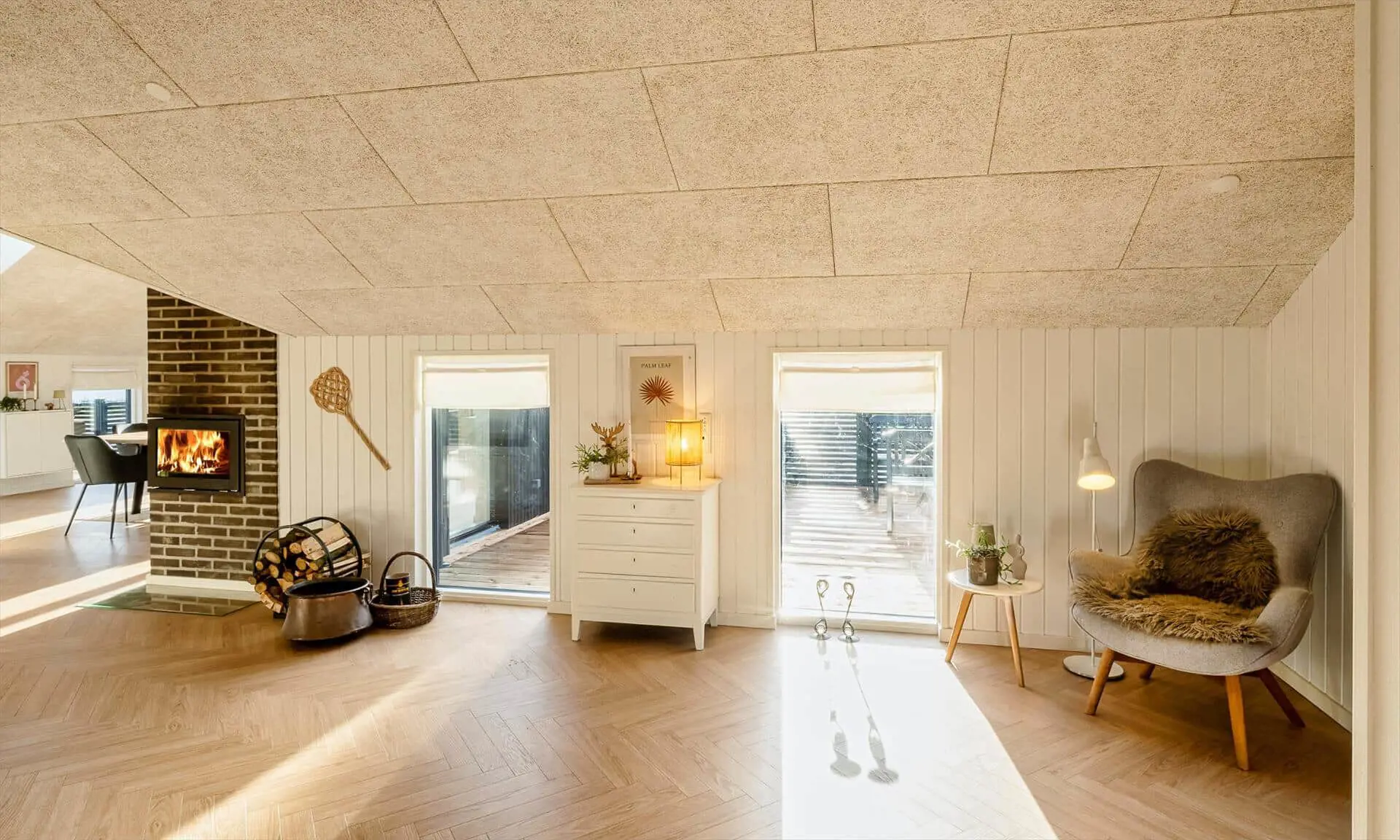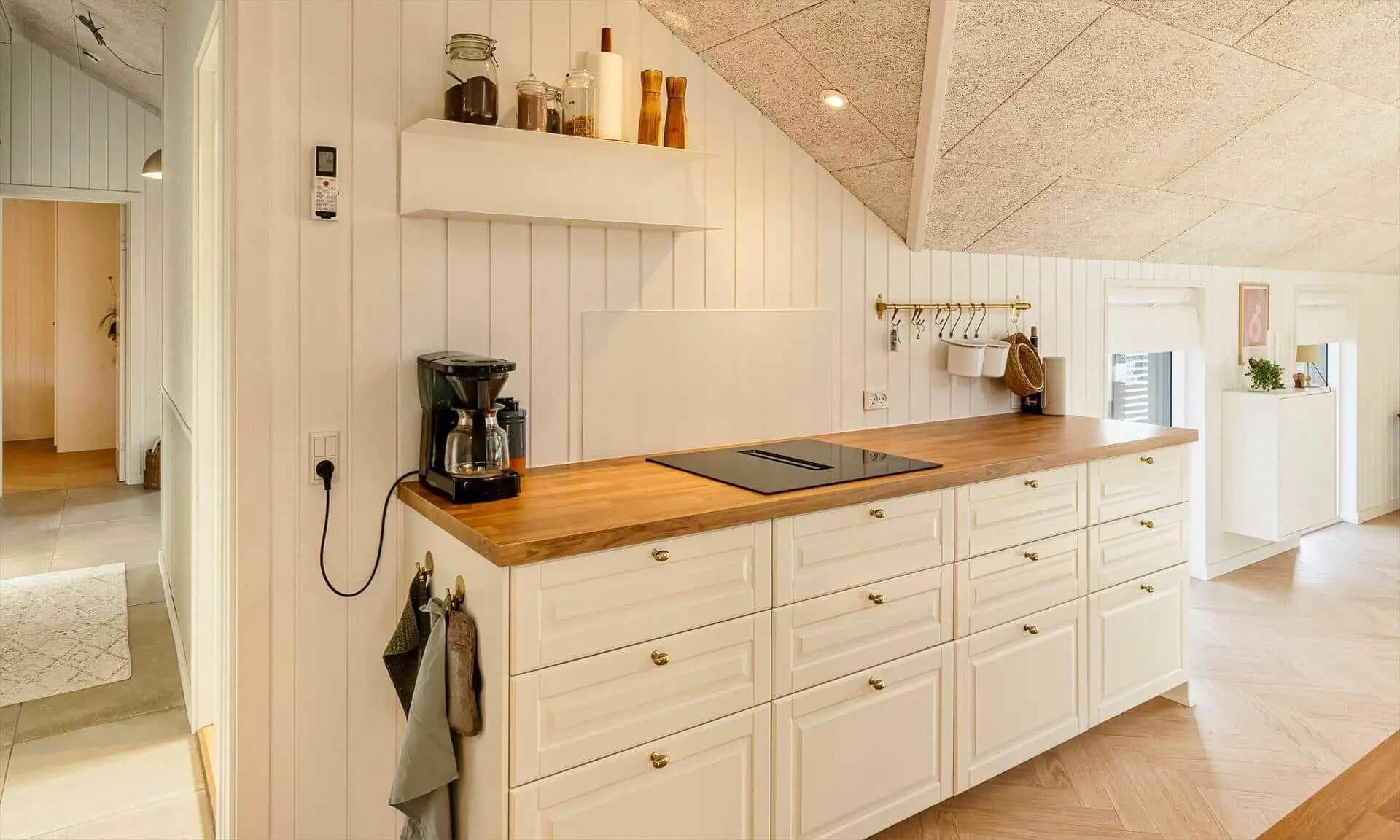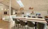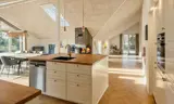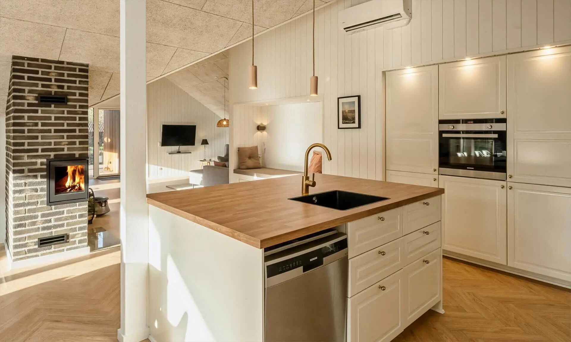 Die helle, moderne Küche lädt zum gemeinsamen Kochen und Beisammensein ein. Küche und Essbereich sind offen mit dem gemütlichen Wohnzimmer verbunden, in dem der Kaminofen für eine warme, entspannte Atmosphäre sorgt.