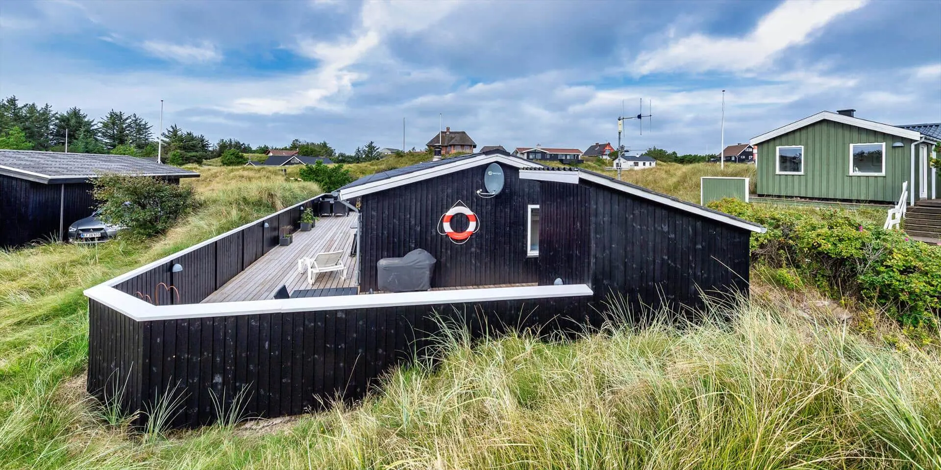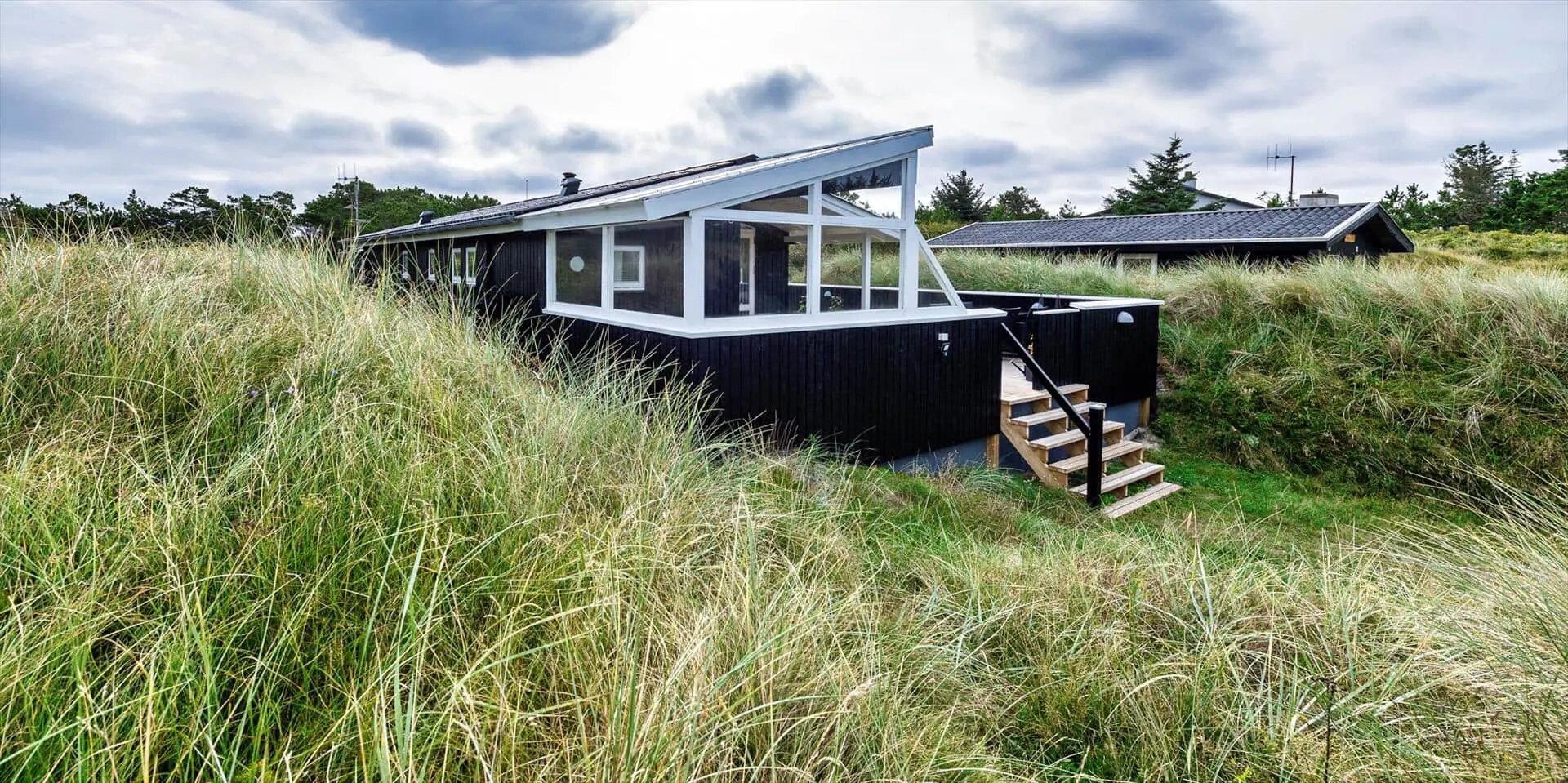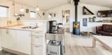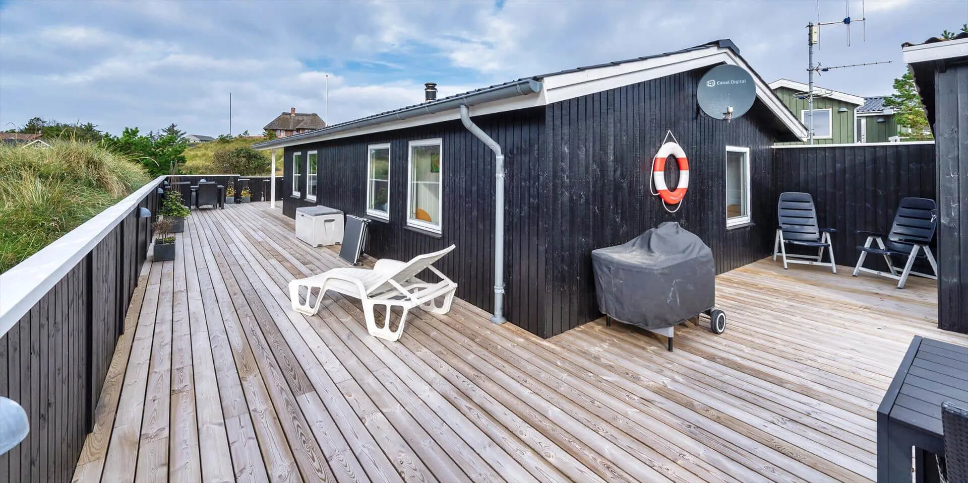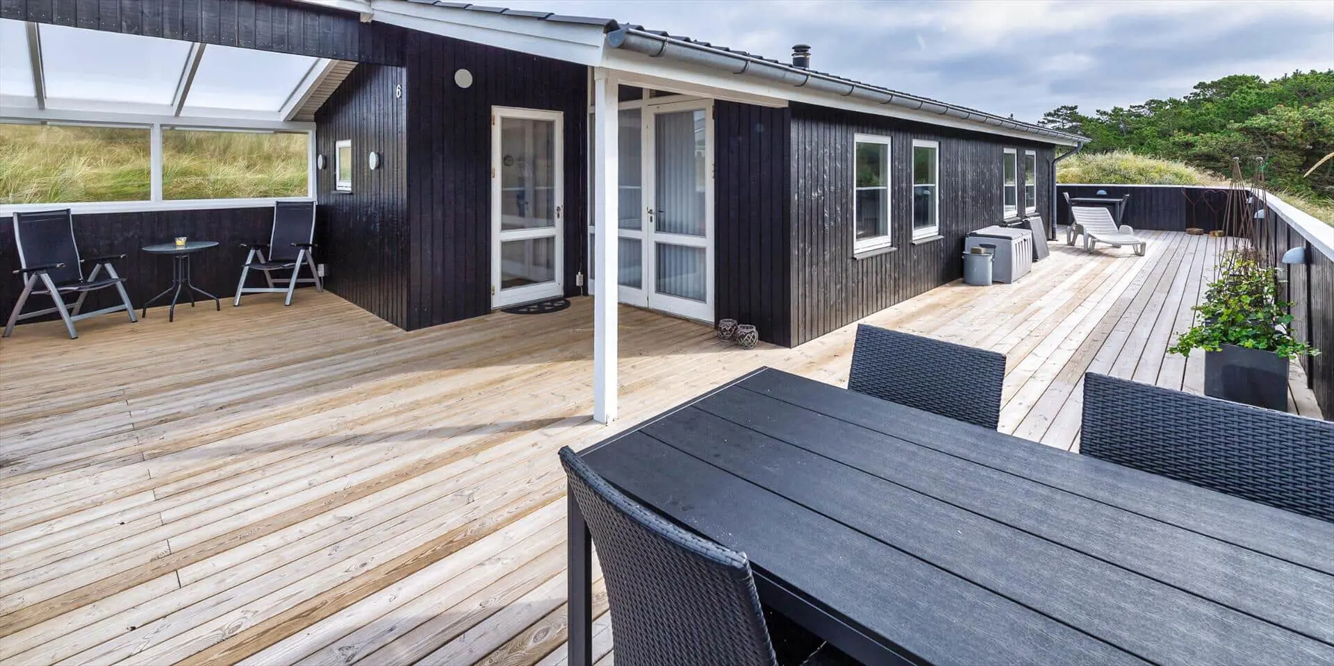 Dieses ansprechende Ferienhaus ist für 6 Personen ausgestattet und der Strand ist nur 400 Meter vom Haus entfernt. Der Wohnbereich ist mit dem Essbereich und der Küche offengehalten und mit einem hellen Laminatboden ausgelegt. Der Kamin steht in diesem Bereich und strahlt eine angenehme Wärme aus. Es befindet sich eine Wärmepumpe im Ferienhaus. Mit dieser Wärmepumpe haben sie die Möglichkeit die Stromkosten zu senken, denn die Wärmepumpe ist energiesparend. Das deutsche Fernsehprogramm empfangen Sie über eine Parabolantenne und Chrom Cast. Smart-Tv. Die Küche verfügt über einen Herd mit Cerankochfeld, einem Backofen, einer Mikrowelle, und einem Kühlschrank. In einem kleinen separaten Abstellraum befindet sich zusätzlich ein kleiner Gefrierschrank. Das Badezimmer ist mit einem WC, einem Handwaschbecken, einer Dusche und einer Sauna ausgestattet. Eine Waschmaschine steht Ihnen auch im Hause zur Benutzung zur Verfügung. Insgesamt gibt es drei Schlafzimmer im Ferienhaus. Zwei davon sind mit je einem Doppelbett ausgestattet und das Dritte verfügt über Etagenbetten. Das Ferienhaus verfügt über einen Internetanschluss (W-Lan). Es sind max. zwei Haustiere erlaubt. Für die Vierbeiner bietet sich die große geschlossene Terrasse gut an, denn hier können Sie mal Luft schnappen, ohne dass sie unbemerkt verschwinden können. Ein kleiner Bereich der Terrasse ist überdacht. Das Rauchen im Ferienhaus ist nicht erlaubt. Das Ferienhaus ist 1989 erbaut worden.