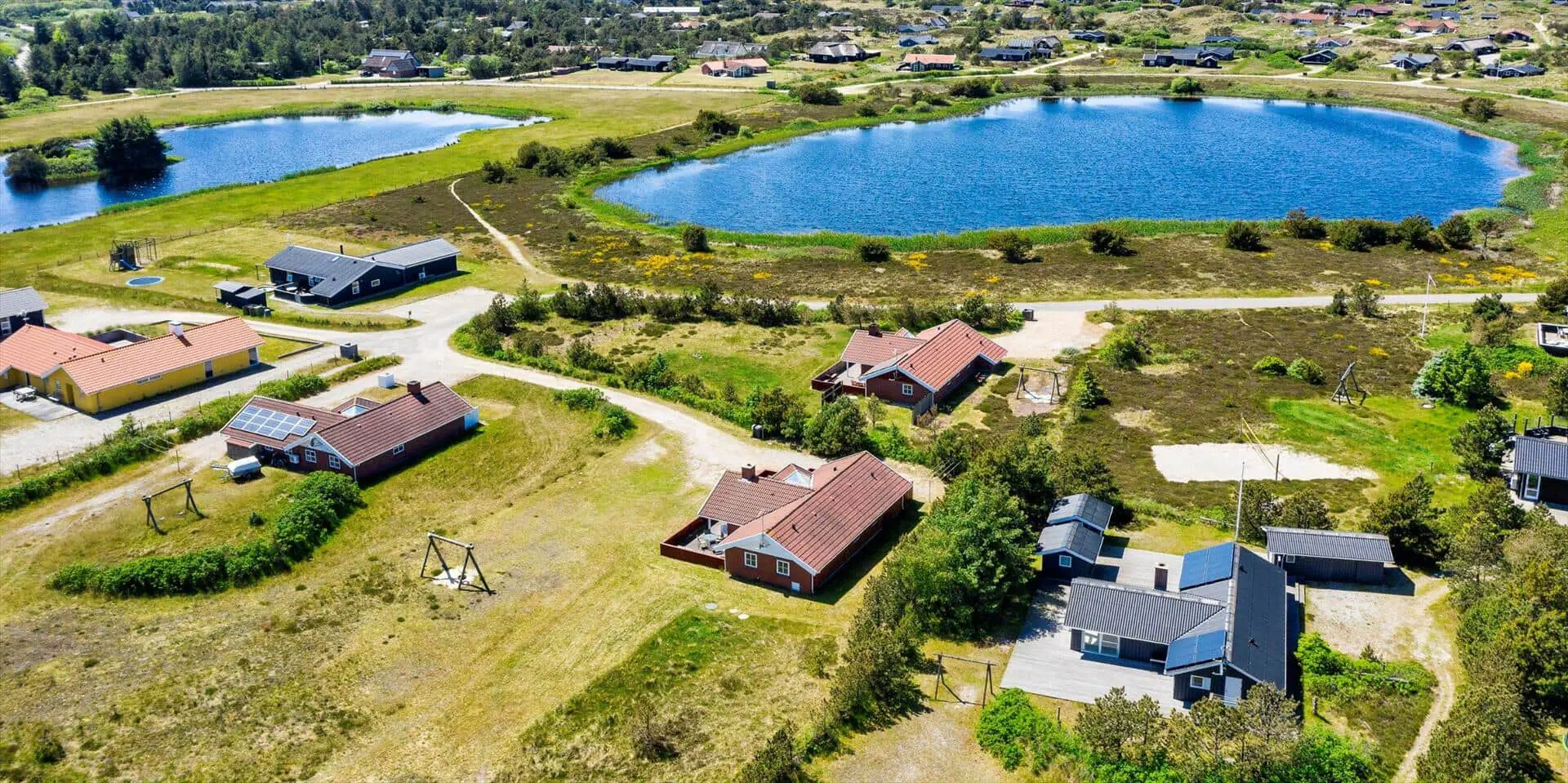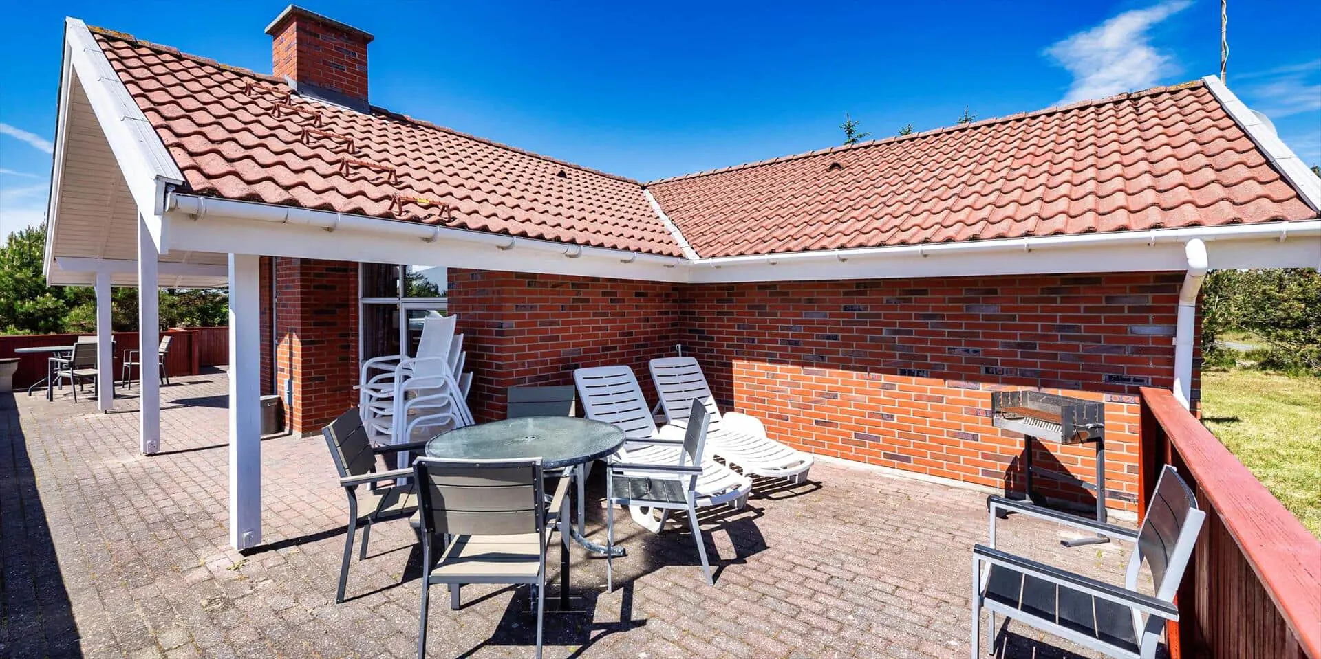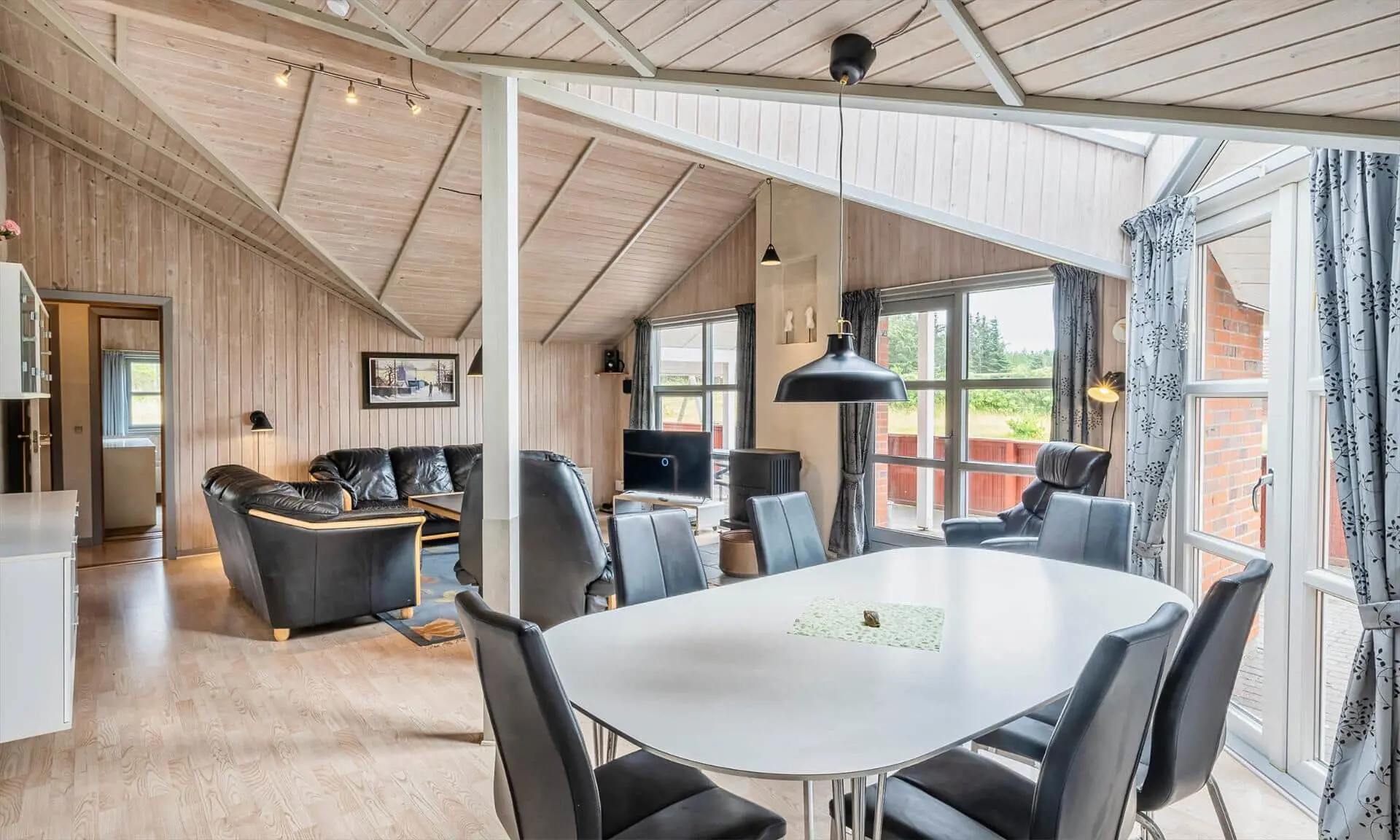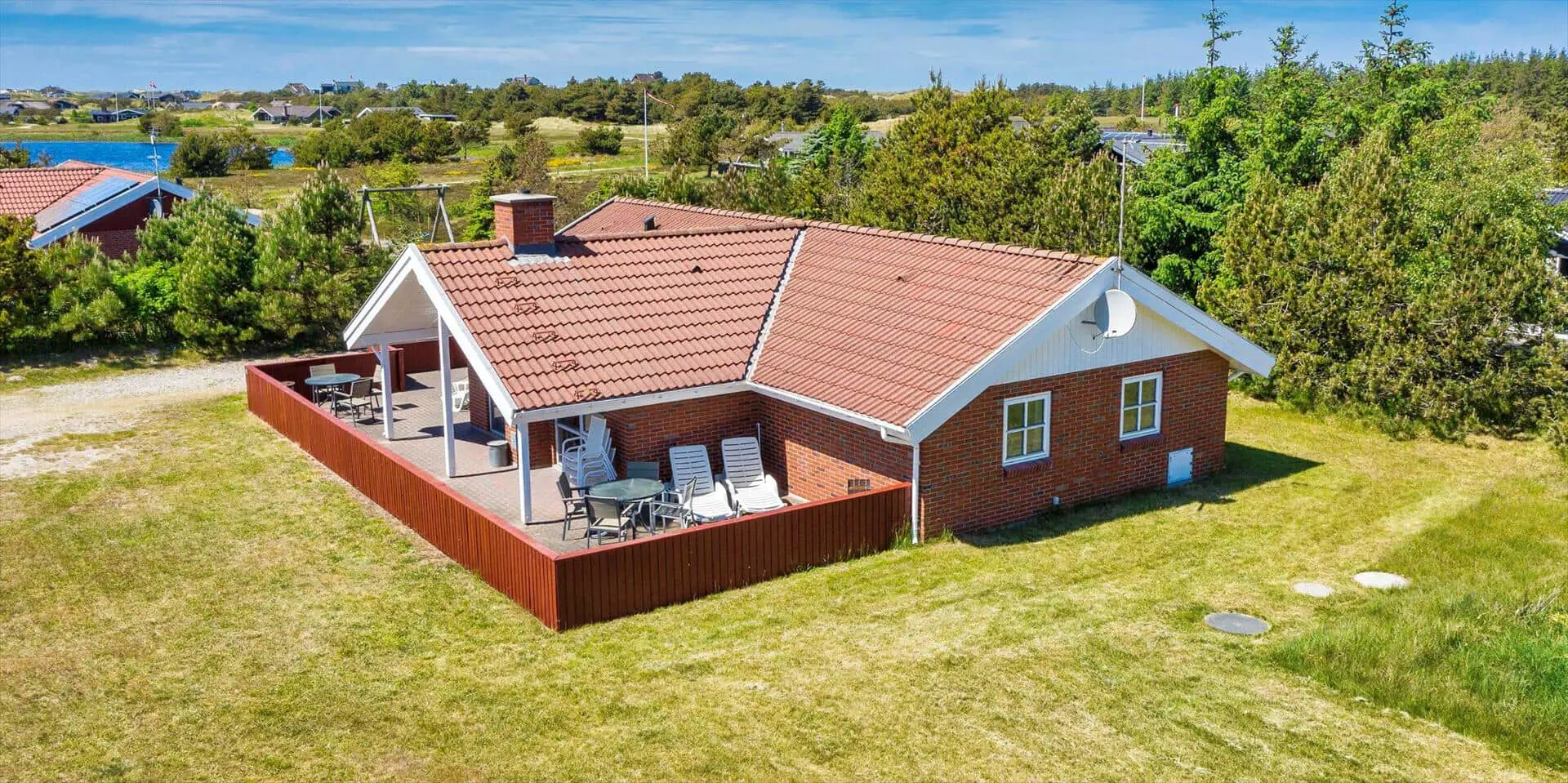 Auf diesem großen Naturgrundstück, am See vom Jafdalvej gelegen, liegt dieses für 8 Personen ausgestattete Steinhaus. Es liegt ca. 1 Km vom Strand entfernt. Hinter dem Ferienhaus befindet sich ein Fahrradweg, wo Sie ungestört auch zu Fuss nach Grærup gehen können. Es ist freundlich, durch die helle Holztäfelung und dem hübschen hellen Laminatfußboden, der übrigens im ganzen Ferienhaus, außer im Bad und Küche, verlegt ist. Das Bad ist gefliest und im Küchenbereich liegt Linoleum. Auf der großzügigen geschlossenen Terrasse können Ihre Vierbeiner zwischendurch mal Luft schnappen lassen, ohne das sie weglaufen können. Das Wohnzimmer ist mit einer gemütlichen 2er und 3er Sitzgruppe ausgestattet, direkt gegenüber dem Morsø-Kamin. Dieser gibt eine angenehme Wärme ab und macht die Abende recht hyggelich, so wie der Däne sagen würde.Smart TV und das deutsche Fernsehprogramm empfangen Sie über eine Parabol-Antenne. Am Esstisch ist genügend Platz für alle Bewohner vorhanden und durch das Oberlicht kommt viel Heiligkeit auf den Tisch. Die zum Essbereich offene Küche verfügt über eine Geschirrspülmaschine, einem Herd mit Cerankochfeld, einem Backofen, Mikrowelle und einer Kühl- und Gefrierkombination (2 Fächer). Die Küche ist auch gleich der Eingangsbereich, von dem der Hauswirtschaftsraum abzweigt. Hier ist die Waschmaschine und Trockner aufgestellt. Und es geht in das kleine Gäste WC, mit Handwaschbecken . Vom Wohn- und Essbereich gehen zwei Schlafzimmer und ein kleiner Flur ab. Vom Flur gelangen Sie dann weiter in ein großes Badezimmer und das dritte Schlafzimmer. Das Badezimmer ist neu und verfügt über ein WC, ein Handwaschbecken, eine Dusche, einem Whirlpool und der Sauna. Zwei der Schlafzimmer verfügen über Doppelbetten (2 x 90x200 Meter + 1 x 180x200 Meter) und das dritte Schlafzimmer hat 2 mal Etagenbetten, also insgesamt 4 Betten (mit je den Massen 90x200 Meter). Eine Sandkiste und ein Schaukelstativ stehen für Ihre Kinder zum Spielen bereit. Es sind max. 3 Haustiere erlaubt. Es befindet sich Internetanschluss (W-Lan) im Ferienhaus. Das Ferienhaus ist 1990 erbaut.