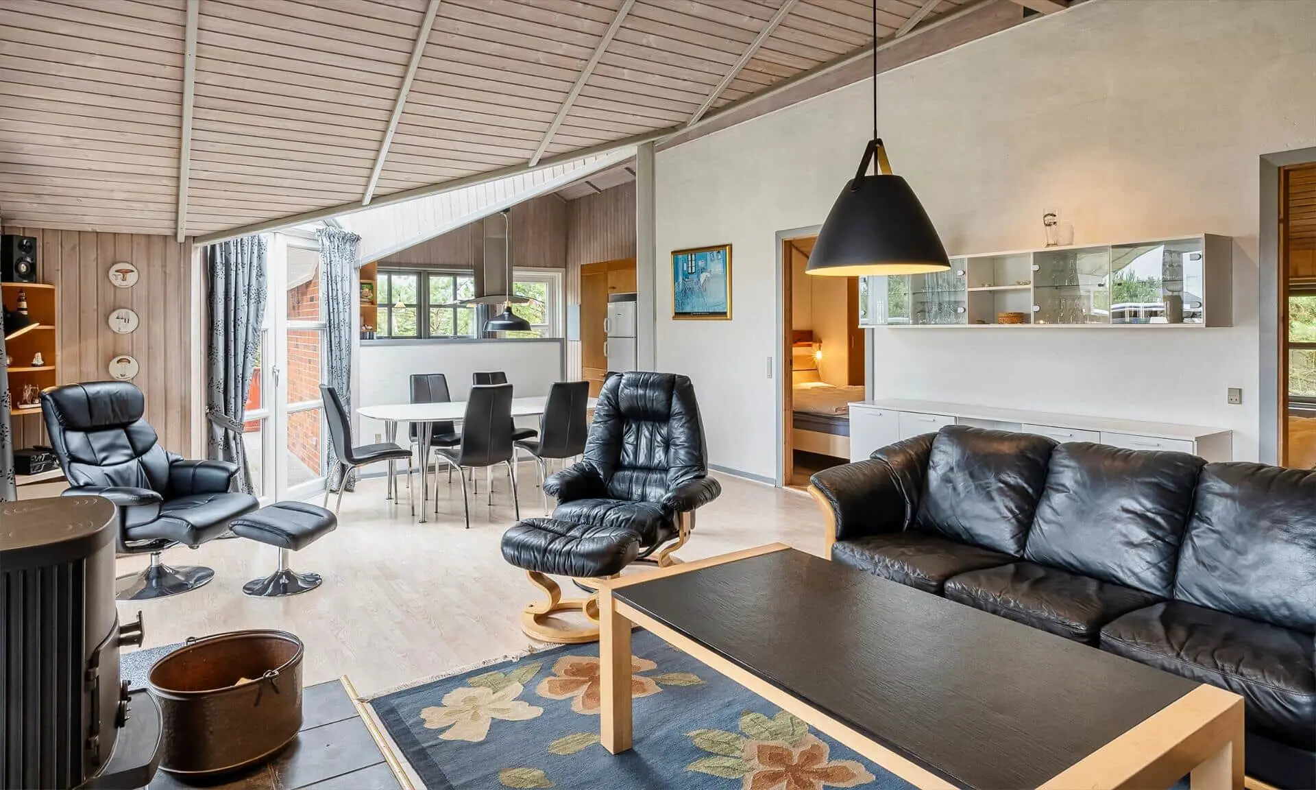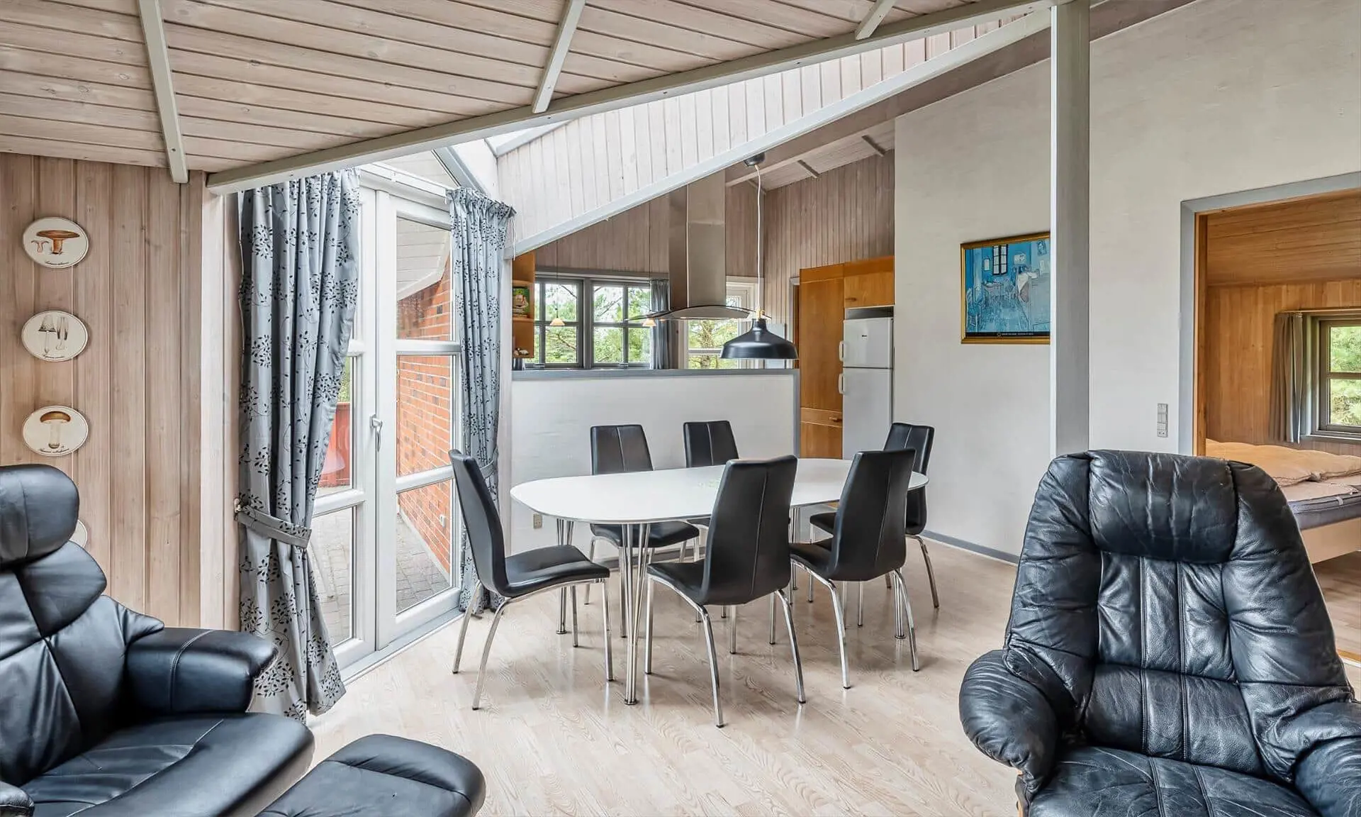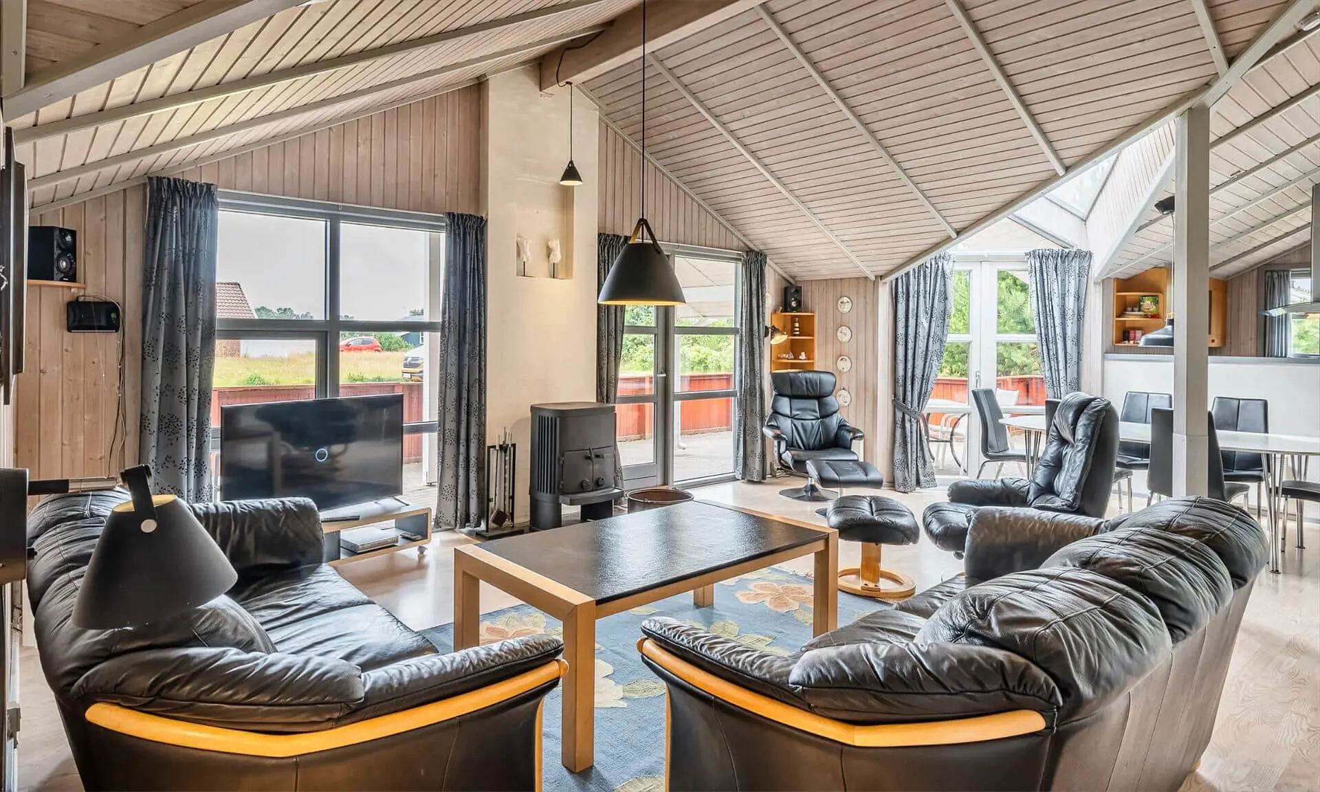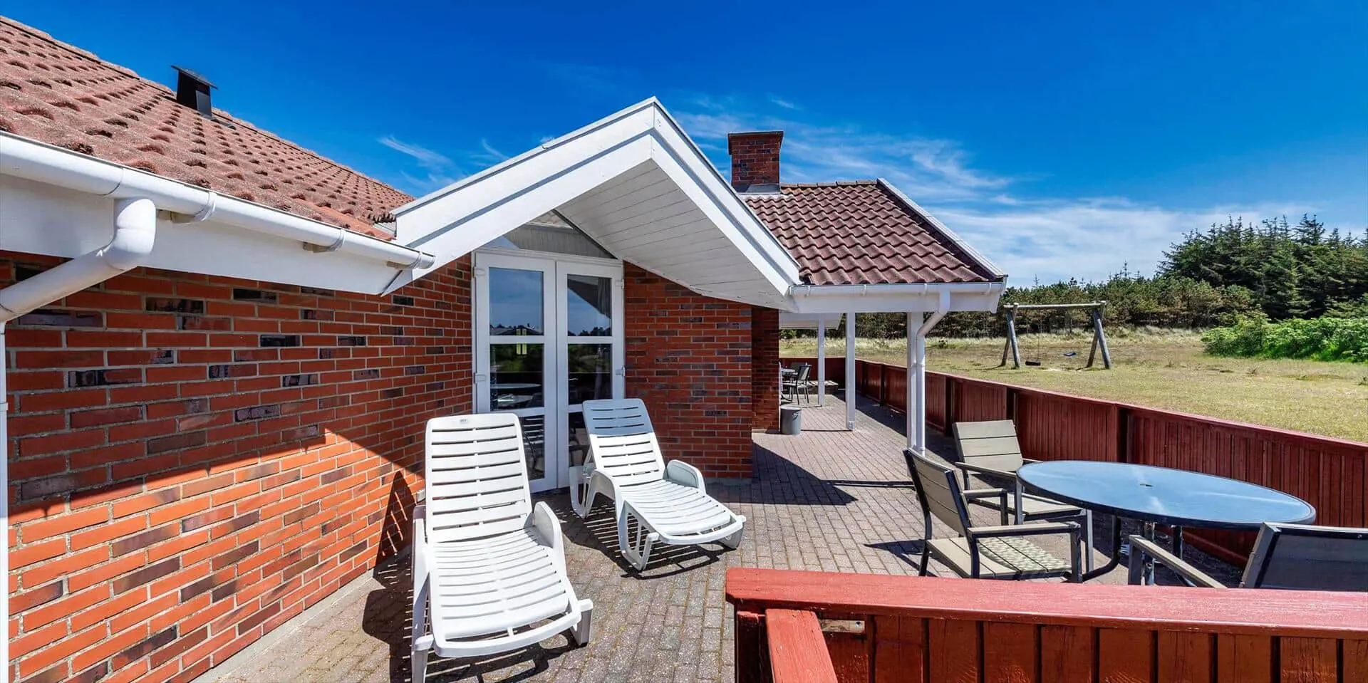 Auf diesem großen Naturgrundstück, am See vom Jafdalvej gelegen, liegt dieses für 8 Personen ausgestattete Steinhaus. Es liegt ca. 1 Km vom Strand entfernt. Hinter dem Ferienhaus befindet sich ein Fahrradweg, wo Sie ungestört auch zu Fuss nach Grærup gehen können. Es ist freundlich, durch die helle Holztäfelung und dem hübschen hellen Laminatfußboden, der übrigens im ganzen Ferienhaus, außer im Bad und Küche, verlegt ist. Das Bad ist gefliest und im Küchenbereich liegt Linoleum. Auf der großzügigen geschlossenen Terrasse können Ihre Vierbeiner zwischendurch mal Luft schnappen lassen, ohne das sie weglaufen können. Das Wohnzimmer ist mit einer gemütlichen 2er und 3er Sitzgruppe ausgestattet, direkt gegenüber dem Morsø-Kamin. Dieser gibt eine angenehme Wärme ab und macht die Abende recht hyggelich, so wie der Däne sagen würde.Smart TV und das deutsche Fernsehprogramm empfangen Sie über eine Parabol-Antenne. Am Esstisch ist genügend Platz für alle Bewohner vorhanden und durch das Oberlicht kommt viel Heiligkeit auf den Tisch. Die zum Essbereich offene Küche verfügt über eine Geschirrspülmaschine, einem Herd mit Cerankochfeld, einem Backofen, Mikrowelle und einer Kühl- und Gefrierkombination (2 Fächer). Die Küche ist auch gleich der Eingangsbereich, von dem der Hauswirtschaftsraum abzweigt. Hier ist die Waschmaschine und Trockner aufgestellt. Und es geht in das kleine Gäste WC, mit Handwaschbecken . Vom Wohn- und Essbereich gehen zwei Schlafzimmer und ein kleiner Flur ab. Vom Flur gelangen Sie dann weiter in ein großes Badezimmer und das dritte Schlafzimmer. Das Badezimmer ist neu und verfügt über ein WC, ein Handwaschbecken, eine Dusche, einem Whirlpool und der Sauna. Zwei der Schlafzimmer verfügen über Doppelbetten (2 x 90x200 Meter + 1 x 180x200 Meter) und das dritte Schlafzimmer hat 2 mal Etagenbetten, also insgesamt 4 Betten (mit je den Massen 90x200 Meter). Eine Sandkiste und ein Schaukelstativ stehen für Ihre Kinder zum Spielen bereit. Es sind max. 3 Haustiere erlaubt. Es befindet sich Internetanschluss (W-Lan) im Ferienhaus. Das Ferienhaus ist 1990 erbaut.