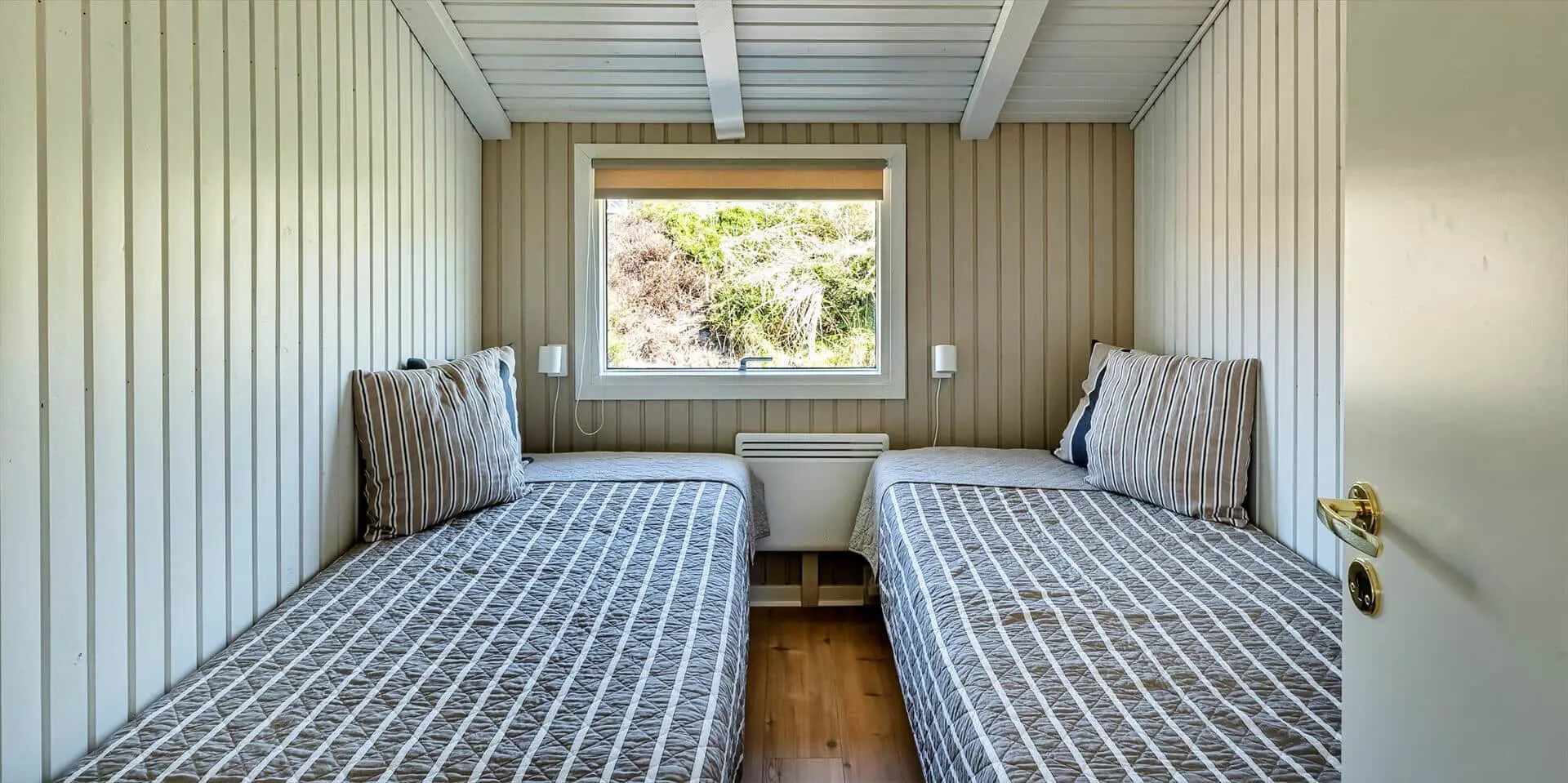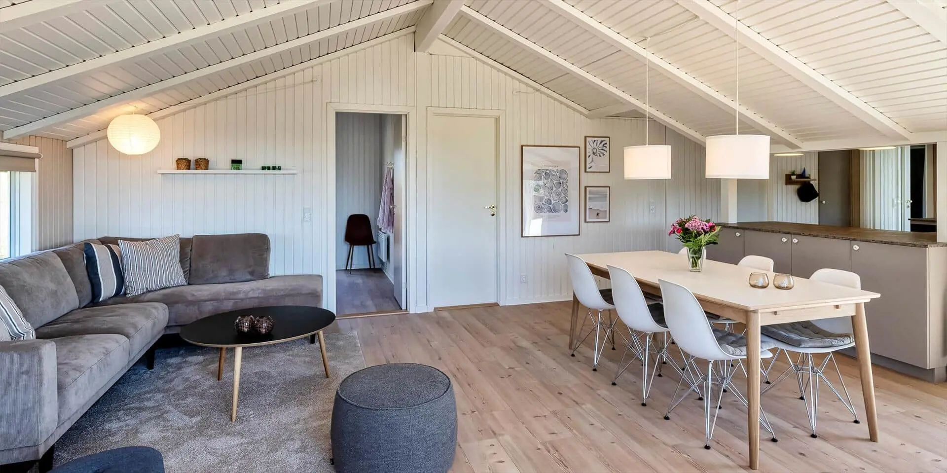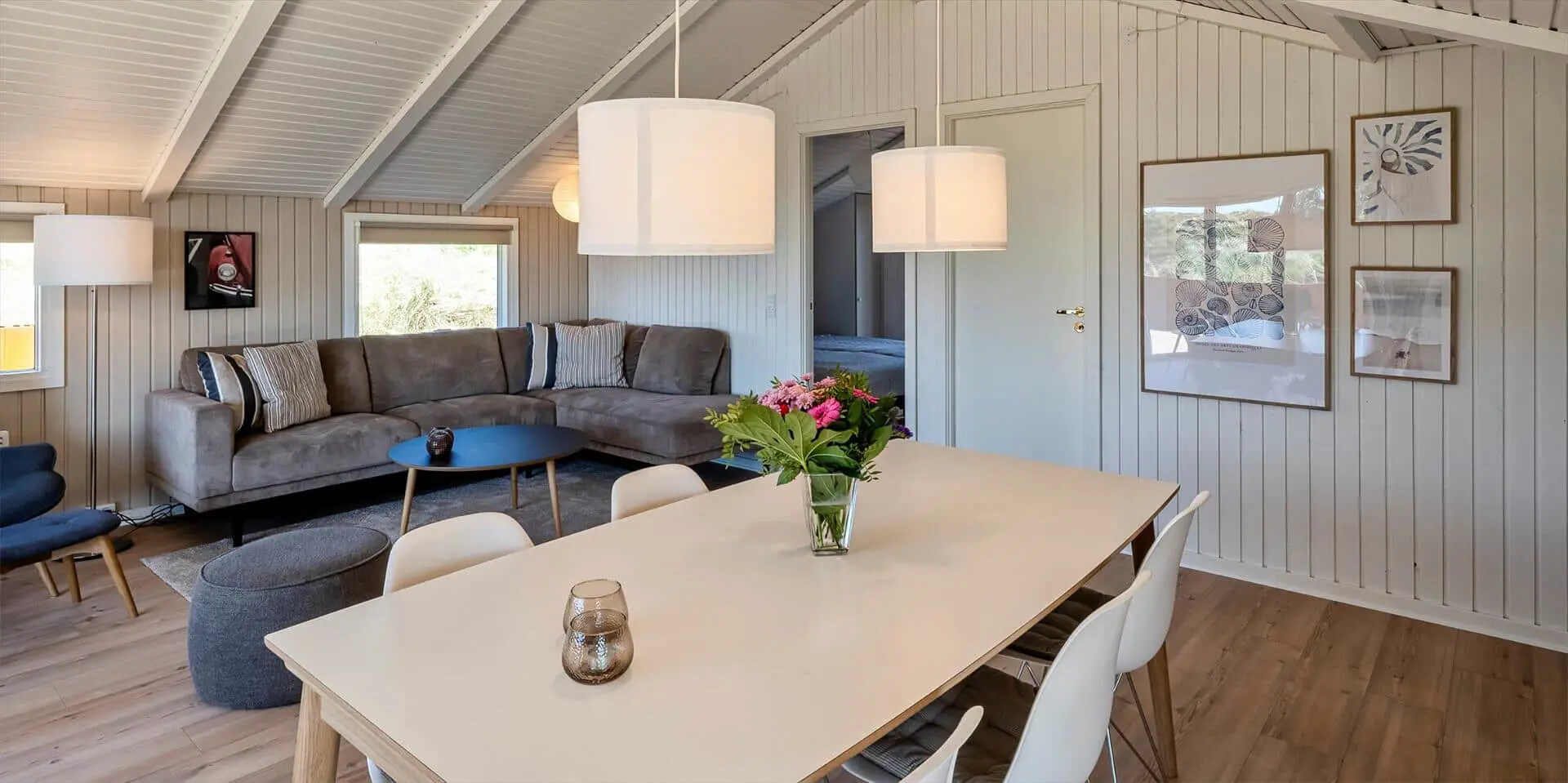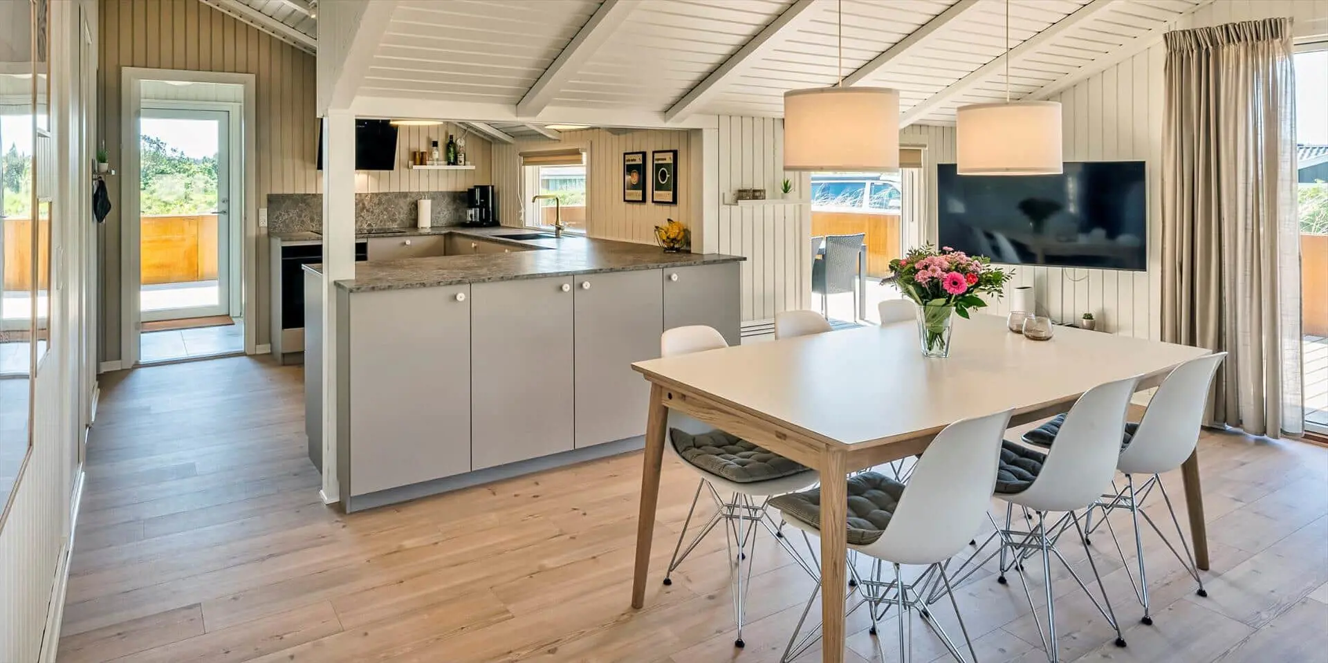 Schönes Ferienhaus auf einem Naturgrundstück und am Ende einer Sackgasse gelegen. Das Ferienhaus ist für 6 Personen ausgestattet und der Strand ist etwa 700 Meter vom Haus entfernt. Der Wohnbereich ist mit dem Essbereich und zum Küchenbereich hin offengehalten. In einer Ecke im Wohnbereich steht der Kamin. Das deutsche Fernsehprogramm empfangen Sie über Stofa. Die Küche ist einfach gehalten aber mit allem ausgestattet, was Sie brauchen; wie zum Beispiel einem Herd mit Cerankochfeld, einem Backofen, einer Geschirrspülmaschine, einer Mikrowelle und einer Kühl- und Gefrierkombination. Das Badezimmer ist mit einem WC, einem Handwaschbecken, einer Dusche, einer Sauna und einer Luxusbadewanne mit integrierter Lichttherapie und Spa-Air-Massage ausgestattet. Desweiteren gibt es eine Fußbodenheizung im Bad. Eine Waschmaschine steht im Hauswirtschaftsraum zur Benutzung bereit. Es stehen den Gästen insgesamt drei Schlafzimmer zur Verfügung. Drei Schlafzimmer mit guten Betten (DB + DB + 2EB). Ein Schlafzimmer mit zwei Einzelbetten und die beiden anderen Schlafzimmer mit je einem Doppelbett. Es befindet sich eine Wärmepumpe im Ferienhaus. Mit dieser Wärmepumpe haben Sie die Möglichkeit die Stromkosten zu senken, da sie energiesparend ist. Der schöne neue Terrassenbereich ist großzügig gehalten und geschlossen, mit tollen Blumenkästen umgeben und bietet gute windgeschützte Ecken. Es sind keine Haustiere erlaubt. Das Ferienhaus verfügt über einen Internetanschluss (W-Lan). Die Gäste müssen selber für Gas sorgen, wenn die Gasflasche für den Grill leer ist. Das Ferienhaus ist 1987 erbaut worden und in 2024 einer totalen Renovierung unterzogen worden.