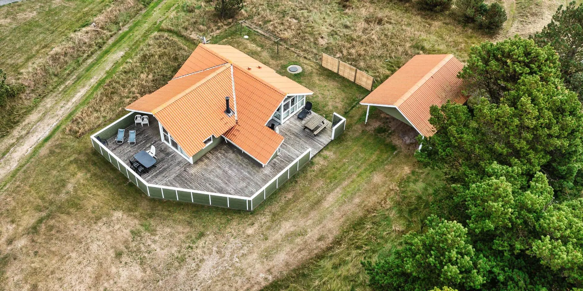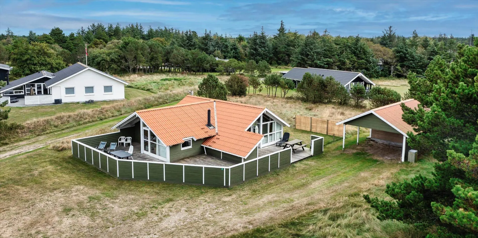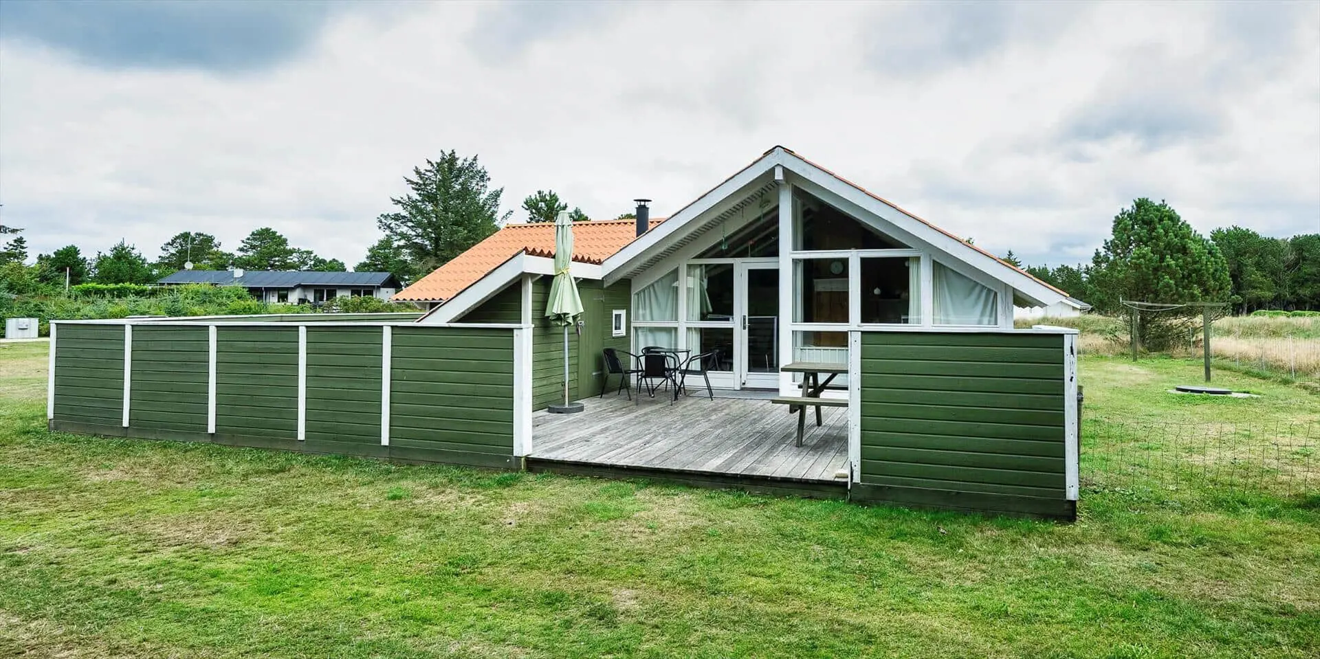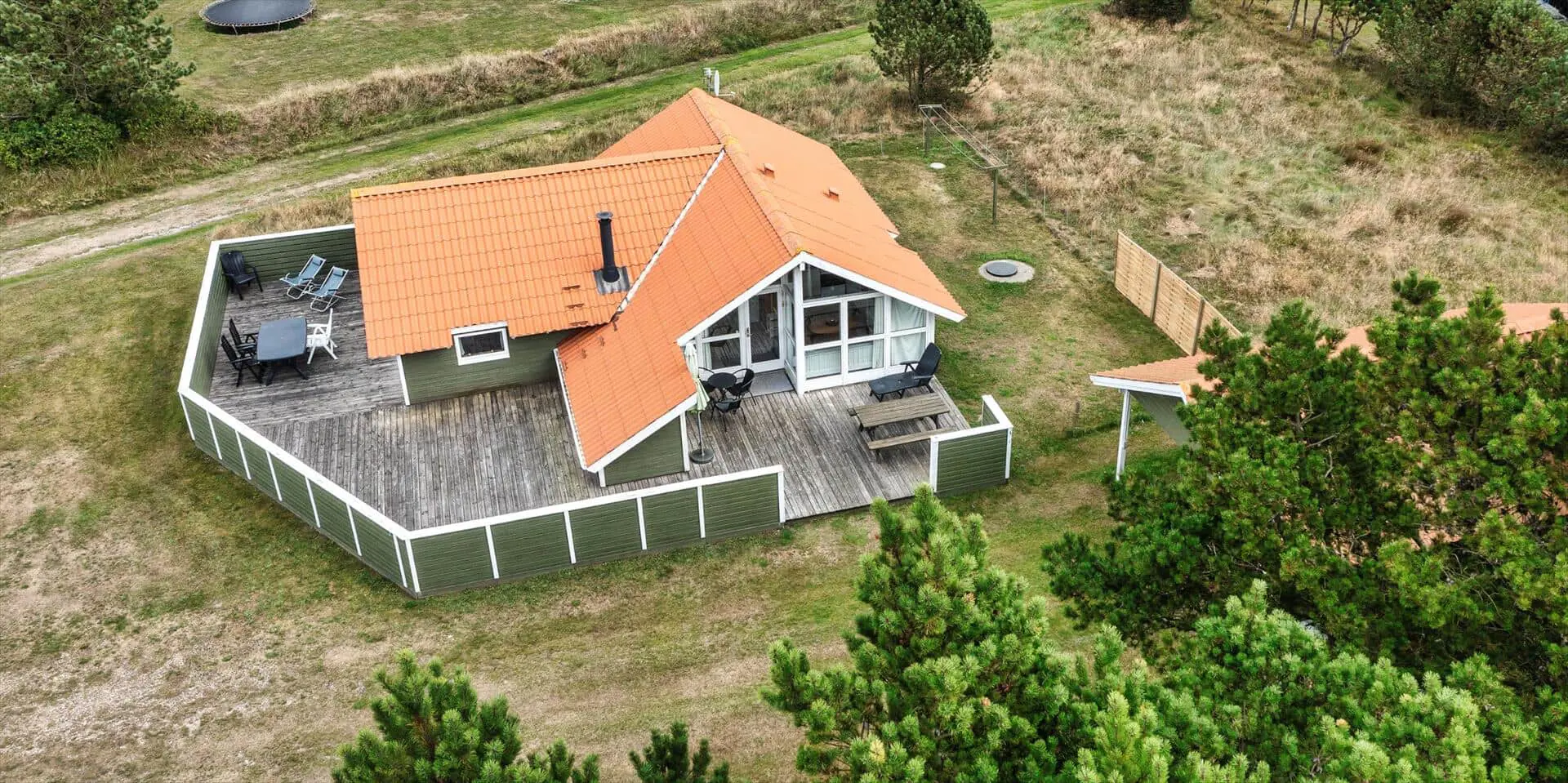 Dieses Ferienhaus liegt auf einem großen, offenen und naturbelassenem Rasengrundstück gelegen. Das Ferienhaus ist ausgestattet für 6 Personen und der Strand ist ca. 1,2 Km vom Haus entfernt. Der Wohnbereich verfügt über einen Kamin und in einer Ecke ist ein kleiner Alkoven, eine sogenannte Kuschelnische. Hier können sie sich zurückziehen und ein kleines Nickerchen halten. Das deutsche Fernsehprogramm empfangen Sie über eine Parabolantenne, Internetanschluss (W-Lan), DVD-Abspielgerät und Radio sind ebenfalls vorhanden. Die Küche ist zum Ess- und Wohnzimmer hin offen gehalten. Sie verfügt über einen Herd mit Kochplatten, einem Backofen, eine Mikrowelle, einer Geschirrspülmaschine und einer Kühl- und Gefrierkombination. Das Badezimmer ist mit einem WC, einem Handwaschbecken und einer Dusche ausgestattet. Eine Waschmaschine steht im Ferienhaus für die Gäste zur Verfügung. Es sind insgesamt drei Schlafzimmer vorhanden. Zwei davon sind mit je einem Doppelbett ausgestattet und das Dritte Schlafzimmer verfügt über ein 3/4 Doppelbett. Eine grosse Holzterrasse am Ferienhaus bietet genügend Platz für Ihr Sonnenbad oder für einen Grillabend an. Ihr Fahrzeug findet in dem Carport seinen Platz. Es sind keine Katze erlaubt. Rauchen ist nicht erlaubt. Ein kleiner Hund mit die Rückenhöhe von 30 cm ist erlaubt! Das Ferienhaus ist 1991 erbaut worden und in 2009 renoviert.