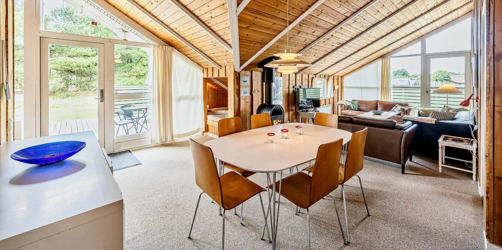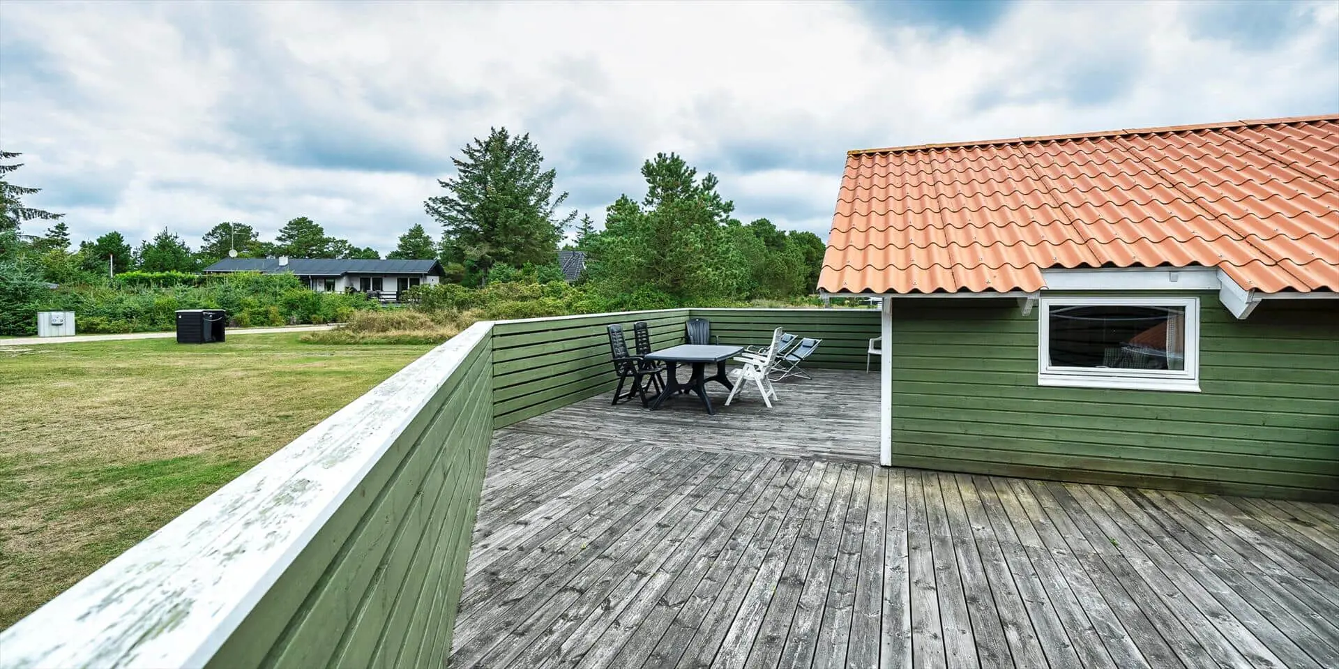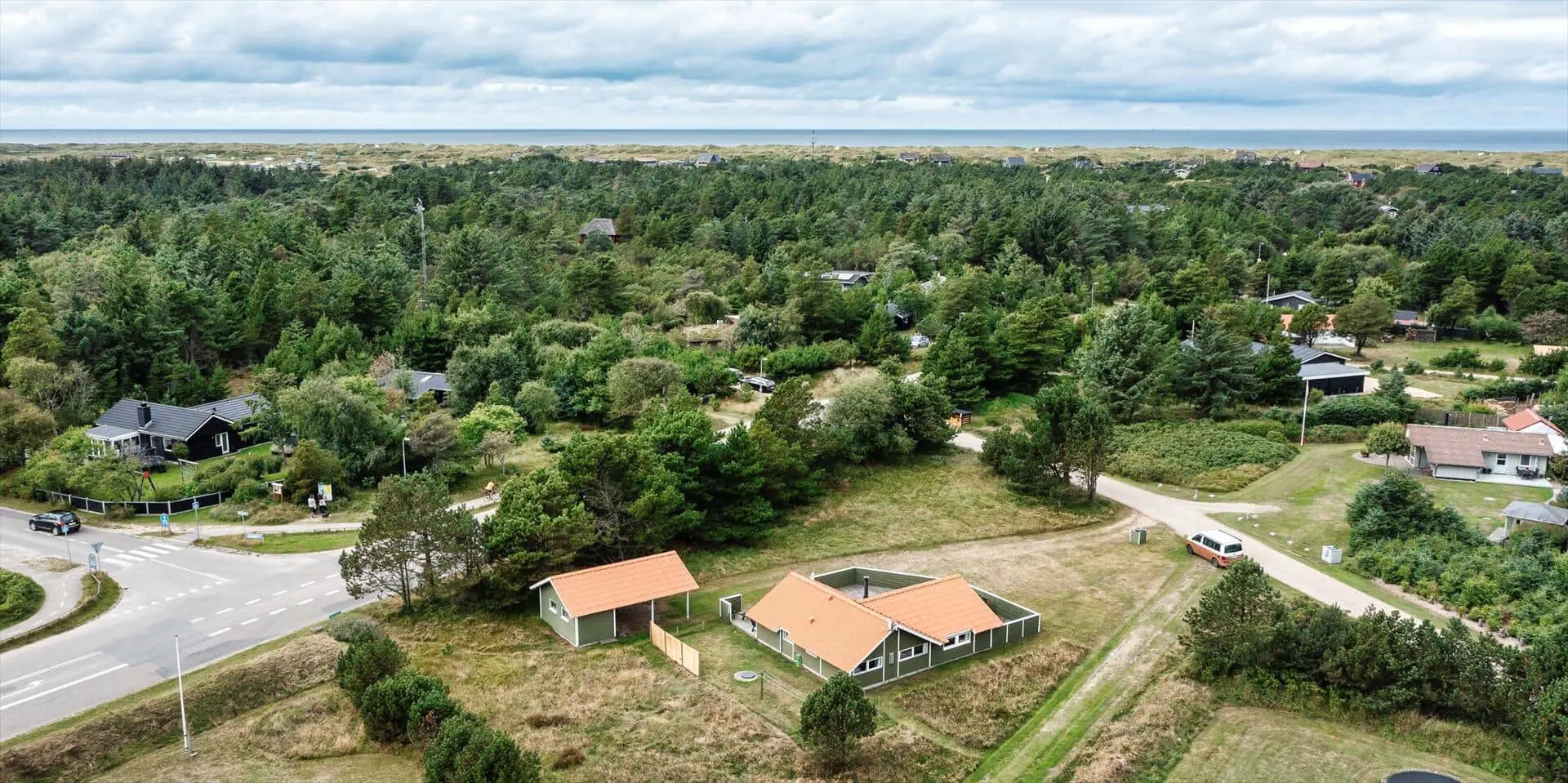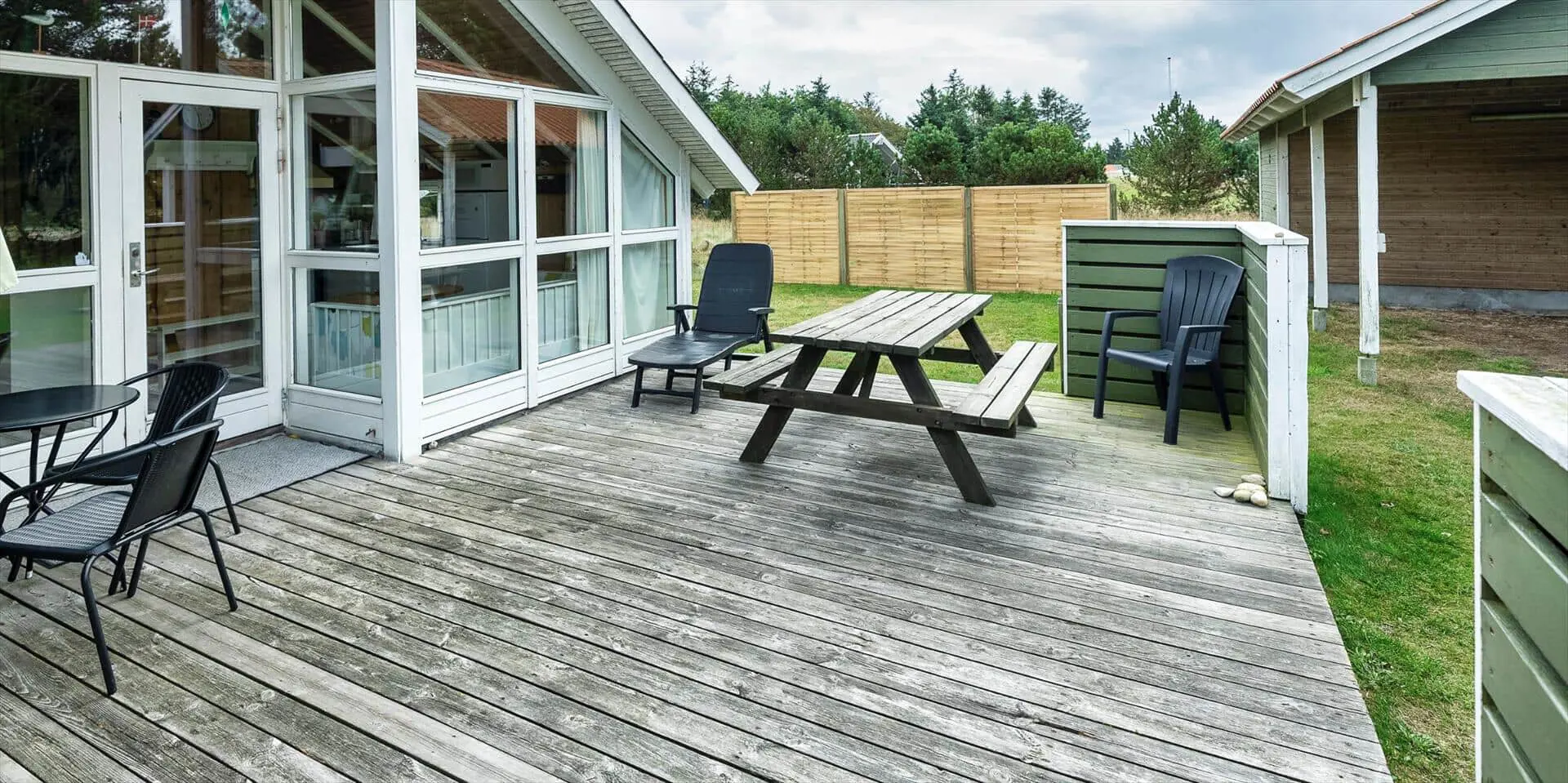 Dieses Ferienhaus liegt auf einem großen, offenen und naturbelassenem Rasengrundstück gelegen. Das Ferienhaus ist ausgestattet für 6 Personen und der Strand ist ca. 1,2 Km vom Haus entfernt. Der Wohnbereich verfügt über einen Kamin und in einer Ecke ist ein kleiner Alkoven, eine sogenannte Kuschelnische. Hier können sie sich zurückziehen und ein kleines Nickerchen halten. Das deutsche Fernsehprogramm empfangen Sie über eine Parabolantenne, Internetanschluss (W-Lan), DVD-Abspielgerät und Radio sind ebenfalls vorhanden. Die Küche ist zum Ess- und Wohnzimmer hin offen gehalten. Sie verfügt über einen Herd mit Kochplatten, einem Backofen, eine Mikrowelle, einer Geschirrspülmaschine und einer Kühl- und Gefrierkombination. Das Badezimmer ist mit einem WC, einem Handwaschbecken und einer Dusche ausgestattet. Eine Waschmaschine steht im Ferienhaus für die Gäste zur Verfügung. Es sind insgesamt drei Schlafzimmer vorhanden. Zwei davon sind mit je einem Doppelbett ausgestattet und das Dritte Schlafzimmer verfügt über ein 3/4 Doppelbett. Eine grosse Holzterrasse am Ferienhaus bietet genügend Platz für Ihr Sonnenbad oder für einen Grillabend an. Ihr Fahrzeug findet in dem Carport seinen Platz. Es sind keine Katze erlaubt. Rauchen ist nicht erlaubt. Ein kleiner Hund mit die Rückenhöhe von 30 cm ist erlaubt! Das Ferienhaus ist 1991 erbaut worden und in 2009 renoviert.