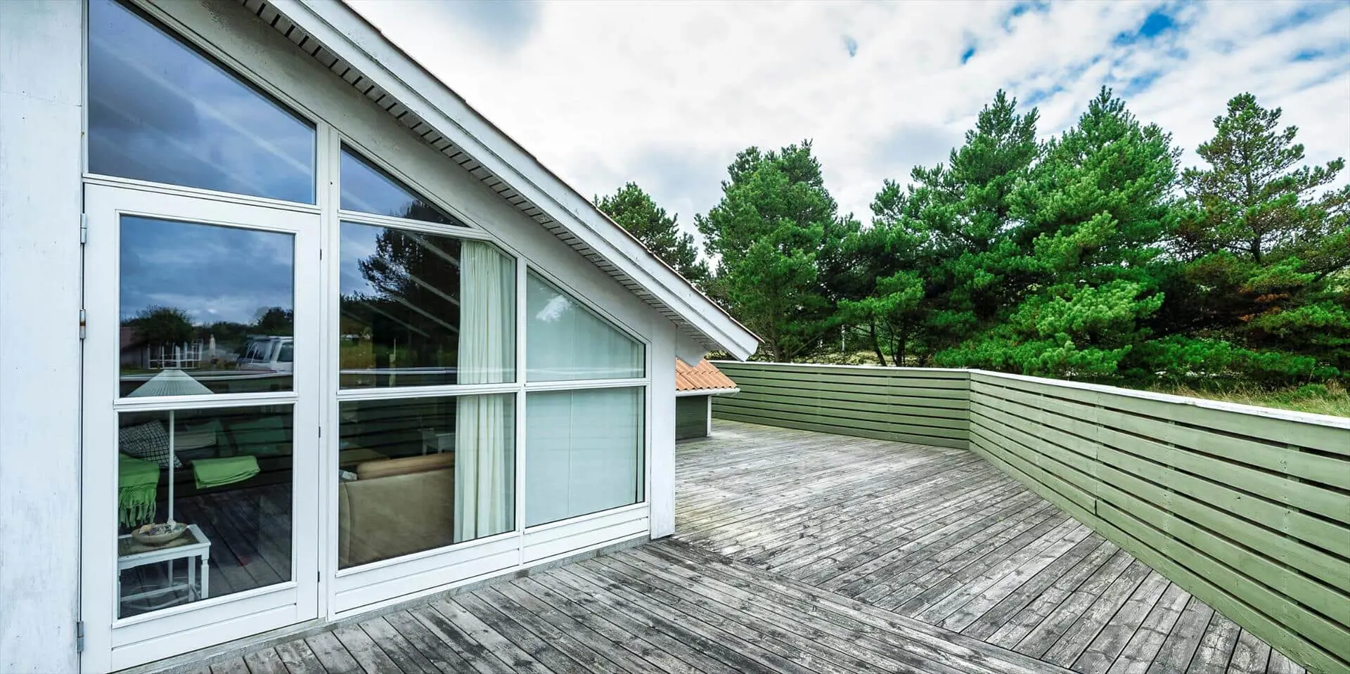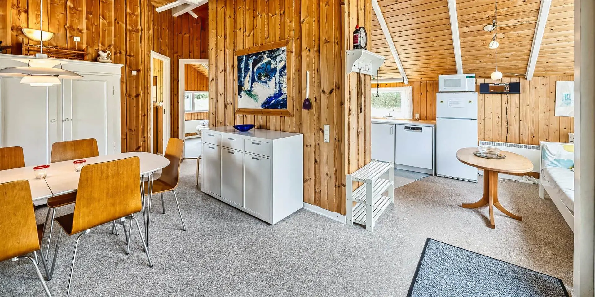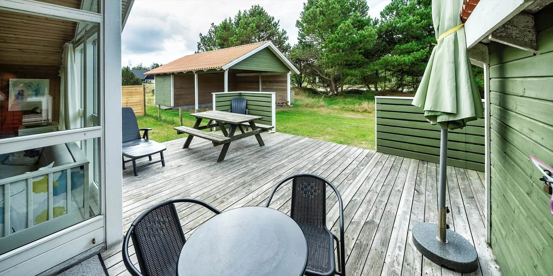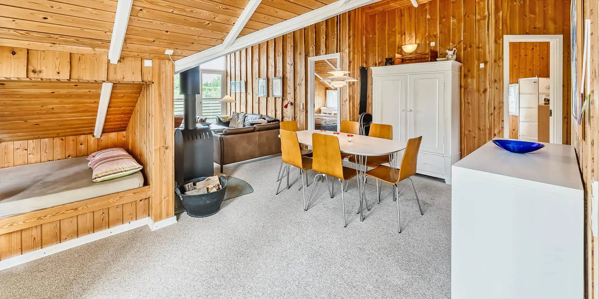 Dieses Ferienhaus liegt auf einem großen, offenen und naturbelassenem Rasengrundstück gelegen. Das Ferienhaus ist ausgestattet für 6 Personen und der Strand ist ca. 1,2 Km vom Haus entfernt. Der Wohnbereich verfügt über einen Kamin und in einer Ecke ist ein kleiner Alkoven, eine sogenannte Kuschelnische. Hier können sie sich zurückziehen und ein kleines Nickerchen halten. Das deutsche Fernsehprogramm empfangen Sie über eine Parabolantenne, Internetanschluss (W-Lan), DVD-Abspielgerät und Radio sind ebenfalls vorhanden. Die Küche ist zum Ess- und Wohnzimmer hin offen gehalten. Sie verfügt über einen Herd mit Kochplatten, einem Backofen, eine Mikrowelle, einer Geschirrspülmaschine und einer Kühl- und Gefrierkombination. Das Badezimmer ist mit einem WC, einem Handwaschbecken und einer Dusche ausgestattet. Eine Waschmaschine steht im Ferienhaus für die Gäste zur Verfügung. Es sind insgesamt drei Schlafzimmer vorhanden. Zwei davon sind mit je einem Doppelbett ausgestattet und das Dritte Schlafzimmer verfügt über ein 3/4 Doppelbett. Eine grosse Holzterrasse am Ferienhaus bietet genügend Platz für Ihr Sonnenbad oder für einen Grillabend an. Ihr Fahrzeug findet in dem Carport seinen Platz. Es sind keine Katze erlaubt. Rauchen ist nicht erlaubt. Ein kleiner Hund mit die Rückenhöhe von 30 cm ist erlaubt! Das Ferienhaus ist 1991 erbaut worden und in 2009 renoviert.