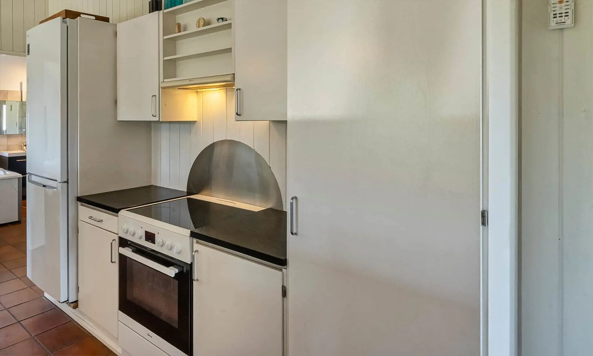 Drinnen erwartet dich ein heller, einladender Wohnbereich mit offenem Küchen‑Ess‑Wohnraum, Raum bis zum Dachfirst, großen Fenstern und gefliestem Boden. Vom Wohnzimmer hast du direkten Zugang zu einer teilweise überdachten, windgeschützten Terrasse — perfekt für sonnige Tage und gemütliche Abende im Freien.