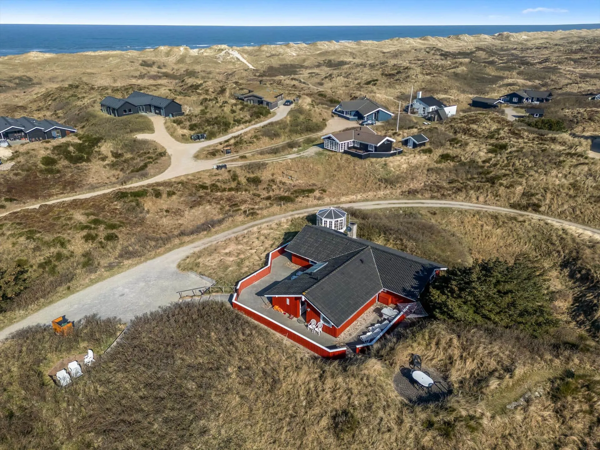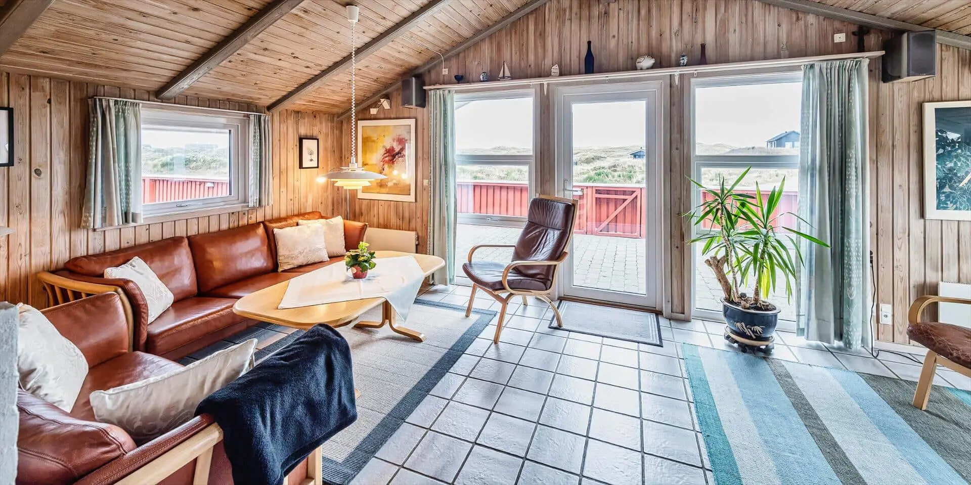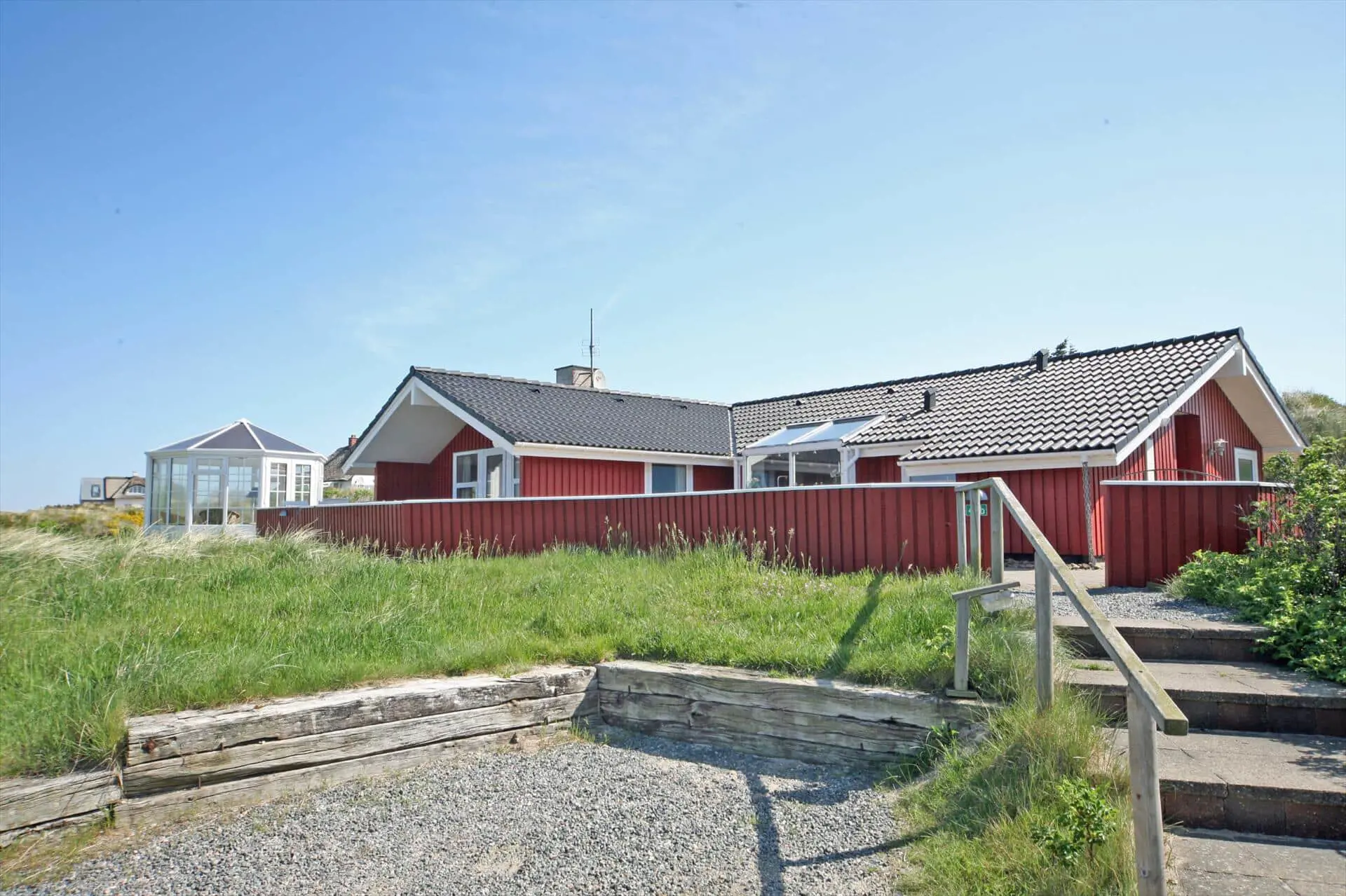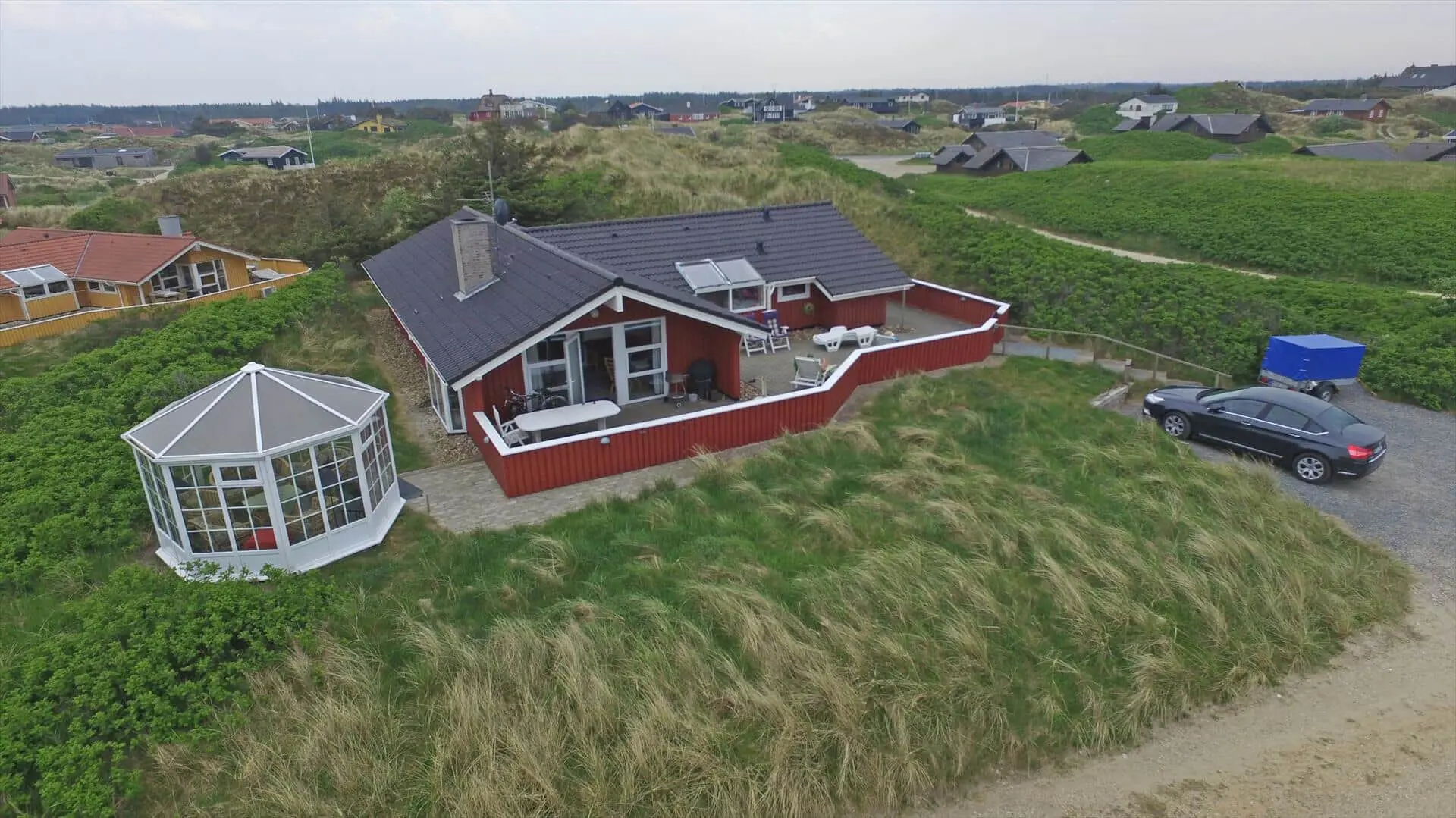 Schönes Ferienhaus auf einer Düne gelegen und in toller Umgebung. Über einen kleinen Treppenaufstieg gelangen Sie zum Ferienhaus. Das Ferienhaus ist für 8 Personen ausgestattet. Der Strand ist ca. 150 Meter vom Haus entfernt. Das Wohnzimmer ist gefliest und der Kamin ist in diesem Bereich aufgestellt. Das deutsche Fernsehprogramm empfangen Sie über eine Parabolantenne. Desweiteren gibt es Smart TV im Hause. Über eine kleine Stufe gelangen Sie in den Ess- und Küchenbereich. Die Küche verfügt über einen Herd mit Cerankochfeld, einem Backofen in Arbeitshöhe, einer Geschirrspülmaschine, einer Mikrowelle, und einer Kühl- und Gefrierkombination. Über dem Spülbecken befinden sich zwei Oberlichter. Von hier strahlt dann mehr Helligkeit in den Küchenbereich. Es gibt insgesamt zwei Bäder im Ferienhaus. Das kleine Gästebad verfügt über ein WC, ein Handwaschbecken und eine Dusche. Das große Badezimmer hat ein WC, ein Handwaschbecken, eine Dusche, eine Sauna und ein Standwasser-Whirlpool. Der Standwasser-Whirlpool steht ständig mit Wasser gefüllt und ist somit zu Ihrer Anreise sofort betriebsbereit. Es stehen insgesamt vier Schlafzimmer zur Verfügung. Zwei davon sind mit je einem Doppelbett ( 180 x 200), ein Schlafzimmer mit einem Doppelbett (140 x 200) und das Letzte mit zwei Einzelbetten ausgestattet. Eine Waschmaschine und ein Trockner sind in einem Hauswirtschaftsraum untergebracht. Das Ferienhaus verfügt über einen Internetanschluss (W-Lan). Des weiteren befindet sich eine Varmepumpe im Ferienhaus. Mit dieser Warmepumpe haben Sie die Möglichkeit die Stromkosten zu senken, da sie energiesparend ist. Der große Terrassenbereich ist geschlossen und eignet sich daher auch für Ihre Vierbeiner. Die können mal schnell raus und ein bisschen Luft schnappen, ohne das sie stiften gehen können und sie haben natürlich auch genügend Platz für Ihr Sonnenbad. Es sind max. zwei Haustiere erlaubt. Vom Terrassenbereich haben Sie ebenfalls einen tollen Panoramablick. Das Rauchen im Ferienhaus ist nicht erlaubt. Auf einer weiteren kleinen Düne ist eine kleine Sitzgruppe aufgestellt. Diesen Sitzplatz erreichen Sie über einen Treppenaufgang. Desweiteren steht zusätzlich ein Gartenpavillon auf dem Grundstück, dieser kann mit einer Elektroheizung beheizt werden. Hübsche Rattanmöbel schücken diesen Pavillon und der Fußboden ist mit Fliesen ausgelegt. Auch von hier haben Sie einen wundervollen Panoramablick auf das Ferienhausgebiet.Das Ferienhaus ist 1992 erbaut worden.