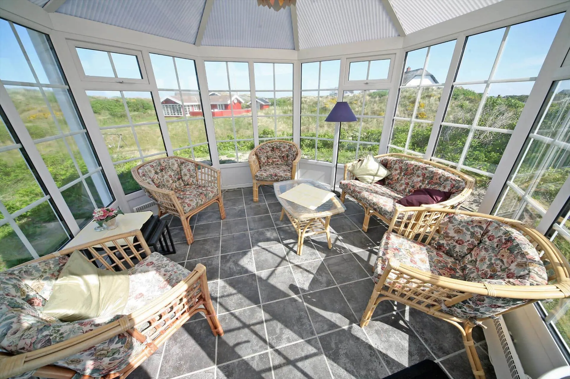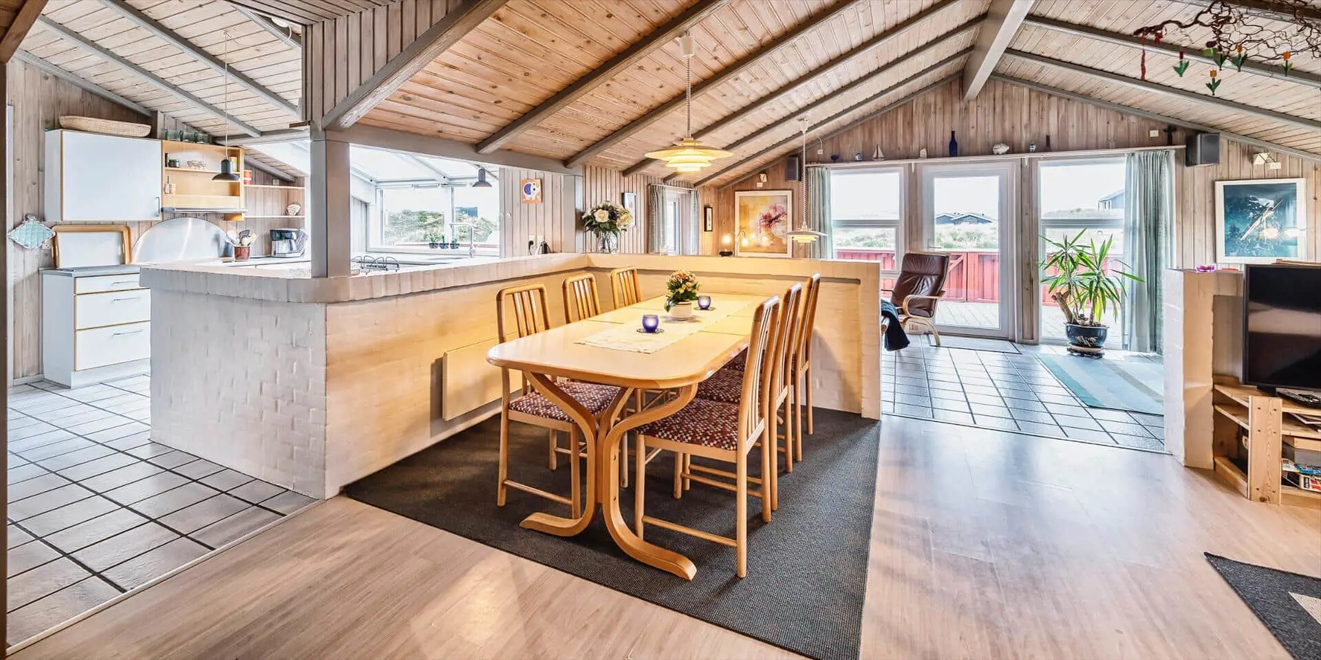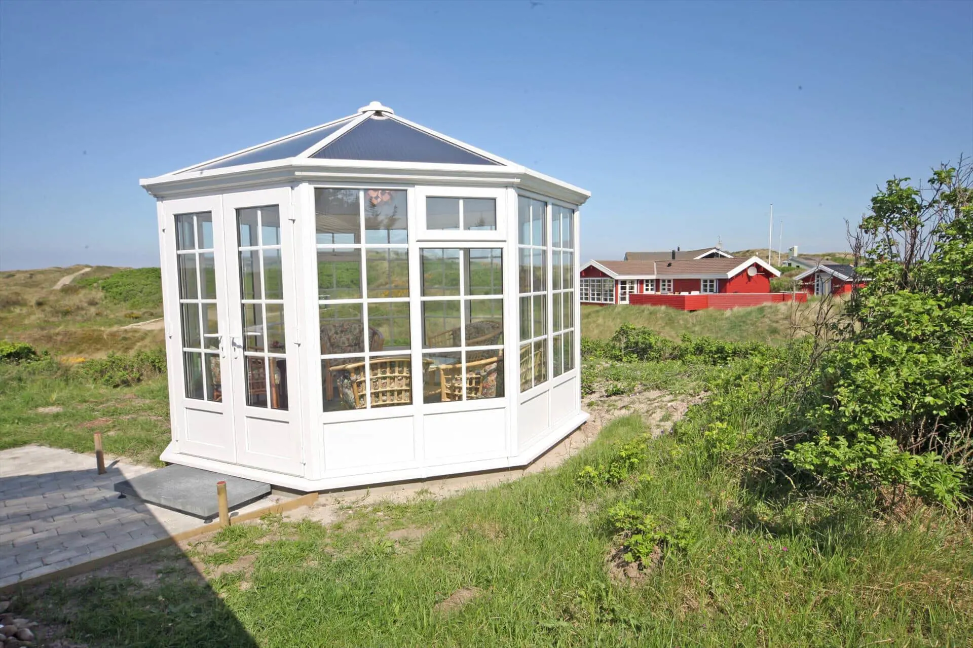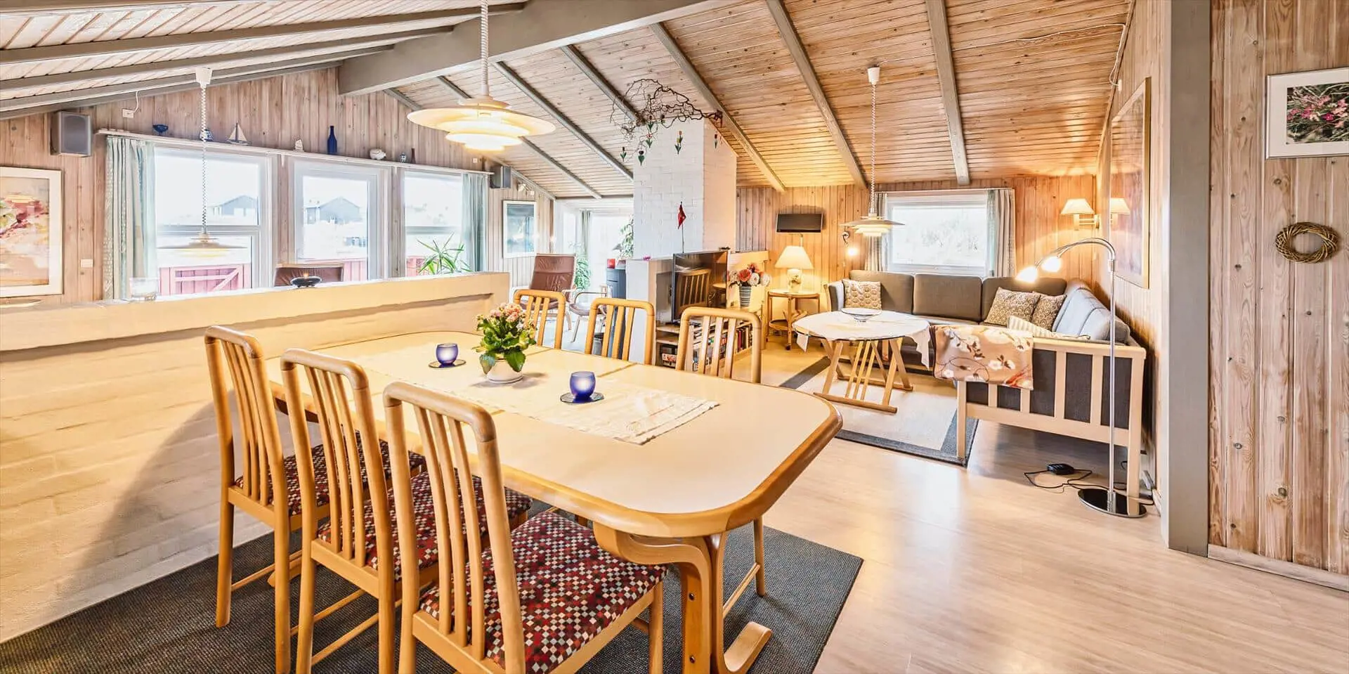 Schönes Ferienhaus auf einer Düne gelegen und in toller Umgebung. Über einen kleinen Treppenaufstieg gelangen Sie zum Ferienhaus. Das Ferienhaus ist für 8 Personen ausgestattet. Der Strand ist ca. 150 Meter vom Haus entfernt. Das Wohnzimmer ist gefliest und der Kamin ist in diesem Bereich aufgestellt. Das deutsche Fernsehprogramm empfangen Sie über eine Parabolantenne. Desweiteren gibt es Smart TV im Hause. Über eine kleine Stufe gelangen Sie in den Ess- und Küchenbereich. Die Küche verfügt über einen Herd mit Cerankochfeld, einem Backofen in Arbeitshöhe, einer Geschirrspülmaschine, einer Mikrowelle, und einer Kühl- und Gefrierkombination. Über dem Spülbecken befinden sich zwei Oberlichter. Von hier strahlt dann mehr Helligkeit in den Küchenbereich. Es gibt insgesamt zwei Bäder im Ferienhaus. Das kleine Gästebad verfügt über ein WC, ein Handwaschbecken und eine Dusche. Das große Badezimmer hat ein WC, ein Handwaschbecken, eine Dusche, eine Sauna und ein Standwasser-Whirlpool. Der Standwasser-Whirlpool steht ständig mit Wasser gefüllt und ist somit zu Ihrer Anreise sofort betriebsbereit. Es stehen insgesamt vier Schlafzimmer zur Verfügung. Zwei davon sind mit je einem Doppelbett ( 180 x 200), ein Schlafzimmer mit einem Doppelbett (140 x 200) und das Letzte mit zwei Einzelbetten ausgestattet. Eine Waschmaschine und ein Trockner sind in einem Hauswirtschaftsraum untergebracht. Das Ferienhaus verfügt über einen Internetanschluss (W-Lan). Des weiteren befindet sich eine Varmepumpe im Ferienhaus. Mit dieser Warmepumpe haben Sie die Möglichkeit die Stromkosten zu senken, da sie energiesparend ist. Der große Terrassenbereich ist geschlossen und eignet sich daher auch für Ihre Vierbeiner. Die können mal schnell raus und ein bisschen Luft schnappen, ohne das sie stiften gehen können und sie haben natürlich auch genügend Platz für Ihr Sonnenbad. Es sind max. zwei Haustiere erlaubt. Vom Terrassenbereich haben Sie ebenfalls einen tollen Panoramablick. Das Rauchen im Ferienhaus ist nicht erlaubt. Auf einer weiteren kleinen Düne ist eine kleine Sitzgruppe aufgestellt. Diesen Sitzplatz erreichen Sie über einen Treppenaufgang. Desweiteren steht zusätzlich ein Gartenpavillon auf dem Grundstück, dieser kann mit einer Elektroheizung beheizt werden. Hübsche Rattanmöbel schücken diesen Pavillon und der Fußboden ist mit Fliesen ausgelegt. Auch von hier haben Sie einen wundervollen Panoramablick auf das Ferienhausgebiet.Das Ferienhaus ist 1992 erbaut worden.