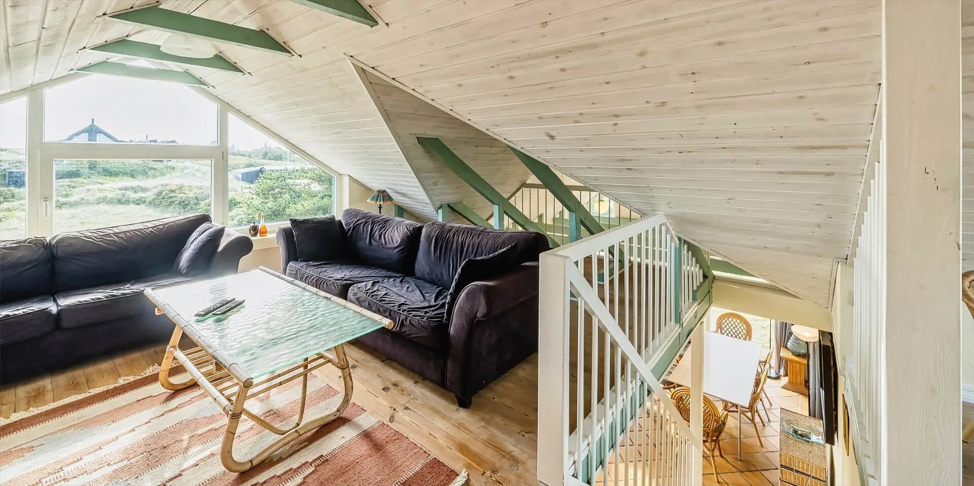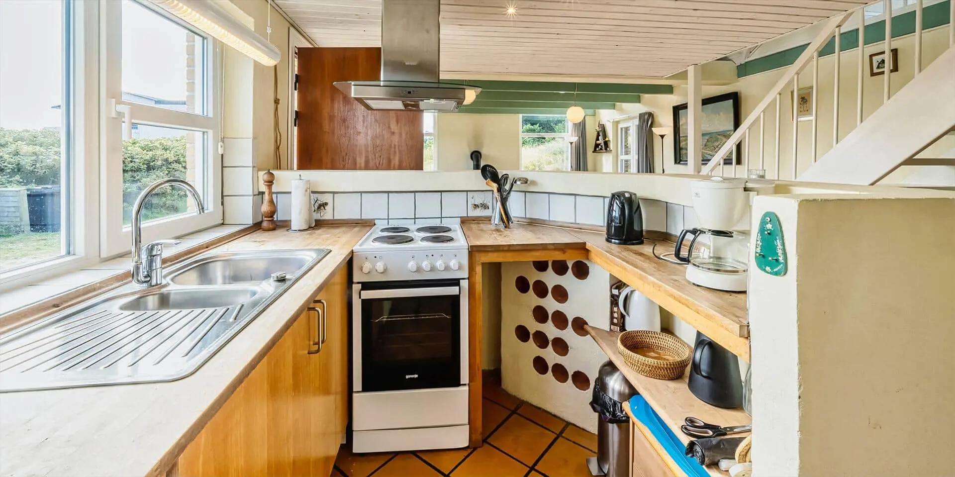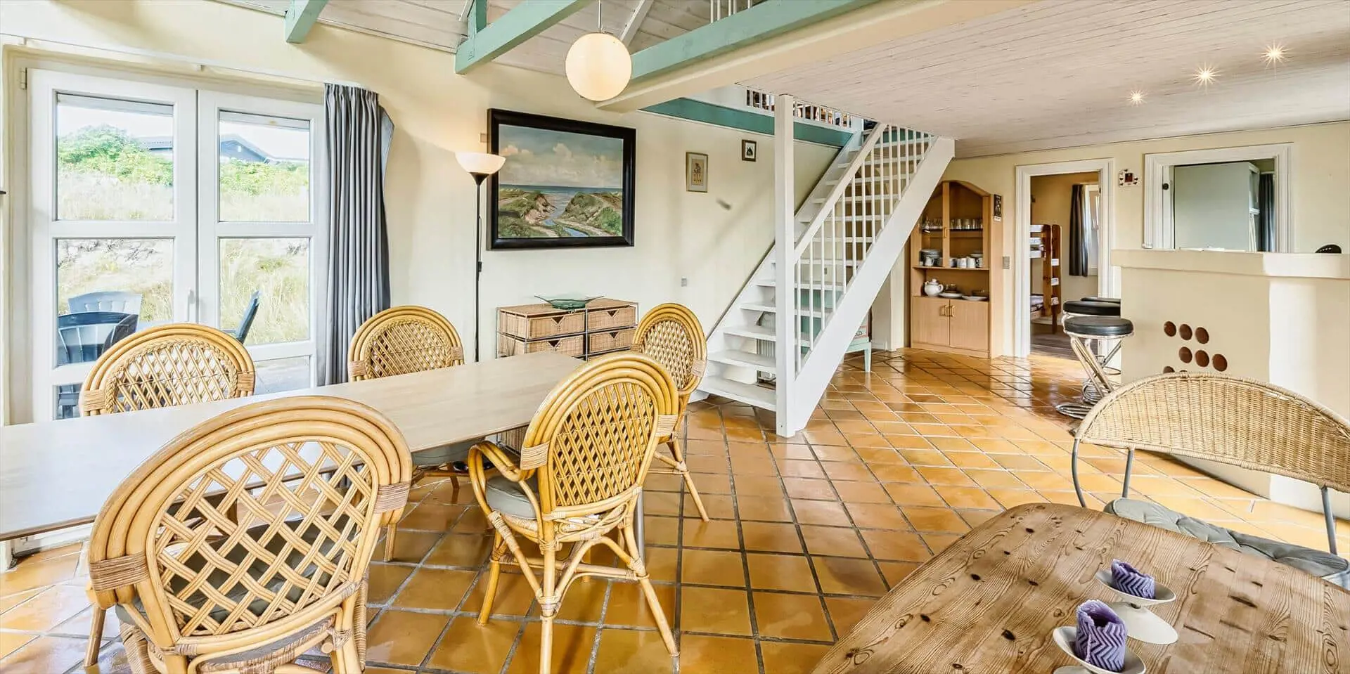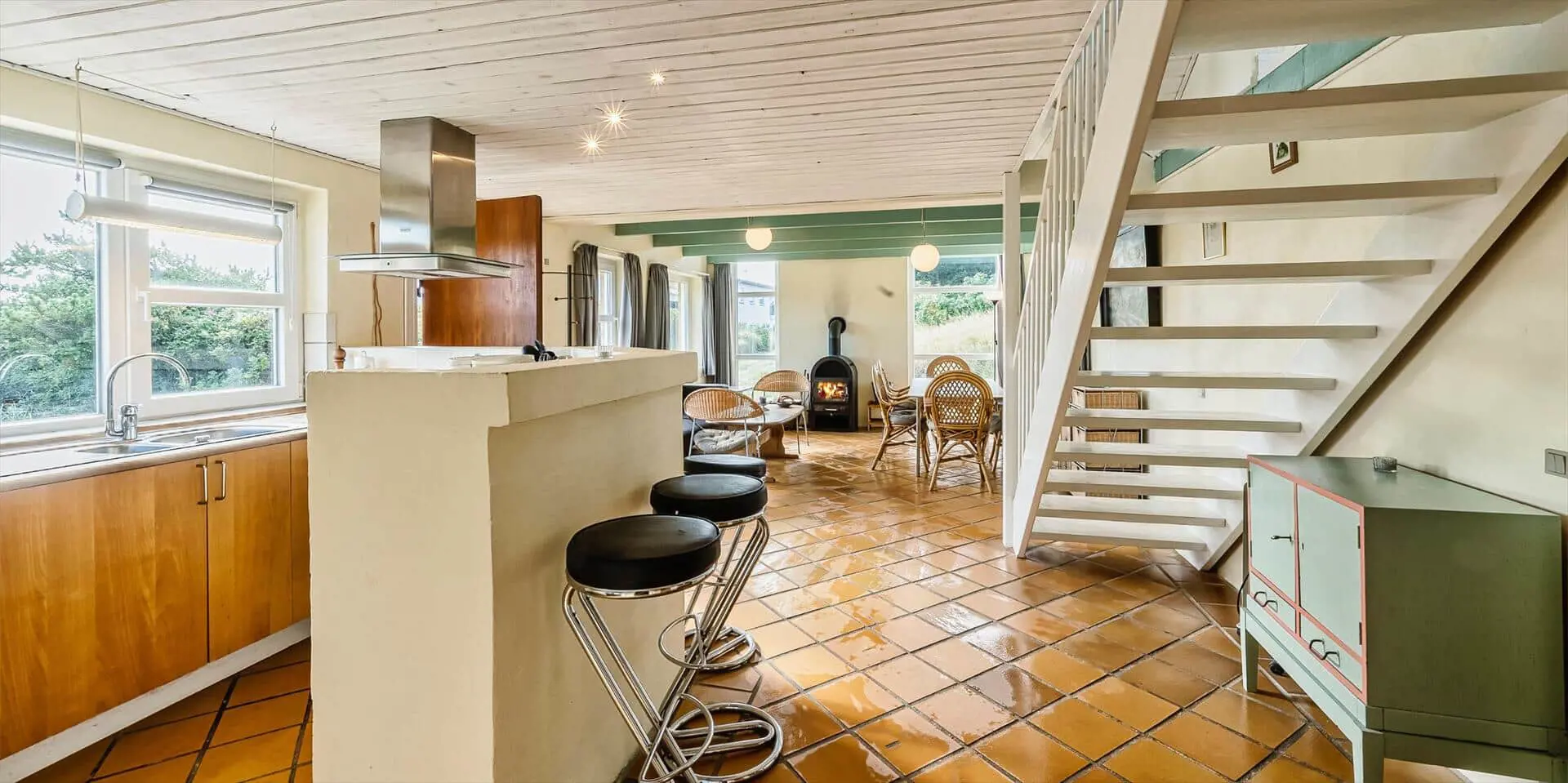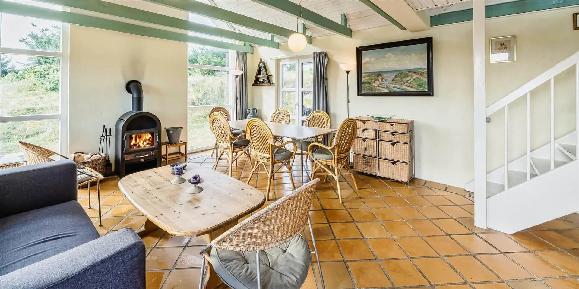 Zentral gelegenes Sommerhaus auf zwei Etagen für 6–8 Personen, ca. 200 Meter vom Strand entfernt. Der Zugang erfolgt durch das großzügige Wohnraum. Der Wohnbereich ist offen gestaltet und umfasst Küche, Sofaecke mit Blick auf den Kamin sowie den Essplatz; alles ist offen zur 1. Etage hin angelegt. Die Küche ist aus Leca‑Elementen mit offenen Regalen gebaut und verfügt über Geschirrspüler, Herd, Dunstabzugshaube, Kühlschrank mit kleinem Gefrierfach und Mikrowelle. Im Wohnbereich liegt ein Fliesenboden.