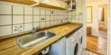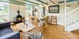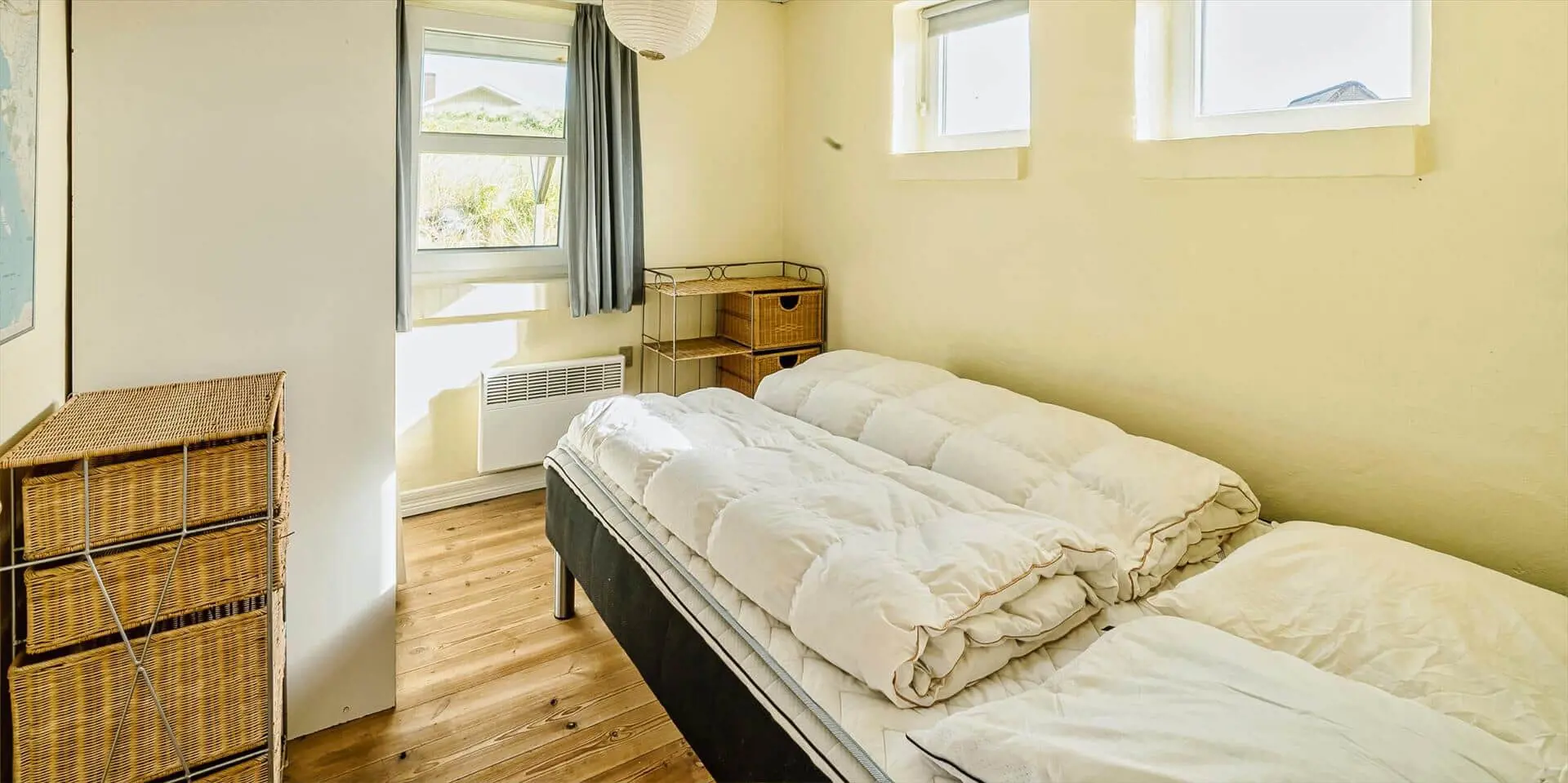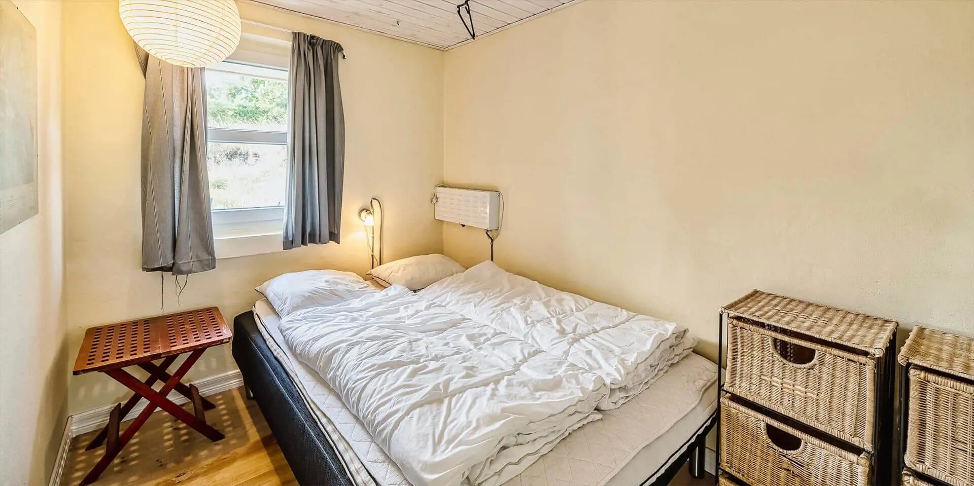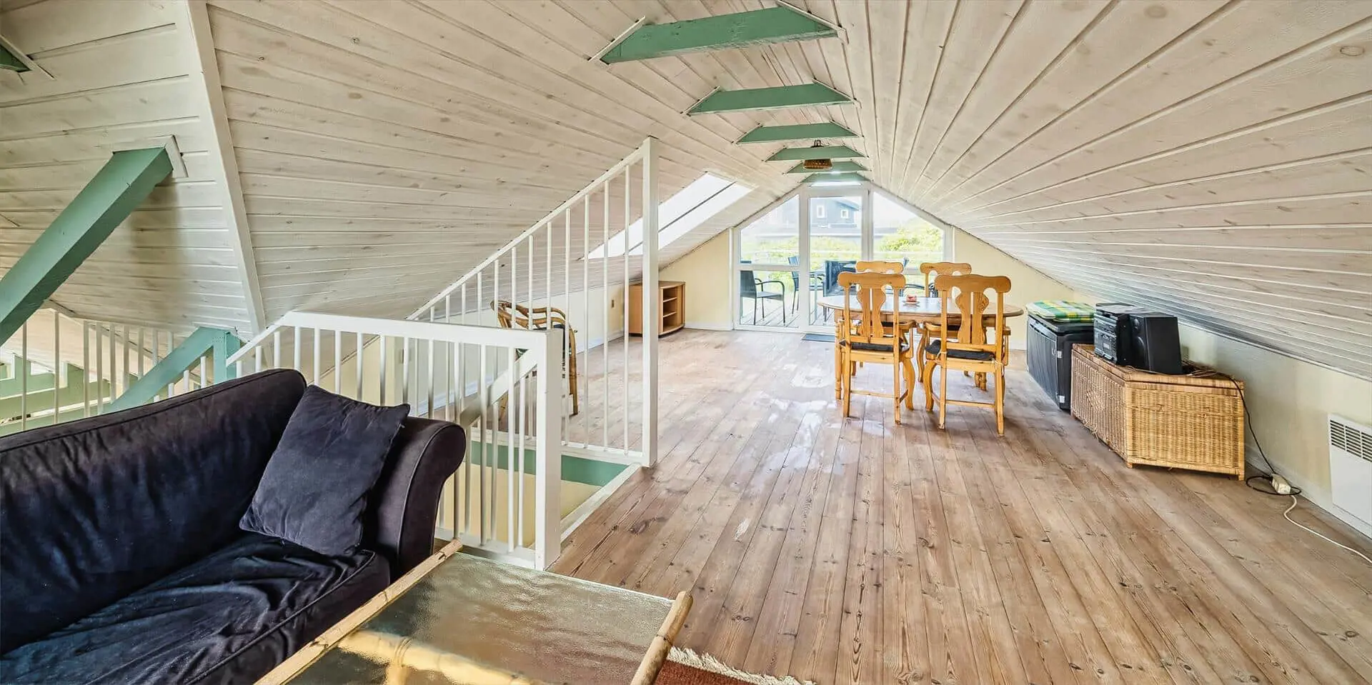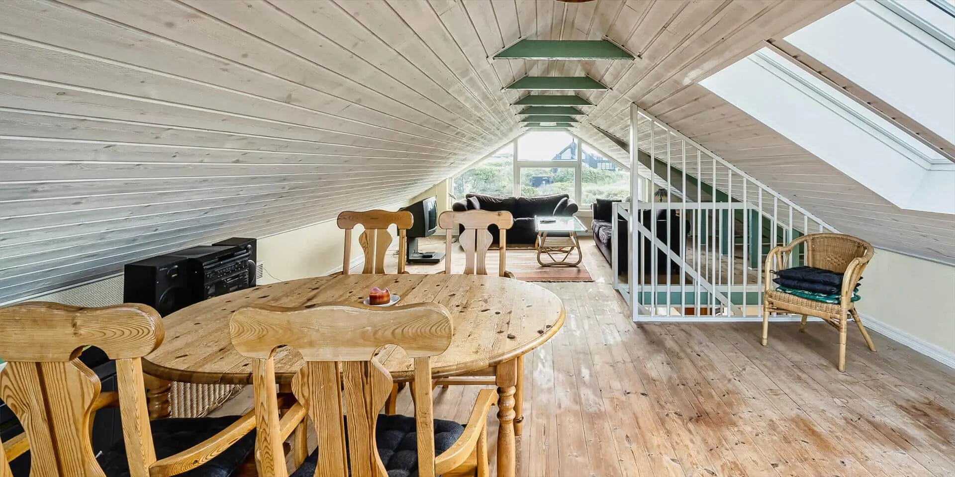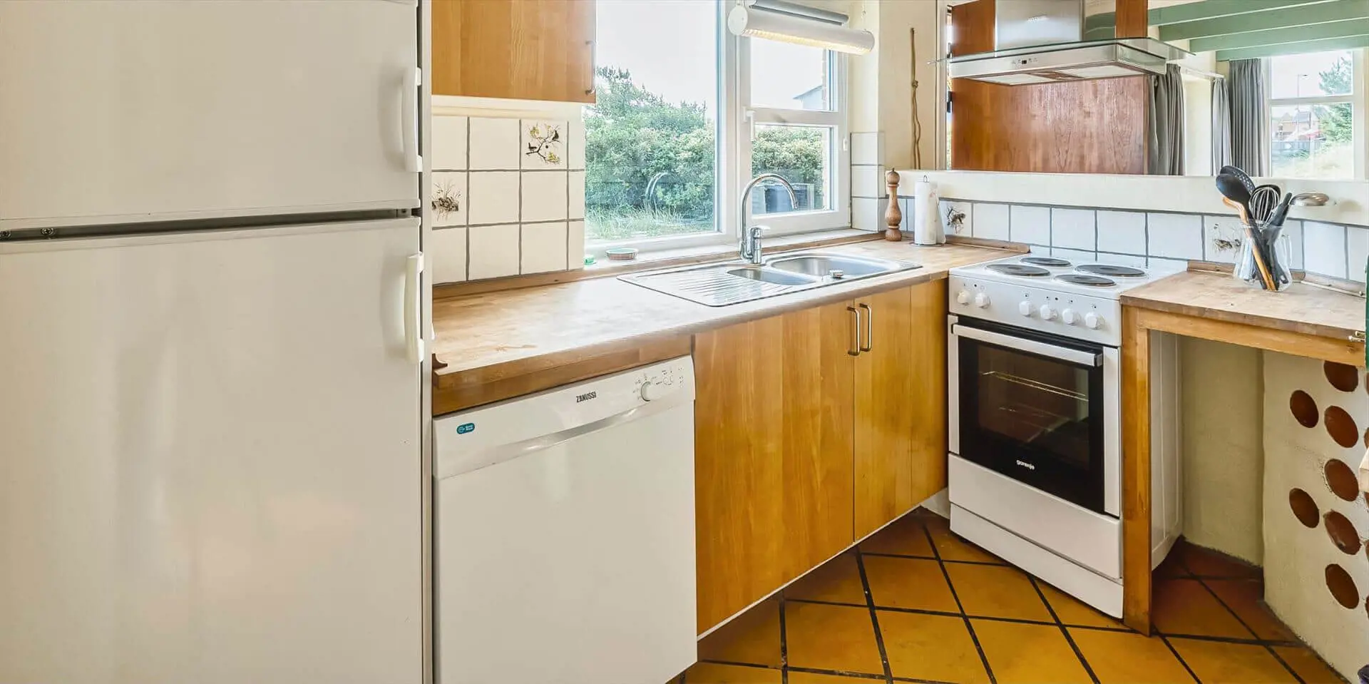 Zentral gelegenes Sommerhaus auf zwei Etagen für 6–8 Personen, ca. 200 Meter vom Strand entfernt. Der Zugang erfolgt durch das großzügige Wohnraum. Der Wohnbereich ist offen gestaltet und umfasst Küche, Sofaecke mit Blick auf den Kamin sowie den Essplatz; alles ist offen zur 1. Etage hin angelegt. Die Küche ist aus Leca‑Elementen mit offenen Regalen gebaut und verfügt über Geschirrspüler, Herd, Dunstabzugshaube, Kühlschrank mit kleinem Gefrierfach und Mikrowelle. Im Wohnbereich liegt ein Fliesenboden.