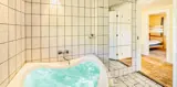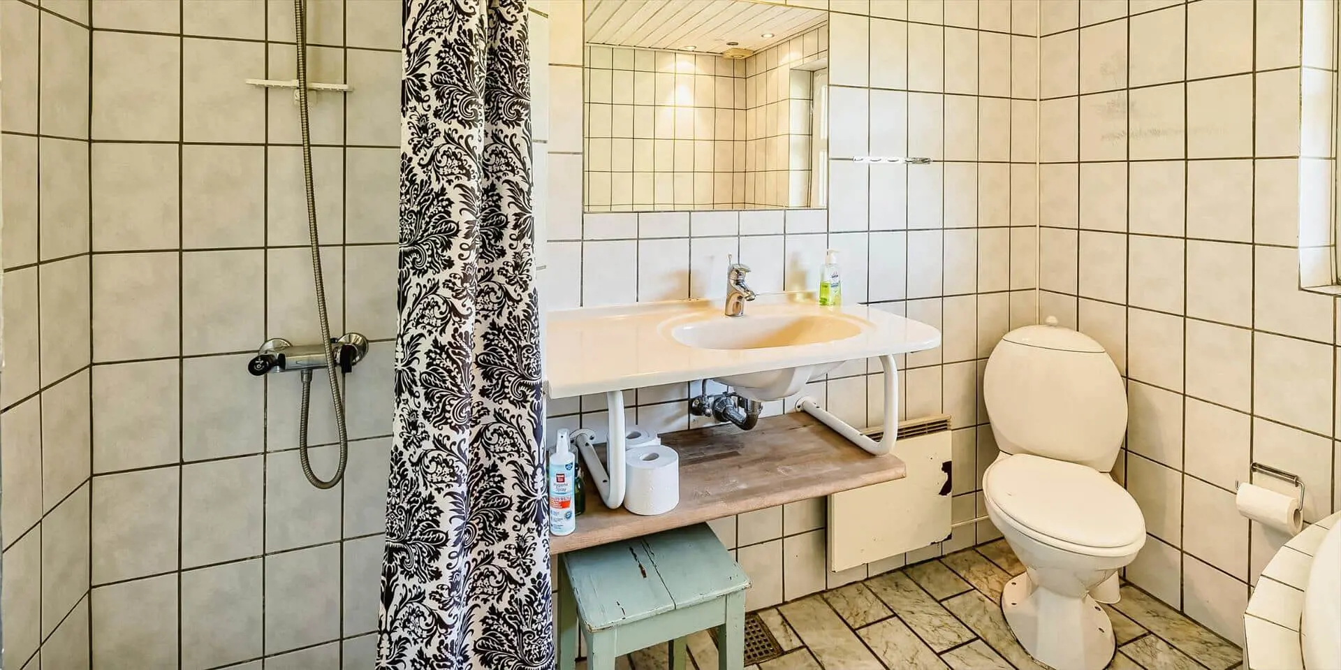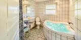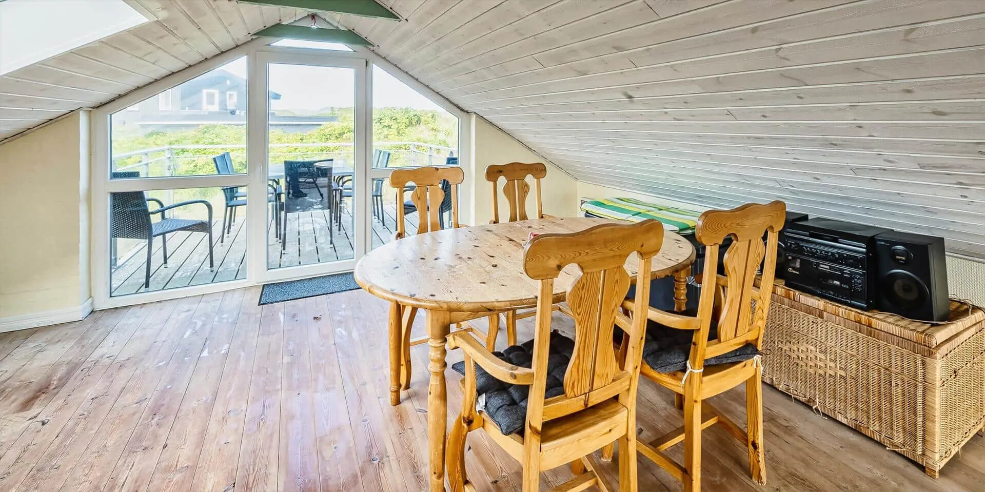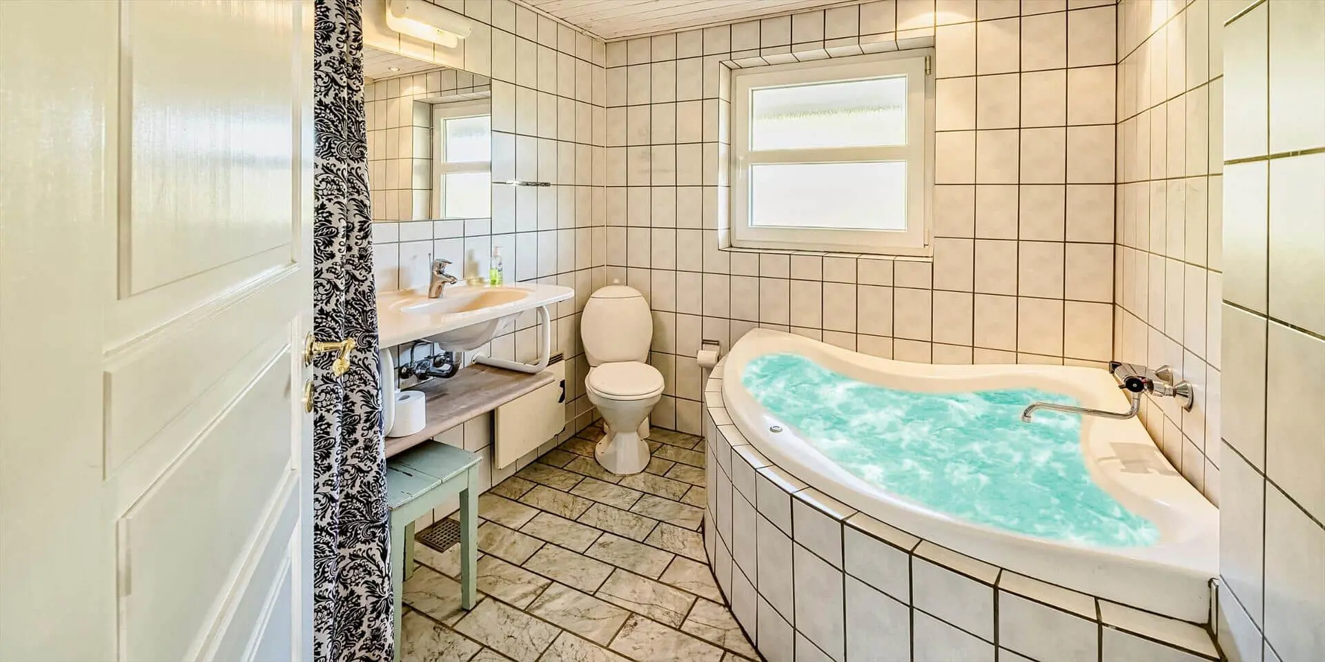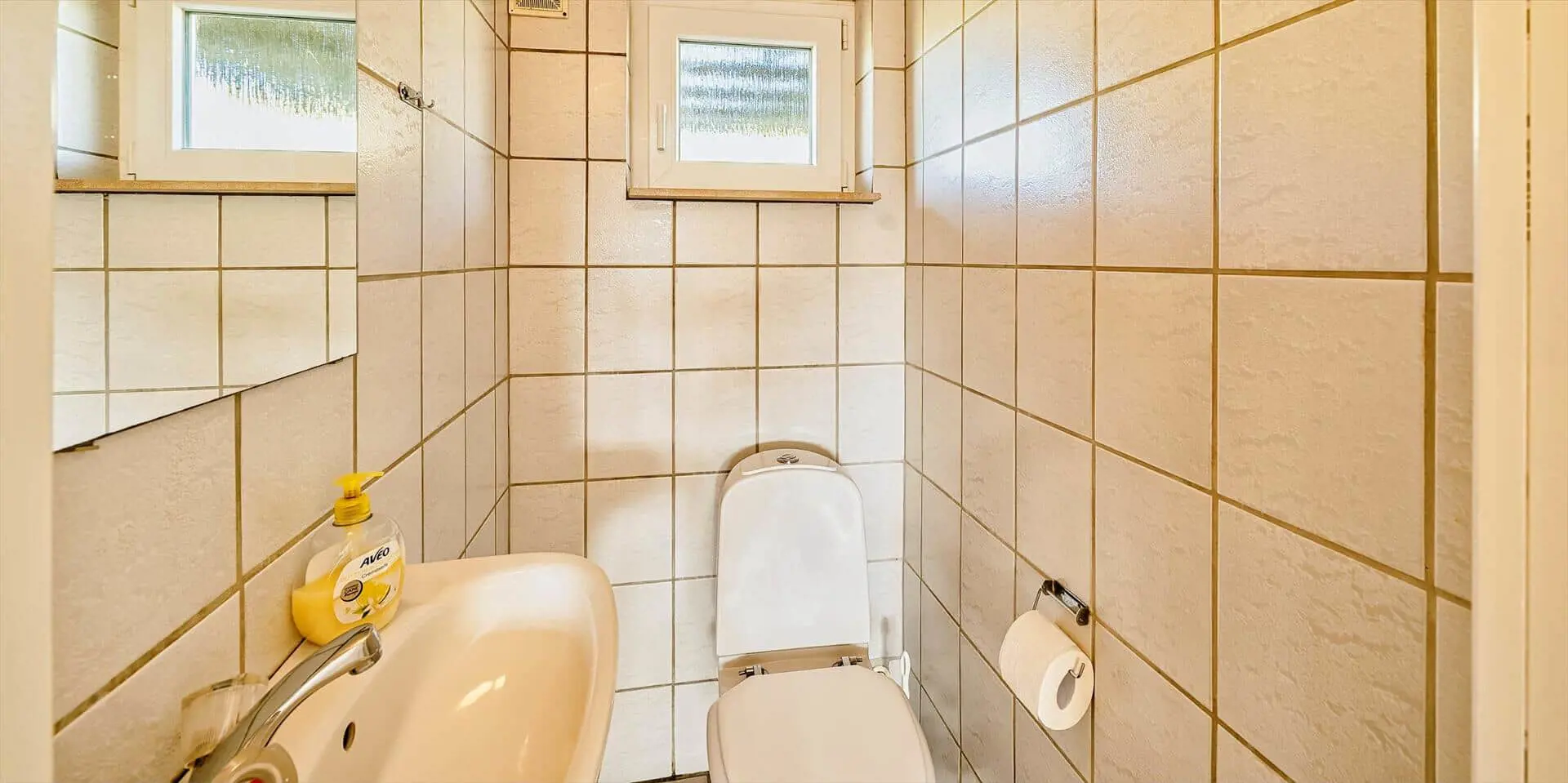 Die 1. Etage ist mit Fernseher und Satellitenempfang ausgestattet (keine dänischen Programme) und bietet einen kleinen Esstisch sowie Zugang zu einem Westbalkon. Im Erdgeschoss befinden sich außerdem ein Badezimmer mit Dusche/WC und Spa sowie ein Gäste‑WC. Technikraum/Seiteneingang mit Waschmaschine ist vorhanden.