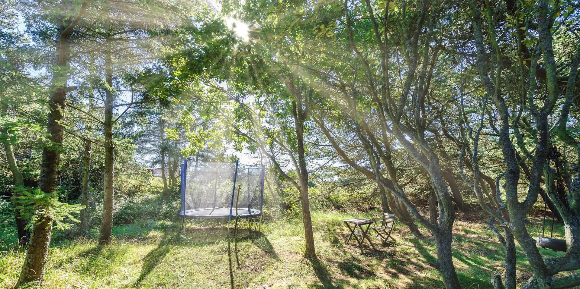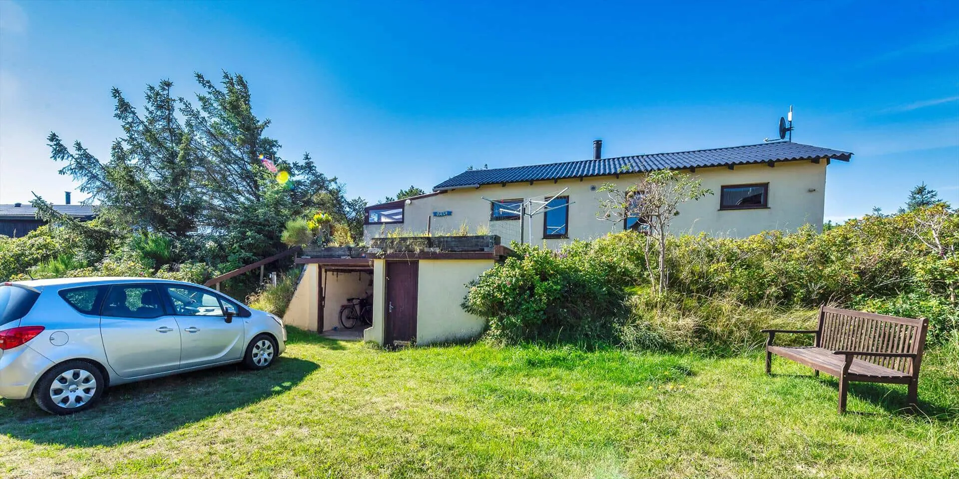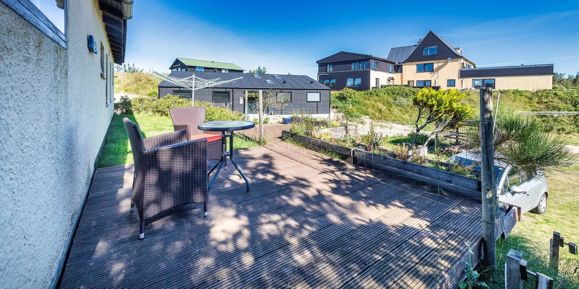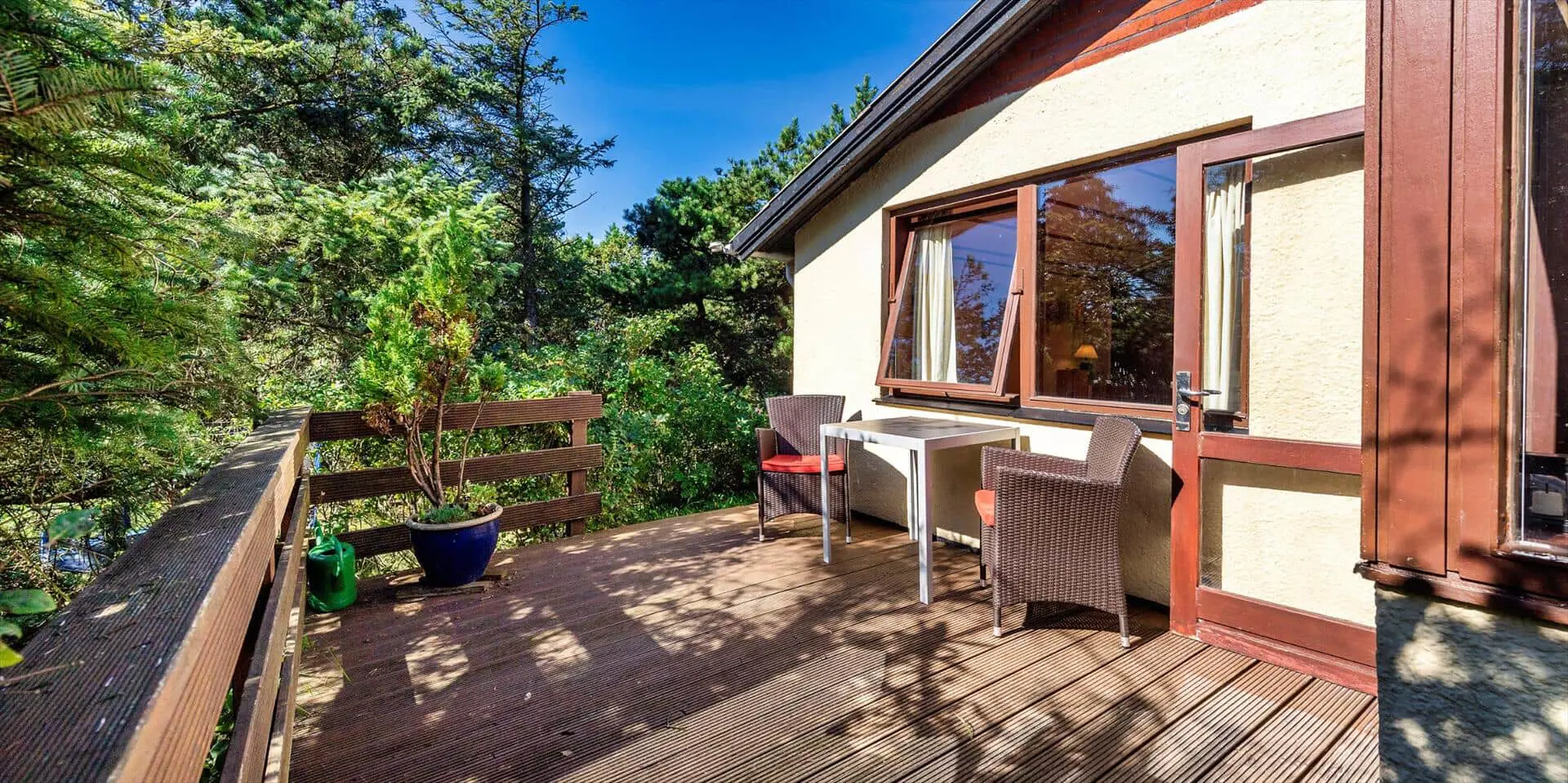 Zum Haus gehört ein schöner Garten, teils mit Kiefern bewachsen, mit vielen Spielmöglichkeiten für Kinder. Es gibt mehrere angelegte Holzterrassen zum Sonnen oder Schatten genießen. Das Haus liegt etwa 5 Minuten von den Dünen entfernt, die zum Vejers Südstrand führen.