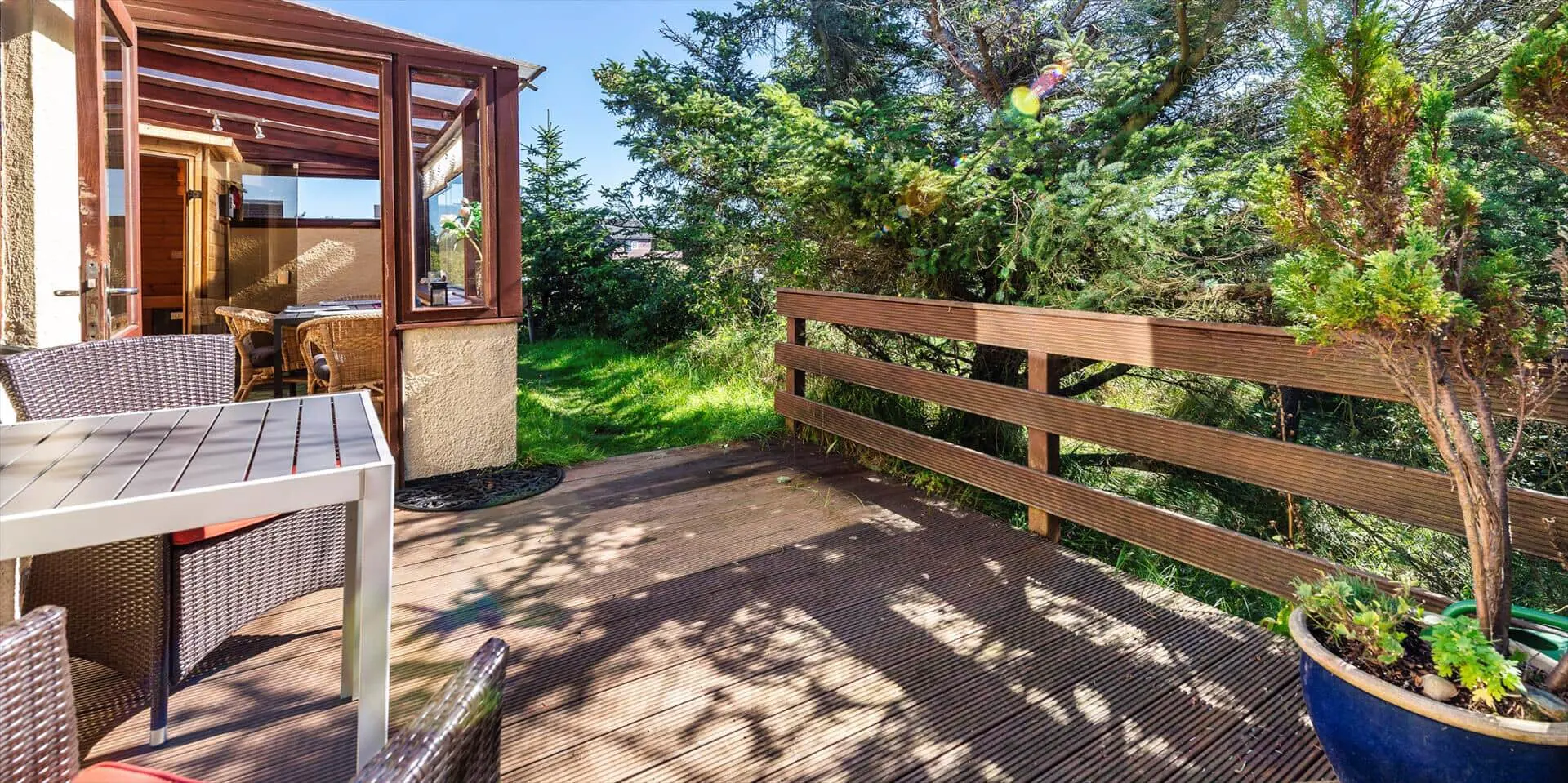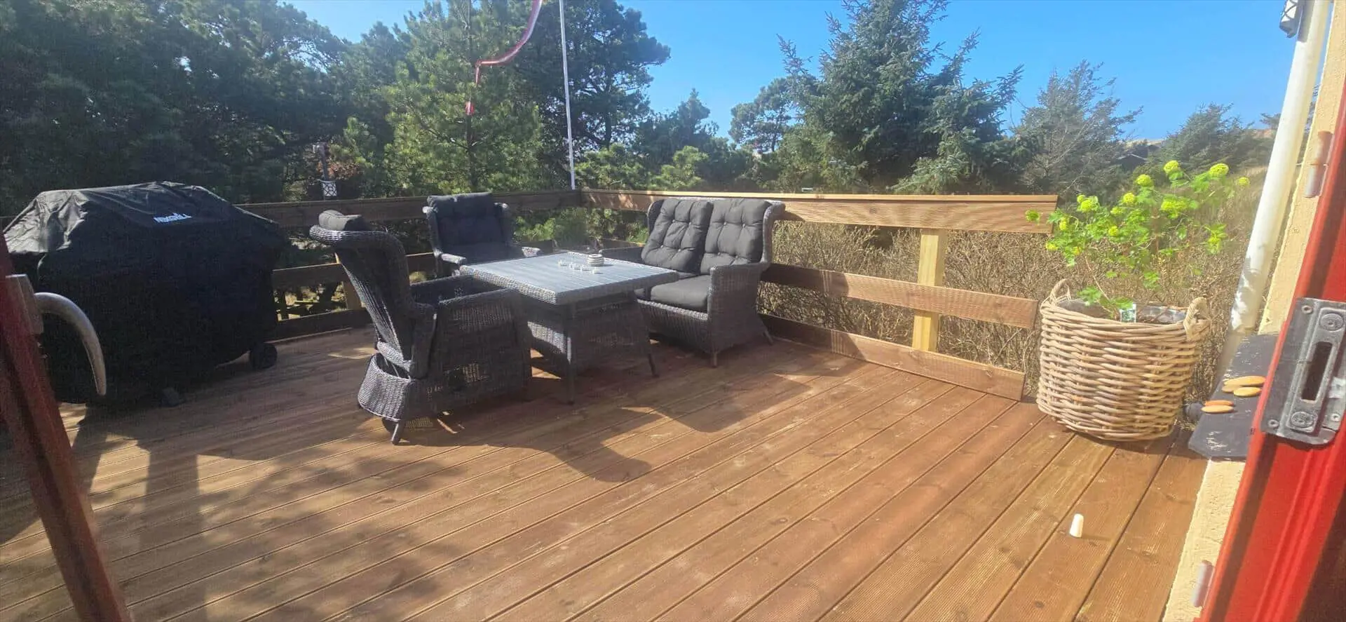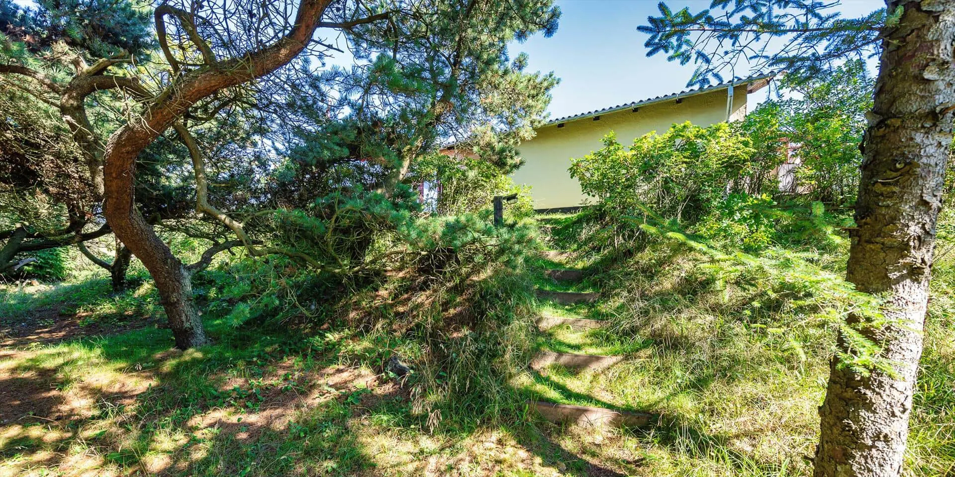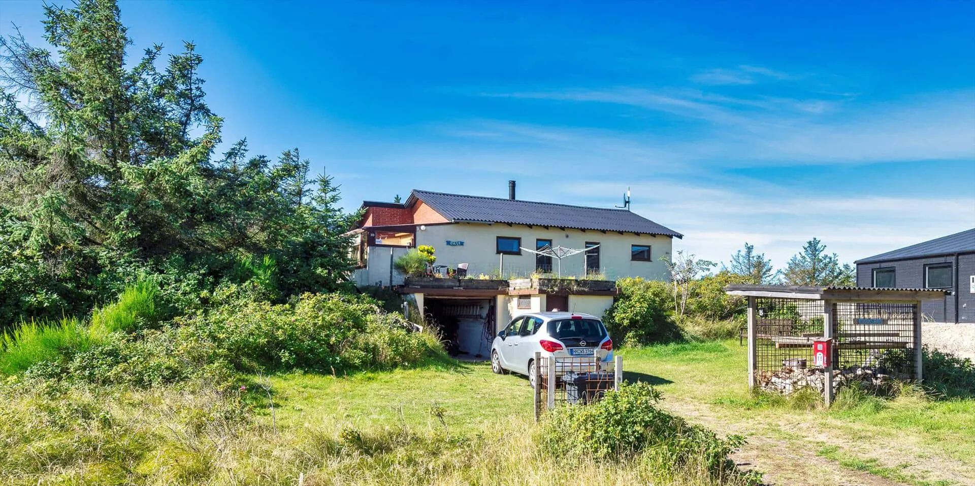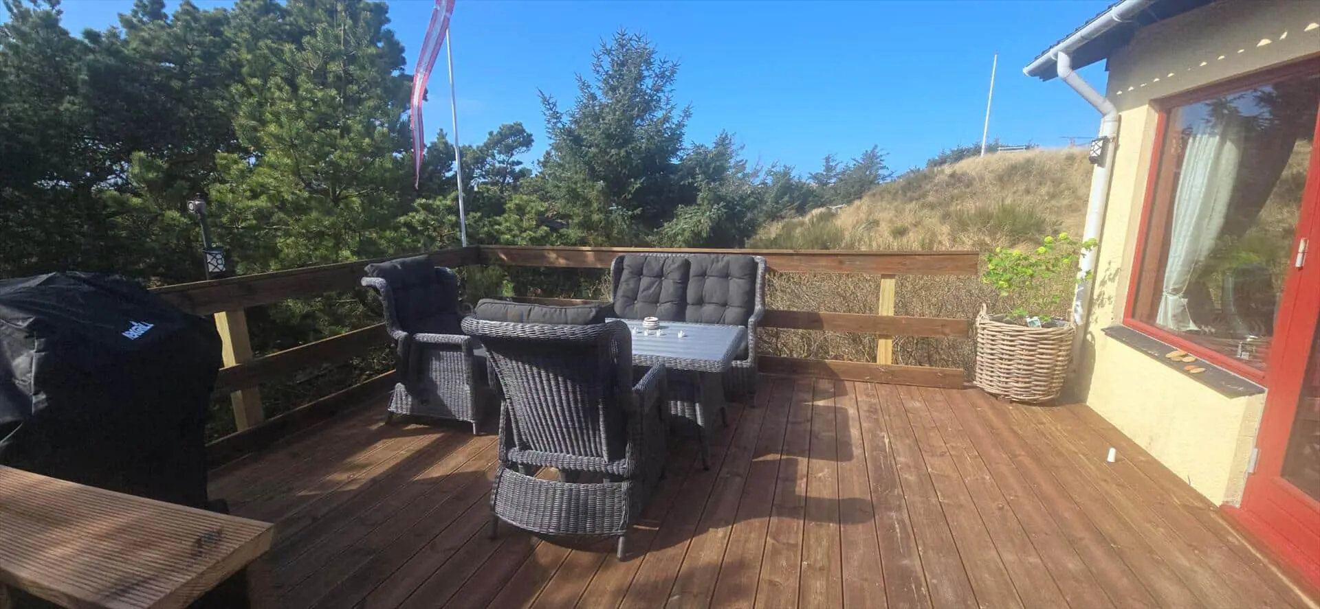 Zum Haus gehört ein schöner Garten, teils mit Kiefern bewachsen, mit vielen Spielmöglichkeiten für Kinder. Es gibt mehrere angelegte Holzterrassen zum Sonnen oder Schatten genießen. Das Haus liegt etwa 5 Minuten von den Dünen entfernt, die zum Vejers Südstrand führen.
