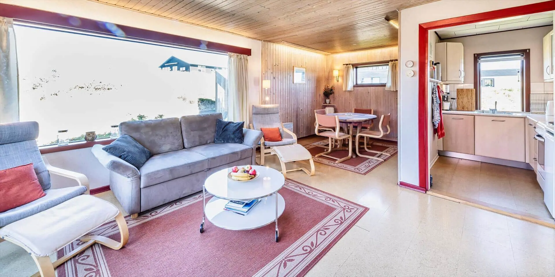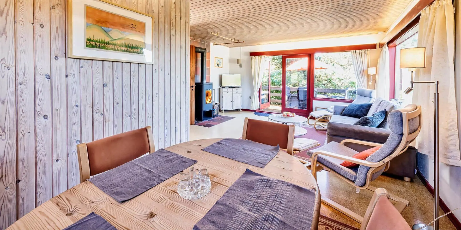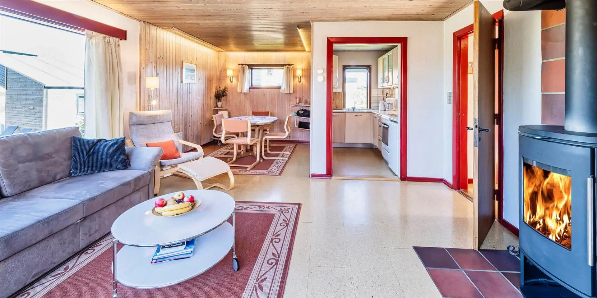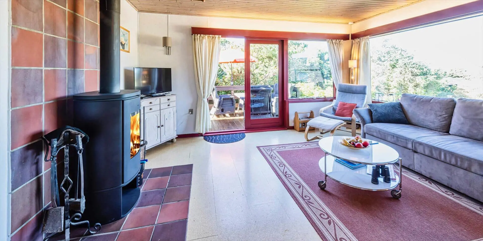 Das Wohnzimmer ist mit einem Kaminofen sowie TV mit Satellitenempfang (inkl. dänischer Sender) ausgestattet. Große Panoramafenster nach Süd und West sorgen für viel Licht, die Böden sind mit Laminat belegt. Es gibt eine kleine Essecke mit rundem Tisch für vier Personen. Vom Wohnraum kommt man auf eine schöne Holzterrasse mit Gartenmöbeln. Die Küche ist mit einem Herd mit Kochfeld und Backofen, einer integrierten Geschirrspülmaschine und einem Kühlschrank mit kleinem Gefrierfach ausgestattet. Ein kleiner Hund (max. 40 cm Rückenhöhe) ist erlaubt.