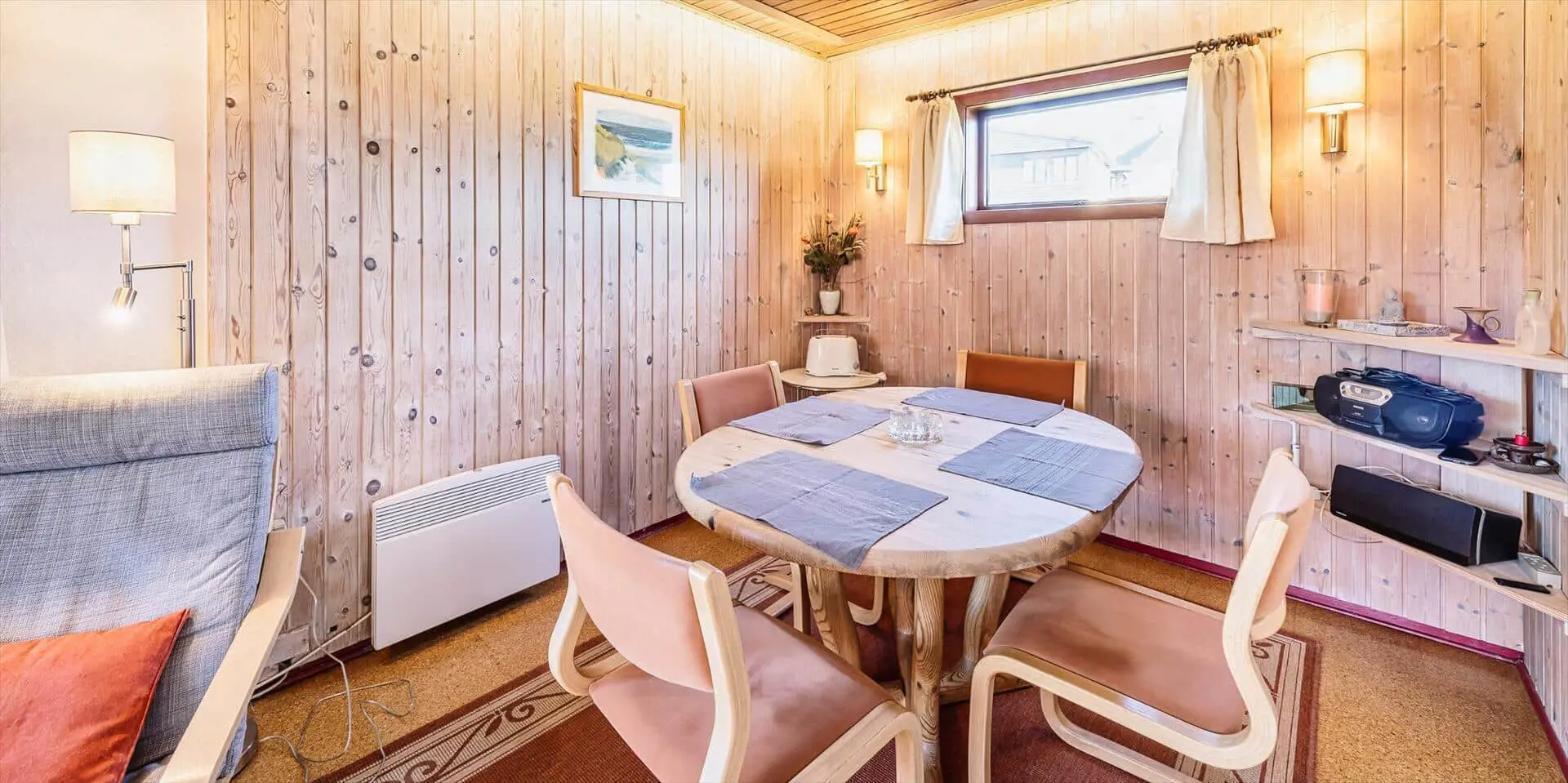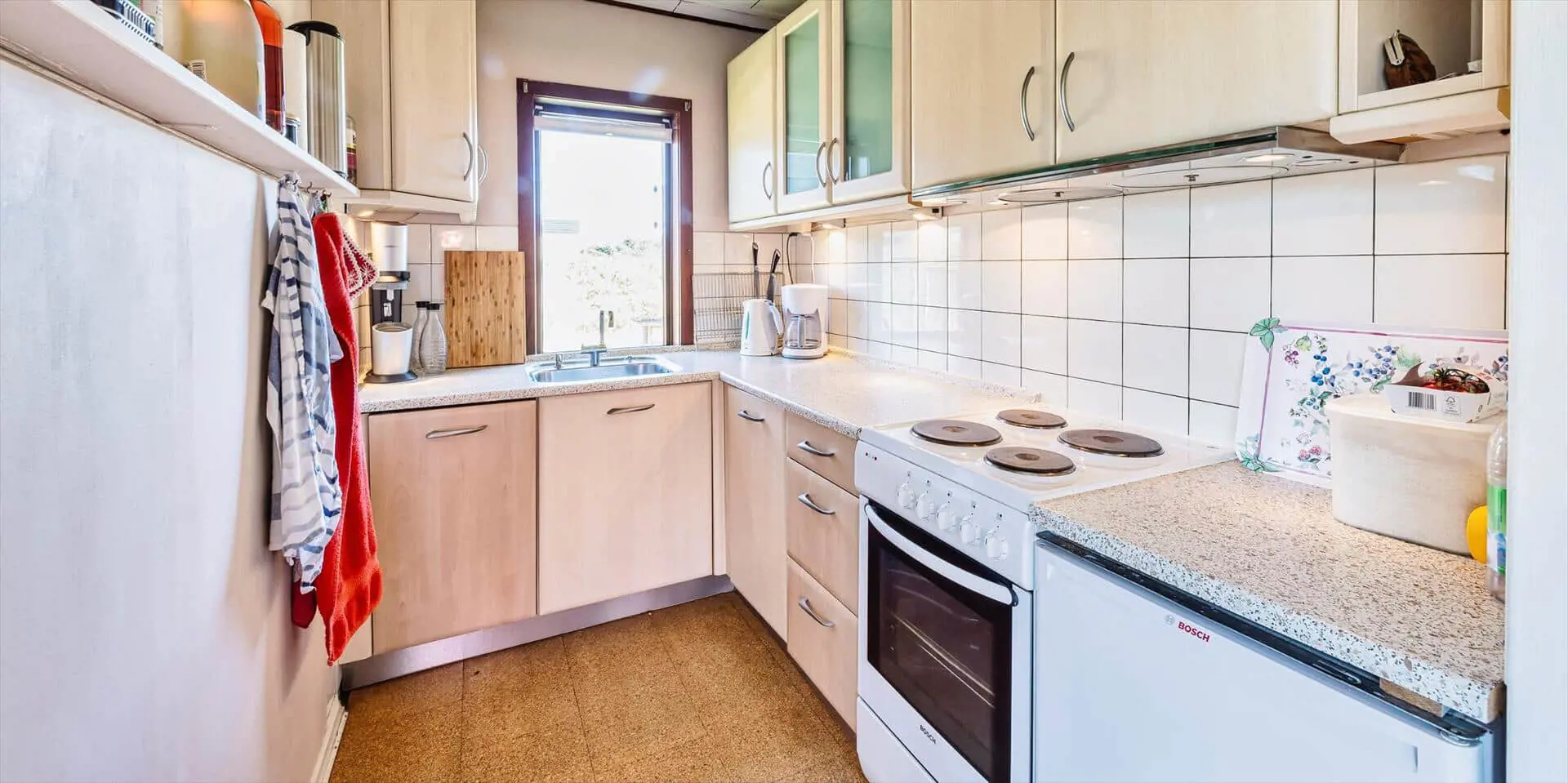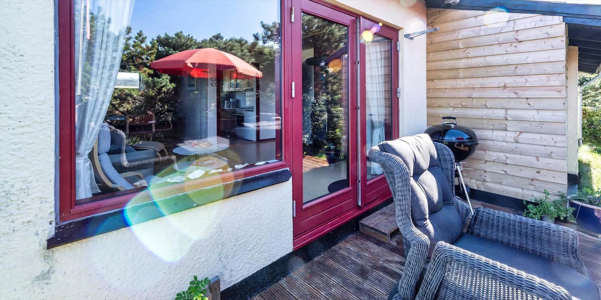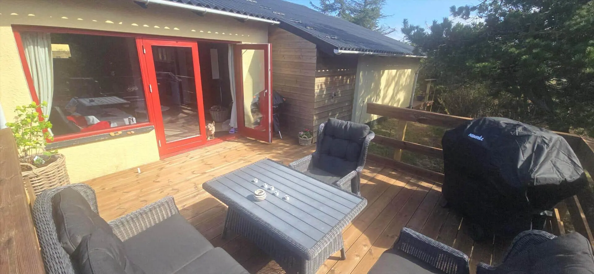 Das Wohnzimmer ist mit einem Kaminofen sowie TV mit Satellitenempfang (inkl. dänischer Sender) ausgestattet. Große Panoramafenster nach Süd und West sorgen für viel Licht, die Böden sind mit Laminat belegt. Es gibt eine kleine Essecke mit rundem Tisch für vier Personen. Vom Wohnraum kommt man auf eine schöne Holzterrasse mit Gartenmöbeln. Die Küche ist mit einem Herd mit Kochfeld und Backofen, einer integrierten Geschirrspülmaschine und einem Kühlschrank mit kleinem Gefrierfach ausgestattet. Ein kleiner Hund (max. 40 cm Rückenhöhe) ist erlaubt.