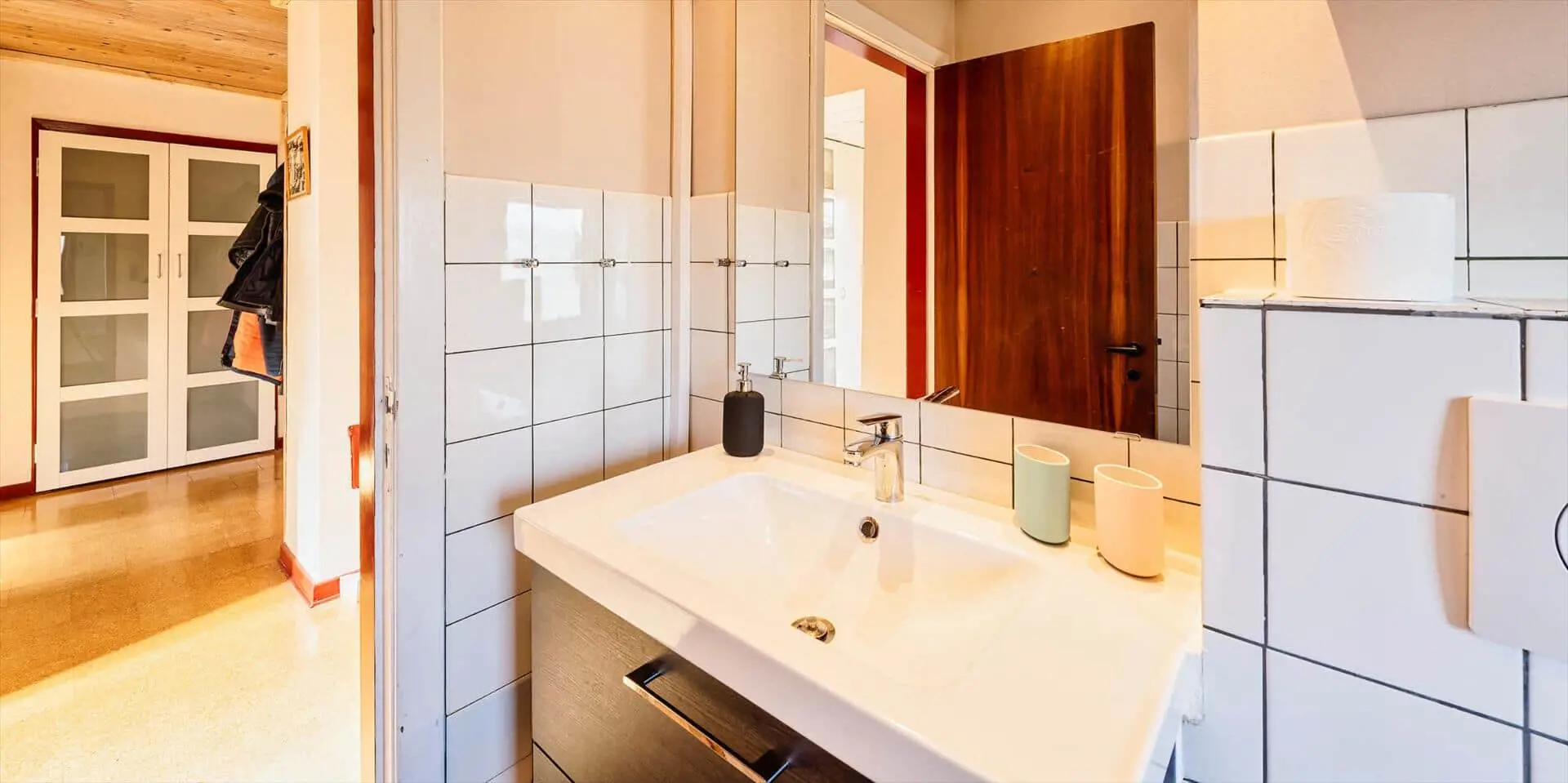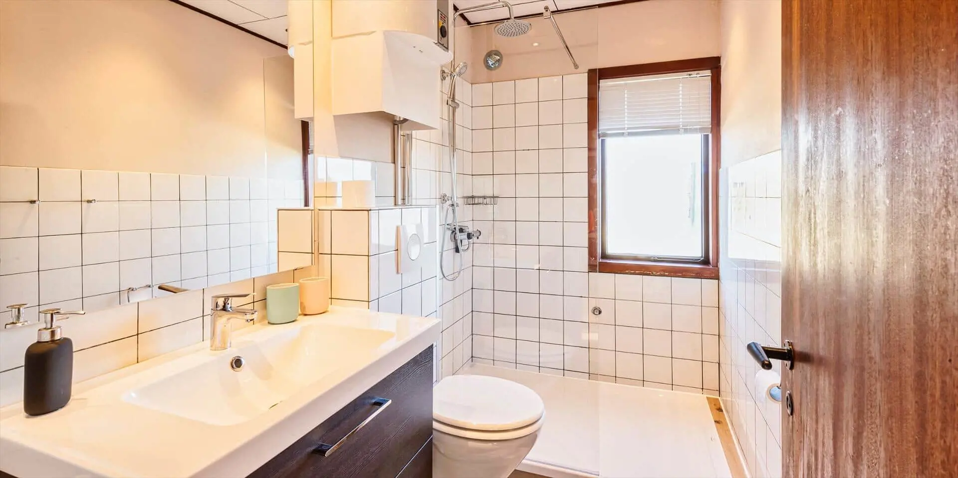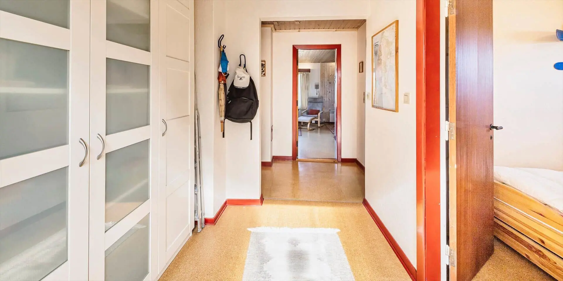 Das Haus besitzt einen Eingang durch den Wintergarten, in dem sich auch die Sauna befindet. Vom Wintergarten gelangt man in einen Flur mit Garderobenbereich. Es gibt 2 Schlafzimmer: eines mit Doppelbett und eines mit zwei Einzelbetten. Das Badezimmer wurde 2020 renoviert und verfügt über eine großzügige Dusche, ein wandhängendes WC und ein Waschbecken. Ein Master‑Schlafzimmer mit Doppelbett und Schrankraum ist vorhanden. Technikraum mit Waschmaschine, Trockner und privater Ladestation für Elektroautos.