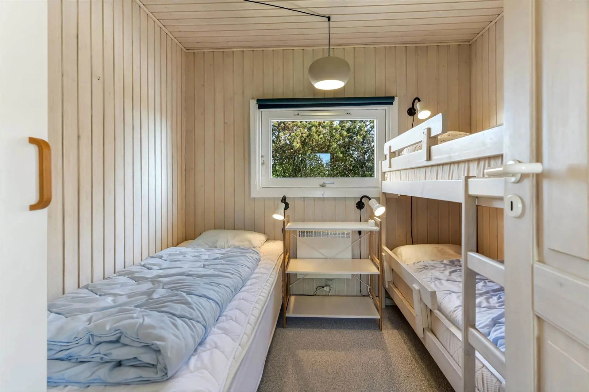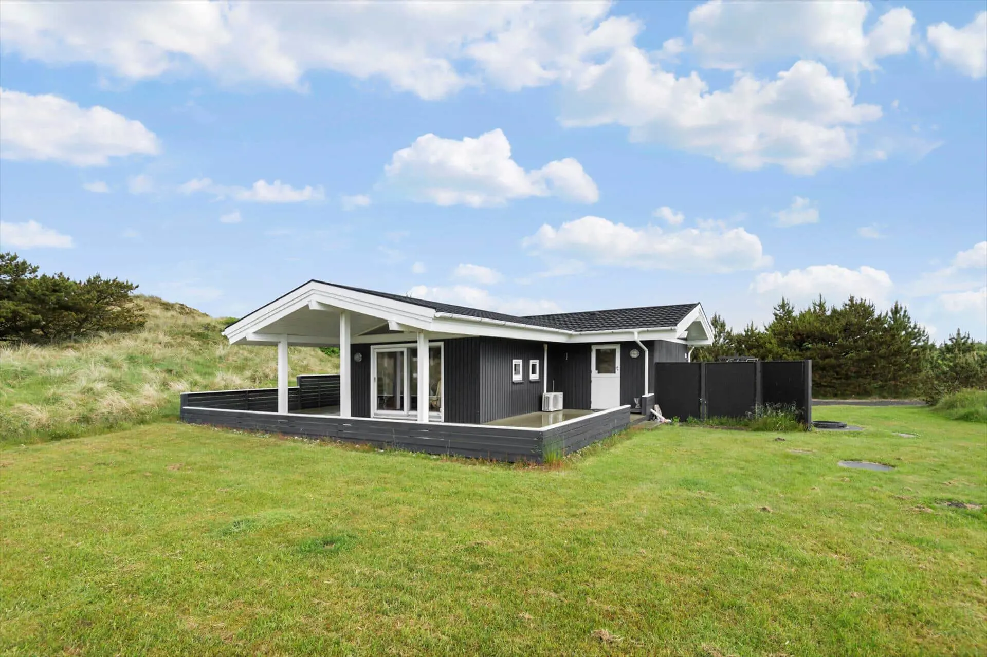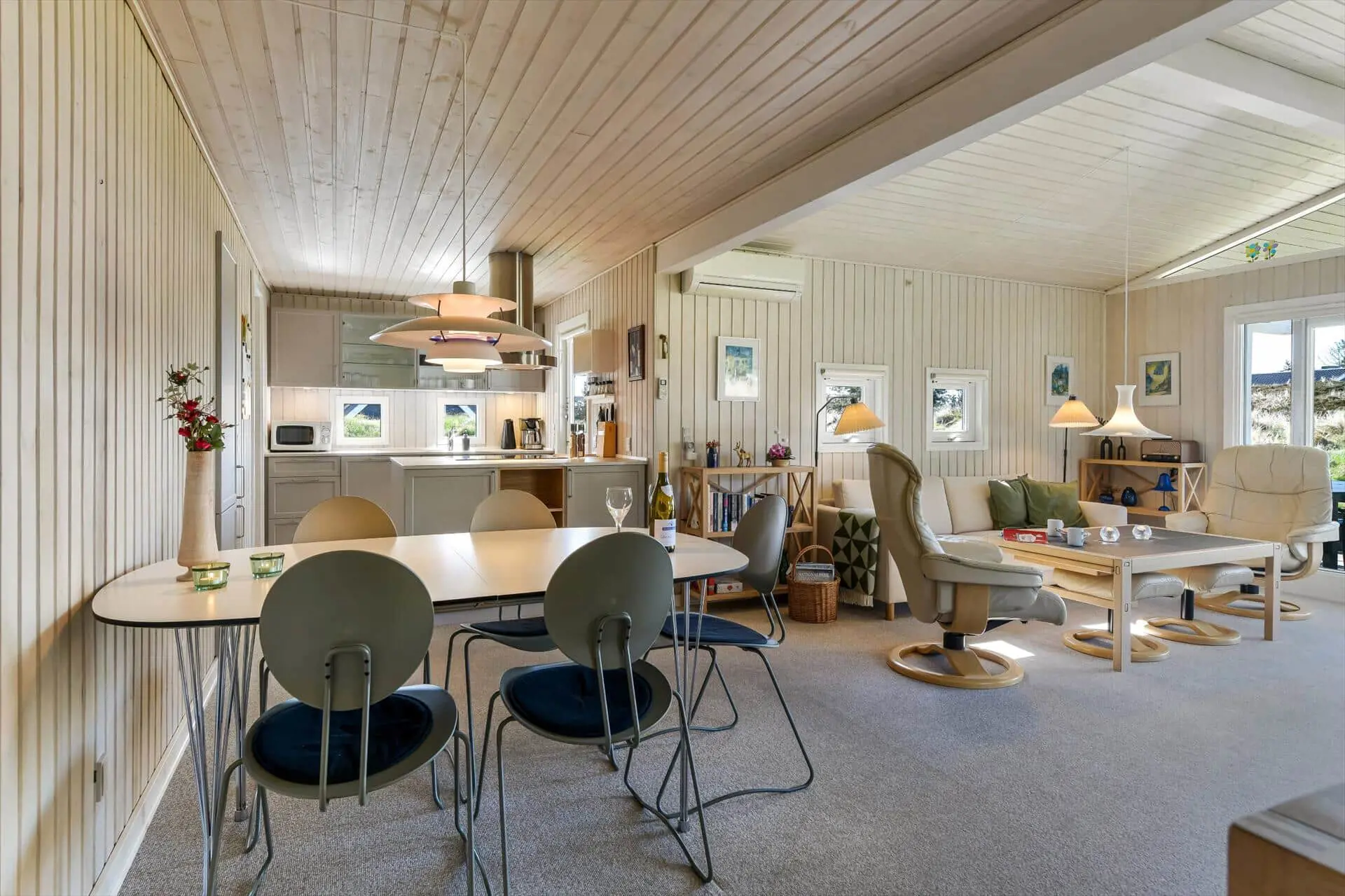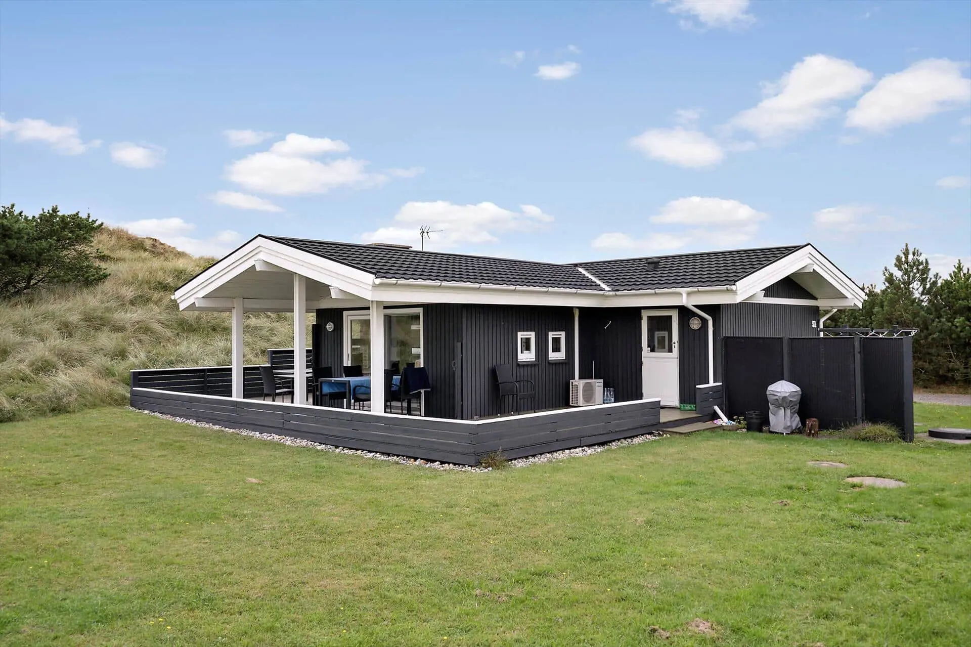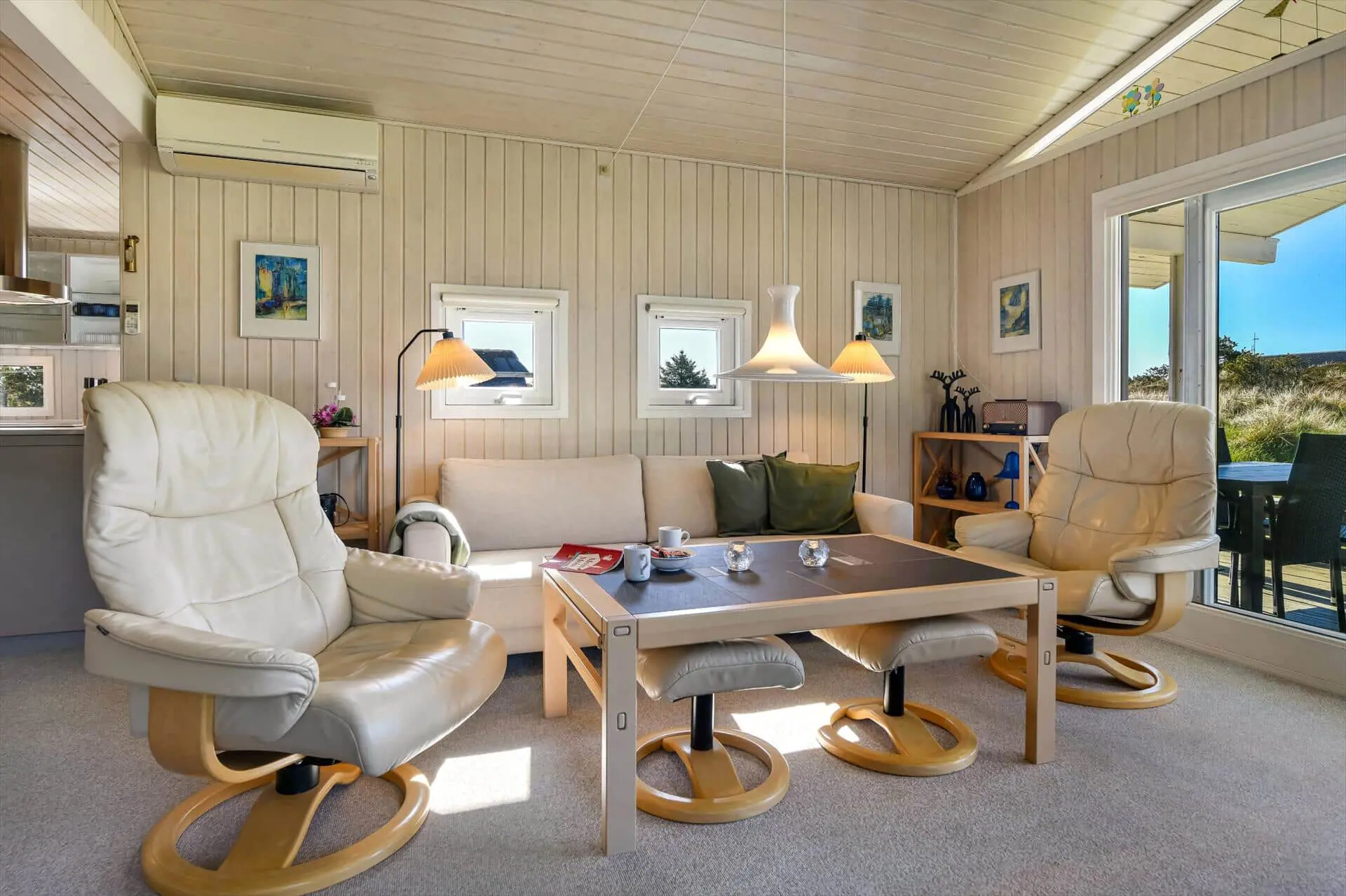 Sie müssen eigentlich nur aus den Fenstern Ihres Ferienhauses blicken, um einen Vorgeschmack davon zu bekommen, was für herrliche Naturerlebnisse in dieser Gegend auf Sie warten. Das Ferienhausgebiet wird durch Heide, kleine Nadelbäume und sanfte Dünen geprägt. Somit werden Sie stets daran erinnert, wie weit Sie sich eigentlich abseits des Alltags befinden - und zwar selbst dann, wenn Sie es sich in aller Ruhe mit einem warmen Kakao oder einem unterhaltsamen Gesellschaftsspiel im Hausinneren gemütlich machen. Das Ferienhaus begrüßt Sie mit Küche von 2025, hellen Holzwänden, einem Kaminofen und hohen Decken, sodass Sie sich auf das typisch dänische Ferienhausambiente freuen dürfen. Einen schönen Rahmen für Ihre Urlaubsaktivitäten bildet der Wohnbereich, der sich aus dem Wohnzimmer und der offen anschließenden Küchenabteilung zusammensetzt. Ein Maximum an Erholung und Entspannung verspricht Ihnen darüber hinaus die im Badezimmer platzierte Sauna. Allabendlich begeben Sie sich in den drei Schlafräumen des Hauses zur Ruhe, die sich auch hervorragend für das ein oder andere Nickerchen nach dem Mittagessen anbieten.