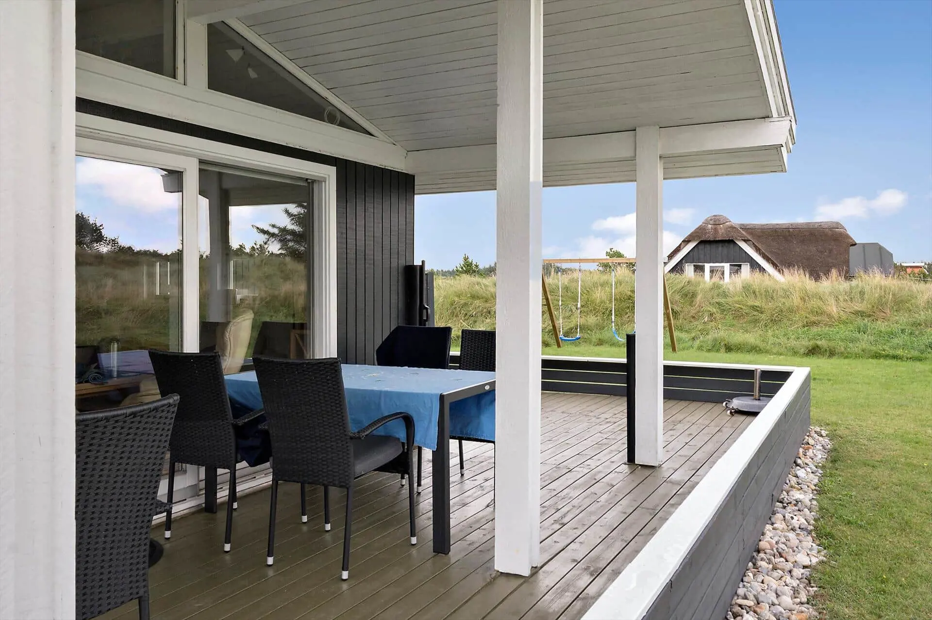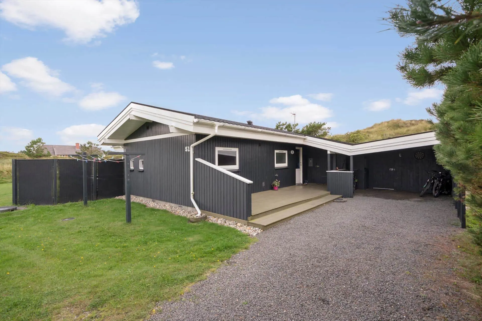 Das Ferienhausgrundstück ist groß und einfach angelegt. Nah am Haus gibt es eine Rasenfläche und eine Terrasse. Der Rest des Grundstücks ist der Natur überlassen. Für Ihren Pkw steht ein Carport bereit. Während Sie sich auf den Gartenmöbeln und Liegestühlen auf der teilweise überdachten Terrasse erholen und entspannen, werden Ihre Kinder vergnügt im Gras umhertollen oder schaukeln. Dank des ebenfalls vorhandenen Grills steht geselligen Runden am Abend mit einem köstlichen Essen absolut nichts im Wege.