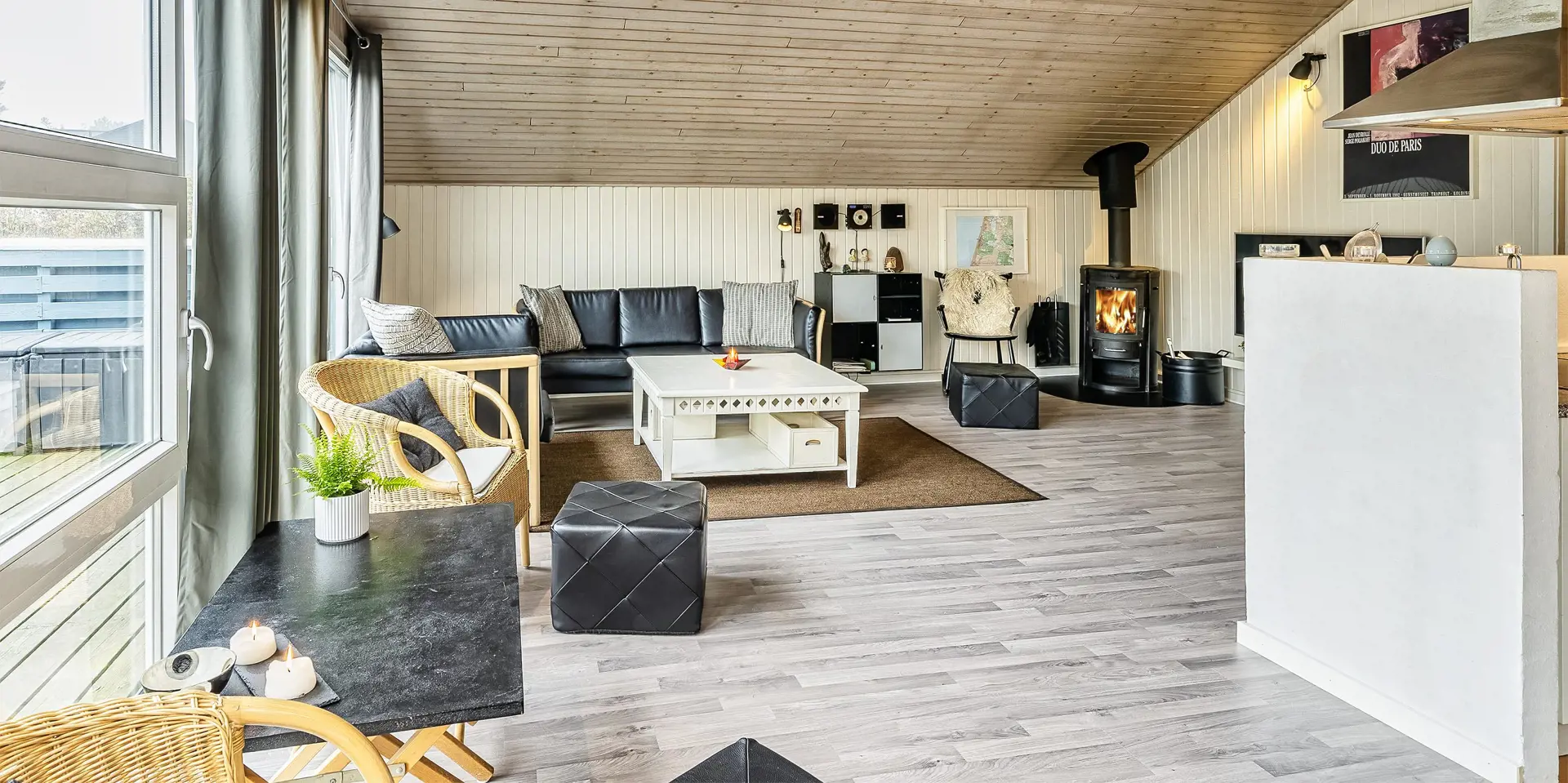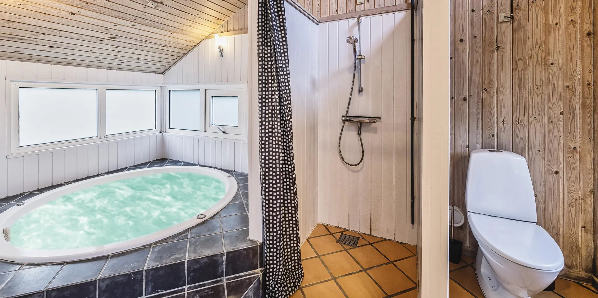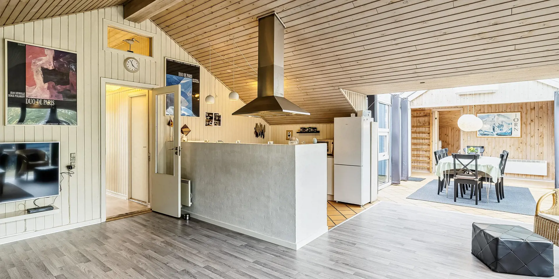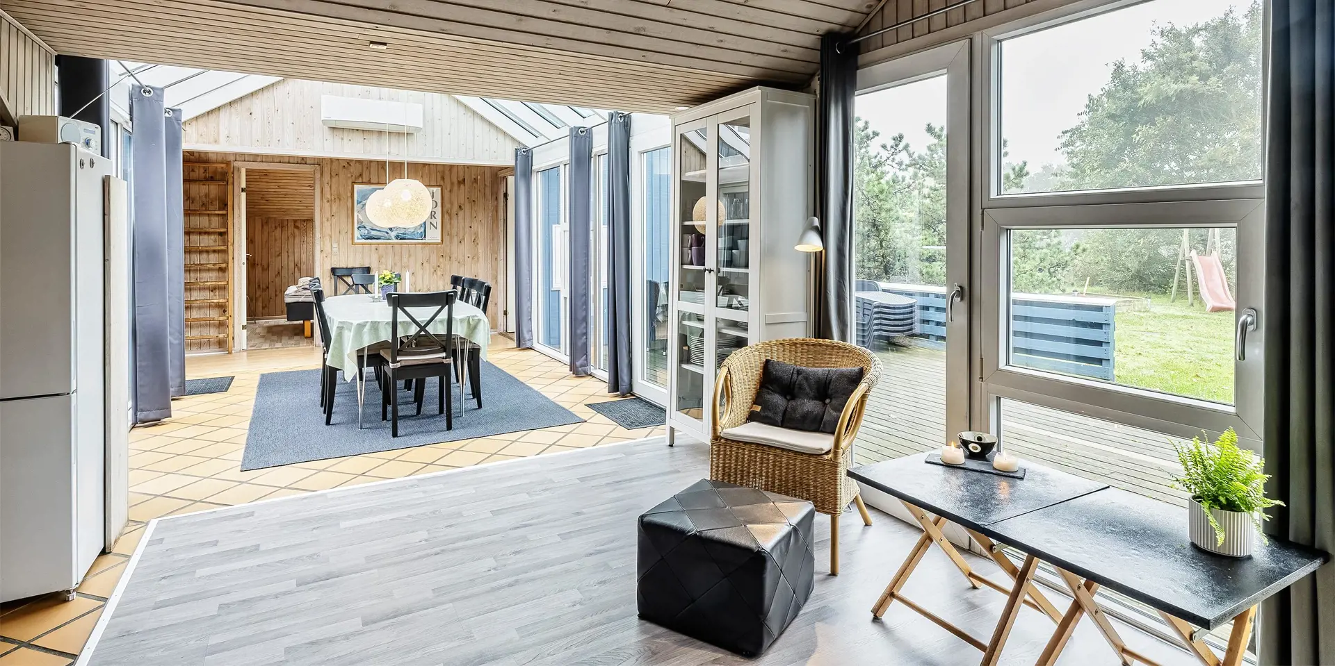 Sehr geschmackvoll eingerichtetes Ferienhaus auf einem schönen Rasengrundstück gelegen und für 9 Personen ausgestattet. Der Strand ist 1,2 Km vom Ferienhaus entfernt. Dieses Ferienhaus ist in zwei Wohn- und Schlafbereiche aufgeteilt. Sie sind mit einem licht durchflutetem Zwischenbau verbunden. In diesem Bereich befindet sich der Essplatz. Im Wohnbereich stehen Ihnen gemütliche Ledermöbel zur Verfügung. Das deutsche Fernsehprogramm empfangen Sie über eine Parabolantenne. Der Kamin ist in dem einen Wohnbereich aufgestellt und strahlt eine angenehme Wärme aus. Es befindet sich eine Warmepumpe im Ferienhaus. Mit dieser Warmepumpe haben sie die Möglichkeit die Stromkosten zu senken, denn die Warmepumpe ist energiesparend. Die Küche verfügt über einen Herd mit Cerankochfeld, einem Backofen, einer Geschirrspülmaschine, einer Mikrowelle und einer Kühl- und Gefrierkombination. In dem Ferienhaus stehen den Bewohnern zwei Bäder zur Verfügung. Das eine Badezimmer hat ein WC, ein Handwaschbecken und eine Dusche. Das große Badezimmer hat ein WC, ein Handwaschbecken, eine Dusche, eine Sauna und einen Standwasser-Whirlpool. Dieser in der Ecke aufgestellte Standwasser-Whirlpool ist ständig mit Wasser befüllt. Daher ist er dann zur Anreise auch immer sofort betriebsbereit. In diesem großen Badezimmer sind die Waschmaschine und der Trockner auch untergebracht. Insgesamt gibt es fünf Schlafzimmer im Ferienhaus: DB + DB + DB + 2B + B. Das Ferienhaus verfügt über einen Internetanschluss (W-Lan). Chromecast. Es gibt zwei schöne Terrassenbereiche am Hause, die Sie für Ihr Sonnenbad oder für Ihre Grillabende nutzen können. Ein Schaukelstativ mit Rutsche und ein Sandkasten stehen für die Kleinen Gäse auf dem Grundstück bereit. Es sind max. drei Haustiere erlaubt. Das Rauchen ist nicht gestattet. Das Ferienhaus wurde 1974 erbaut und in 2004 renoviert.