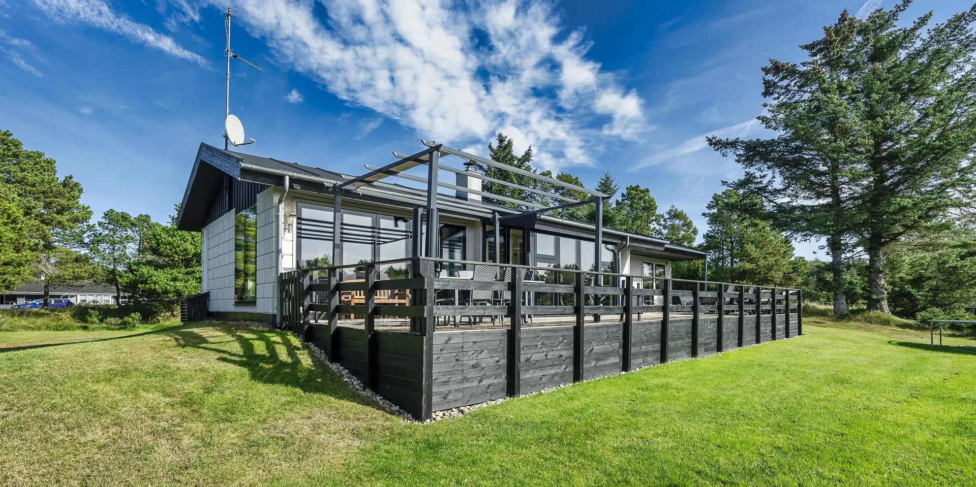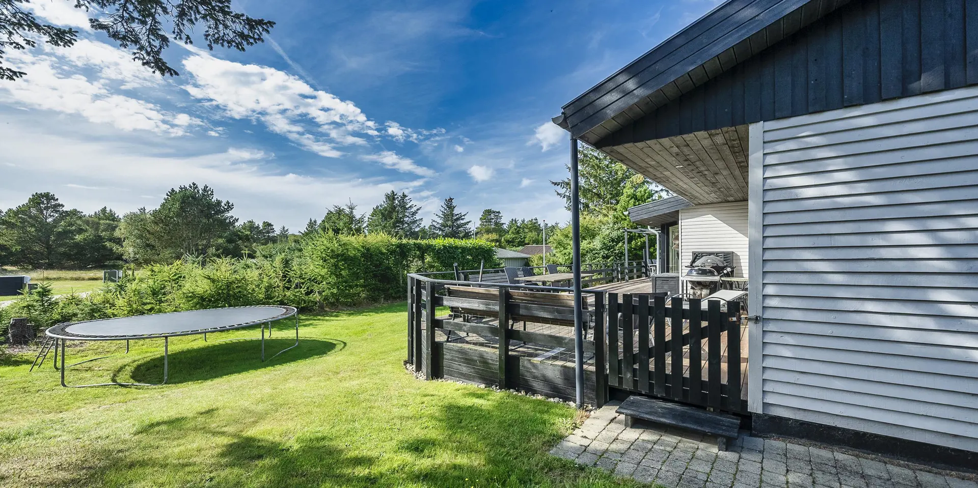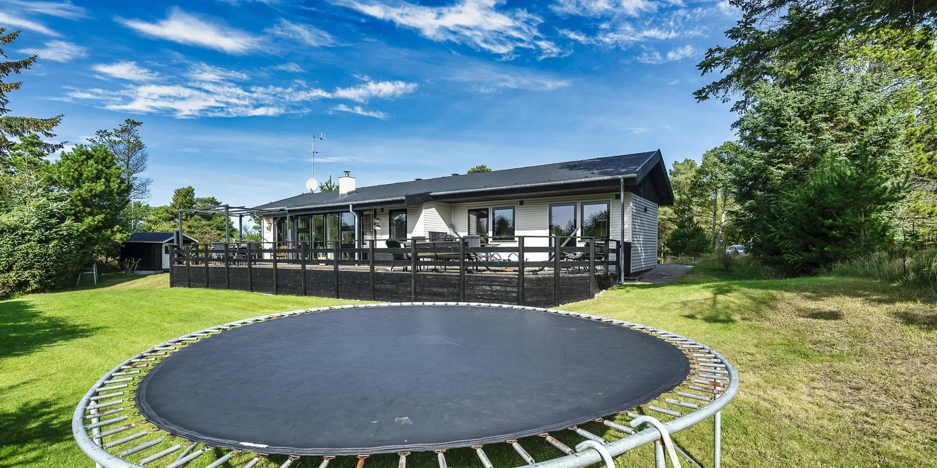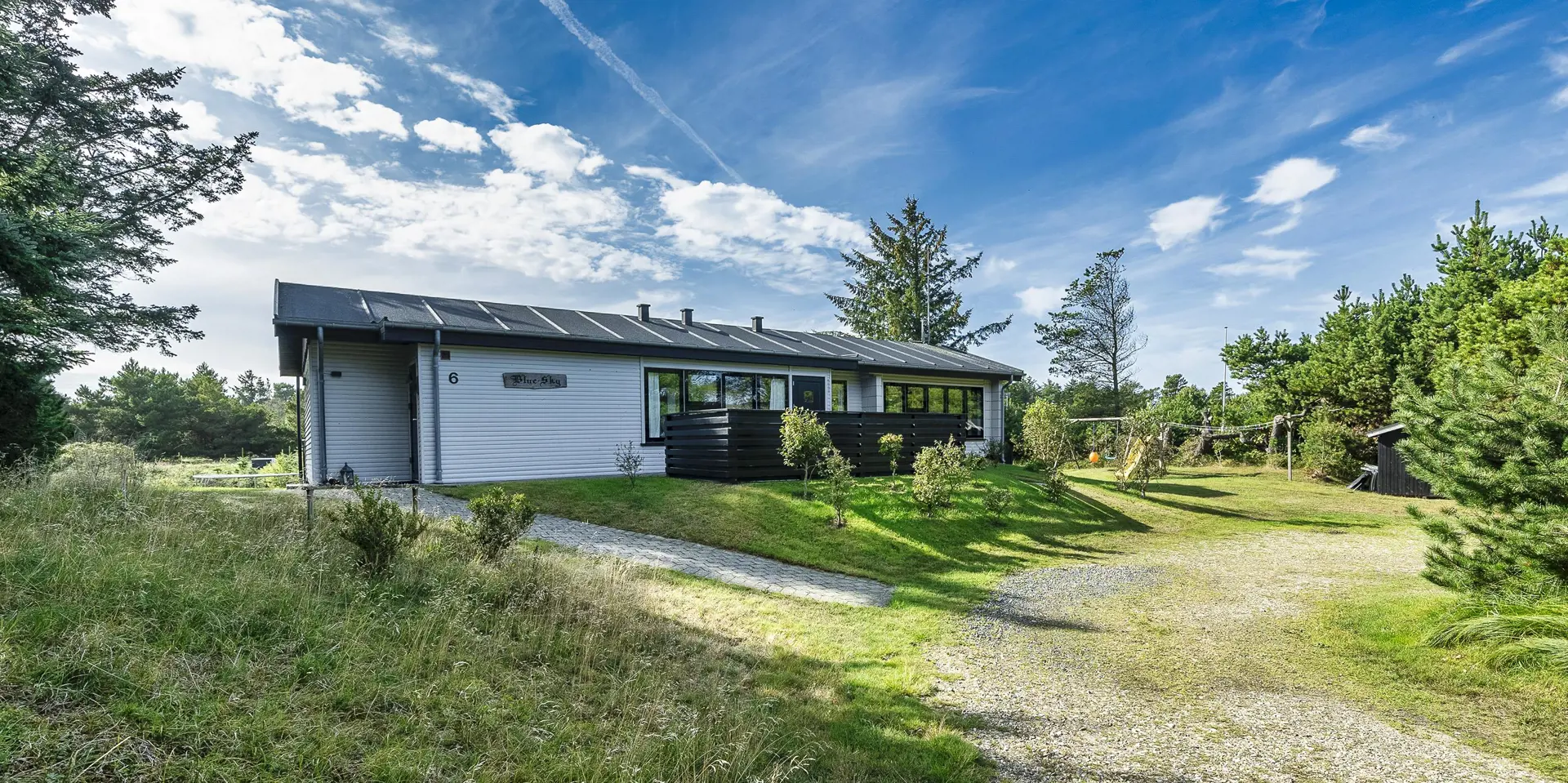 Geschmackvoll eingerichtetes Ferienhaus mit Namen ”Blue Sky” auf einem schönen Naturgrundstück gelegen. Das Ferienhaus ist für 6 Personen ausgestattet. Der Strand ist 1,2 Km vom Ferienhaus entfernt. Der Wohn- und Essbereich ist mit einem tollen Holzfußboden ausgestattet, einer gemütlichen Rundsitzecke und einen Kamin. Es befindet sich eine Warmepumpe im Ferienhaus. Mit dieser Warmepumpe haben sie die Möglichkeit die Stromkosten zu senken, denn die Warmepumpe ist energiesparend. Das deutsche Fernsehprogramm empfangen Sie über eine Parabolantenne. Chromecast. Die Küche ist modern und ausgestattet mit einem Herd mit Kochplatten, einem Backofen, einer Geschirrspülmaschine, einer Mikrowelle und einer Kühl- und Gefrierkombination. Das Badezimmer hat ein WC, ein Handwaschbecken, eine Handtuchhalteheizung und eine Dusche. Die Waschmaschine und der Trockner sind hier im Badezimmer untergebracht. Insgesamt stehen den Gästen 3 Schlafzimmer zur Verfügung: DB + DB + DB. Das Ferienhaus verfügt über einen Internetanschluss (W-Lan). Rauchen ist nicht erlaubt. In dem Wintergarten sind flotte Rattanmöbel mit einer hohen Lehne aufgestellt. Hier kommt durch die vielen Fenster reichlich Licht in den Bereich. Zwei schöne Terrassenbereiche stehen am Haus den Gästen bereit, wo Sie zum Beispiel Ihr Sonnenbad geniessen können, Ihren Kaffee trinken, einen Grillabend gestalten oder einfach nur relaxen. Der größere Terrassenbereich ist sogar geschlossen. Da können Ihre Vierbeine mal Luft schnappen ohne, das sie gleich stiften gehen können. Ein kleiner Kinderspielplatz mit Schaukelstativ und Rutsche, einer Sandkiste und einem Spielhaus befindet sich auf dem Grundstück. Trampolin. Ein Kohlegrill steht den Gästen auch zur Verfügung. Auch ausreichend Platz zum Bolzen ist gegeben. Es sind max. zwei Haustiere erlaubt. Das Ferienhaus ist 1964 erbaut worden und in 2015 ist es teilrenoviert.