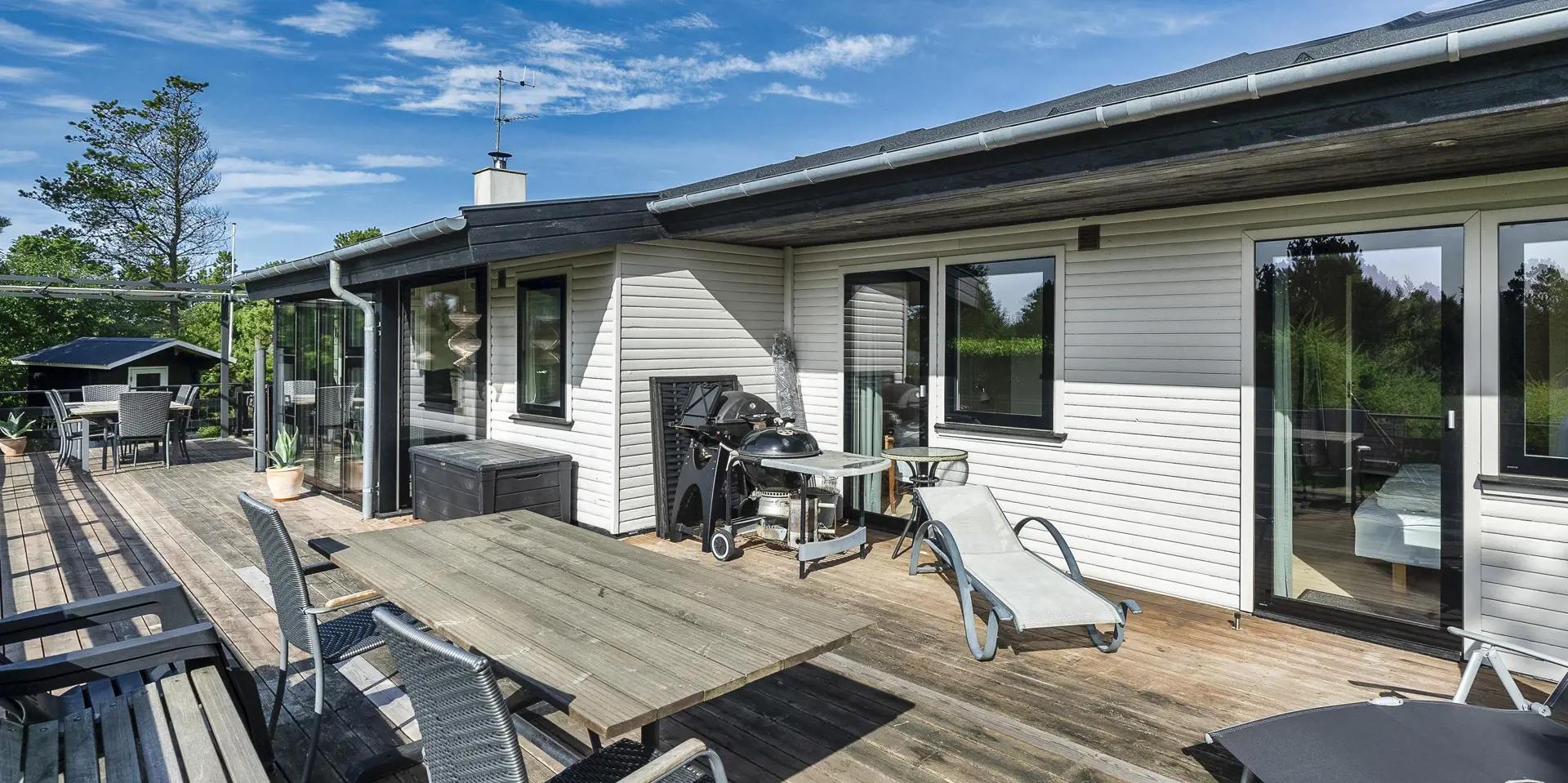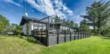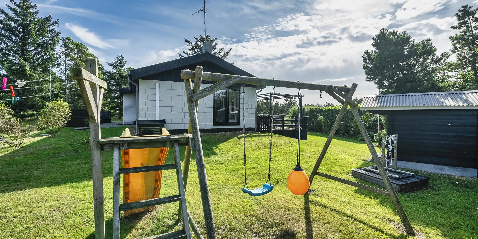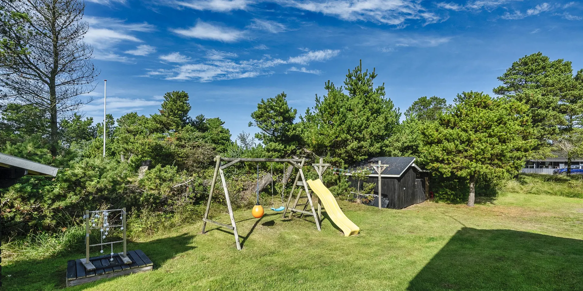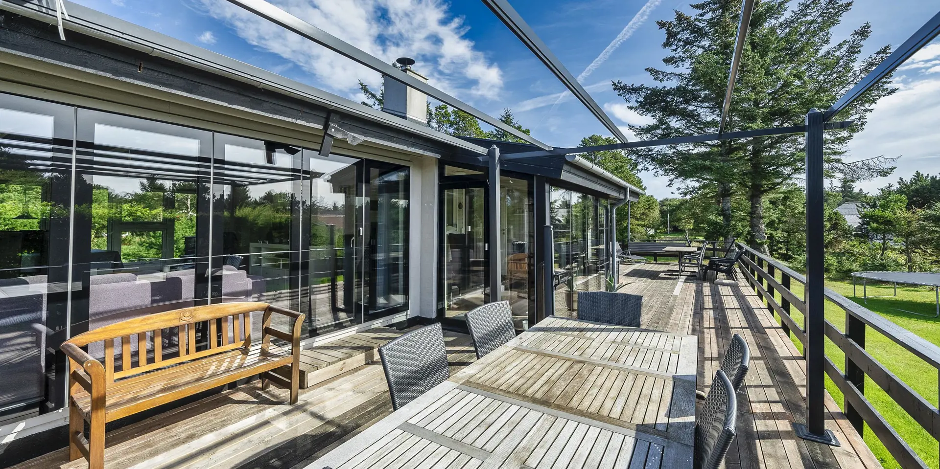 Geschmackvoll eingerichtetes Ferienhaus mit Namen ”Blue Sky” auf einem schönen Naturgrundstück gelegen. Das Ferienhaus ist für 6 Personen ausgestattet. Der Strand ist 1,2 Km vom Ferienhaus entfernt. Der Wohn- und Essbereich ist mit einem tollen Holzfußboden ausgestattet, einer gemütlichen Rundsitzecke und einen Kamin. Es befindet sich eine Warmepumpe im Ferienhaus. Mit dieser Warmepumpe haben sie die Möglichkeit die Stromkosten zu senken, denn die Warmepumpe ist energiesparend. Das deutsche Fernsehprogramm empfangen Sie über eine Parabolantenne. Chromecast. Die Küche ist modern und ausgestattet mit einem Herd mit Kochplatten, einem Backofen, einer Geschirrspülmaschine, einer Mikrowelle und einer Kühl- und Gefrierkombination. Das Badezimmer hat ein WC, ein Handwaschbecken, eine Handtuchhalteheizung und eine Dusche. Die Waschmaschine und der Trockner sind hier im Badezimmer untergebracht. Insgesamt stehen den Gästen 3 Schlafzimmer zur Verfügung: DB + DB + DB. Das Ferienhaus verfügt über einen Internetanschluss (W-Lan). Rauchen ist nicht erlaubt. In dem Wintergarten sind flotte Rattanmöbel mit einer hohen Lehne aufgestellt. Hier kommt durch die vielen Fenster reichlich Licht in den Bereich. Zwei schöne Terrassenbereiche stehen am Haus den Gästen bereit, wo Sie zum Beispiel Ihr Sonnenbad geniessen können, Ihren Kaffee trinken, einen Grillabend gestalten oder einfach nur relaxen. Der größere Terrassenbereich ist sogar geschlossen. Da können Ihre Vierbeine mal Luft schnappen ohne, das sie gleich stiften gehen können. Ein kleiner Kinderspielplatz mit Schaukelstativ und Rutsche, einer Sandkiste und einem Spielhaus befindet sich auf dem Grundstück. Trampolin. Ein Kohlegrill steht den Gästen auch zur Verfügung. Auch ausreichend Platz zum Bolzen ist gegeben. Es sind max. zwei Haustiere erlaubt. Das Ferienhaus ist 1964 erbaut worden und in 2015 ist es teilrenoviert.