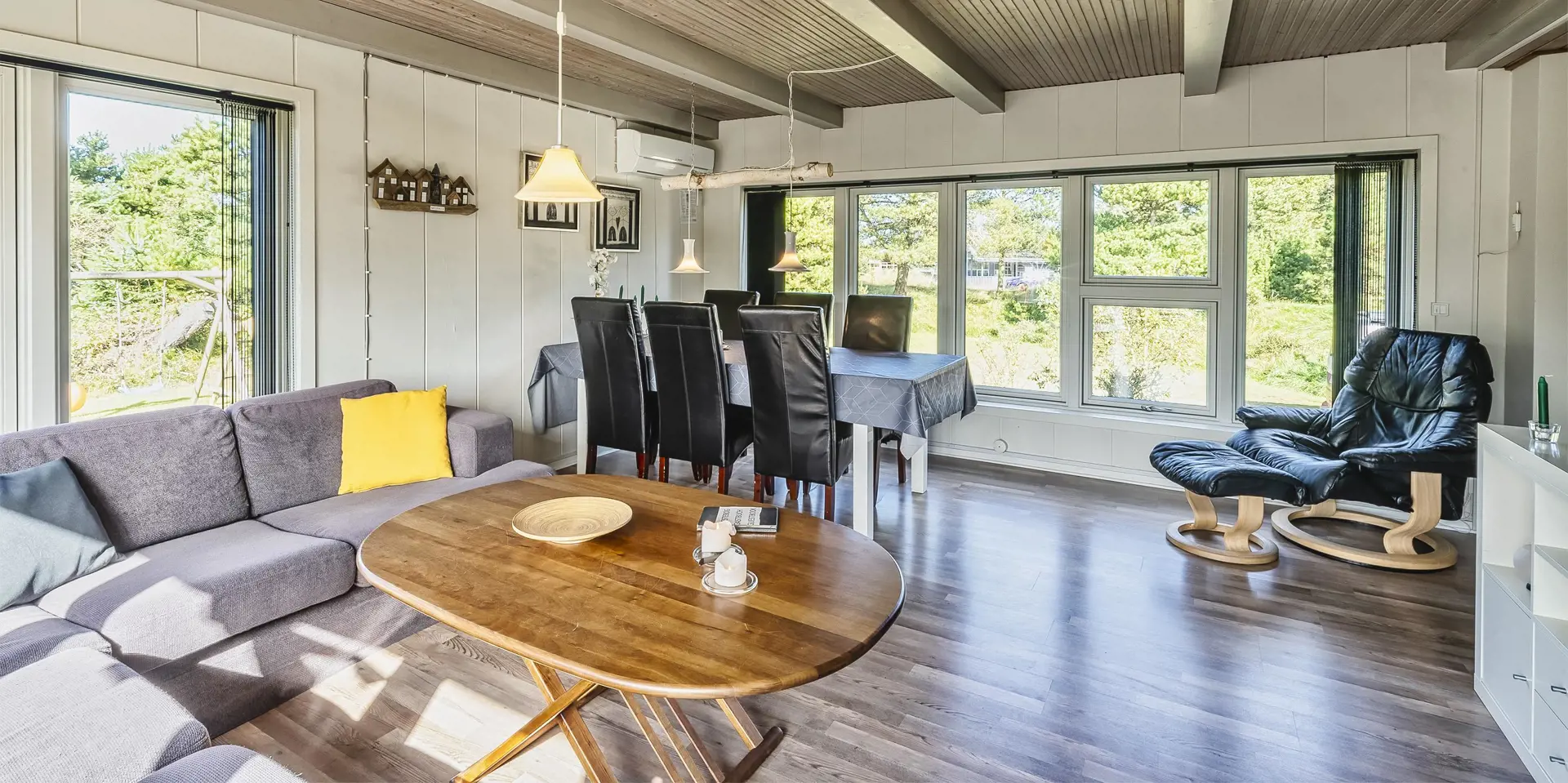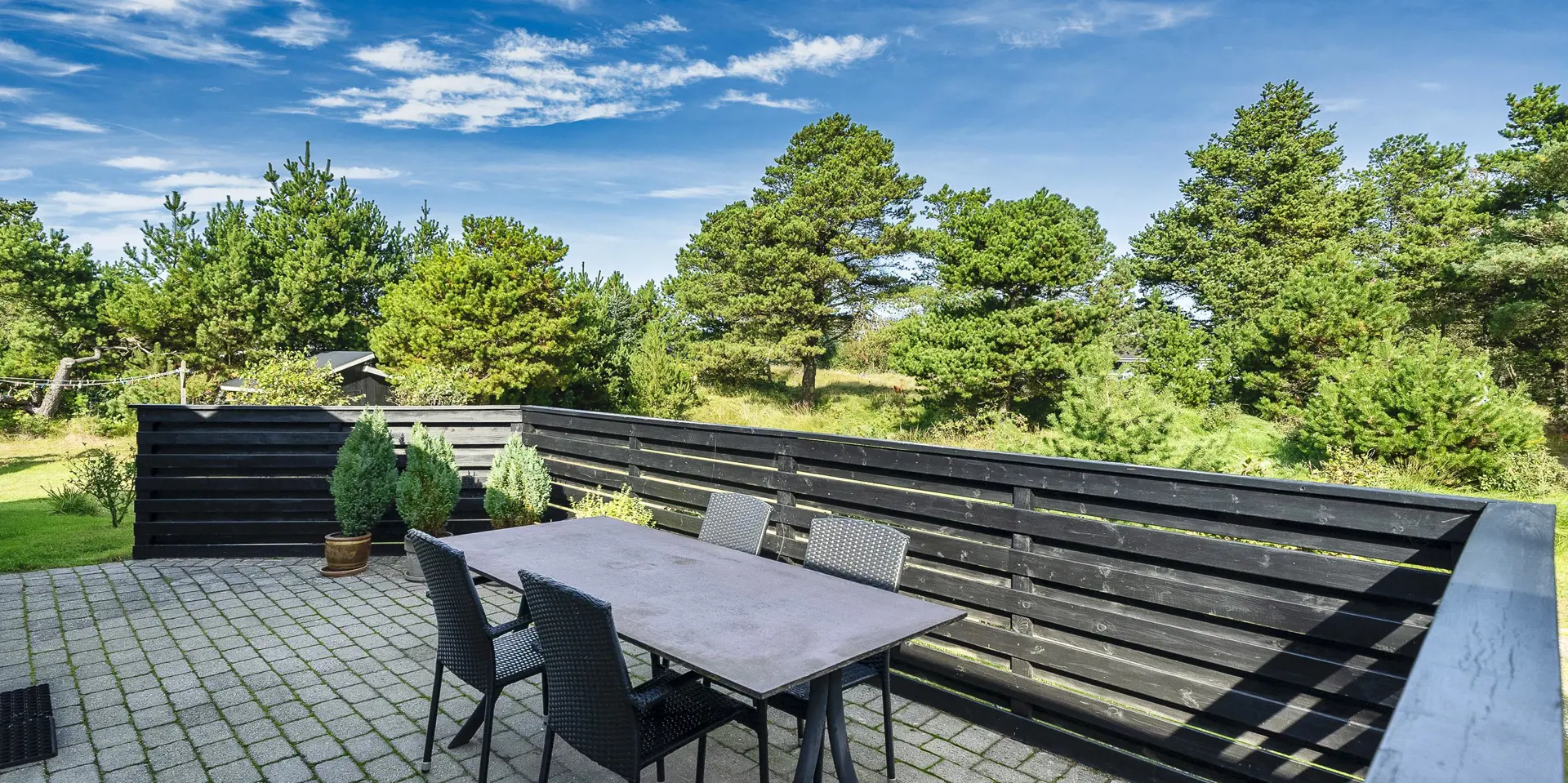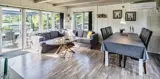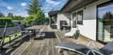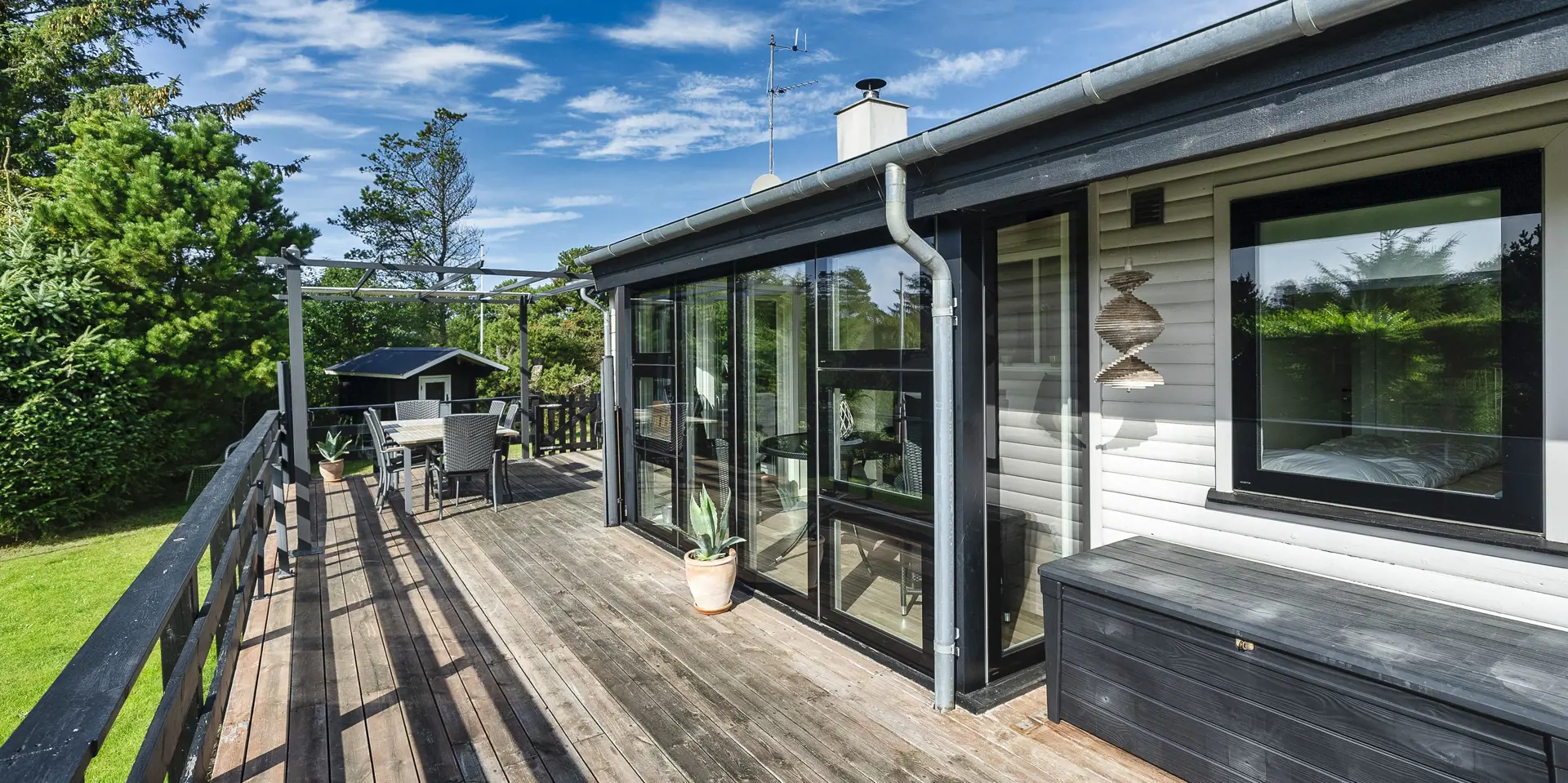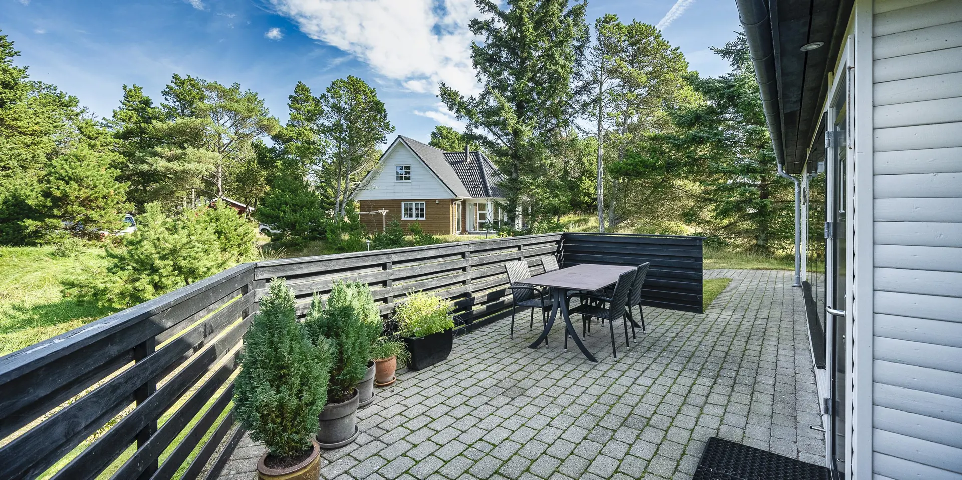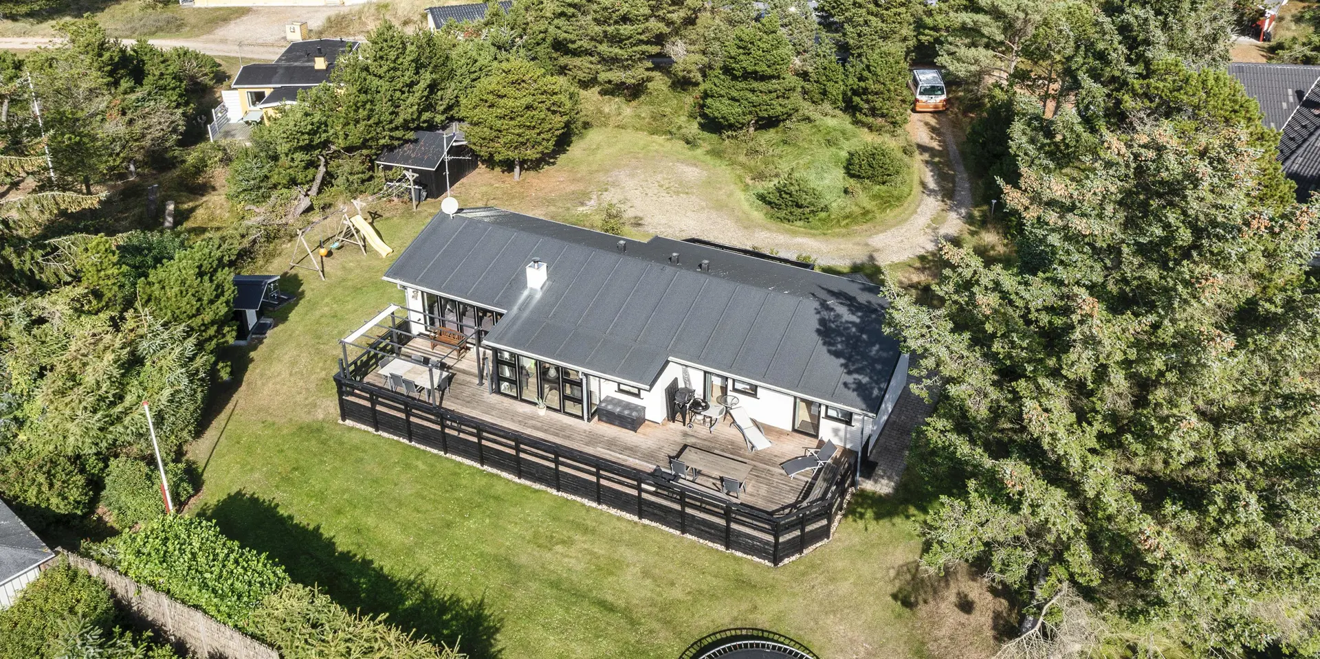 Geschmackvoll eingerichtetes Ferienhaus mit Namen ”Blue Sky” auf einem schönen Naturgrundstück gelegen. Das Ferienhaus ist für 6 Personen ausgestattet. Der Strand ist 1,2 Km vom Ferienhaus entfernt. Der Wohn- und Essbereich ist mit einem tollen Holzfußboden ausgestattet, einer gemütlichen Rundsitzecke und einen Kamin. Es befindet sich eine Warmepumpe im Ferienhaus. Mit dieser Warmepumpe haben sie die Möglichkeit die Stromkosten zu senken, denn die Warmepumpe ist energiesparend. Das deutsche Fernsehprogramm empfangen Sie über eine Parabolantenne. Chromecast. Die Küche ist modern und ausgestattet mit einem Herd mit Kochplatten, einem Backofen, einer Geschirrspülmaschine, einer Mikrowelle und einer Kühl- und Gefrierkombination. Das Badezimmer hat ein WC, ein Handwaschbecken, eine Handtuchhalteheizung und eine Dusche. Die Waschmaschine und der Trockner sind hier im Badezimmer untergebracht. Insgesamt stehen den Gästen 3 Schlafzimmer zur Verfügung: DB + DB + DB. Das Ferienhaus verfügt über einen Internetanschluss (W-Lan). Rauchen ist nicht erlaubt. In dem Wintergarten sind flotte Rattanmöbel mit einer hohen Lehne aufgestellt. Hier kommt durch die vielen Fenster reichlich Licht in den Bereich. Zwei schöne Terrassenbereiche stehen am Haus den Gästen bereit, wo Sie zum Beispiel Ihr Sonnenbad geniessen können, Ihren Kaffee trinken, einen Grillabend gestalten oder einfach nur relaxen. Der größere Terrassenbereich ist sogar geschlossen. Da können Ihre Vierbeine mal Luft schnappen ohne, das sie gleich stiften gehen können. Ein kleiner Kinderspielplatz mit Schaukelstativ und Rutsche, einer Sandkiste und einem Spielhaus befindet sich auf dem Grundstück. Trampolin. Ein Kohlegrill steht den Gästen auch zur Verfügung. Auch ausreichend Platz zum Bolzen ist gegeben. Es sind max. zwei Haustiere erlaubt. Das Ferienhaus ist 1964 erbaut worden und in 2015 ist es teilrenoviert.