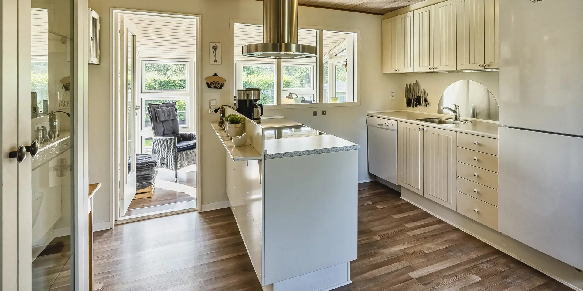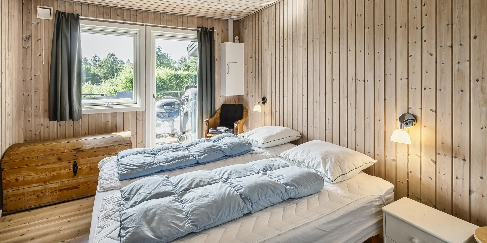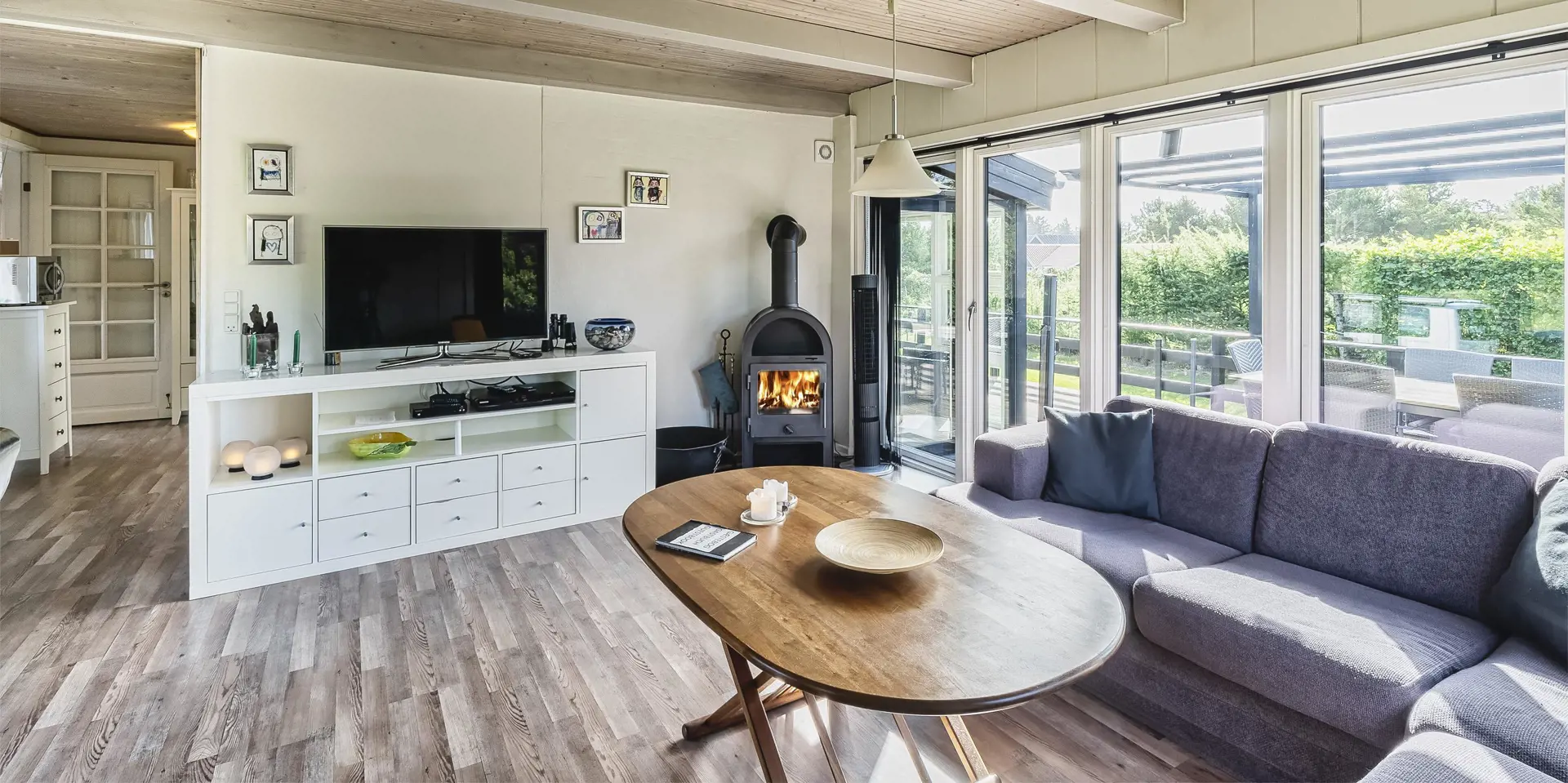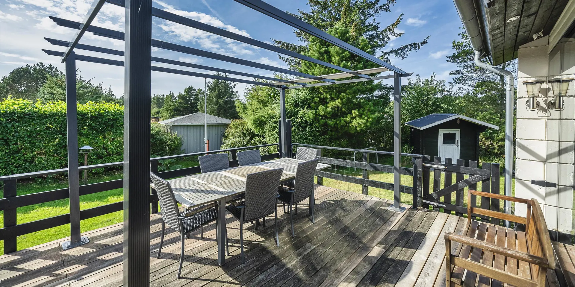 Geschmackvoll eingerichtetes Ferienhaus mit Namen ”Blue Sky” auf einem schönen Naturgrundstück gelegen. Das Ferienhaus ist für 6 Personen ausgestattet. Der Strand ist 1,2 Km vom Ferienhaus entfernt. Der Wohn- und Essbereich ist mit einem tollen Holzfußboden ausgestattet, einer gemütlichen Rundsitzecke und einen Kamin. Es befindet sich eine Warmepumpe im Ferienhaus. Mit dieser Warmepumpe haben sie die Möglichkeit die Stromkosten zu senken, denn die Warmepumpe ist energiesparend. Das deutsche Fernsehprogramm empfangen Sie über eine Parabolantenne. Chromecast. Die Küche ist modern und ausgestattet mit einem Herd mit Kochplatten, einem Backofen, einer Geschirrspülmaschine, einer Mikrowelle und einer Kühl- und Gefrierkombination. Das Badezimmer hat ein WC, ein Handwaschbecken, eine Handtuchhalteheizung und eine Dusche. Die Waschmaschine und der Trockner sind hier im Badezimmer untergebracht. Insgesamt stehen den Gästen 3 Schlafzimmer zur Verfügung: DB + DB + DB. Das Ferienhaus verfügt über einen Internetanschluss (W-Lan). Rauchen ist nicht erlaubt. In dem Wintergarten sind flotte Rattanmöbel mit einer hohen Lehne aufgestellt. Hier kommt durch die vielen Fenster reichlich Licht in den Bereich. Zwei schöne Terrassenbereiche stehen am Haus den Gästen bereit, wo Sie zum Beispiel Ihr Sonnenbad geniessen können, Ihren Kaffee trinken, einen Grillabend gestalten oder einfach nur relaxen. Der größere Terrassenbereich ist sogar geschlossen. Da können Ihre Vierbeine mal Luft schnappen ohne, das sie gleich stiften gehen können. Ein kleiner Kinderspielplatz mit Schaukelstativ und Rutsche, einer Sandkiste und einem Spielhaus befindet sich auf dem Grundstück. Trampolin. Ein Kohlegrill steht den Gästen auch zur Verfügung. Auch ausreichend Platz zum Bolzen ist gegeben. Es sind max. zwei Haustiere erlaubt. Das Ferienhaus ist 1964 erbaut worden und in 2015 ist es teilrenoviert.