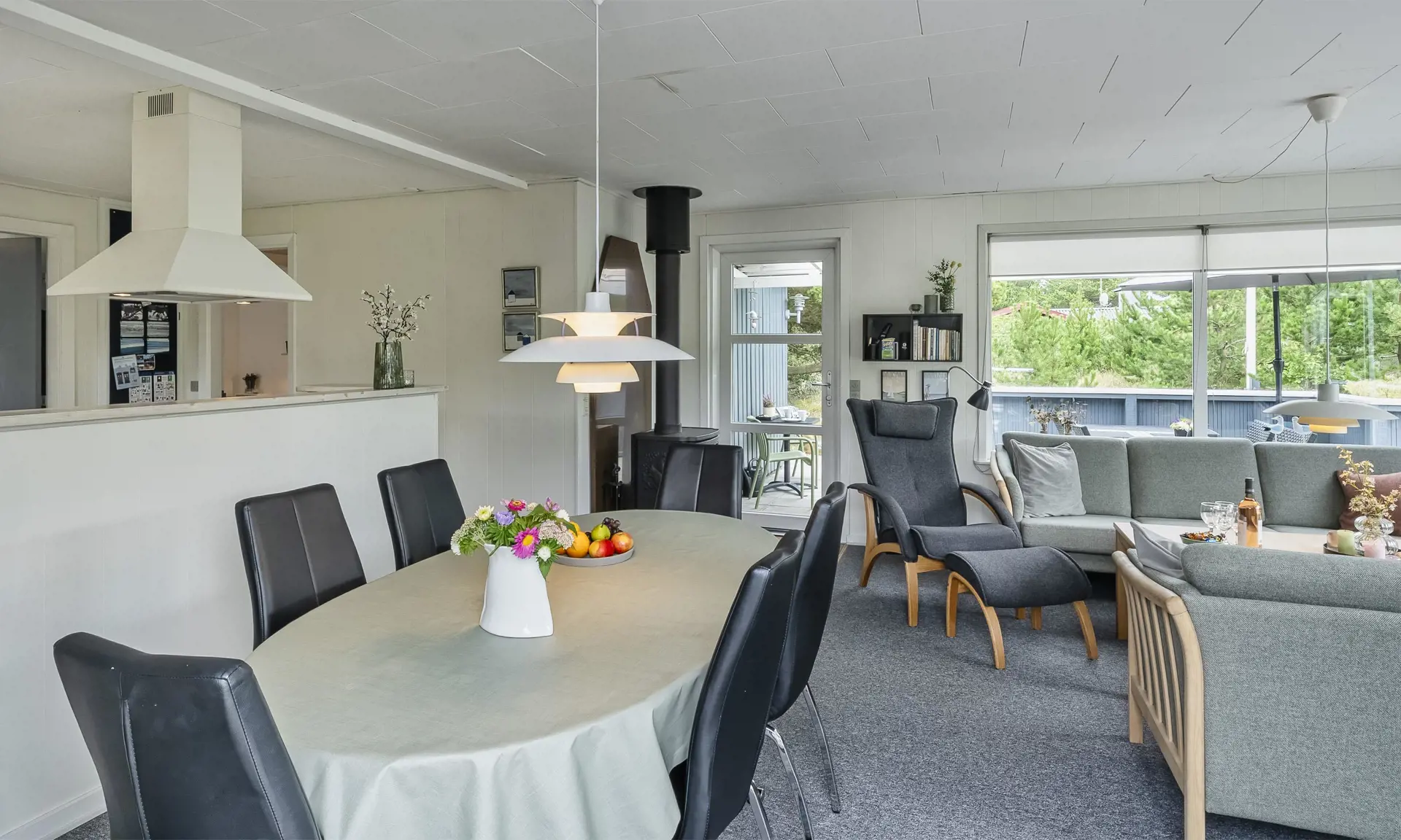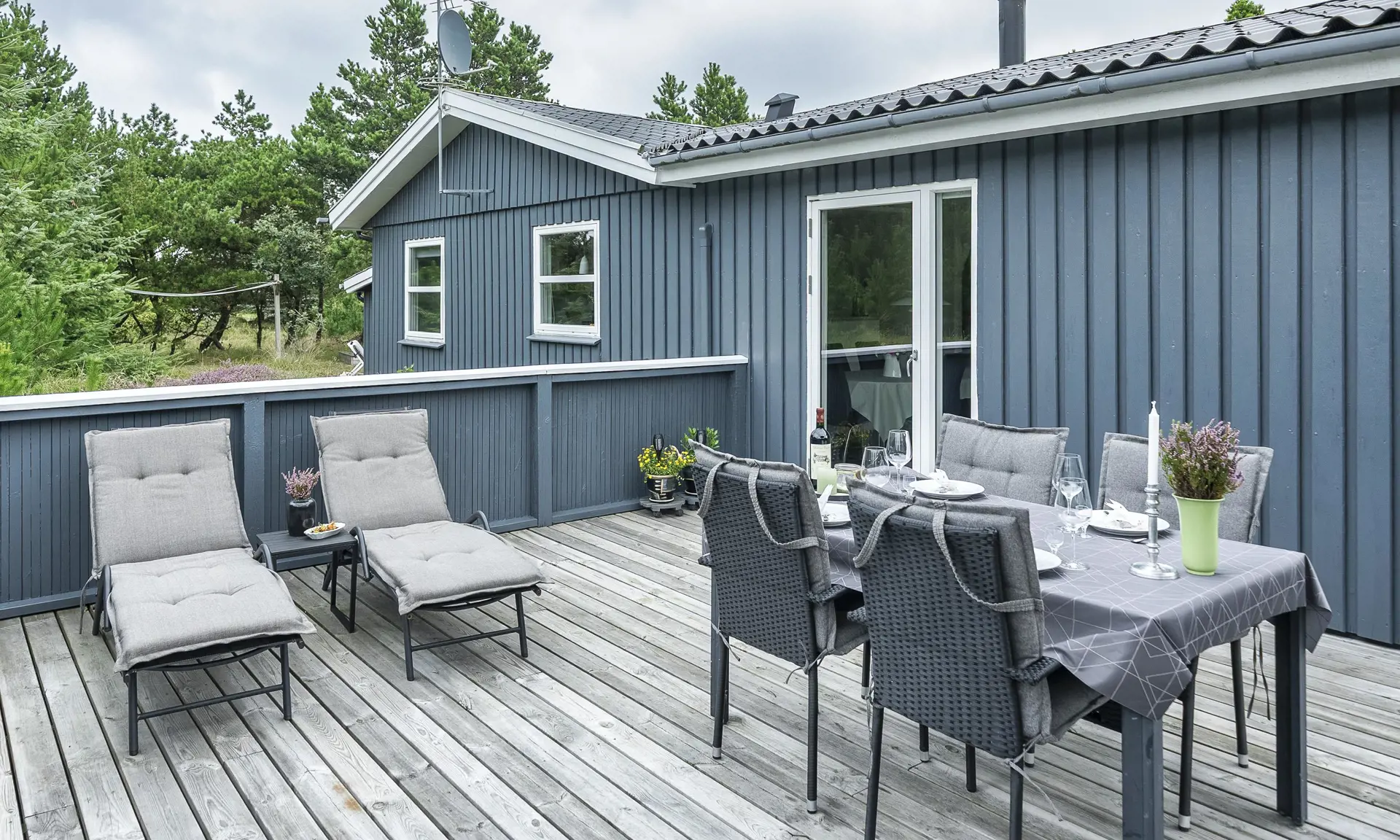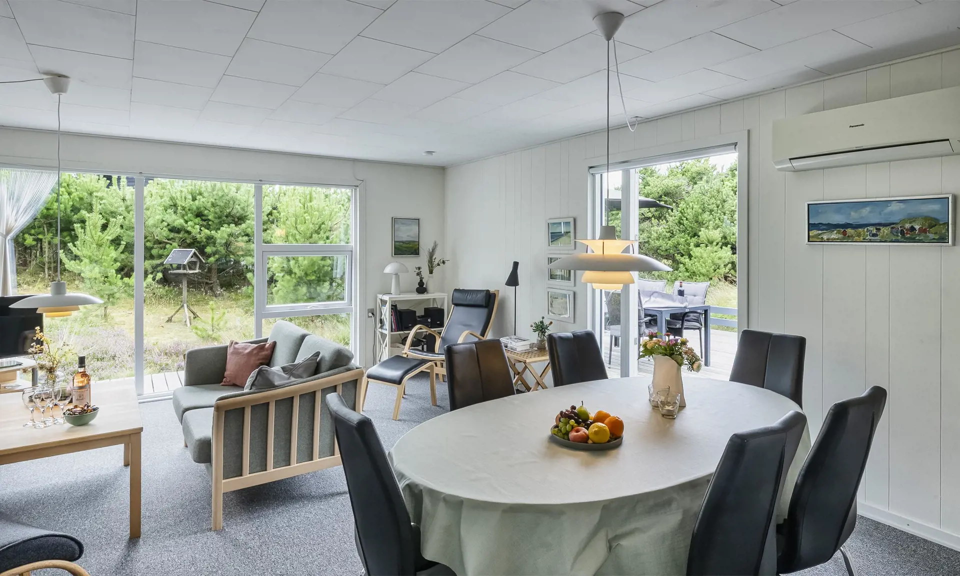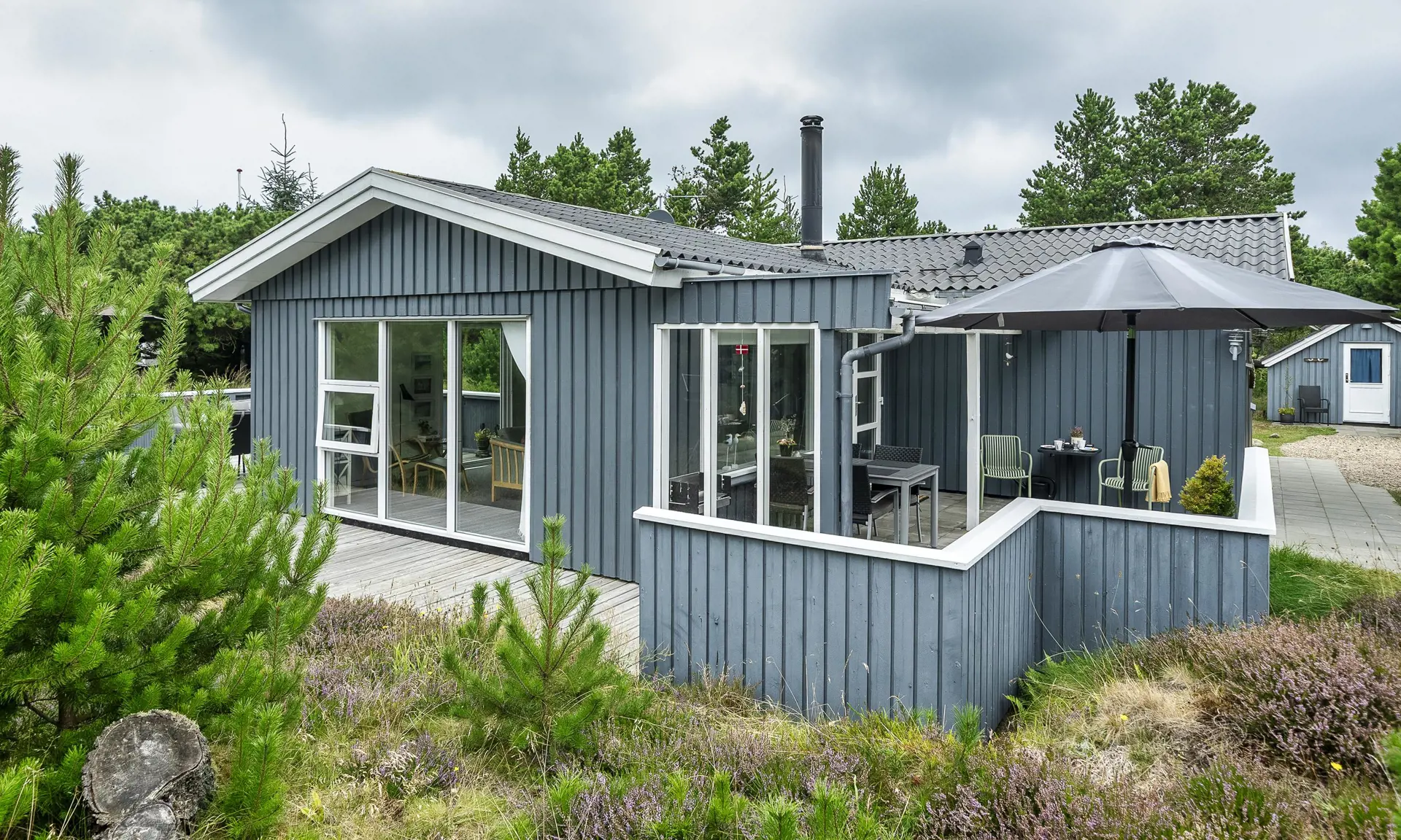 Geschmackvoll eingerichtetes Ferienhaus für bis zu 6 Personen, gelegen auf einem abgeschlossenen Naturgrundstück, ca. 800 Meter vom Strand entfernt. Wohnzimmer mit Fernseher mit DR-Programmen, Chrome Cast, Smart-TV und Satellitenschüssel. Helles, funktionelles und gut ausgestattetes Küche mit u. a. Geschirrspüler und Mikrowelle. Holzofen und energieeffiziente Wärmepumpe. Badezimmer mit Fußbodenheizung, Dusche, WC, Whirlpool und Sauna. Waschmaschine und Trockner vorhanden.
