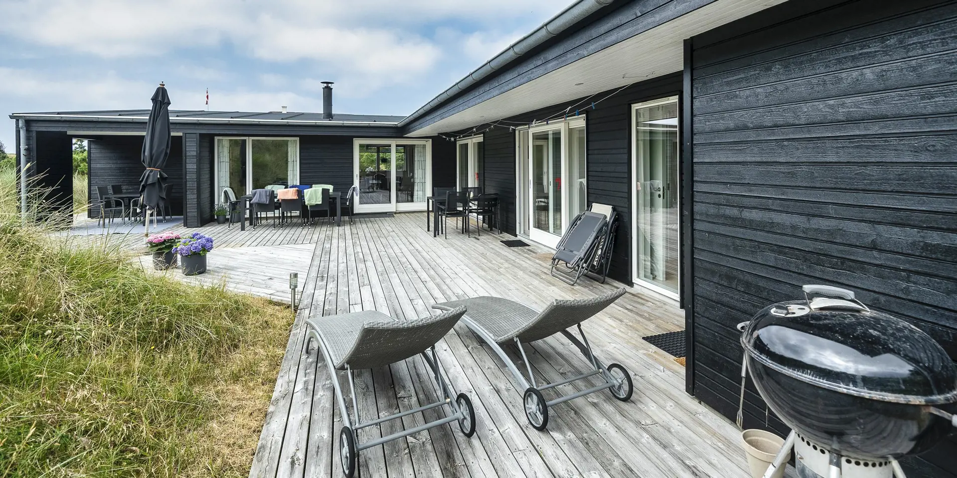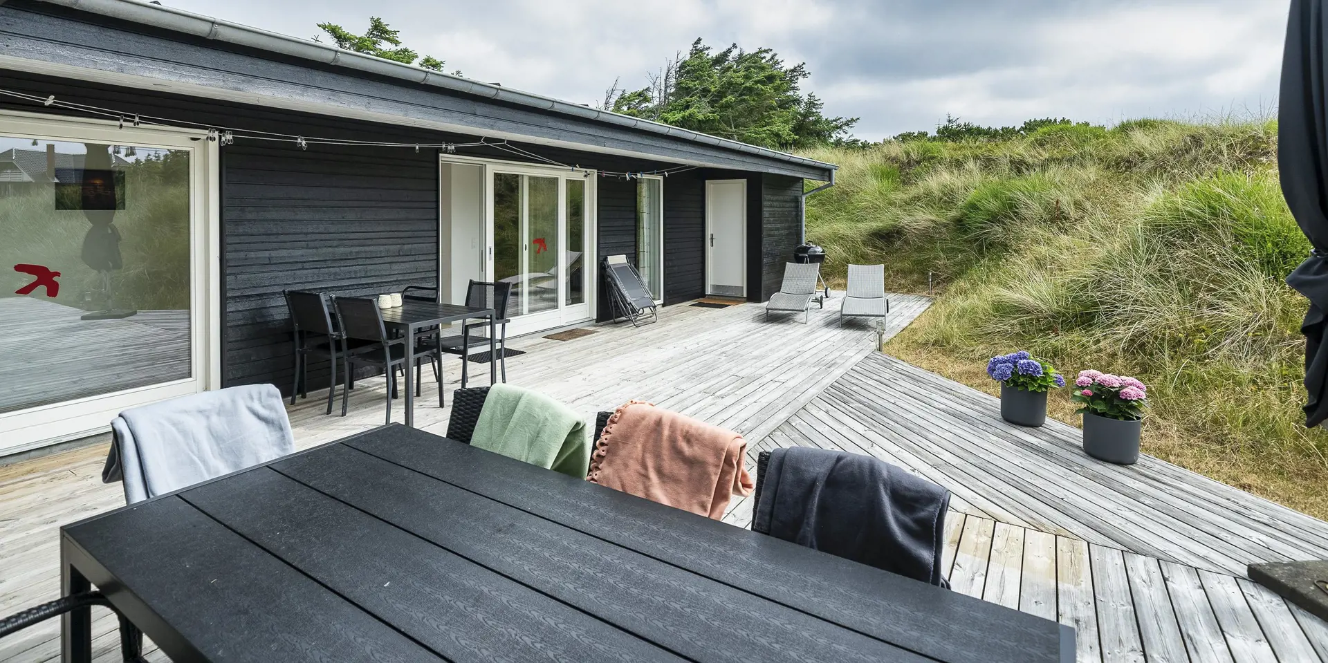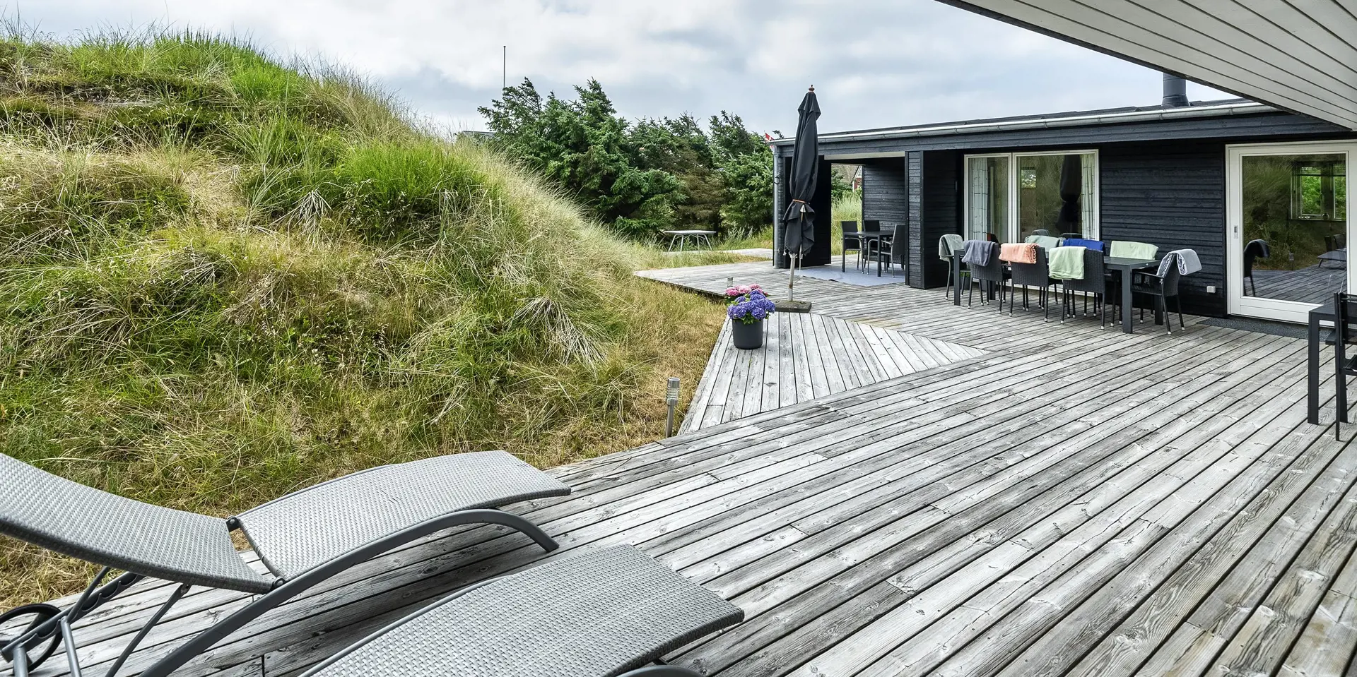 Wunderschönes Ferienhaus in bevorzugter Wohnlage von Vejers Strand und Mitten in einer Dünenlandschaft gelegen. Das Ferienhaus ist für 8 Personen ausgestattet und rund 200 Meter vom Strand entfernt. Das Wohnzimmer mit offener Küche und dem Essplatz hell und freundlich in seiner Ausstattung. Alles ist farblich abgestimmt und passt gut zusammen. Ein Kamin sorgt für wohlige Wärme. Das deutsche Fernsehprogramm empfangen Sie über eine Parabolantenne. Der Küchenbereich verfügt über einen Herd mit Cerankochfeld, einem Backofen, einer Geschirrspülmaschine, einer Mikrowelle und einer Kühl- und Gefrierkombination. Es stehen zwei schöne Badezimmer zur Verfügung. Beide sind mit einem WC, einem Handwaschbecken und einer Dusche ausgestattet. In dem größeren Badezimmer sind die Waschmaschine und der Trockner untergebracht. Vier schöne Schlafzimmer stehen den Gästen zur Verfügung: DB + DB + DB +2B. Drei sind mit einem Doppelbett ausgestattet und ein Schlafzimmer verfügt über zwei Einzelbetten. Eine schöne Holzterrasse lädt zum relaxen ein. Oder nehmen Sie einfach Ihr Sonnenbad oder genießen Sie Ihren Kaffee auf der Terrasse. Für alles bietet der Terrassenbereich genügend Platz an. Das Ferienhaus verfügt über einen Internetanschluss (W-Lan). Es sind keine Haustiere erlaubt. Das Rauchen im Ferienhaus ist nicht erlaubt. Das Ferienhaus ist 2008 erbaut worden.