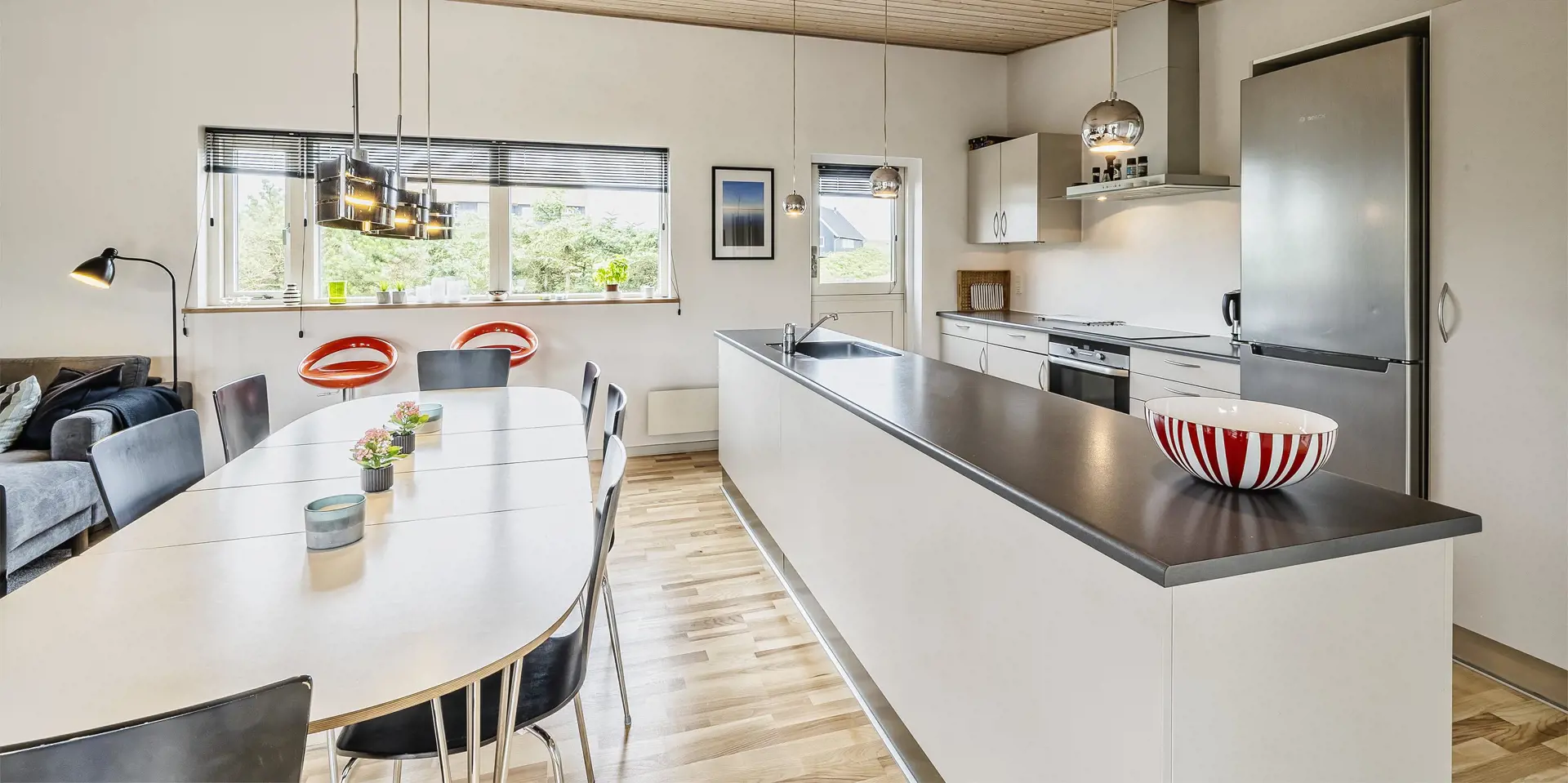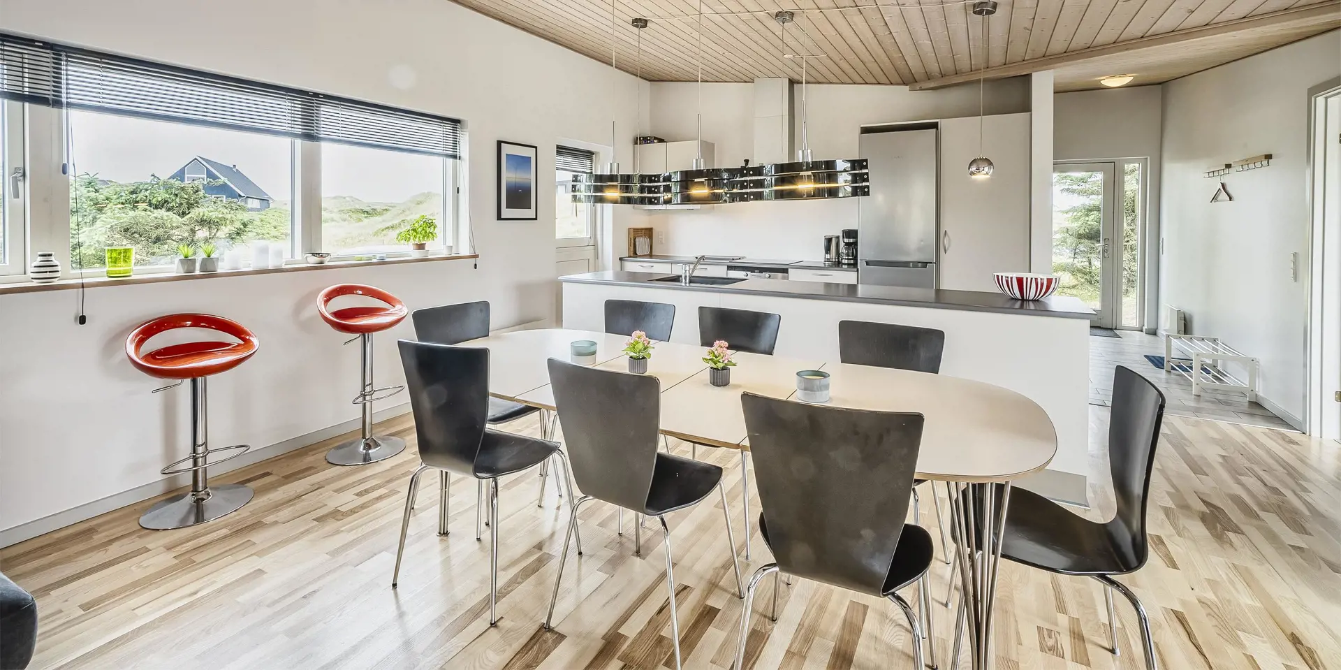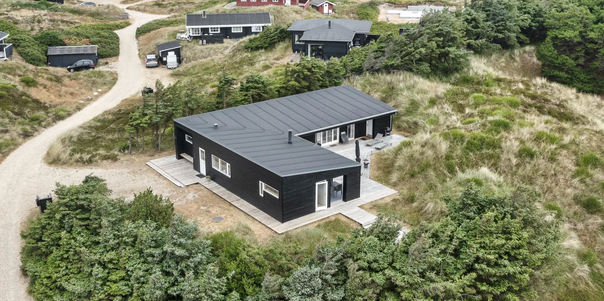Wunderschönes Ferienhaus in bevorzugter Wohnlage von Vejers Strand und Mitten in einer Dünenlandschaft gelegen. Das Ferienhaus ist für 8 Personen ausgestattet und rund 200 Meter vom Strand entfernt. Das Wohnzimmer mit offener Küche und dem Essplatz hell und freundlich in seiner Ausstattung. Alles ist farblich abgestimmt und passt gut zusammen. Ein Kamin sorgt für wohlige Wärme. Das deutsche Fernsehprogramm empfangen Sie über eine Parabolantenne. Der Küchenbereich verfügt über einen Herd mit Cerankochfeld, einem Backofen, einer Geschirrspülmaschine, einer Mikrowelle und einer Kühl- und Gefrierkombination. Es stehen zwei schöne Badezimmer zur Verfügung. Beide sind mit einem WC, einem Handwaschbecken und einer Dusche ausgestattet. In dem größeren Badezimmer sind die Waschmaschine und der Trockner untergebracht. Vier schöne Schlafzimmer stehen den Gästen zur Verfügung: DB + DB + DB +2B. Drei sind mit einem Doppelbett ausgestattet und ein Schlafzimmer verfügt über zwei Einzelbetten. Eine schöne Holzterrasse lädt zum relaxen ein. Oder nehmen Sie einfach Ihr Sonnenbad oder genießen Sie Ihren Kaffee auf der Terrasse. Für alles bietet der Terrassenbereich genügend Platz an. Das Ferienhaus verfügt über einen Internetanschluss (W-Lan). Es sind keine Haustiere erlaubt. Das Rauchen im Ferienhaus ist nicht erlaubt. Das Ferienhaus ist 2008 erbaut worden.