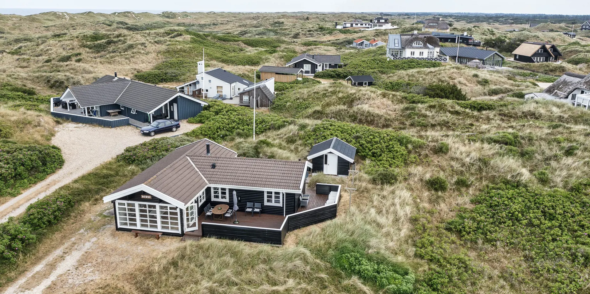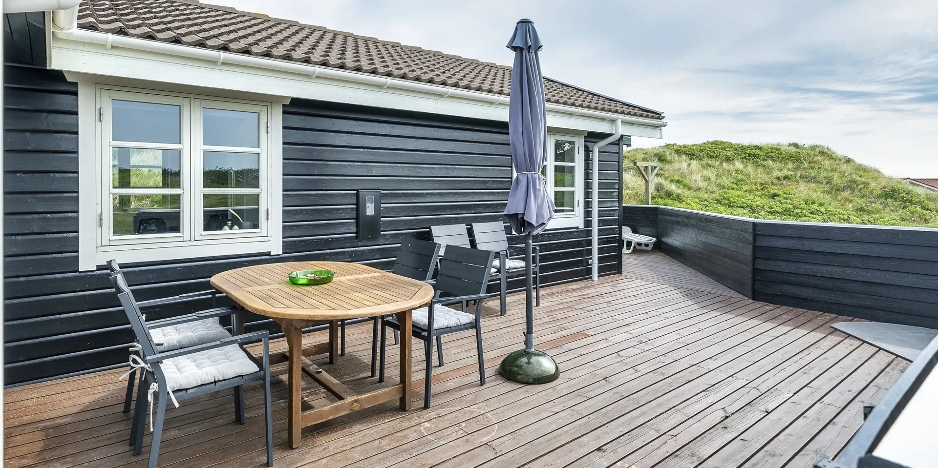Charmant eingerichtetes Ferienhaus auf einem wunderschönen Dünengrundstück gelegen. Das Feierhaus ist für 6 Personen ausgestattet und weniger als 100 Meter vom Strand entfernt. Im Wohnbereich ist eine gemütliche große Leder-Rundsitzecke aufgestellt und ein Kamin. Es befindet sich eine Warmepumpe im Ferienhaus. Mit dieser Warmepumpe haben sie die Möglichkeit die Stromkosten zu senken, denn die Warmepumpe ist energiesparend. Ein Fernsehgerät ist in einem separaten Zimmer aufgestellt. Die deutschen Programme empfangen Sie über eine Parabolantenne. Der Essbereich befindet sich vor einer großen Fensterfront. Von hier haben Sie auch einen tollen Ausblick auf die Dünen. Im gesamten Wohn-, Ess- und Küchenbereich ist ein schicker Holzfußboden verlegt. In einer Ecke im Wohnbereich ist eine kleine Leseecke mit zwei Rattansesseln eingerichtet. Die Küche ist modern und hat einen Herd mit Cerankochfeld, ein Backofen, eine Geschirrspülmaschine und eine Kühl- und Gefrierkombination. Mikrowelle im Abstellraum. Das Badezimmer ist mit einem WC, einem Handwaschbecken und einer Dusche ausgestattet. Eine Handtuchhaltereizung ist ebenfalls installiert. Insgesamt befinden sich drei Schlafzimmer im Ferienhaus: DB + 2B + 2B. Eine hat ein Doppelbett, eines hat zwei Einzelbetten und eines hat Etagenbetten. Eine Waschmaschine steht den Gästen auch zur Verfügung. Das Ferienhaus verfügt über einen Internetanschluss (W-Lan). Ein großzügiger Terrassenbereich steht Ihnen für Ihr Sonnenbad oder Ihre Kaffeetafel zur Verfügung. Schaukel. Hinterm Haus steht eine kleine Sitzgruppe vor einer Düne zum ausruhen bereit. Es ist max. ein Haustier erlaubt. Freie Das Ferienhaus ist 1983 erbaut worden. Gratis Eintritt für das Badeland und Bowling in Varde in 2026. Das Rauchen ist nicht gestattet. Renoviert 2010.