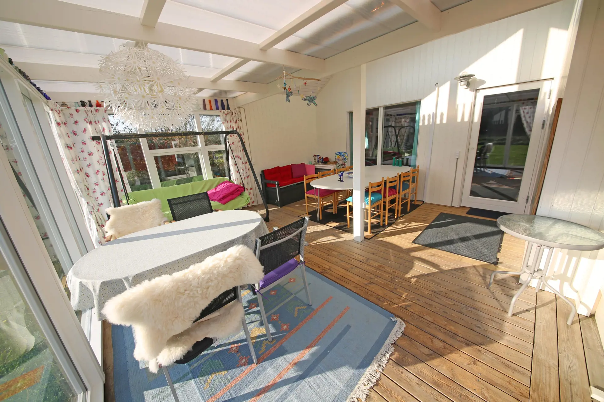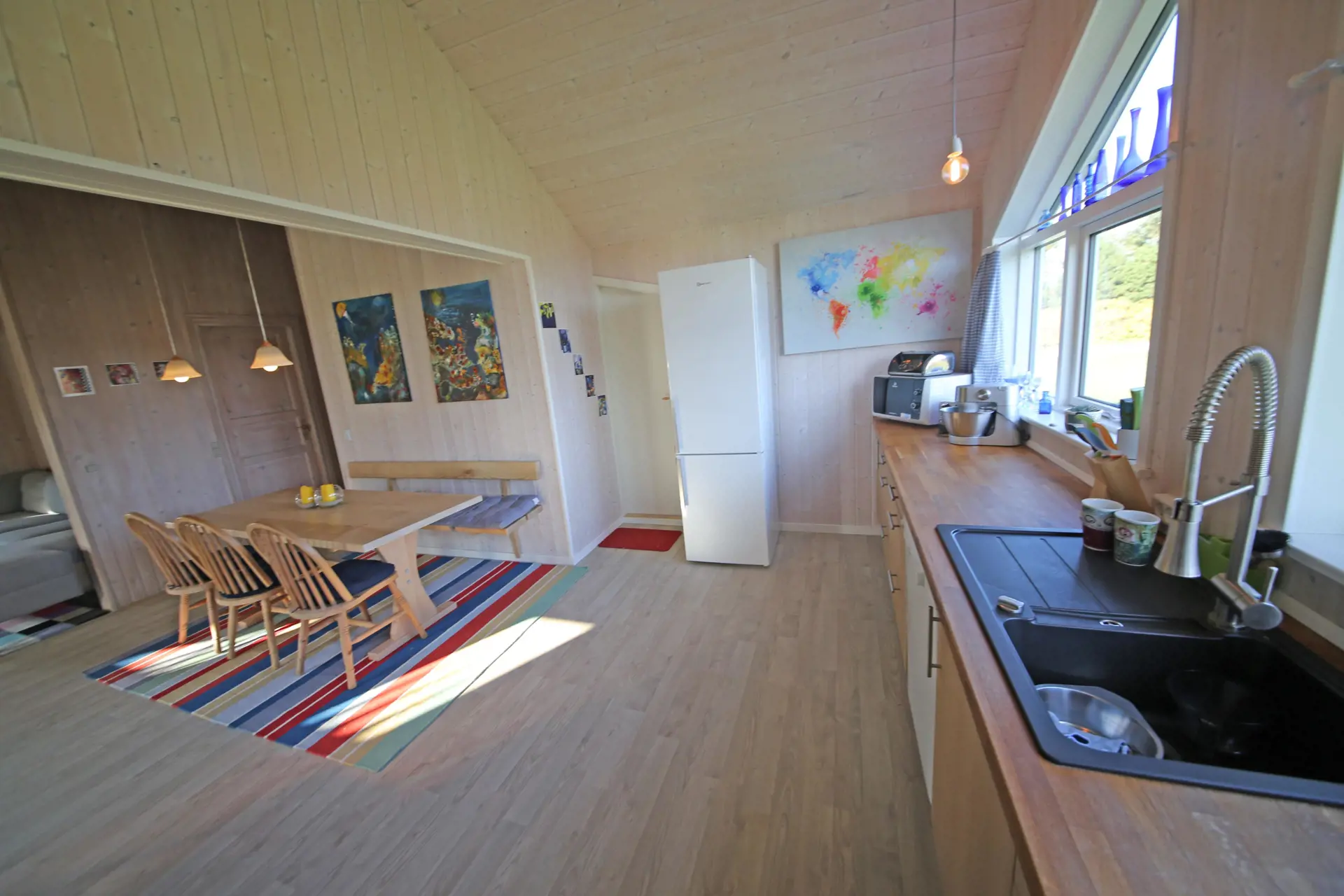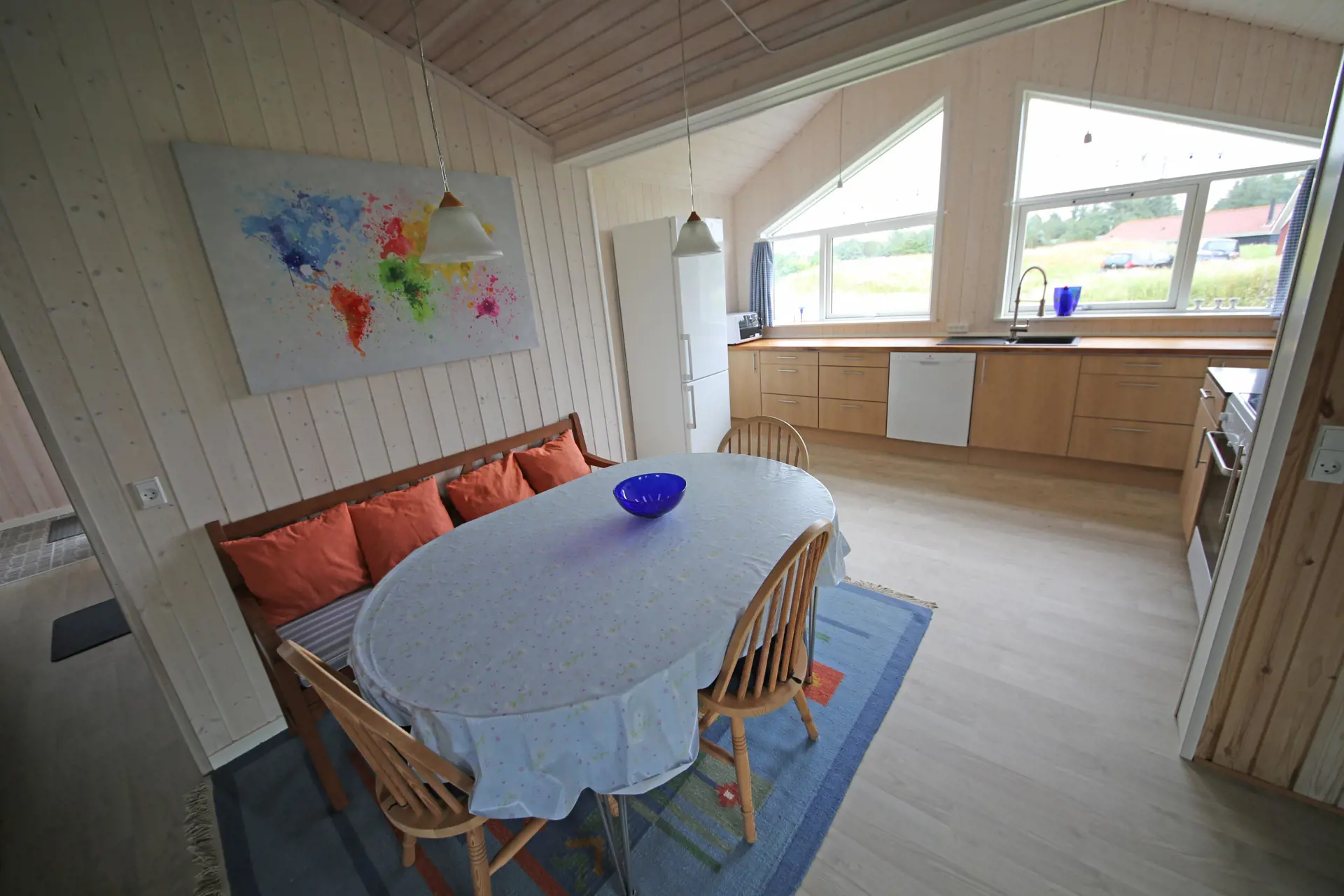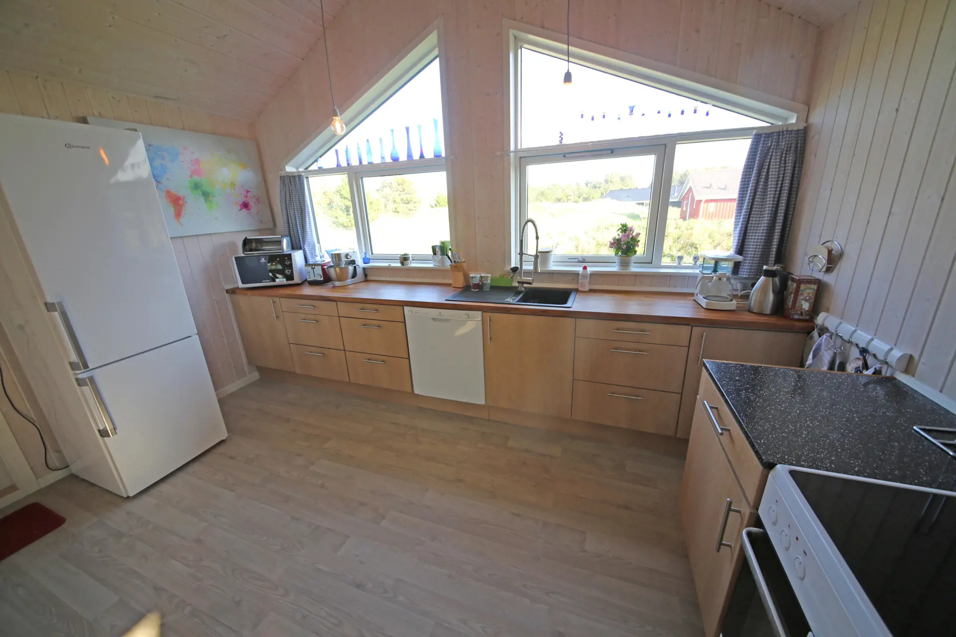 Flottes neu renoviertes Ferienhaus auf einem großen freien Rasengrundstück gelegen. Das Ferienhaus ist für 4 Personen ausgestattet. Der Strand ist ca. 1 Km vom Ferienhaus entfernt. Der komplette Fußbodenbereich, außer im Bad und im Eingangsbereich, da sind Fliesen verlegt, ist mit einem hellen Laminatboden ausgelegt. Der Wohnbereich ist zum Essbereich hin offen gehalten und vom Essbereich aus gelangen Sie in den großen Küchenbereich. Der Kamin ist in einer Ecke im Wohnzimmer aufgestellt. Es befindet sich eine Warmepumpe im Ferienhaus. Mit dieser Warmepumpe haben sie die Möglichkeit die Stromkosten zu senken, denn die Warmepumpe ist energiesparend. Das deutsche Fernsehprogramm empfangen Sie über Stofa, daher sind es nur 5-8 Kanäle die Sie empfangen können. Der große Küchenbereich lädt zum Kochen ein. Die Küche verfügt über ein Herd mit Cerankochfeld, einem Backofen, einer Geschirrspülmaschine, einer Mikrowelle und einer Kühl und Gefrierkombination. Ein kleiner Vorratsraum steht Ihnen auch zur Verfügung. Das Badezimmer ist mit einem WC, einem Handwaschbecken und einer Dusche ausgestattet. Die Waschmaschine ist hier im Badezimmer untergebracht. Es stehen den Gästen zwei Schlafzimmer bereit: DB + 2B. Das eine Schlafzimmer verfügt über ein Doppelbett und das Andere über zwei Einzelbetten. Der großzügige Wintergarten, der vom Wohnbereich aus erreichbar ist, gibt Ihnen die Möglichkeit einfach mal zu relaxen oder gemütlich Ihr Buch zu lesen. Durch die große Fensterfront ist der Wintergarten licht durchflutet. Der Eingangsbereich von außen ist überdacht. In dem schönen Eingangsbereich/Vorraum ist genügend Platz für Jacken und Schuhe. Zwei Terrassenbereiche stehen Ihnen auch zur Verfügung. Für die kleinen Gäste steht ein Schaukelstativ und eine Sandkiste bereit. Das Ferienhaus verfügt über einen Internetanschluss (W-Lan). Es sind max. drei Haustiere erlaubt. Das Rauchen ist nicht gestattet. Das Ferienhaus ist in 1990 erbaut worden und in 2015 renoviert. Deweiteren hat das Ferienhaus einen Anschluss für El-Fahrzeuge.