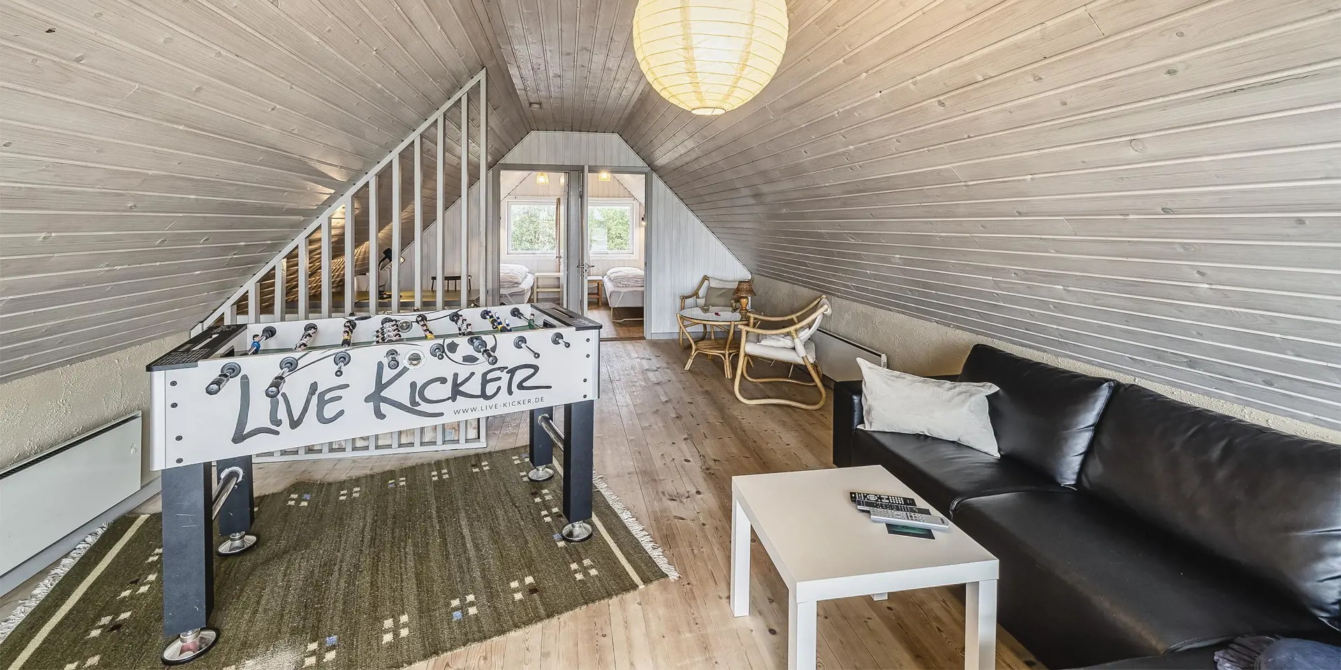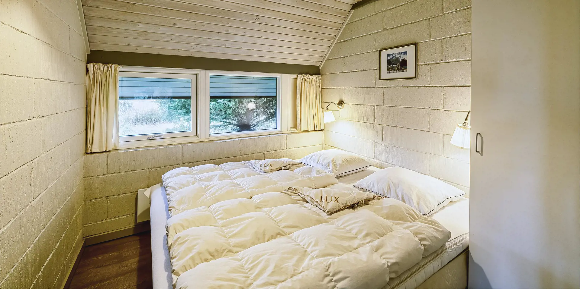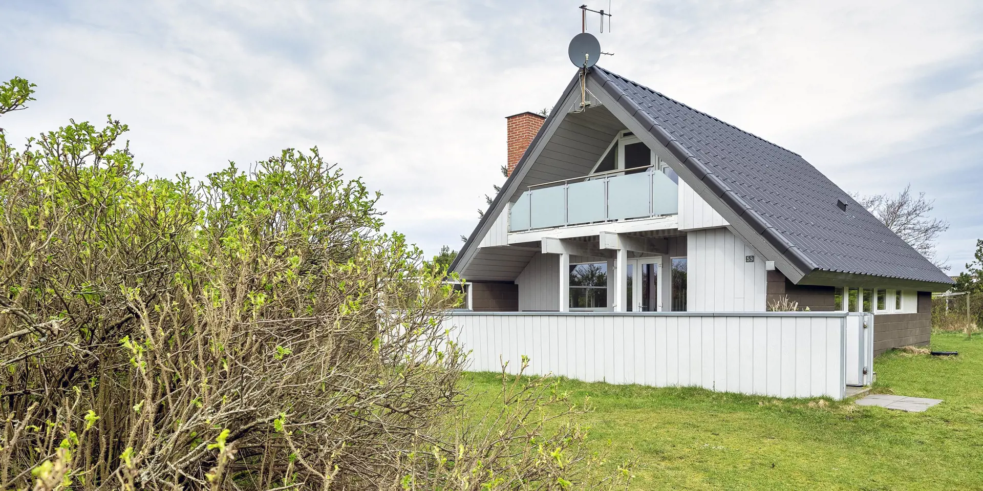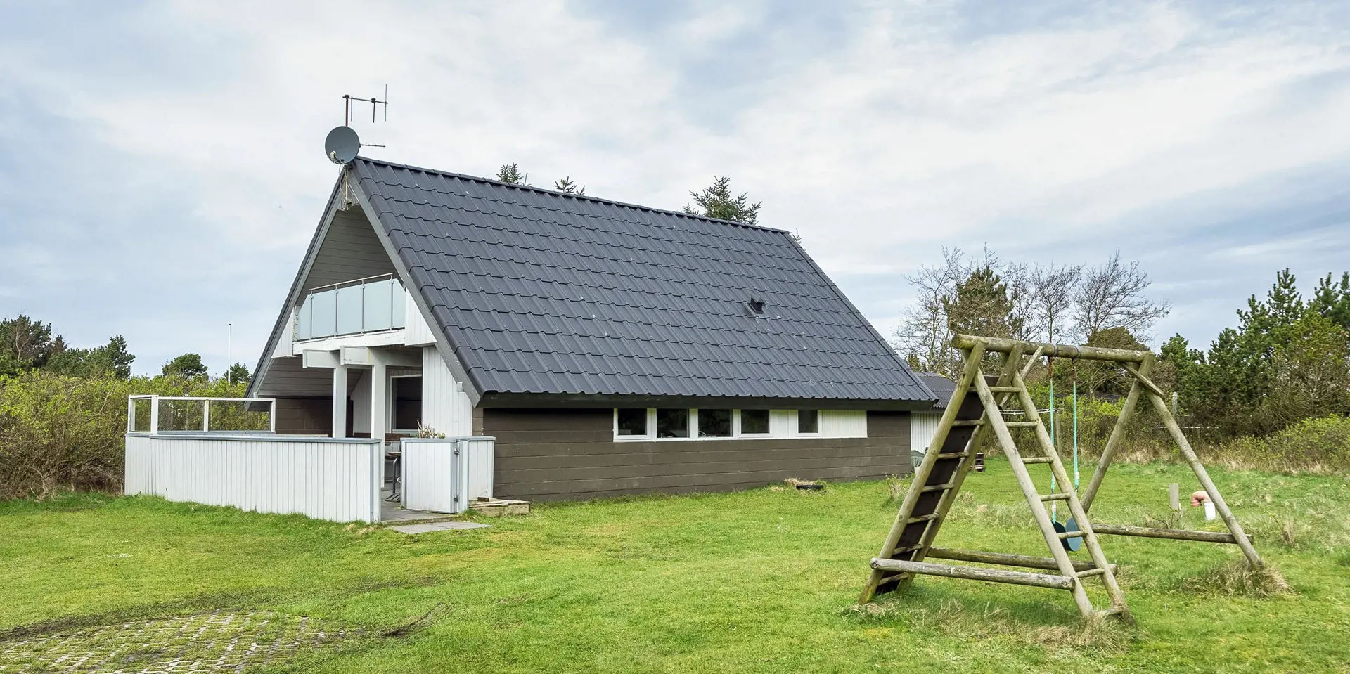 Großes Ferienhaus auf einem naturbelassenem Grundstück gelegen. Das Ferienhaus ist für 6-7 Personen ausgestattet und der Strand ist etwa 1 Km vom Ferienhaus entfernt. Die Räumlichkeiten sind auf 2 Ebenen verteilt. Im Erdgeschoss befindet sich ein Wohnbereich, die Küche, das Badezimmer und zwei Schlafzimmer. Im Obergeschoss dann weitere zwei Schlafzimmer und ein Wohnzimmer. Der Wohnbereich im Erdgeschoss ist mit einer gemütlichen Sitzgarnitur gegenüber dem Kamin ausgestattet. Die Wohnküche ist mit dem Essplatz durch einen Tresen, mit zwei Barhockern, verbunden und verfügt über einen Herd mit Cerankochfeld, einem Backofen, einer Geschirrspülmaschine, einer Mikrowelle und einer Kühl- und Gefrierkombination. Das Badezimmer hat ein WC, ein Handwaschbecken, eine Dusche und genügend Ablagefläche für Ihre Badutensilien. Die Waschmaschine und der Trockner sind hier im Badezimmer untergebracht. 4 Schlafzimmer: DB + DB + DB + 2B. Das Eine Schlafzimmer im Erdgeschoss verfügt über ein Doppelbett und das Andere über eine Schlafcouch. Über eine Holztreppe im Wohnzimmer gelangen Sie dann ins Obergeschoss. Dort stehen Sie dann gleich in dem gemütlichen Wohnraum. Hier steht eine weitere Sitzgarnitur in Form einer Rundsitzecke zur Verfügung. Ein Fernsehgerät ist hier aufgestellt und ein DVD-Abspielgerät ist auch vorhanden. Das deutsche Fernsehprogramm empfangen Sie über eine Parabolantenne. Hier vom Wohnbereich haben Sie einen Zugang zum Balkon. Es stehen weitere zwei Schlafzimmer zur Verfügung. Eines ist mit einem Doppelbett ausgestattet und das Andere verfügt über zwei Einzelbetten. Ein geschützter und geschlossener Terrassenbereich steht den Gästen zur Verfügung. Direkt am Haus ist sogar ein kleiner Teil der Terrasse überdacht. Hier können Sie Ihre Vierbeiner mal Luft schnappen lassen ohne das sie gleich stiften gehen können. Es sind max. zwei Haustiere erlaubt. Eine Blockhaussauna( im AB auf dem Grundriss) steht den Gästen auch bereit. Das Rauchen im Ferienhaus ist nicht erlaubt. Für die Kleinen Gäste steht ein Schaukelstativ und eine Sandkiste auf dem Grundstück zur Verfügung. Das Ferienhaus ist 1985 erbaut worden und in 2010 renoviert. Neues Dach im Jahr 2024.