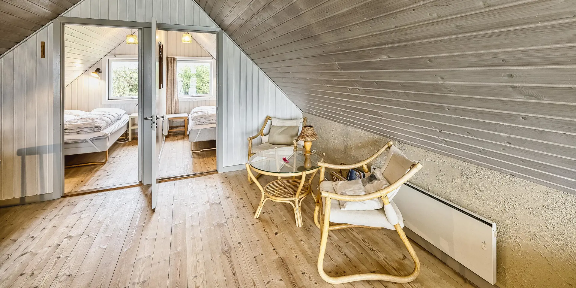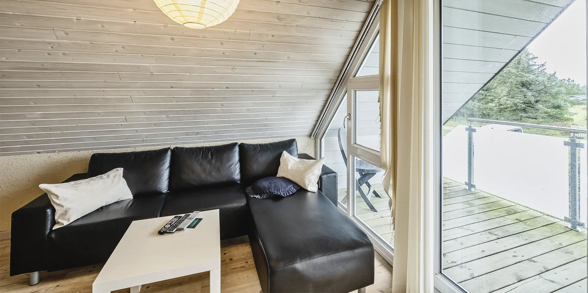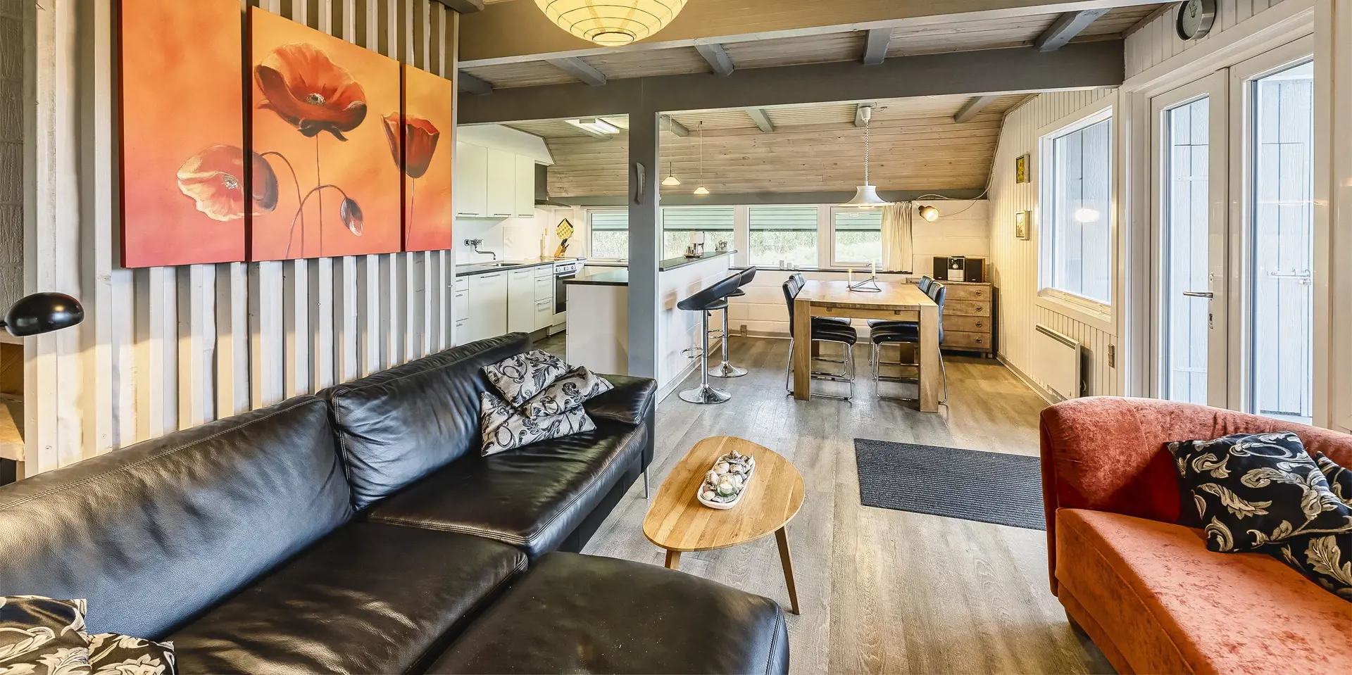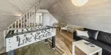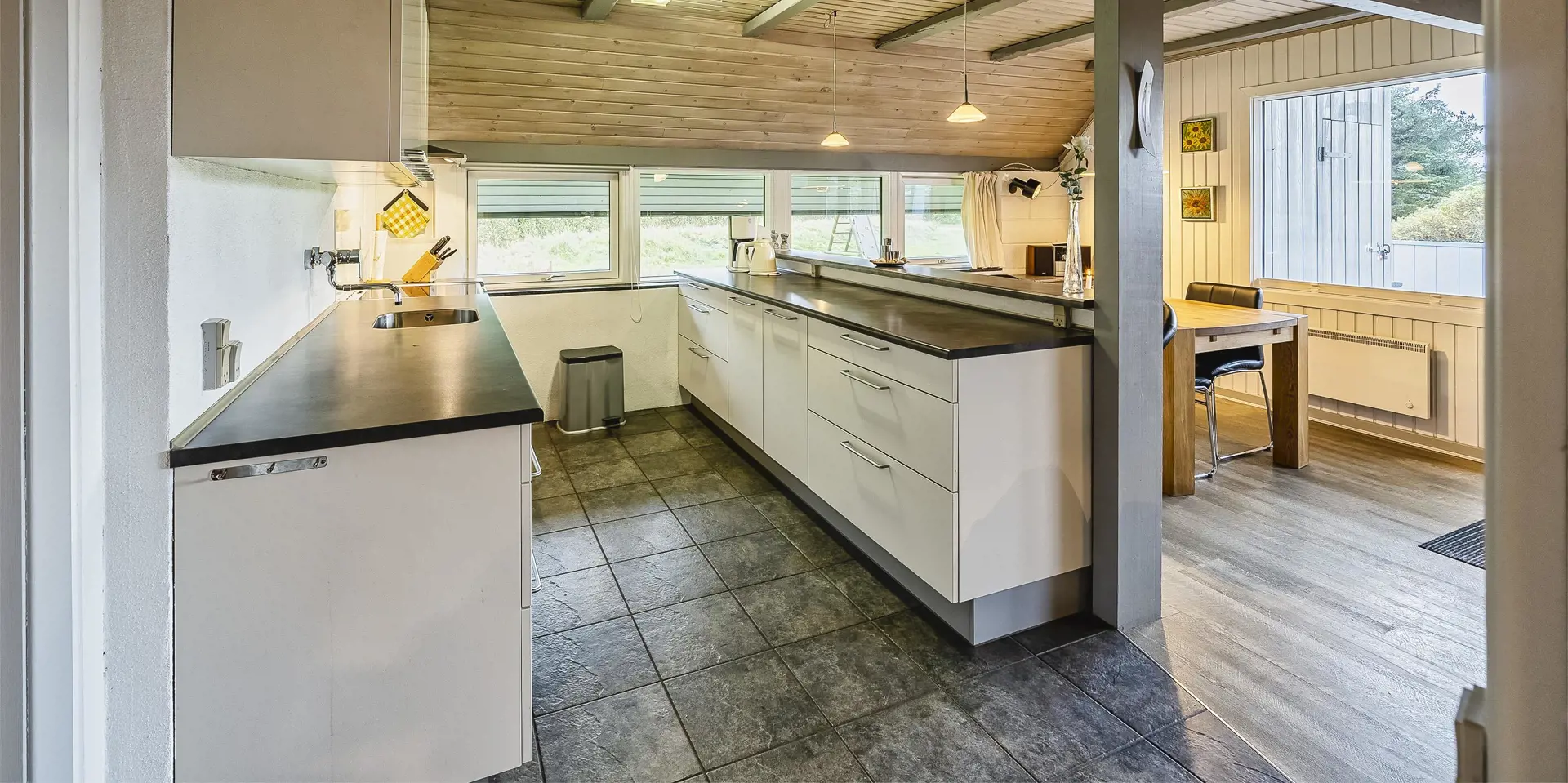 Großes Ferienhaus auf einem naturbelassenem Grundstück gelegen. Das Ferienhaus ist für 6-7 Personen ausgestattet und der Strand ist etwa 1 Km vom Ferienhaus entfernt. Die Räumlichkeiten sind auf 2 Ebenen verteilt. Im Erdgeschoss befindet sich ein Wohnbereich, die Küche, das Badezimmer und zwei Schlafzimmer. Im Obergeschoss dann weitere zwei Schlafzimmer und ein Wohnzimmer. Der Wohnbereich im Erdgeschoss ist mit einer gemütlichen Sitzgarnitur gegenüber dem Kamin ausgestattet. Die Wohnküche ist mit dem Essplatz durch einen Tresen, mit zwei Barhockern, verbunden und verfügt über einen Herd mit Cerankochfeld, einem Backofen, einer Geschirrspülmaschine, einer Mikrowelle und einer Kühl- und Gefrierkombination. Das Badezimmer hat ein WC, ein Handwaschbecken, eine Dusche und genügend Ablagefläche für Ihre Badutensilien. Die Waschmaschine und der Trockner sind hier im Badezimmer untergebracht. 4 Schlafzimmer: DB + DB + DB + 2B. Das Eine Schlafzimmer im Erdgeschoss verfügt über ein Doppelbett und das Andere über eine Schlafcouch. Über eine Holztreppe im Wohnzimmer gelangen Sie dann ins Obergeschoss. Dort stehen Sie dann gleich in dem gemütlichen Wohnraum. Hier steht eine weitere Sitzgarnitur in Form einer Rundsitzecke zur Verfügung. Ein Fernsehgerät ist hier aufgestellt und ein DVD-Abspielgerät ist auch vorhanden. Das deutsche Fernsehprogramm empfangen Sie über eine Parabolantenne. Hier vom Wohnbereich haben Sie einen Zugang zum Balkon. Es stehen weitere zwei Schlafzimmer zur Verfügung. Eines ist mit einem Doppelbett ausgestattet und das Andere verfügt über zwei Einzelbetten. Ein geschützter und geschlossener Terrassenbereich steht den Gästen zur Verfügung. Direkt am Haus ist sogar ein kleiner Teil der Terrasse überdacht. Hier können Sie Ihre Vierbeiner mal Luft schnappen lassen ohne das sie gleich stiften gehen können. Es sind max. zwei Haustiere erlaubt. Eine Blockhaussauna( im AB auf dem Grundriss) steht den Gästen auch bereit. Das Rauchen im Ferienhaus ist nicht erlaubt. Für die Kleinen Gäste steht ein Schaukelstativ und eine Sandkiste auf dem Grundstück zur Verfügung. Das Ferienhaus ist 1985 erbaut worden und in 2010 renoviert. Neues Dach im Jahr 2024.