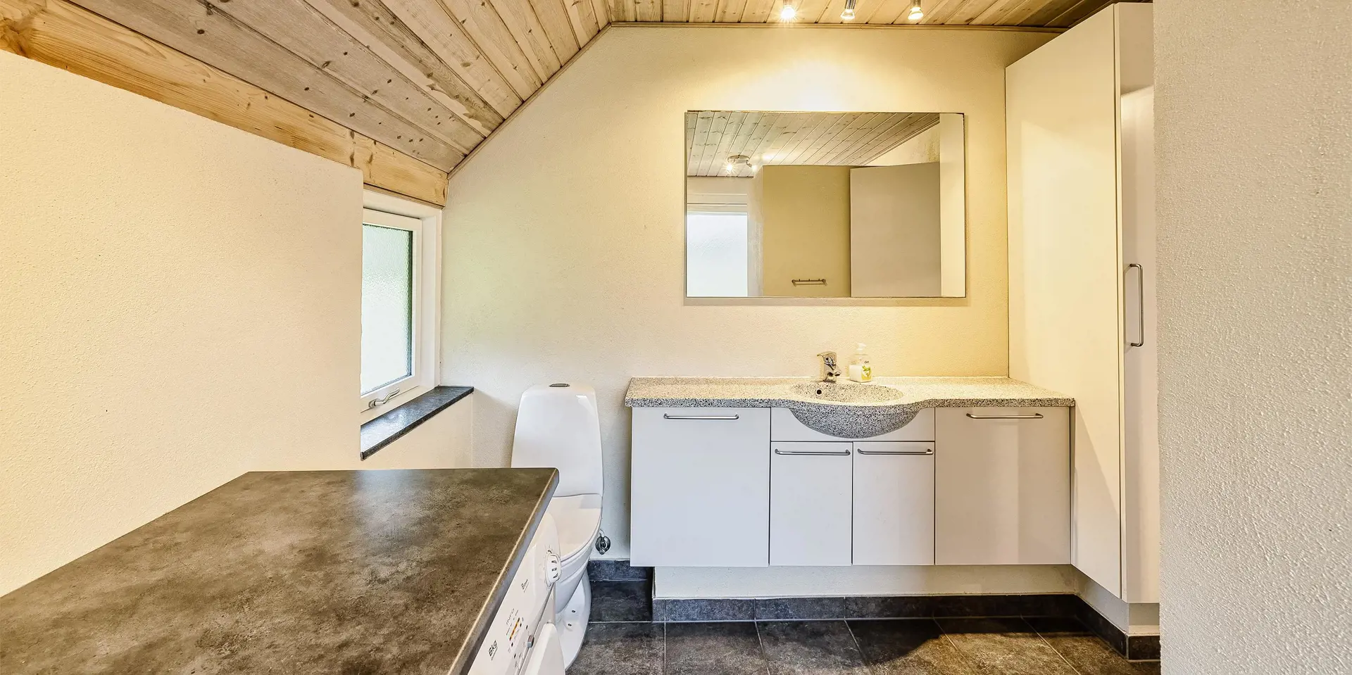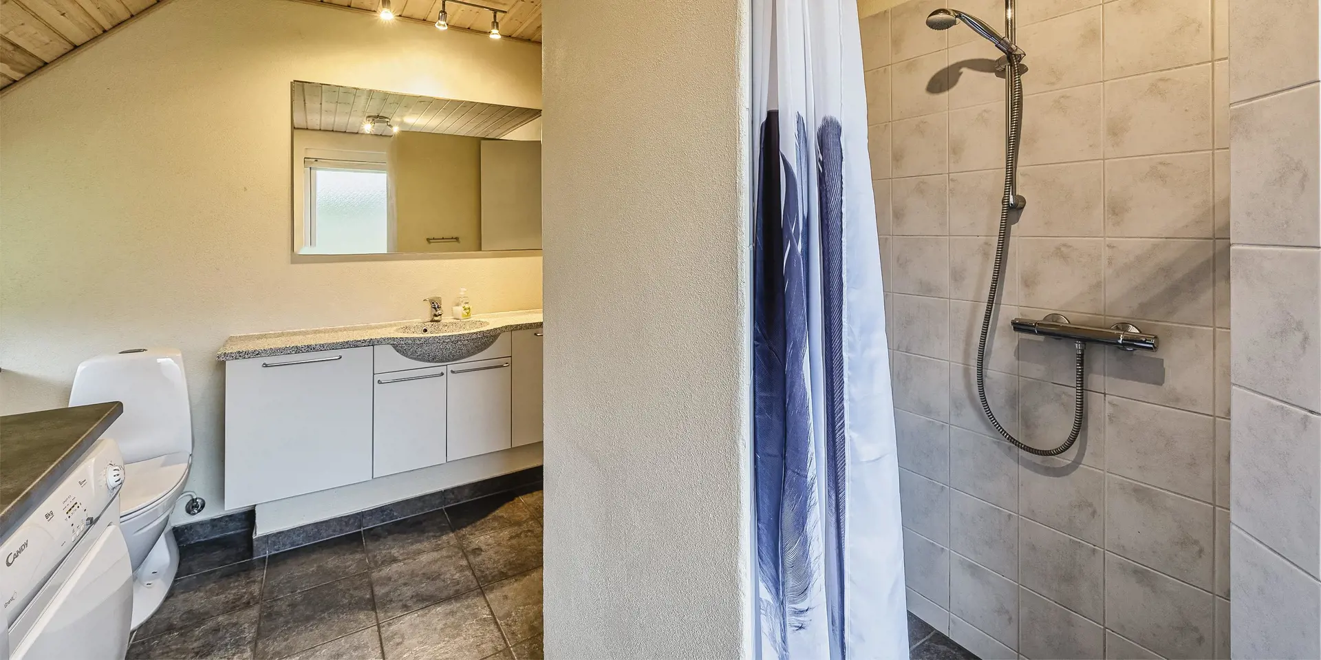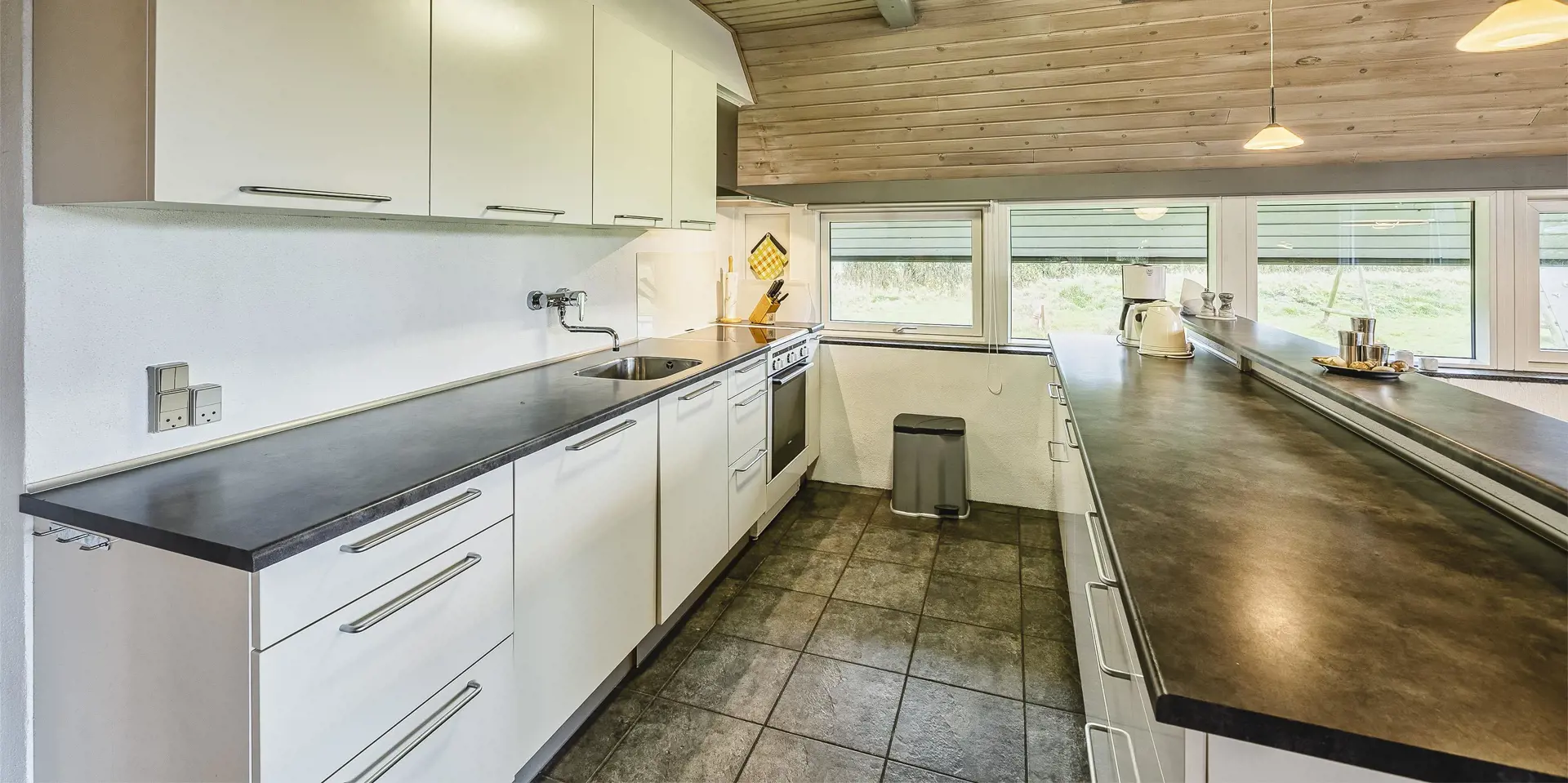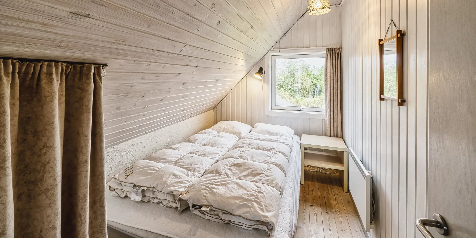 Großes Ferienhaus auf einem naturbelassenem Grundstück gelegen. Das Ferienhaus ist für 6-7 Personen ausgestattet und der Strand ist etwa 1 Km vom Ferienhaus entfernt. Die Räumlichkeiten sind auf 2 Ebenen verteilt. Im Erdgeschoss befindet sich ein Wohnbereich, die Küche, das Badezimmer und zwei Schlafzimmer. Im Obergeschoss dann weitere zwei Schlafzimmer und ein Wohnzimmer. Der Wohnbereich im Erdgeschoss ist mit einer gemütlichen Sitzgarnitur gegenüber dem Kamin ausgestattet. Die Wohnküche ist mit dem Essplatz durch einen Tresen, mit zwei Barhockern, verbunden und verfügt über einen Herd mit Cerankochfeld, einem Backofen, einer Geschirrspülmaschine, einer Mikrowelle und einer Kühl- und Gefrierkombination. Das Badezimmer hat ein WC, ein Handwaschbecken, eine Dusche und genügend Ablagefläche für Ihre Badutensilien. Die Waschmaschine und der Trockner sind hier im Badezimmer untergebracht. 4 Schlafzimmer: DB + DB + DB + 2B. Das Eine Schlafzimmer im Erdgeschoss verfügt über ein Doppelbett und das Andere über eine Schlafcouch. Über eine Holztreppe im Wohnzimmer gelangen Sie dann ins Obergeschoss. Dort stehen Sie dann gleich in dem gemütlichen Wohnraum. Hier steht eine weitere Sitzgarnitur in Form einer Rundsitzecke zur Verfügung. Ein Fernsehgerät ist hier aufgestellt und ein DVD-Abspielgerät ist auch vorhanden. Das deutsche Fernsehprogramm empfangen Sie über eine Parabolantenne. Hier vom Wohnbereich haben Sie einen Zugang zum Balkon. Es stehen weitere zwei Schlafzimmer zur Verfügung. Eines ist mit einem Doppelbett ausgestattet und das Andere verfügt über zwei Einzelbetten. Ein geschützter und geschlossener Terrassenbereich steht den Gästen zur Verfügung. Direkt am Haus ist sogar ein kleiner Teil der Terrasse überdacht. Hier können Sie Ihre Vierbeiner mal Luft schnappen lassen ohne das sie gleich stiften gehen können. Es sind max. zwei Haustiere erlaubt. Eine Blockhaussauna( im AB auf dem Grundriss) steht den Gästen auch bereit. Das Rauchen im Ferienhaus ist nicht erlaubt. Für die Kleinen Gäste steht ein Schaukelstativ und eine Sandkiste auf dem Grundstück zur Verfügung. Das Ferienhaus ist 1985 erbaut worden und in 2010 renoviert. Neues Dach im Jahr 2024.