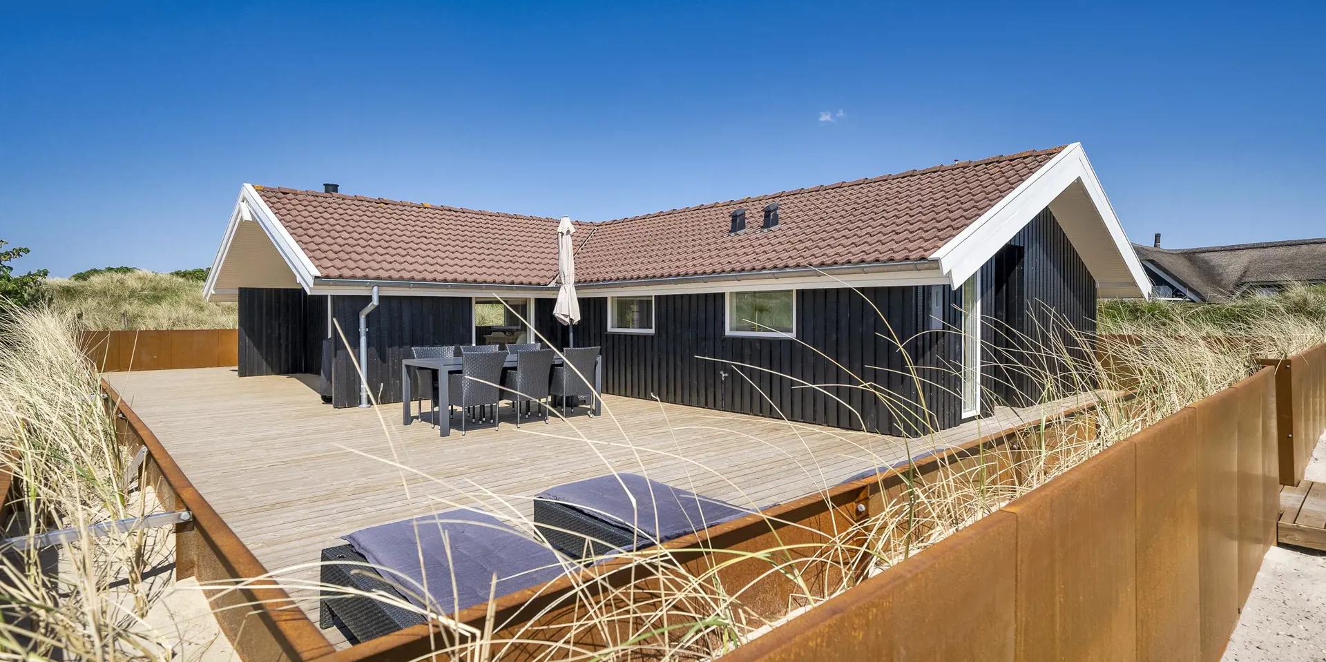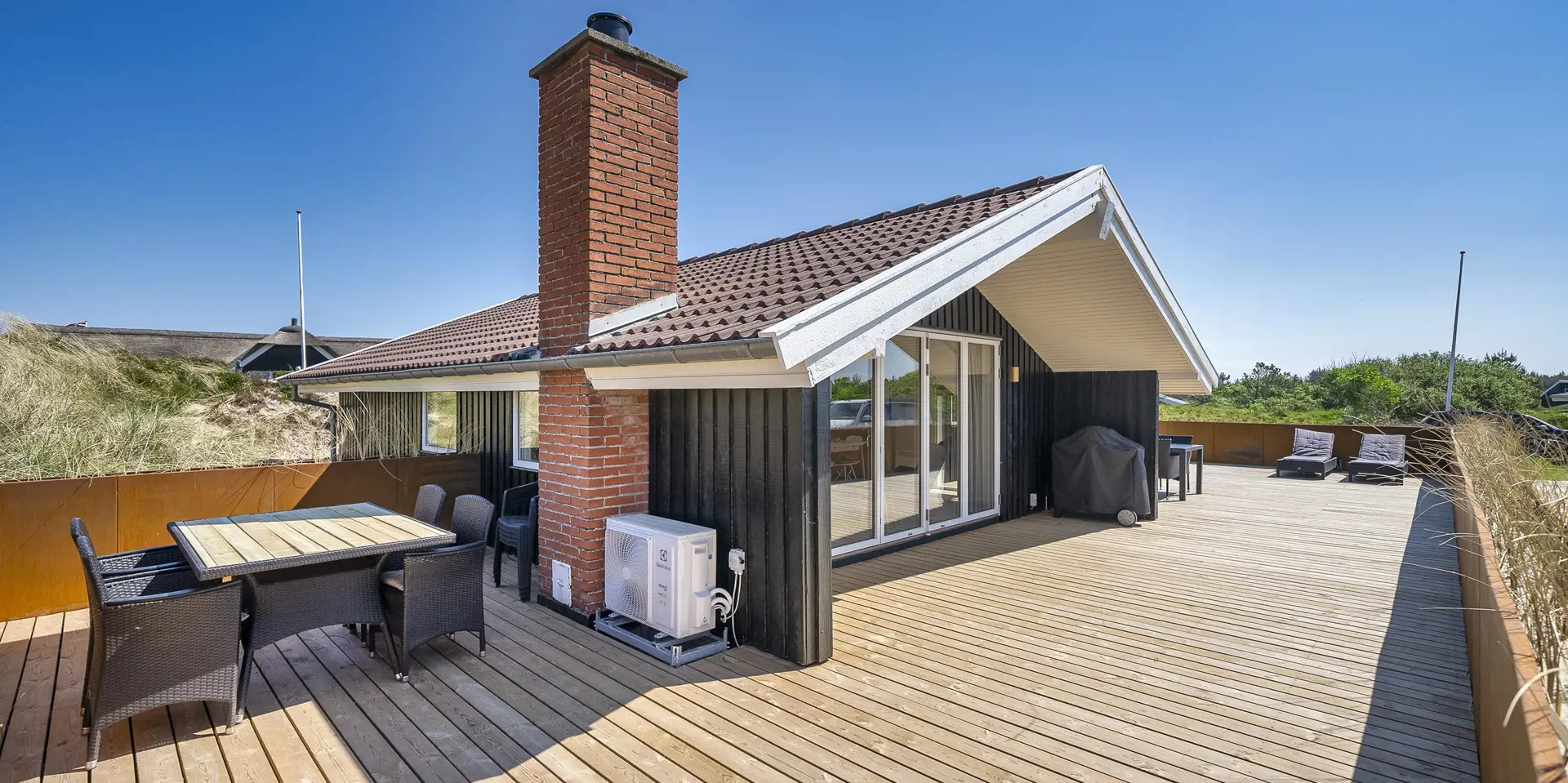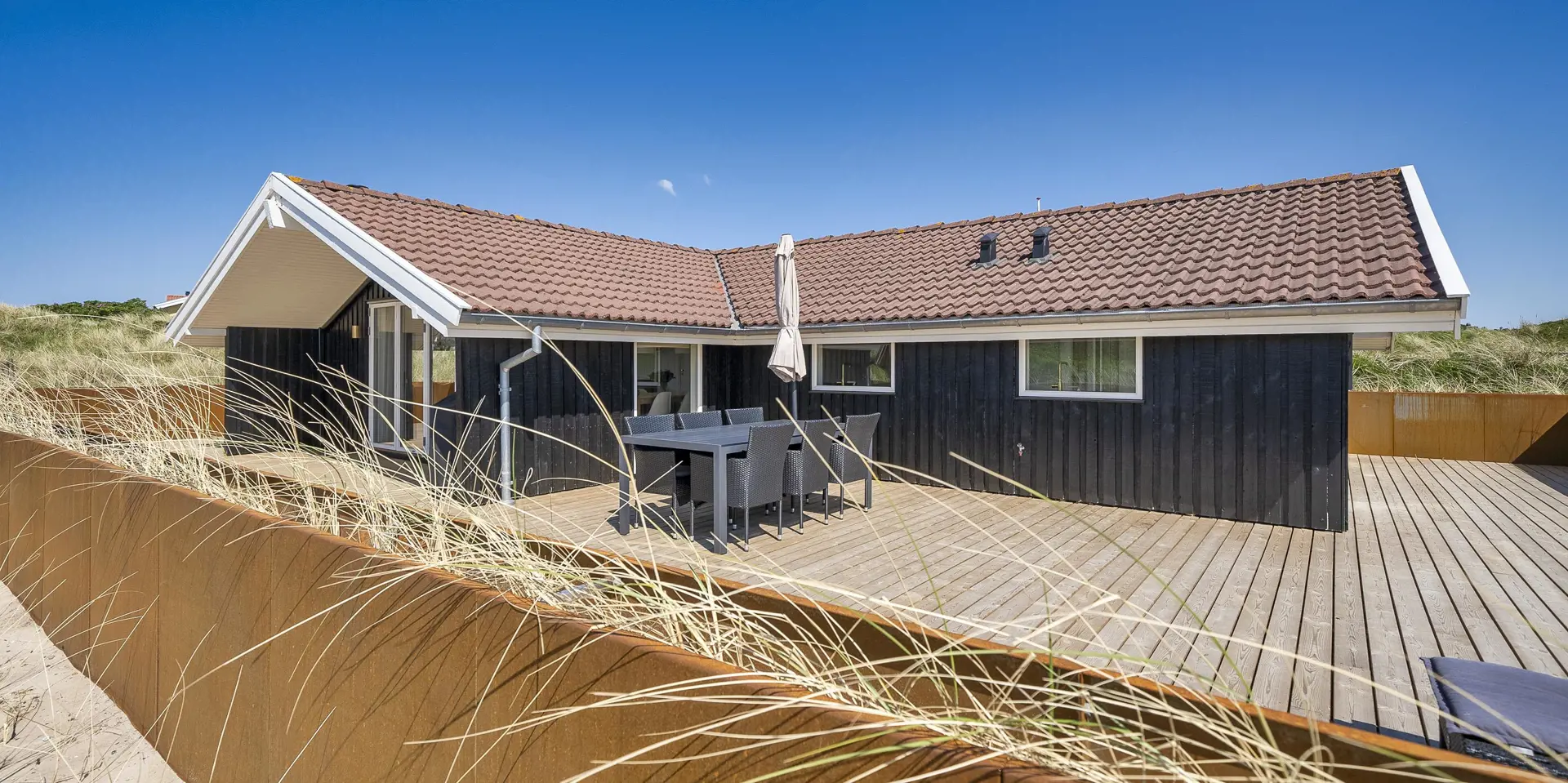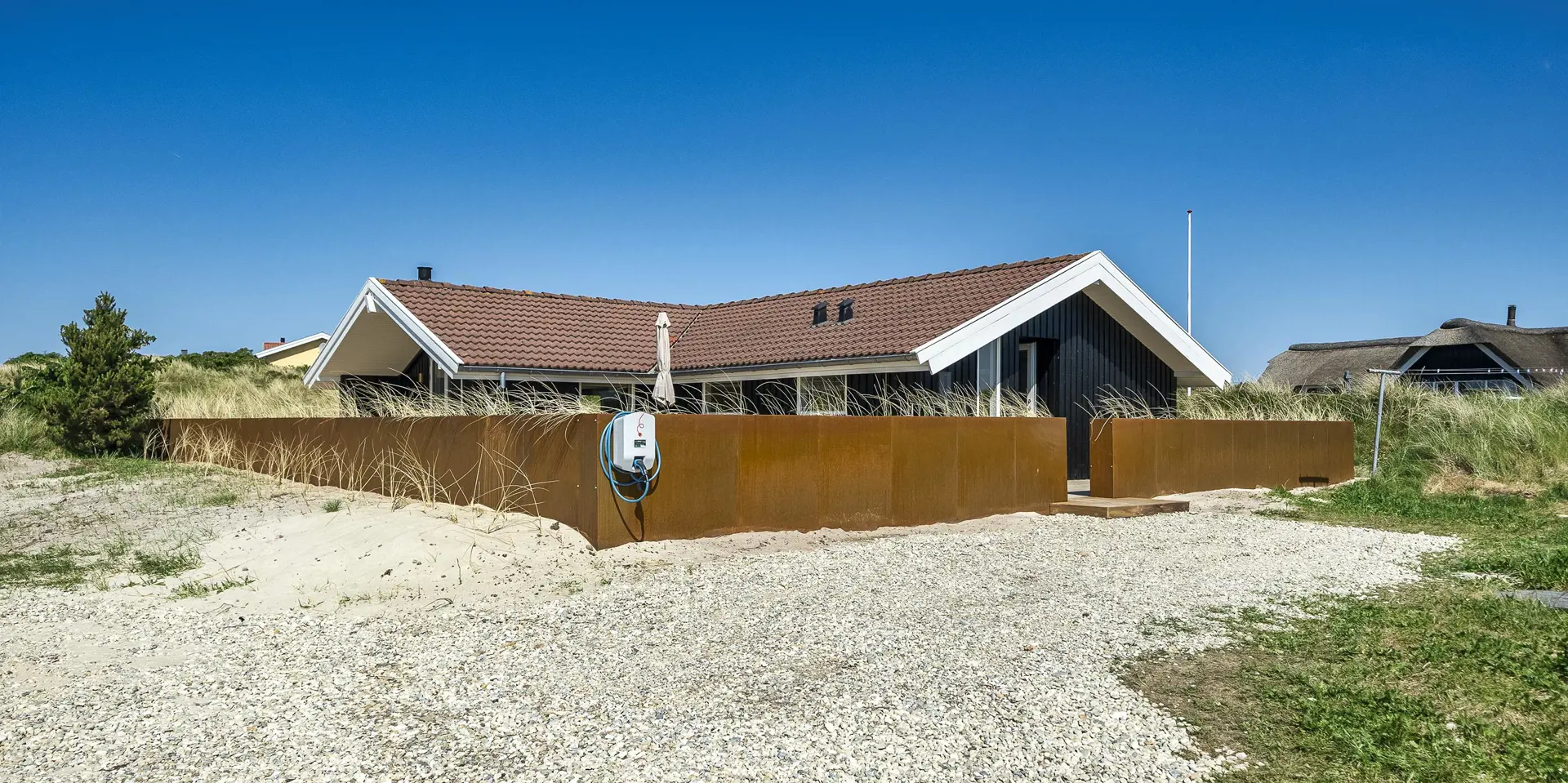 Flottes Ferienhaus auf einem Naturgrundstück und am Ende einer Sackgasse gelegen. Das Ferienhaus ist für 6 Personen ausgestattet und der Strand ist etwa 700 Meter vom Haus entfernt. Der Wohnbereich ist mit dem Essbereich und zum Küchenbereich hin offengehalten. In einer Ecke im Wohnbereich steht der Kamin. Das deutsche Fernsehprogramm empfangen Sie über Stofe ( es gibt ca. 3-5 deutsche Programme). Die Küche ist einfach gehalten aber mit allem ausgestattet, was Sie brauchen; wie zum Beispiel einem Herd mit Cerankochfeld, einem Backofen, einer Geschirrspülmaschine, einer Mikrowelle und einer Kühl- und Gefrierkombination. Das Badezimmer ist mit einem WC, einem Handwaschbecken, einer Dusche, einer Sauna und einer Luxusbadewanne mit integrierter Lichttherapie und Spa-Air-Massage ausgestattet. Desweiteren gibt es eine Fußbodenheizung im Bad. Eine Waschmaschine steht im Hauswirtschaftsraum zur Benutzung bereit. Es stehen den Gästen insgesamt drei Schlafzimmer zur Verfügung. Drei Schlafzimmer mit guten Betten (DB + DB + 2EB). Ein Schlafzimmer mit zwei Einzelbetten und die beiden anderen Schlafzimmer mit je einem Doppelbett. Es befindet sich eine Wärmepumpe im Ferienhaus. Mit dieser Wärmepumpe haben Sie die Möglichkeit die Stromkosten zu senken, da sie energiesparend ist. Der schöne neue Terrassenbereich ist großzügig gehalten und geschlossen, mit tollen Blumenkästen umgeben und bietet gute windgeschützte Ecken. Es sind keinei Haustiere erlaubt. Das Ferienhaus verfügt über einen Internetanschluss (W-Lan). Die Gäste müssen selber für Gas sorgen, wenn die Gasflasche für den Grill leer ist. Das Ferienhaus ist 1987 erbaut worden und in 2024 einer totalen Renovierung unterzogen worden.