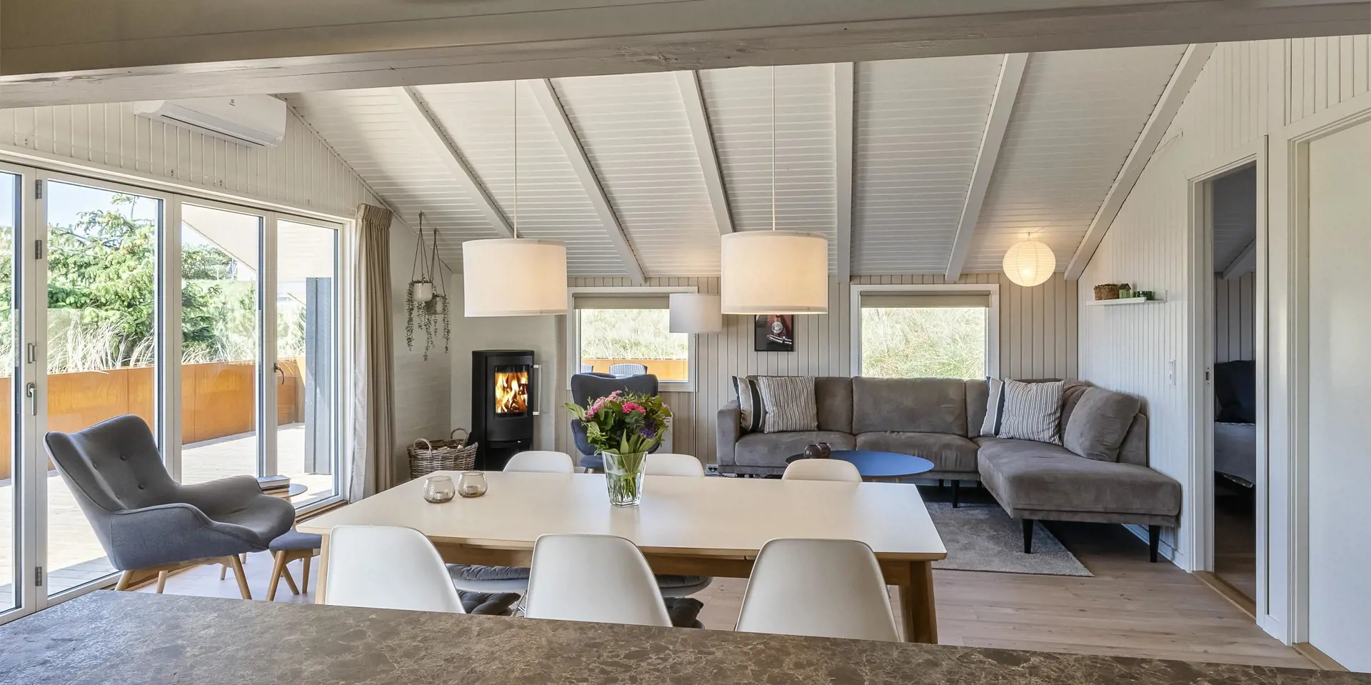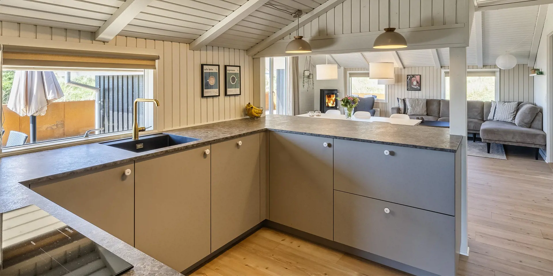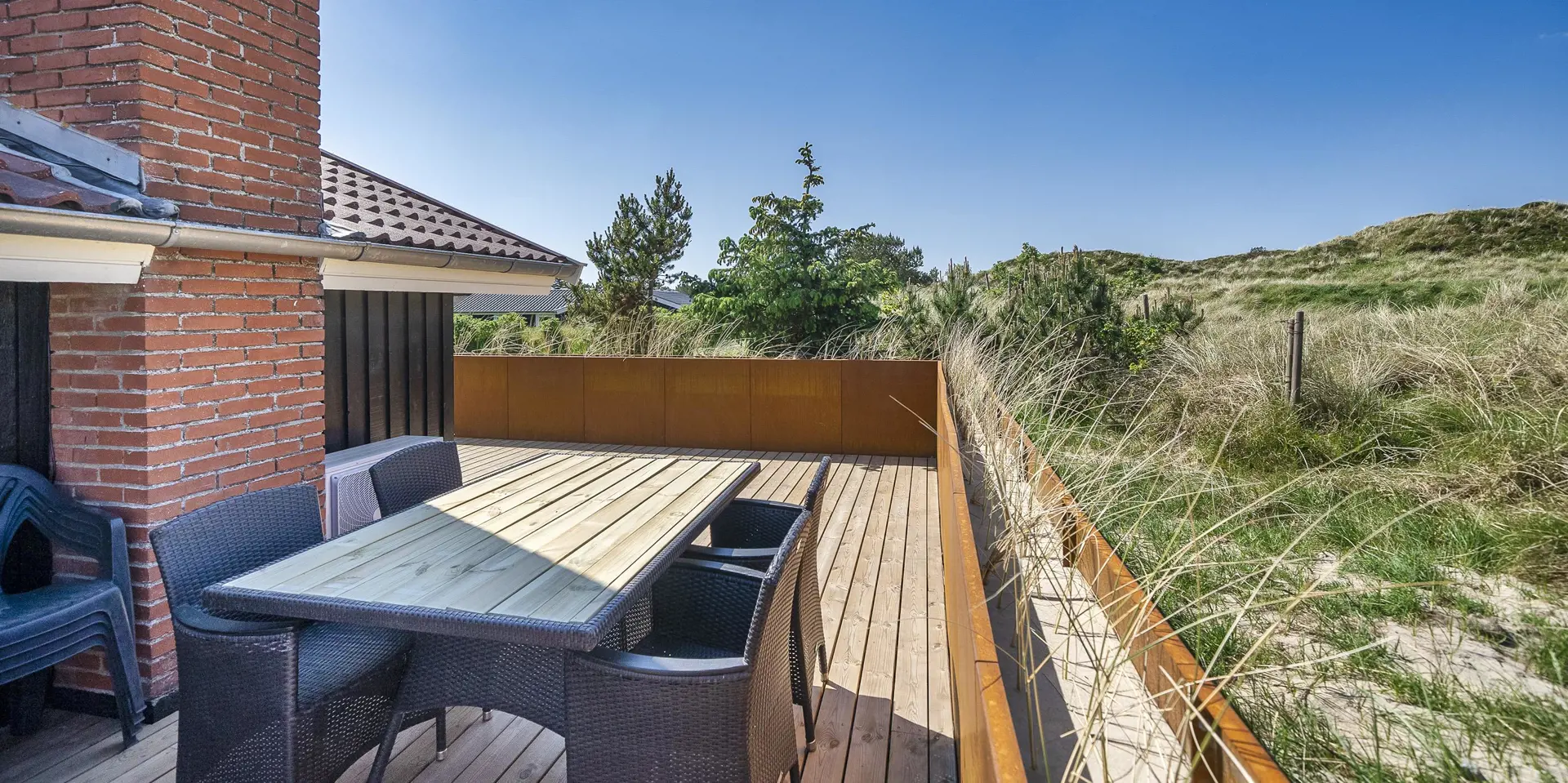 Flottes Ferienhaus auf einem Naturgrundstück und am Ende einer Sackgasse gelegen. Das Ferienhaus ist für 6 Personen ausgestattet und der Strand ist etwa 700 Meter vom Haus entfernt. Der Wohnbereich ist mit dem Essbereich und zum Küchenbereich hin offengehalten. In einer Ecke im Wohnbereich steht der Kamin. Das deutsche Fernsehprogramm empfangen Sie über Stofe ( es gibt ca. 3-5 deutsche Programme). Die Küche ist einfach gehalten aber mit allem ausgestattet, was Sie brauchen; wie zum Beispiel einem Herd mit Cerankochfeld, einem Backofen, einer Geschirrspülmaschine, einer Mikrowelle und einer Kühl- und Gefrierkombination. Das Badezimmer ist mit einem WC, einem Handwaschbecken, einer Dusche, einer Sauna und einer Luxusbadewanne mit integrierter Lichttherapie und Spa-Air-Massage ausgestattet. Desweiteren gibt es eine Fußbodenheizung im Bad. Eine Waschmaschine steht im Hauswirtschaftsraum zur Benutzung bereit. Es stehen den Gästen insgesamt drei Schlafzimmer zur Verfügung. Drei Schlafzimmer mit guten Betten (DB + DB + 2EB). Ein Schlafzimmer mit zwei Einzelbetten und die beiden anderen Schlafzimmer mit je einem Doppelbett. Es befindet sich eine Wärmepumpe im Ferienhaus. Mit dieser Wärmepumpe haben Sie die Möglichkeit die Stromkosten zu senken, da sie energiesparend ist. Der schöne neue Terrassenbereich ist großzügig gehalten und geschlossen, mit tollen Blumenkästen umgeben und bietet gute windgeschützte Ecken. Es sind keinei Haustiere erlaubt. Das Ferienhaus verfügt über einen Internetanschluss (W-Lan). Die Gäste müssen selber für Gas sorgen, wenn die Gasflasche für den Grill leer ist. Das Ferienhaus ist 1987 erbaut worden und in 2024 einer totalen Renovierung unterzogen worden.