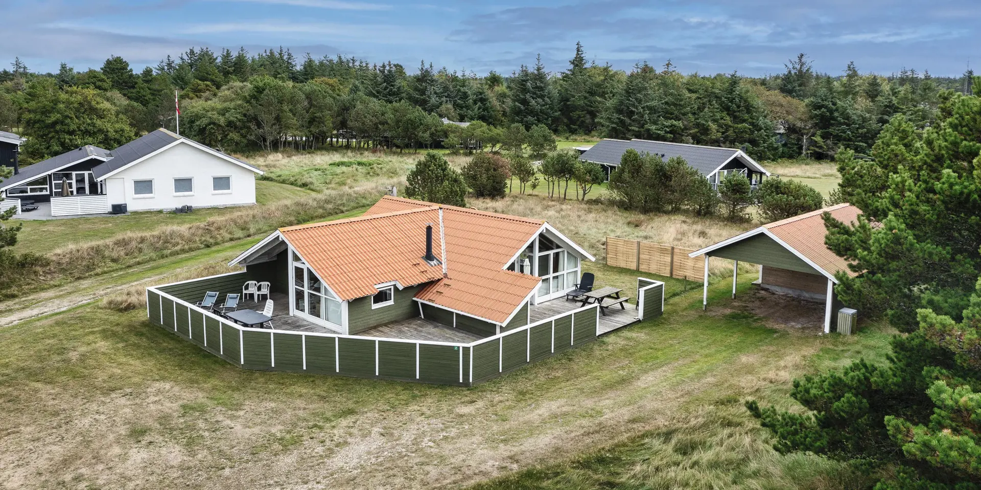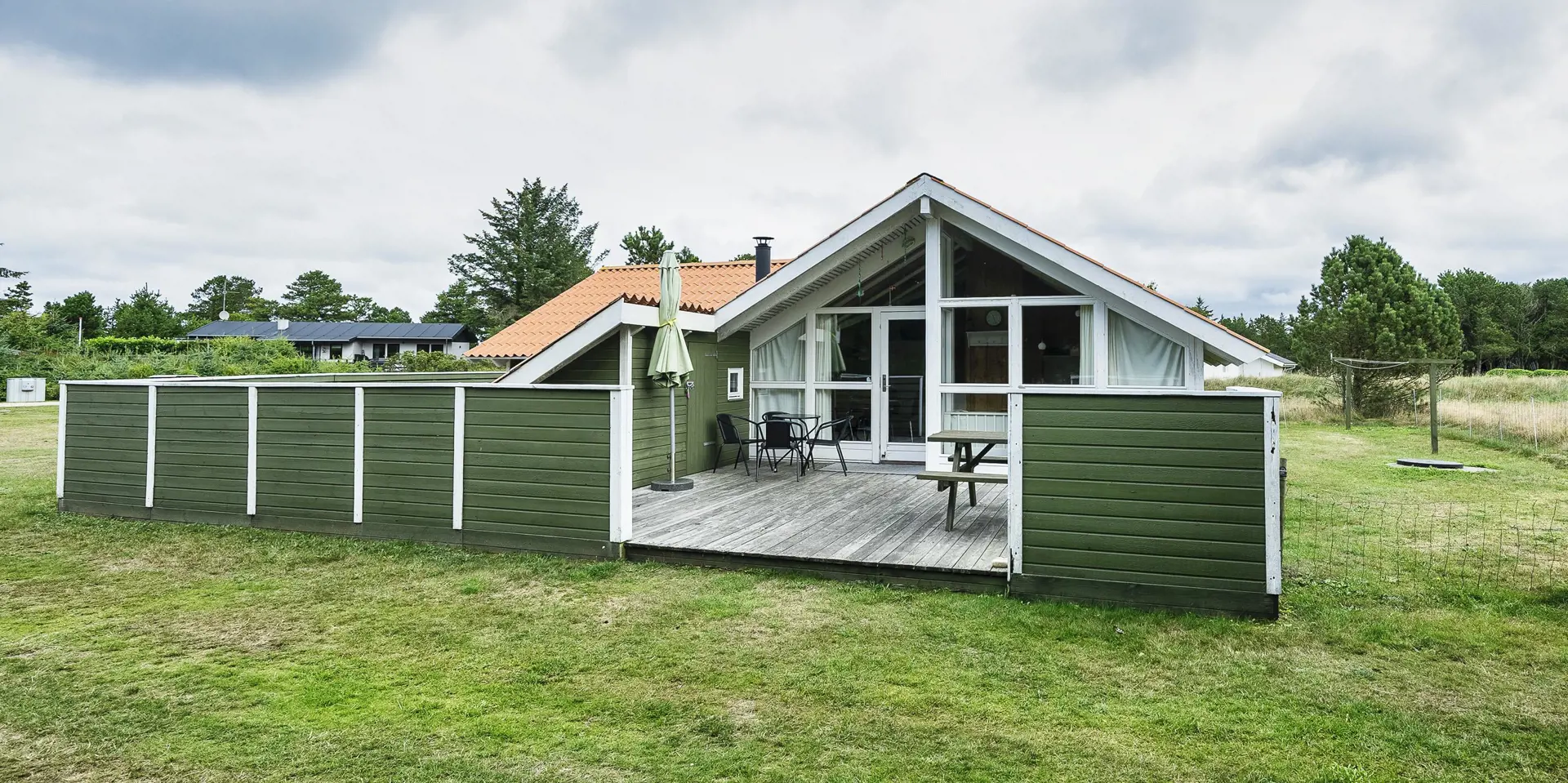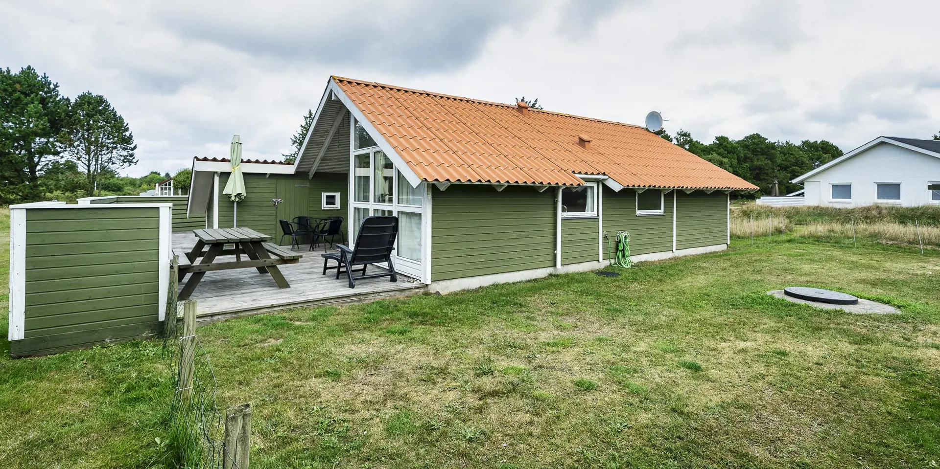 Kleines gemütliches und einfaches Ferienhaus auf einem großen, offenen und naturbelassenem Rasengrundstück gelegen. Das Ferienhaus ist ausgestattet für 6 Personen und der Strand ist ca. 1,2 Km vom Haus entfernt. Der Wohnbereich verfügt über einen Kamin und in einer Ecke ist ein kleiner Alkoven, eine sogenannte Kuschelnische. Hier können sie sich zurückziehen und ein kleines Nickerchen halten. Das deutsche Fernsehprogramm empfangen Sie über eine Parabolantenne, Internetanschluss (W-Lan), DVD-Abspielgerät und Radio sind ebenfalls vorhanden. Die Küche ist zum Ess- und Wohnzimmer hin offen gehalten. Sie verfügt über einen Herd mit Kochplatten, einem Backofen, eine Mikrowelle, einer Geschirrspülmaschine und einer Kühl- und Gefrierkombination. Das Badezimmer ist mit einem WC, einem Handwaschbecken und einer Dusche ausgestattet. Eine Waschmaschine steht im Ferienhaus für die Gäste zur Verfügung. Es sind insgesamt drei Schlafzimmer vorhanden: DB + DB + DB. Zwei davon sind mit je einem Doppelbett ausgestattet und das Dritte Schlafzimmer verfügt über ein 3/4 Doppelbett. Eine grosse Holzterrasse am Ferienhaus bietet genügend Platz für Ihr Sonnenbad oder für einen Grillabend an. Ihr Fahrzeug findet in dem Carport seinen Platz. Es sind keine Katze erlaubt. Rauchen ist nicht erlaubt. Ein kleiner Hund mit die Rückenhöhe von 30 cm ist erlaubt! Das Ferienhaus ist 1991 erbaut worden und in 2009 renoviert.
