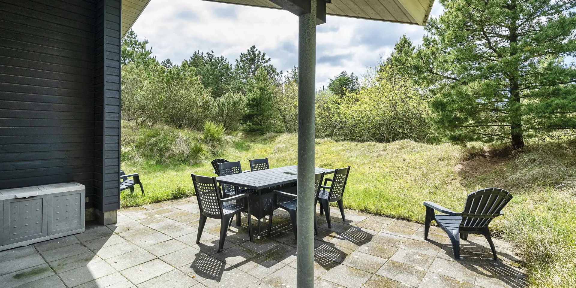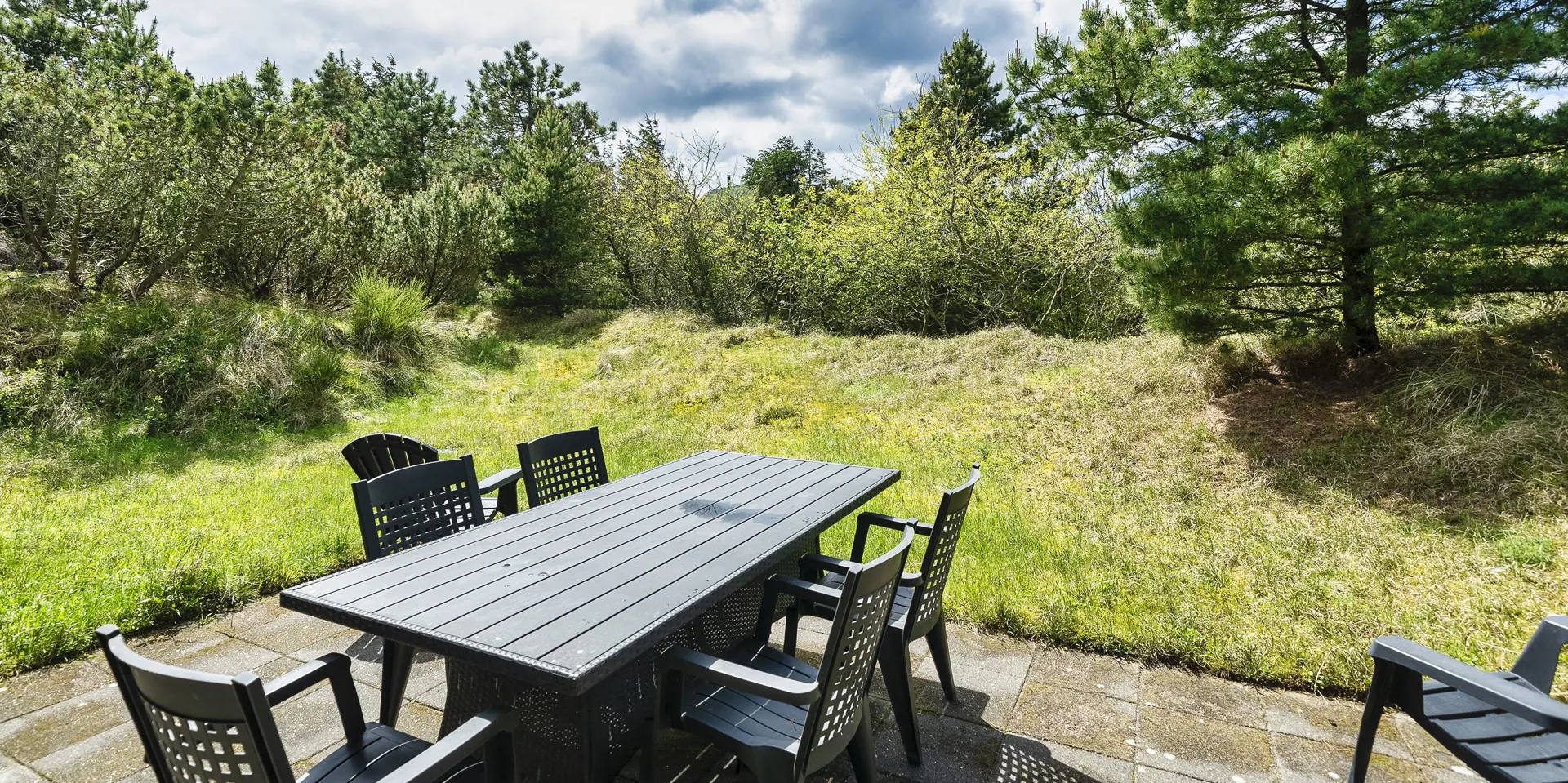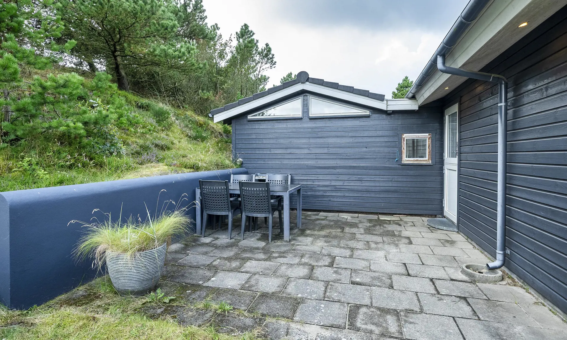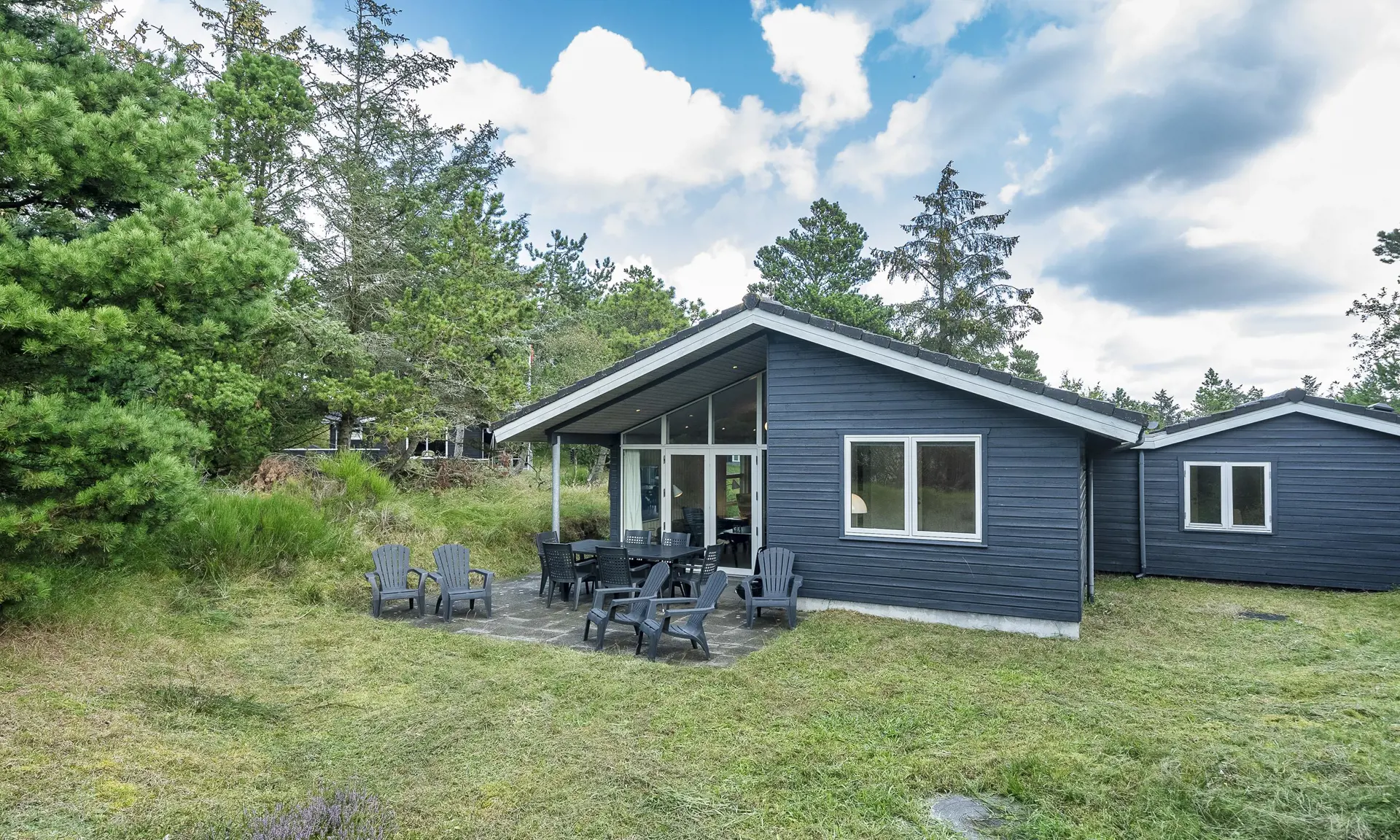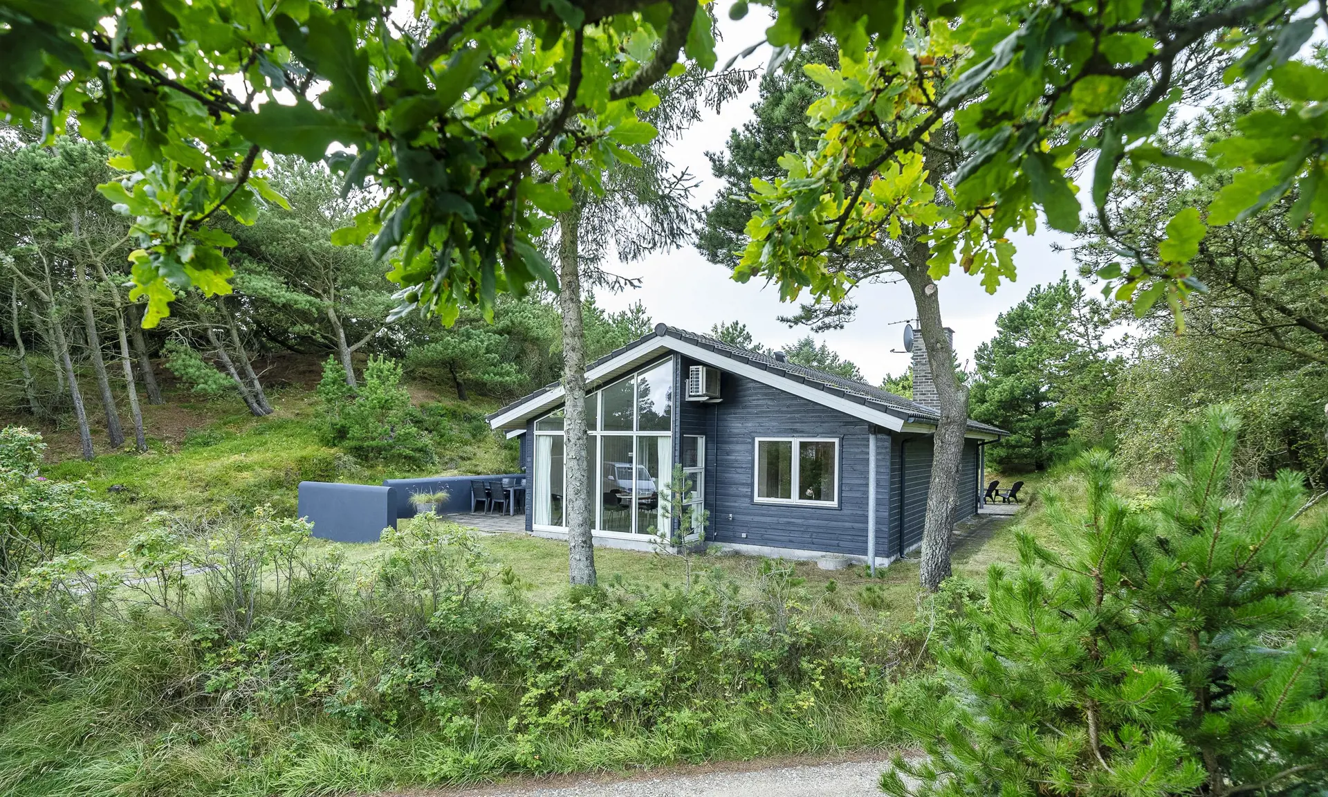 Das Haus liegt auf einem 1.555 m² großen Naturgrundstück in ruhiger Umgebung, etwa 400 Meter vom Ort mit Café und Einkaufsmöglichkeiten entfernt.