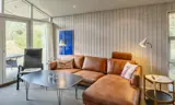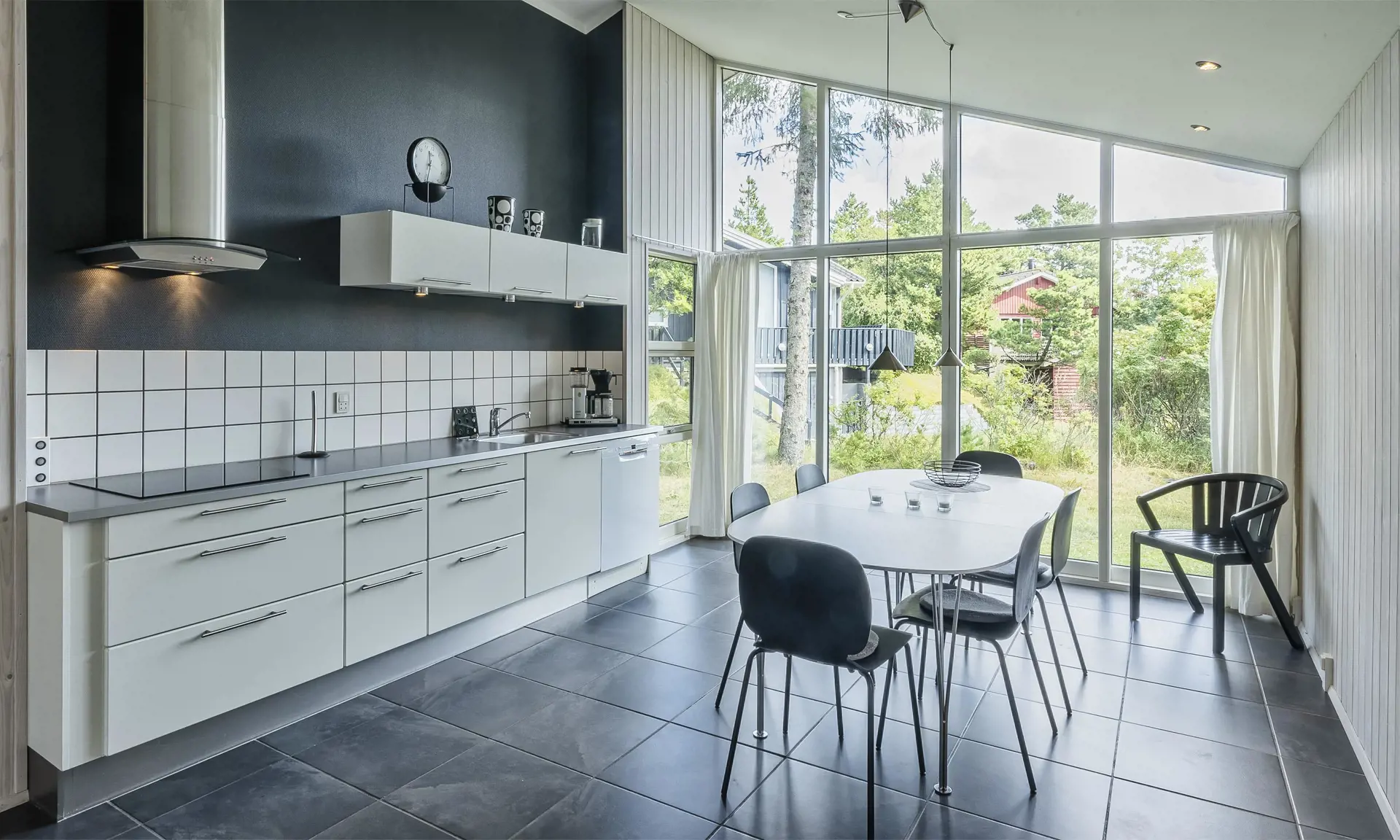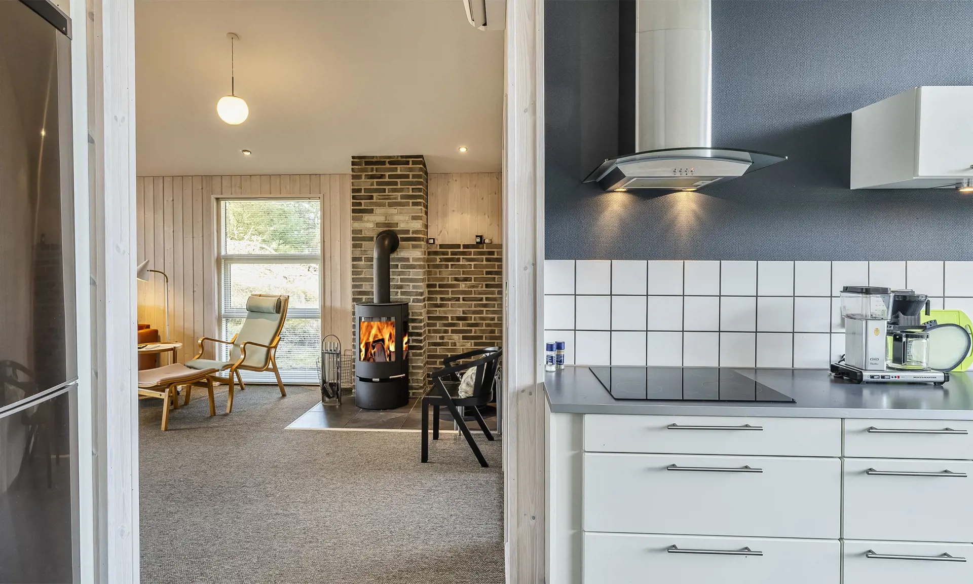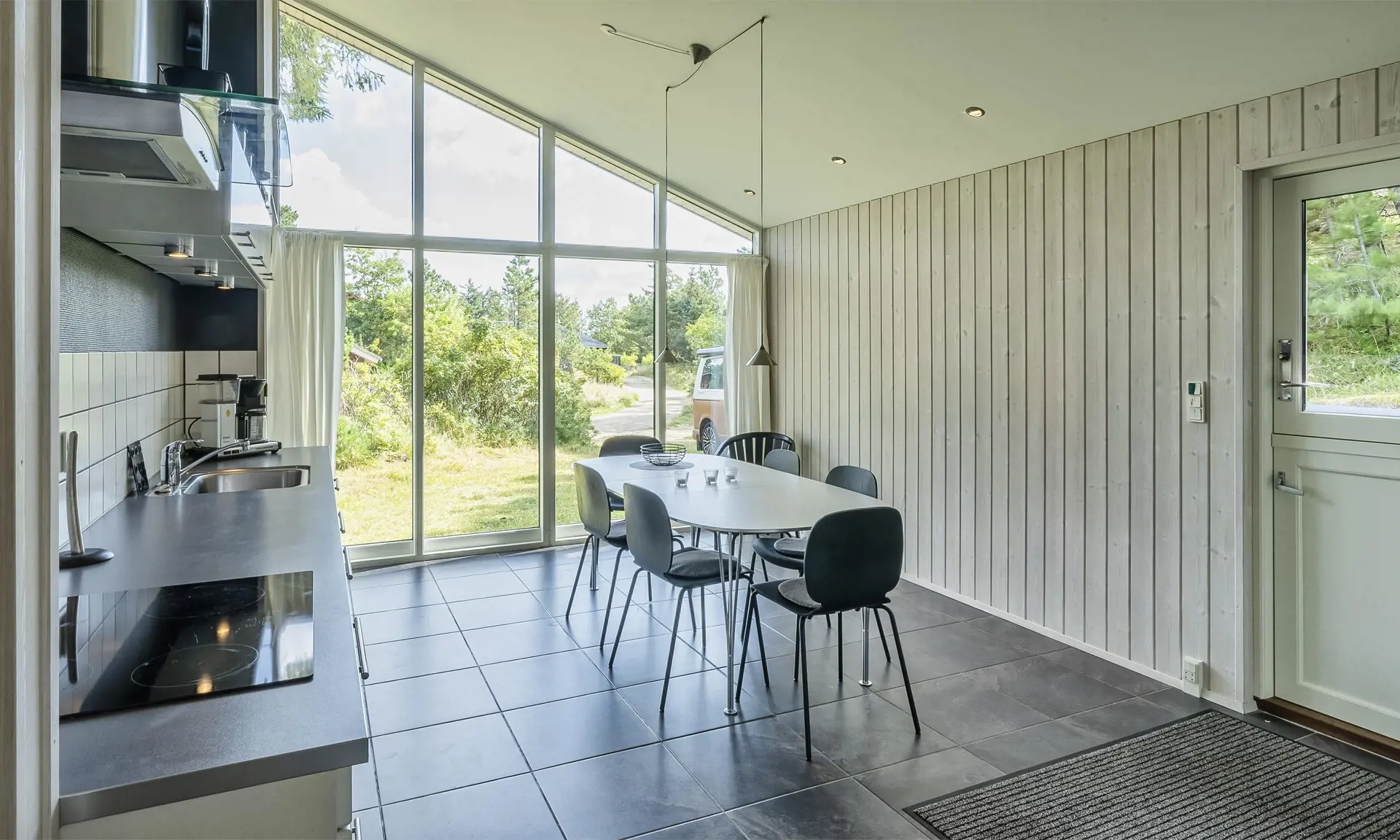 Das gut ausgestattete und geräumige Ferienhaus mit offenen Decken strahlt Gemütlichkeit aus. Am Eingang befindet sich eine schöne, nach Osten ausgerichtete Morgenterrasse. Die gut ausgestattete Küche mit Geschirrspüler und Essbereich verfügt über Fußbodenheizung. Ein großes Fenster sorgt für viel natürliches Licht im Essbereich.