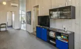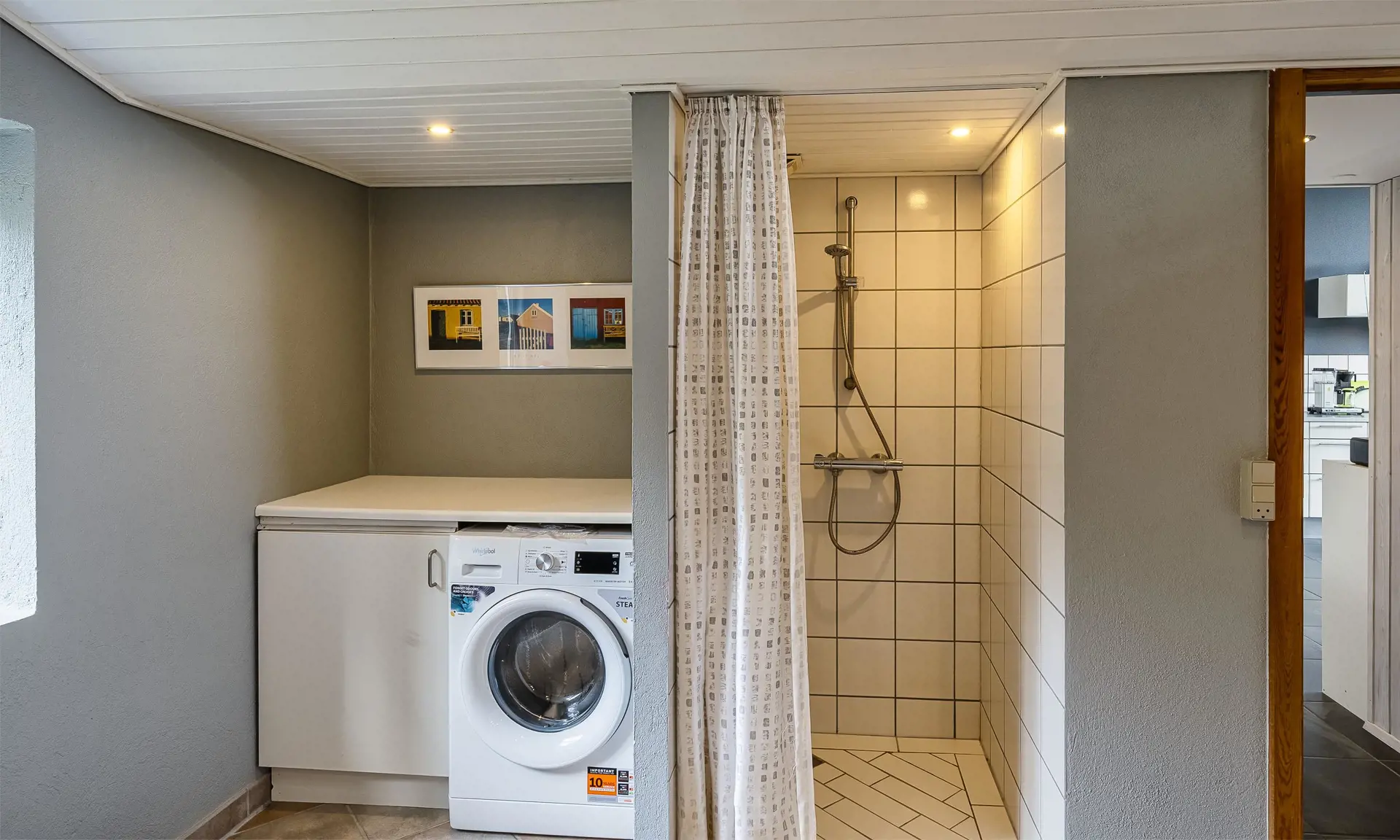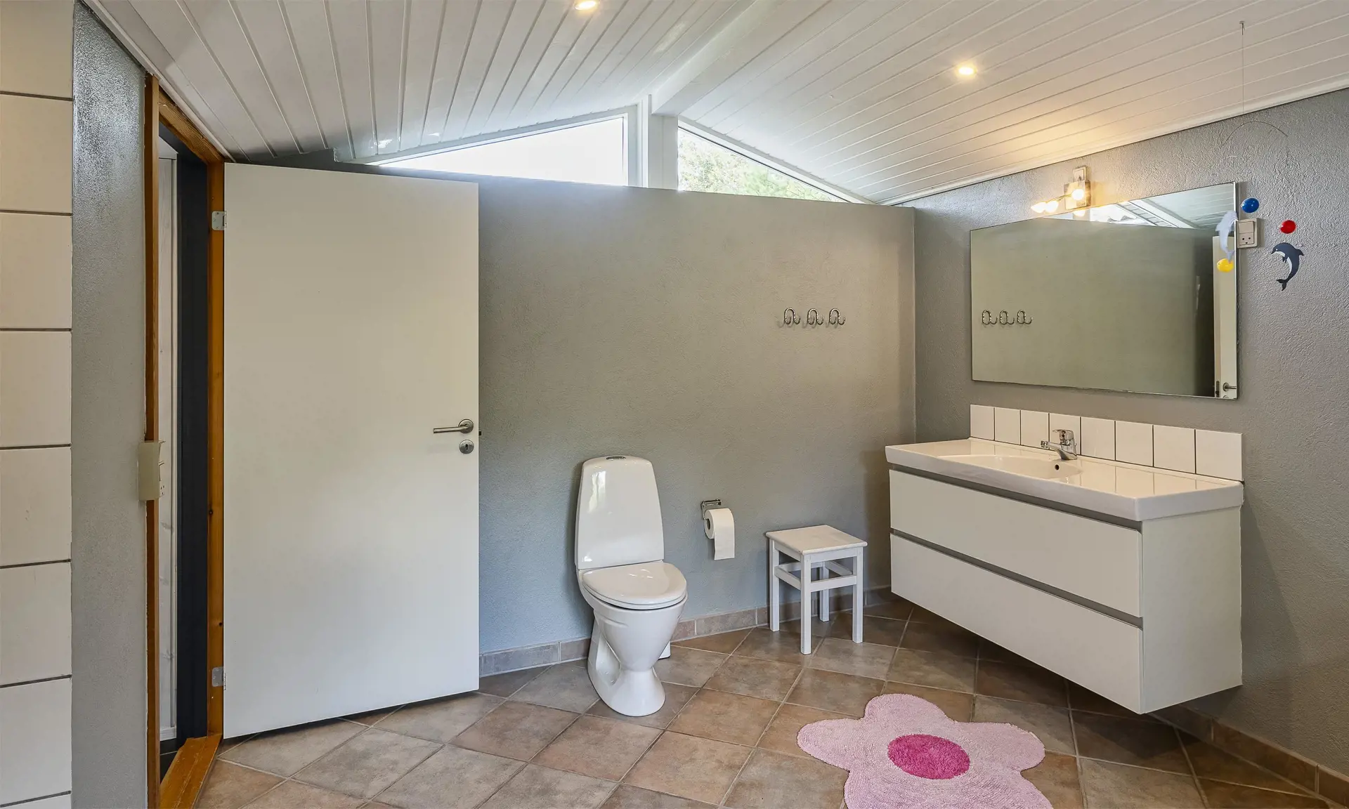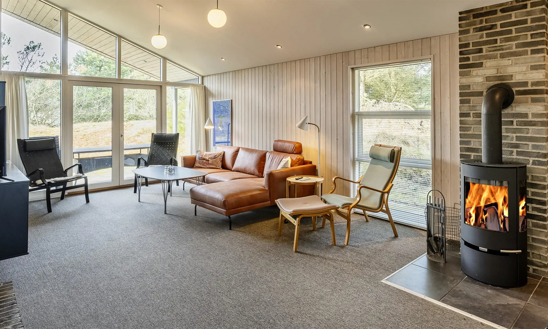 Das gut ausgestattete und geräumige Ferienhaus mit offenen Decken strahlt Gemütlichkeit aus. Am Eingang befindet sich eine schöne, nach Osten ausgerichtete Morgenterrasse. Die gut ausgestattete Küche mit Geschirrspüler und Essbereich verfügt über Fußbodenheizung. Ein großes Fenster sorgt für viel natürliches Licht im Essbereich.