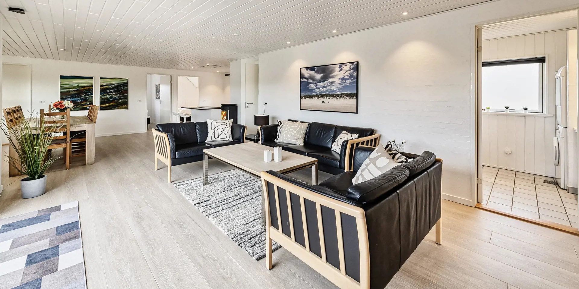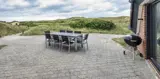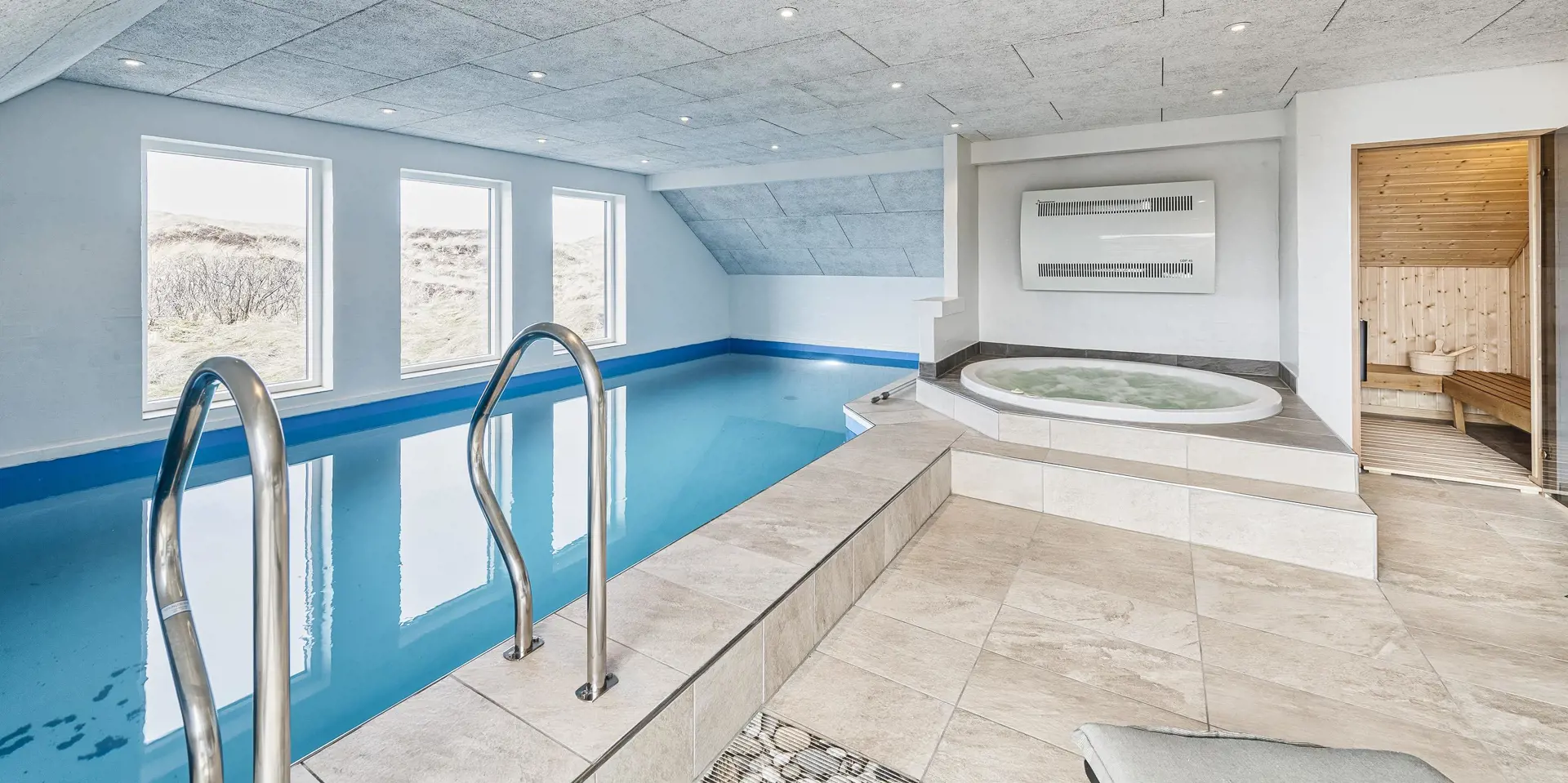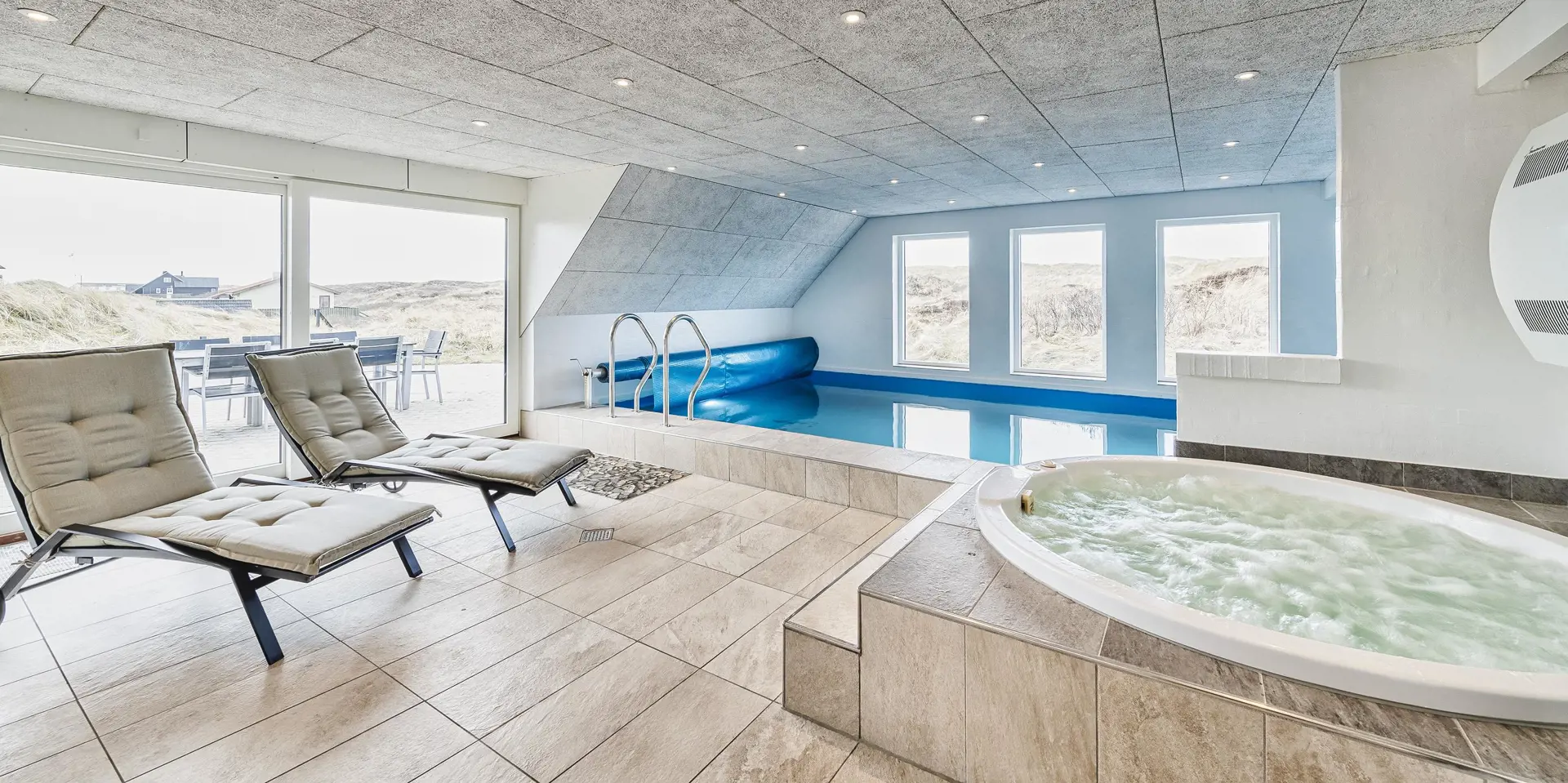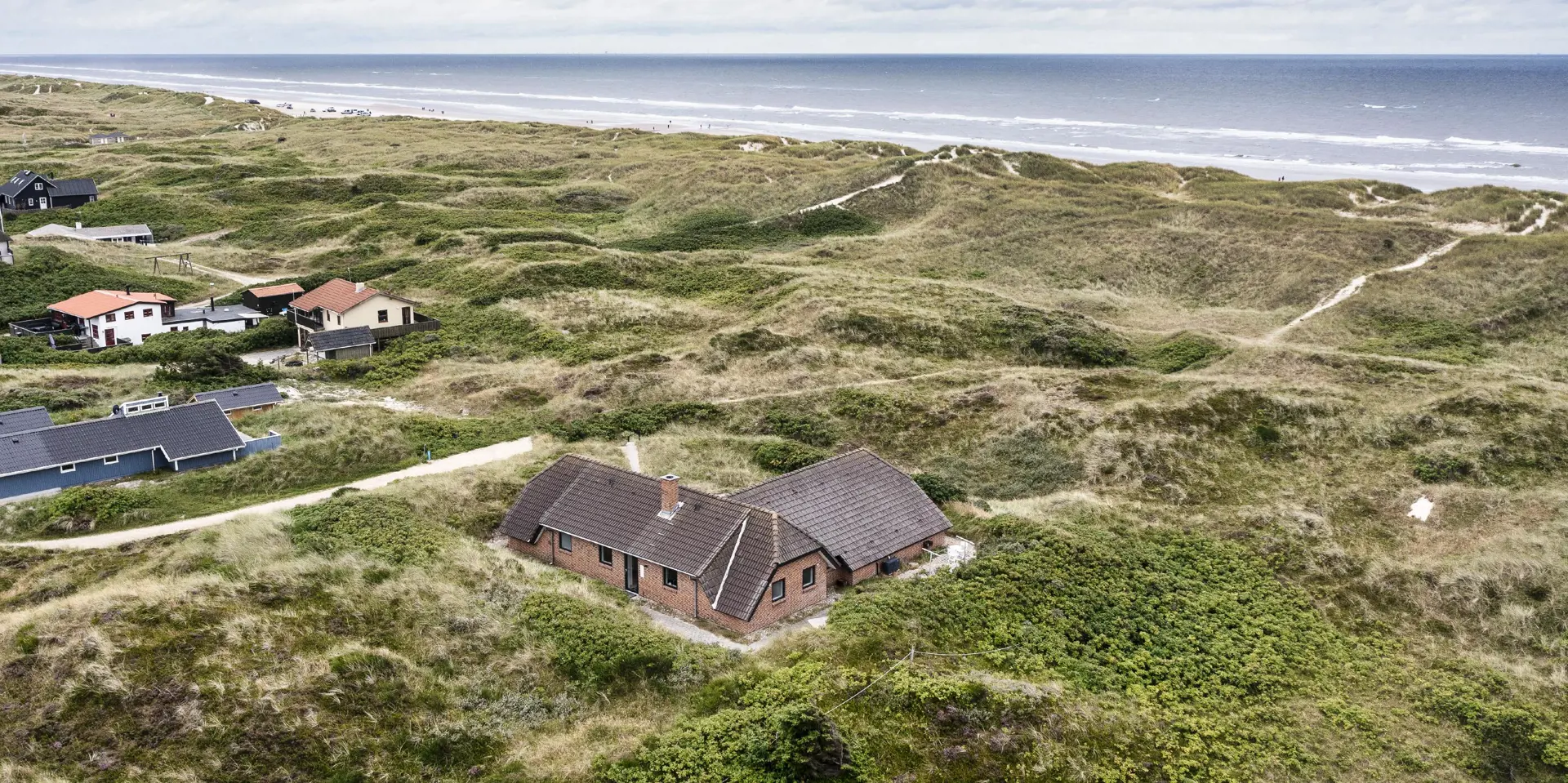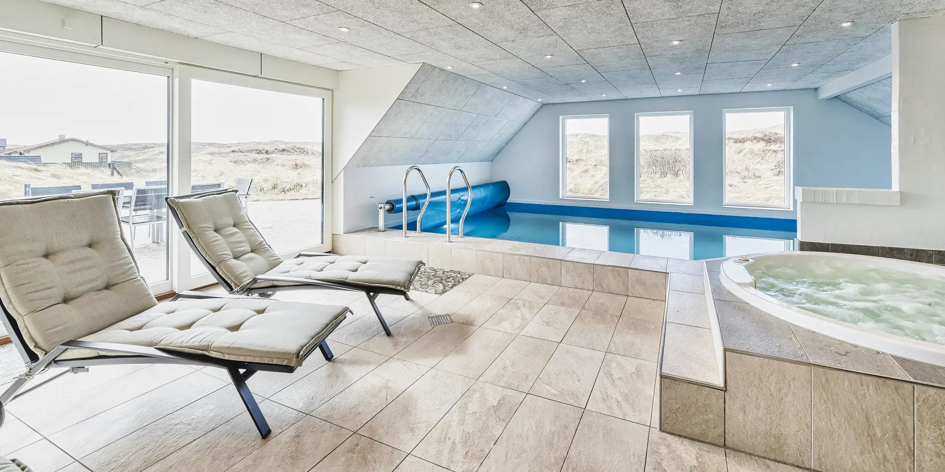 Geschmackvoll und renoviertes Poolhaus für 10 Personen, direkt auf einer Düne gelegen in Mitten einer Dünenkette. Der Bjærgevej in Vejers Strand ist eine bevorzugte Wohngegend, da der Strand sich nur 100 Meter (Dünenweg) vom Haus befindet. Das Ferienhaus ist in L-Form und in der Mitte befindet sich eine schöne gräumige Steinterrasse. Auf den zwei schönen Sonnenliegen können Sie dann den Tag geniessen. Der Wohn- und Essbreich ist mit einem schönen und hellem Lamit ausgestattet, ebenso der Küchenbereich und die Schlafzimmer. Von der gemütlichen Sitzgruppe haben Sie einen direkten Blick auf den Terrassenbereich und die Dünenkette in Richtung Strand. Gegenüber dem Esstisch befindet sich der hängende Kamin. Dieser spendet eine wohlige Wärme und Gemütlichkeit pur. Das Fernsehprogramm empfangen Sie über Stofa, daher stehen nur 5-8 deutsche Kanäle zur Verfügung. Die Essgruppe verfügt über einen grossen Holztisch und Stühle und befindet sich vor der Poolabteilung. Der Poolbereich ist mit einer grossen Fensterfront vom Ferienhaus abgeteilt und zugängig. Der Küchenbereich ist offen und sehr modern eingerichtet. Es gibt eine Kochinsel wo sich der Herd mit Induktionskochfeld und oben an der Decke eine Dunstabzugshaube befindet. Die moderne Einbauküche hat einen Backofen in arbeitshöhe, eine Geschirrspülmaschine, eine Mikrowelle und eine Kühl- und Gefrierkombination (2 Schubladen). Es gibt zwei Bäder im Ferienhaus. Beide verfügen über ein Handwaschbecken, ein WC und eine Dusche. In einem der Bäder sind die Waschmaschine und der Trockner untergebracht. Die Bäder und der Eingangsbereich sind mit Fleisen ausgestattet. In dem Flurbereich befindet sich ein Kleiderschrank. Insgesamt stehen den Gästen fünf Schlafzimmer zur Verfügung: DB + DB + DB + DB + 2B. Vier der Schlafzimmer sind mit je einem Doppelbett ausgesattet und ein Schlafzimmer verfügt über Etagenbetten (Maass 90 x 180). Der Pool hat eine Grösse von ca.7,3 x 3,3 x1,30 Meter (Længe x Breite x Tiefe) und Sie haben einen tollen Ausblick auf die Dünen wenn Sie im Pool schwimmen. Hier in der Poolabteilung befindet sich die Sauna und der Standwasser-Whirlpool ( für ca. 5 Personen) und auch Relaxliegen. Der Standwasser-Whirlpool ist ständig mit Wasser gefüllt und dann sofort bei Anreise betriebsbereit und nutzbar. Einmal die Woche kommt ein Pooltechniker vorbei und kontrolliert den Wert im Pool. Das Ferienhaus verfügt über einen Internetanschluss (W-Lan). Das Haus ist 1993 erbaut worden und in 2021 total von innen renoviert. Es max. ein Haustier erlaubt. Das Rauchen im Ferienhaus ist nicht erlaubt. Eine Parkmöglichkeit direkt am Ferienhaus ist nicht gegeben. Zum Haus gibt es einen direkten Treppenaufgang.